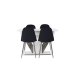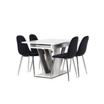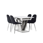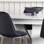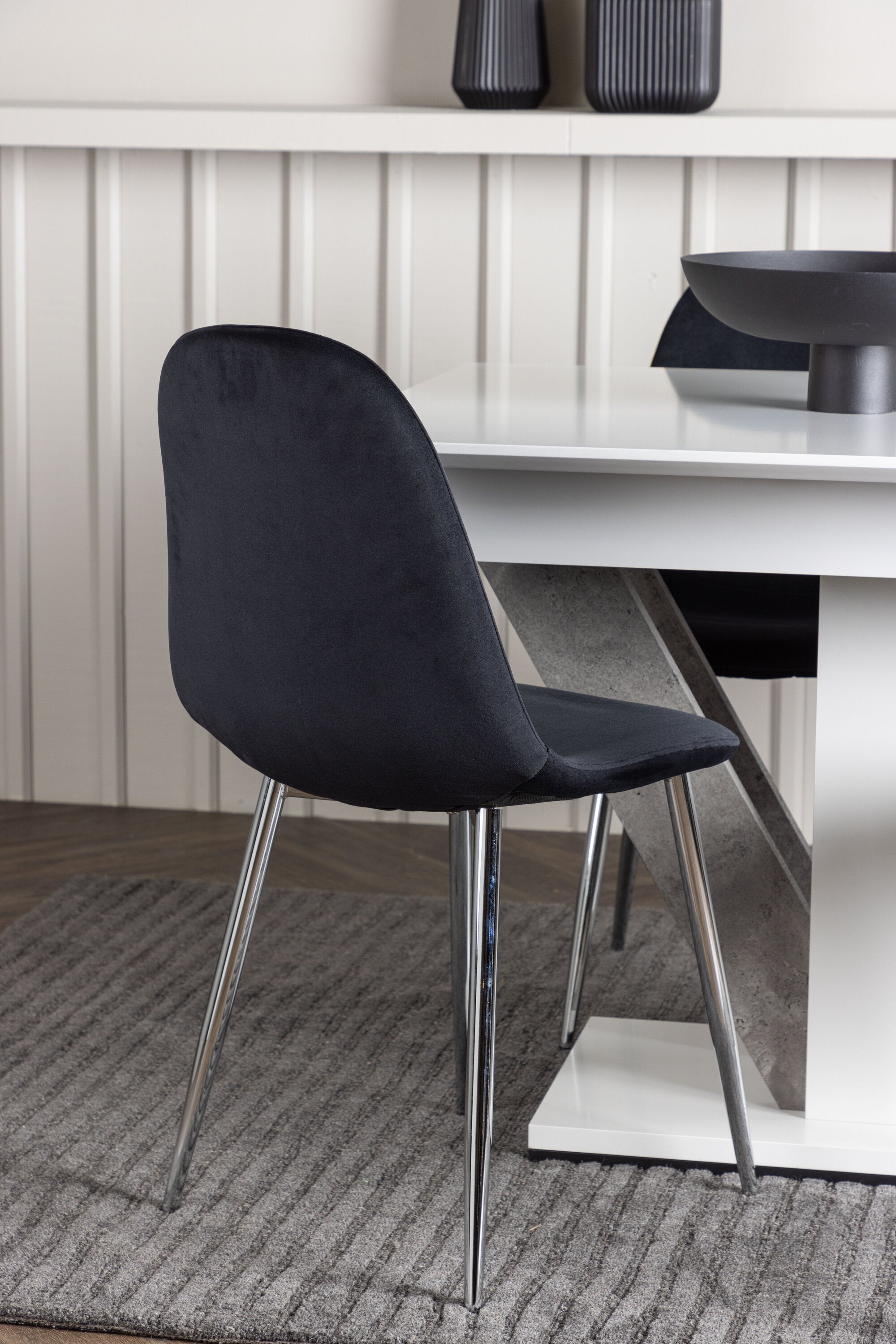 Společně s našimi sametovými židlemi ze série Polar se tato jídelní souprava stává kompletní. Židle Polar zaujmou svým celočalouněným designem, elegantními chromovanými kovovými nohami a mírně zaobleným opěradlem pro extra pohodlí. Sedadlo je potaženo elegantní černou sametovou látkou, která působí luxusně a pohodlně se na něm sedí. Mělo by to být skvělý pocit vrátit se domů na příjemné jídlo!