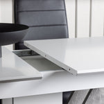 Náš rozkládací jídelní stůl Disa má obdélníkovou desku z bílé MDF a elegantní středovou základnu ze stejného materiálu spolu se dvěma šedými MDF sloupky, které dodávají stylový detail. Ale nejlepší na tom je, že je rozšiřitelný, takže je ideální pro malá i velká setkání. Rozměry stolu jsou 120/160x80cm.