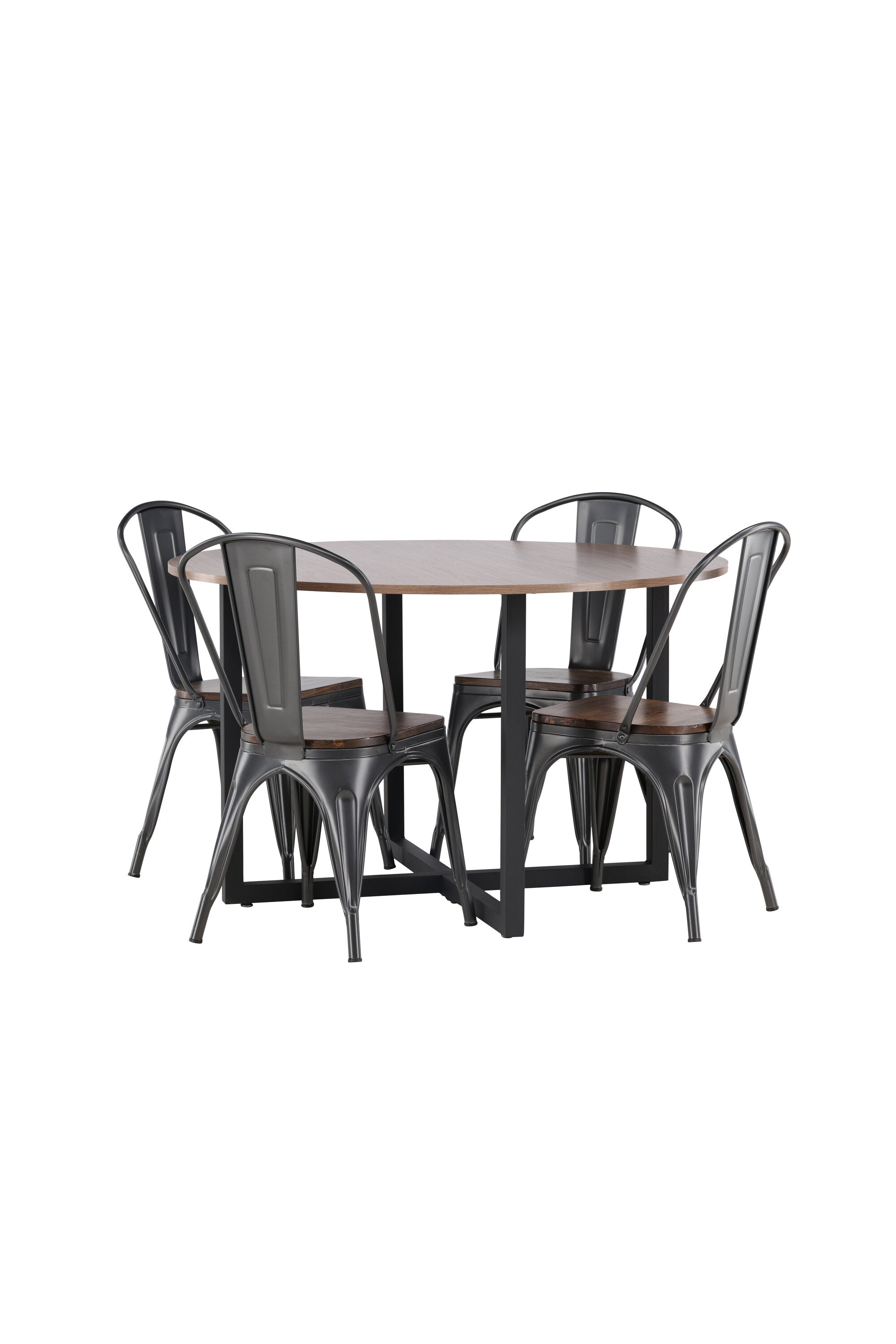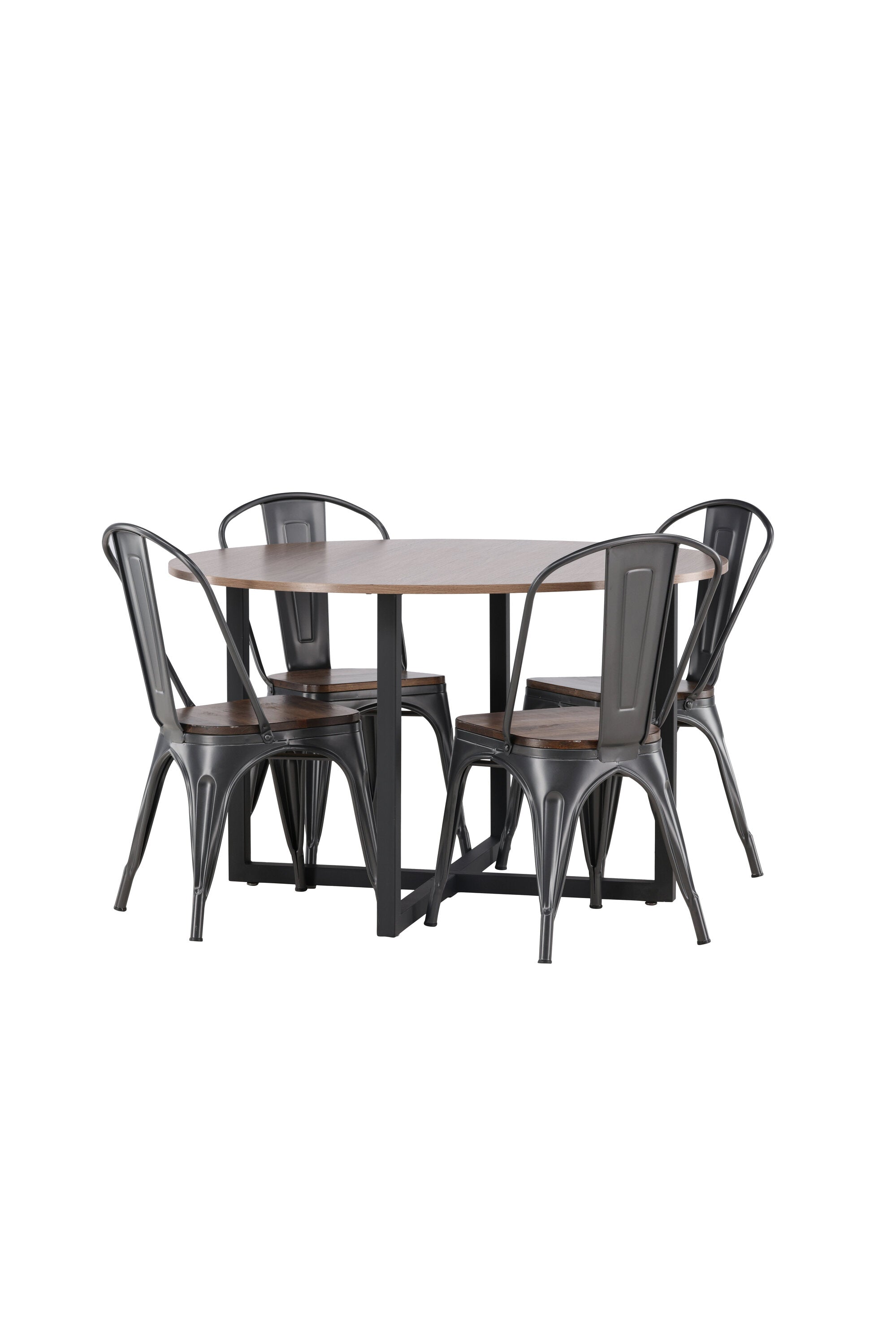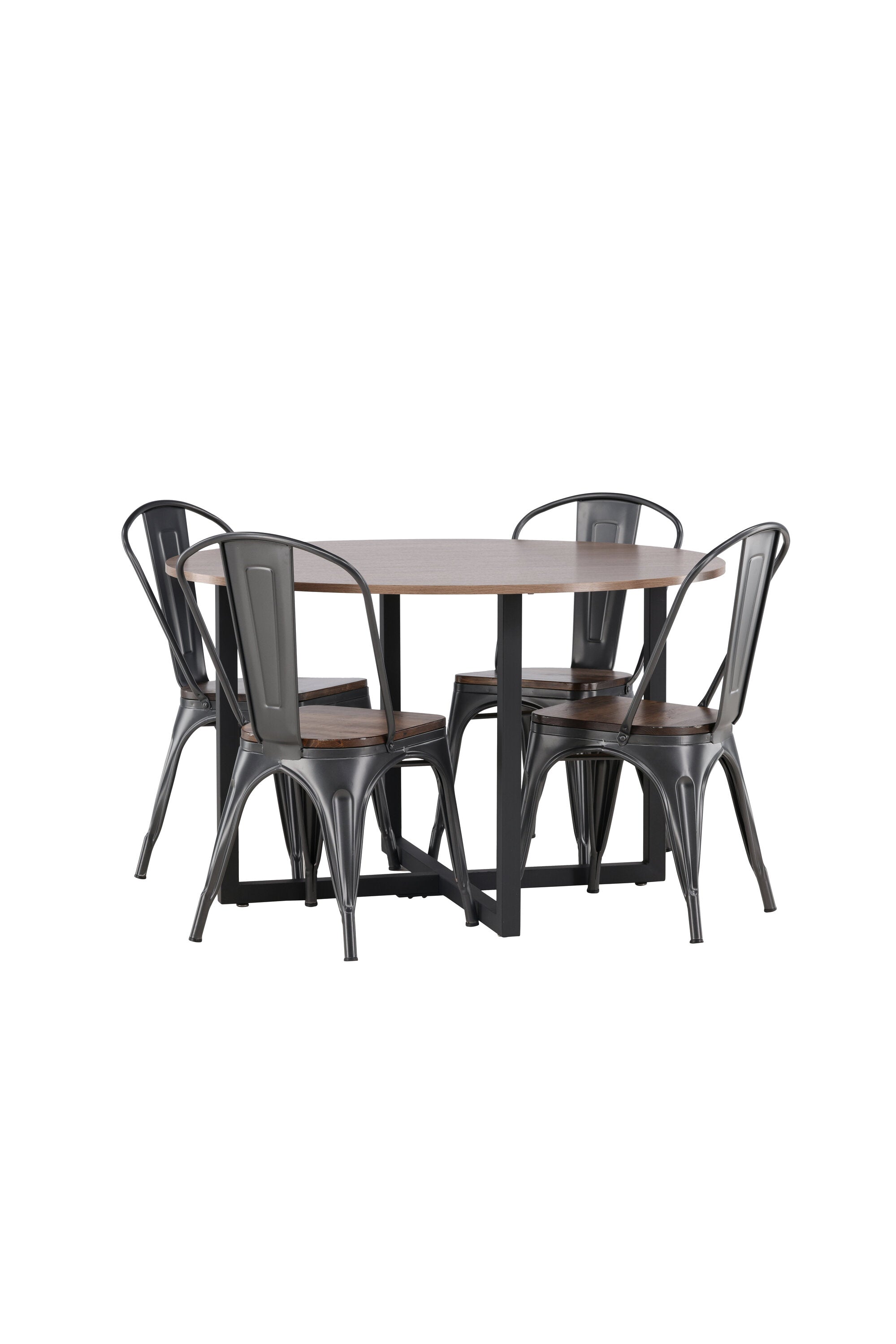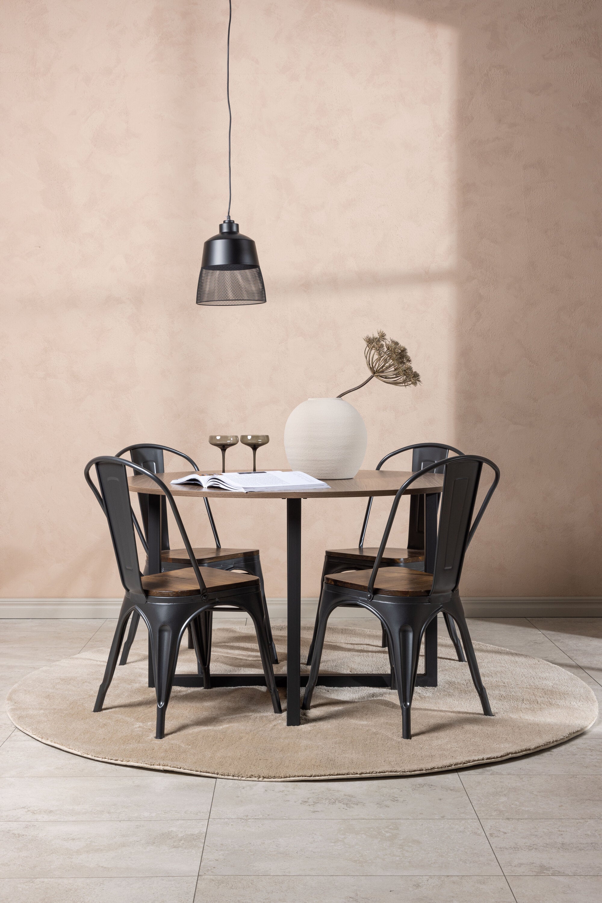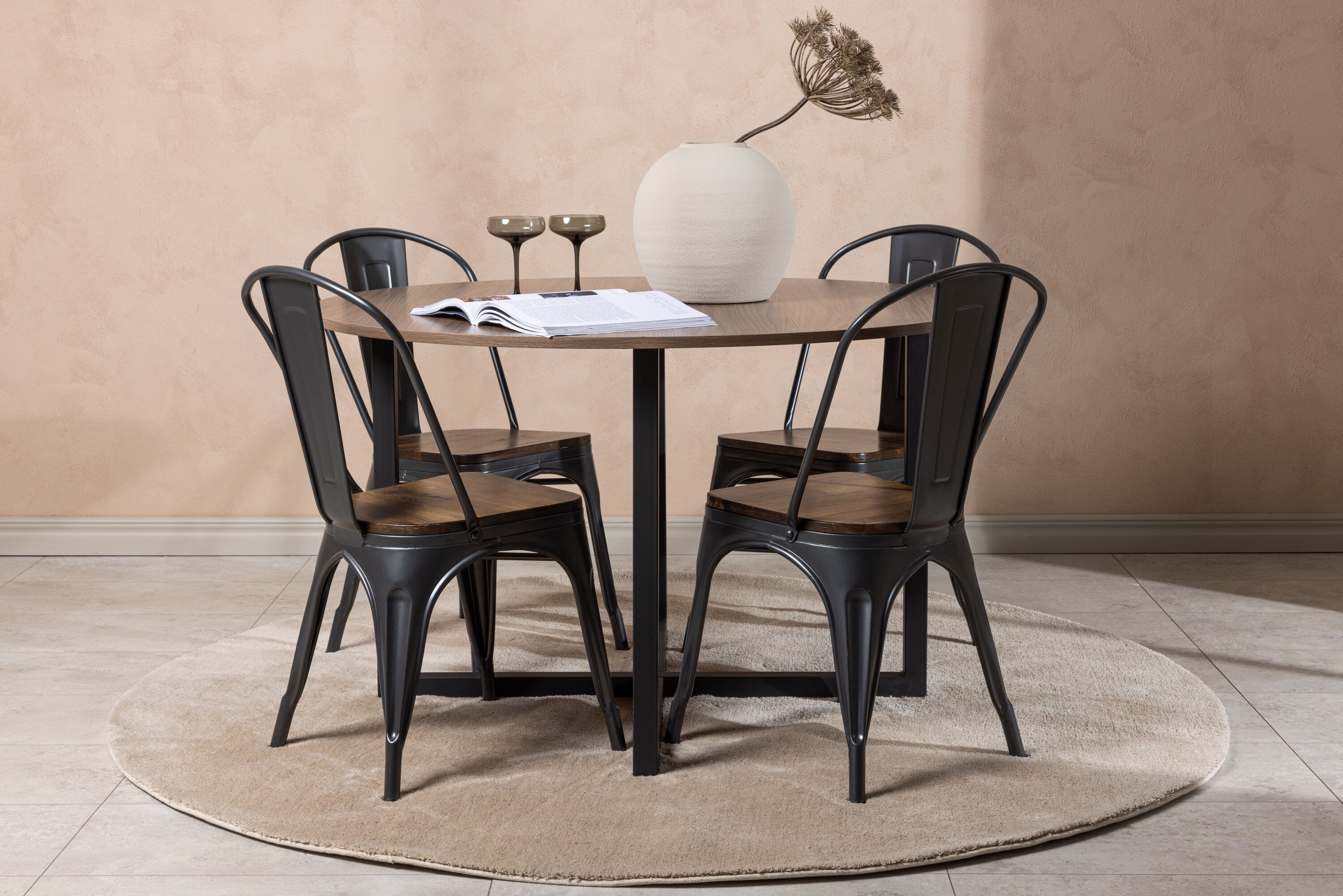 Trendová jídelní sestava s měkkými tvary. Náš kulatý jídelní stůl Durango má desku stolu z MDF v barvě ořechu a rovné nohy stolu z černé oceli, které se na podlaze sbíhají do kříže. Zde stylově ladí s trendy židlemi ze série Tempe. Židle má klasický design rustikální židle s mírně rozšířenými nohami z tmavě šedé oceli a sedákem z tmavého dřeva. Je stylový a luxusní! Rozměry stolu: 120 cm.