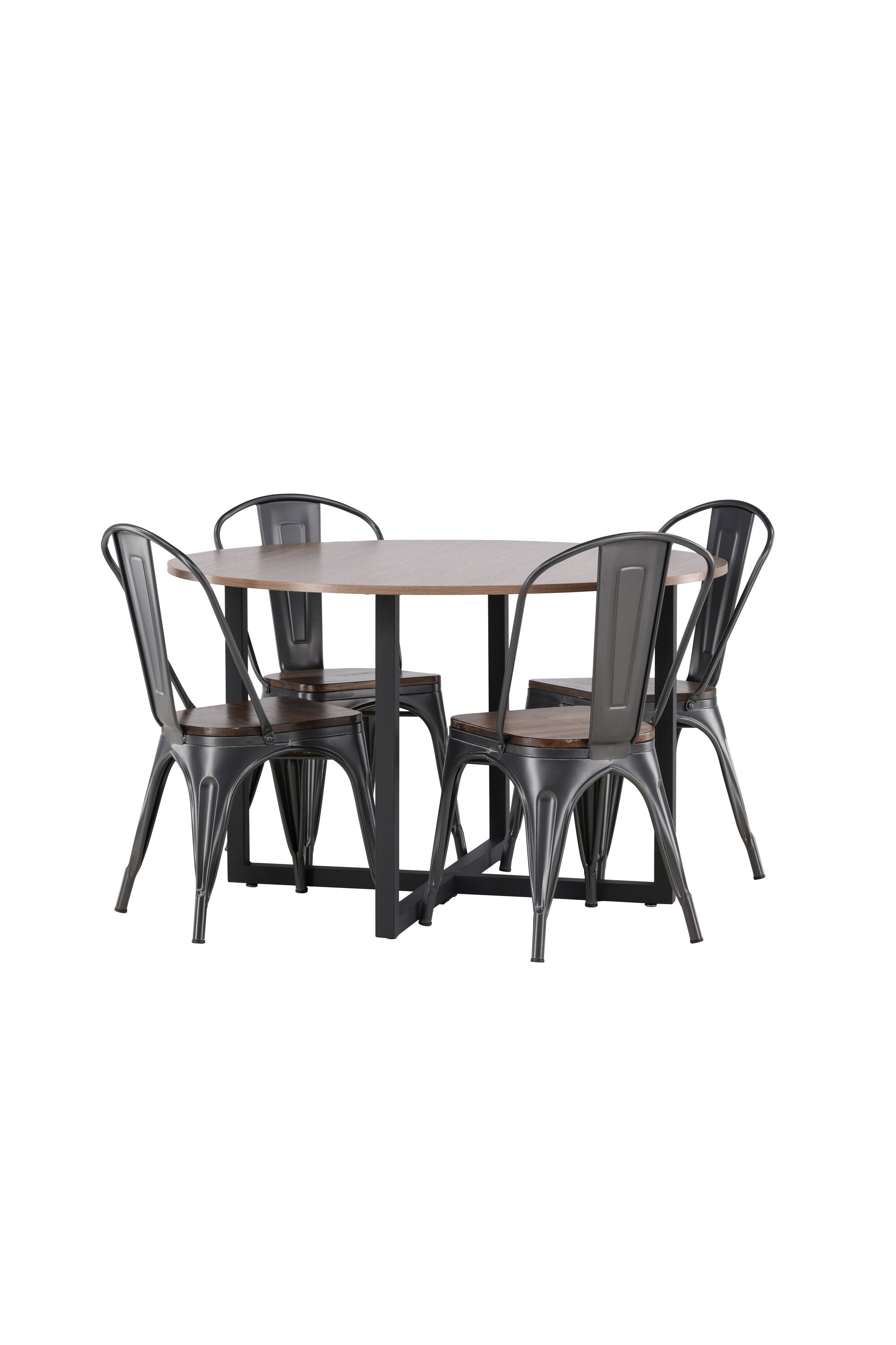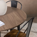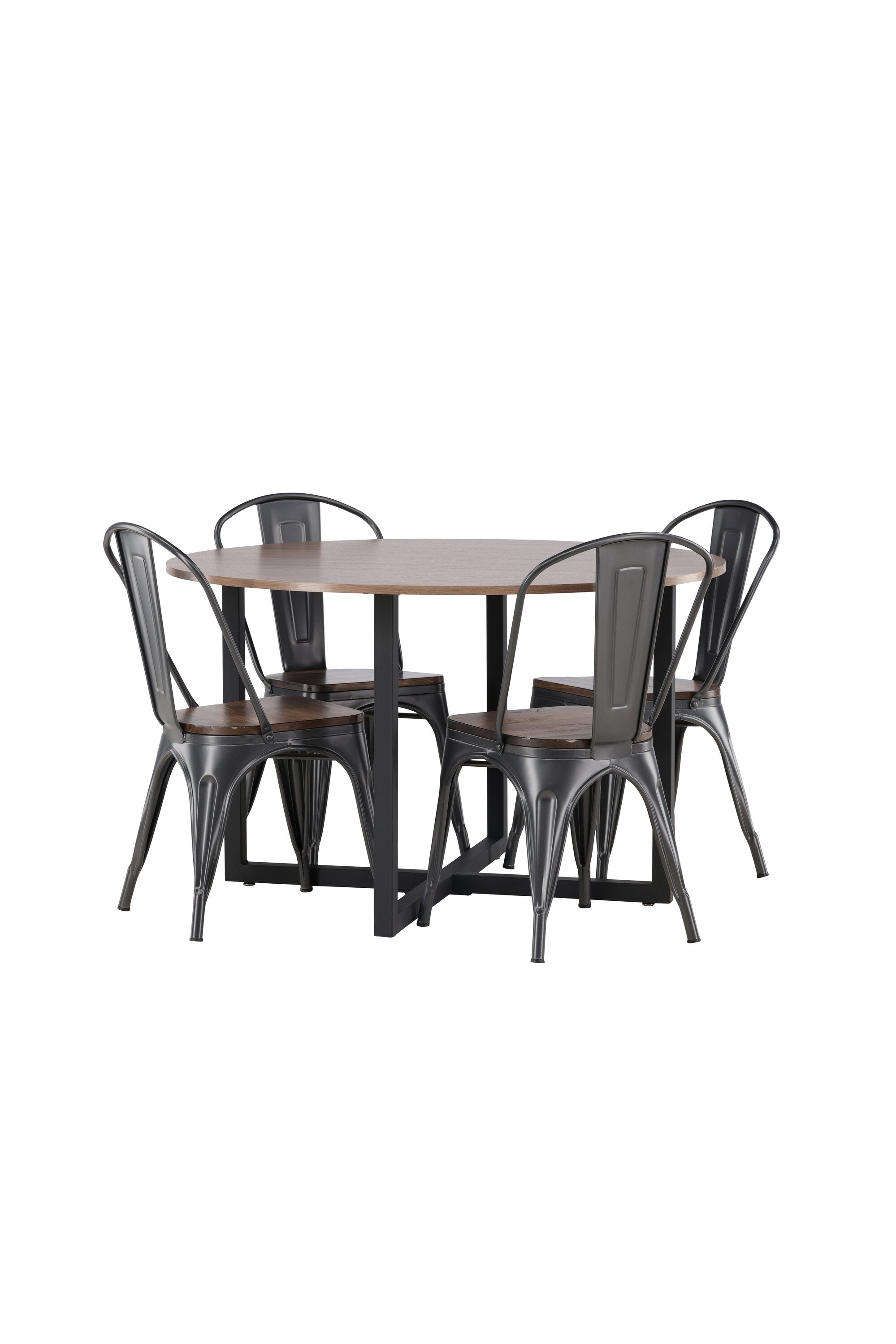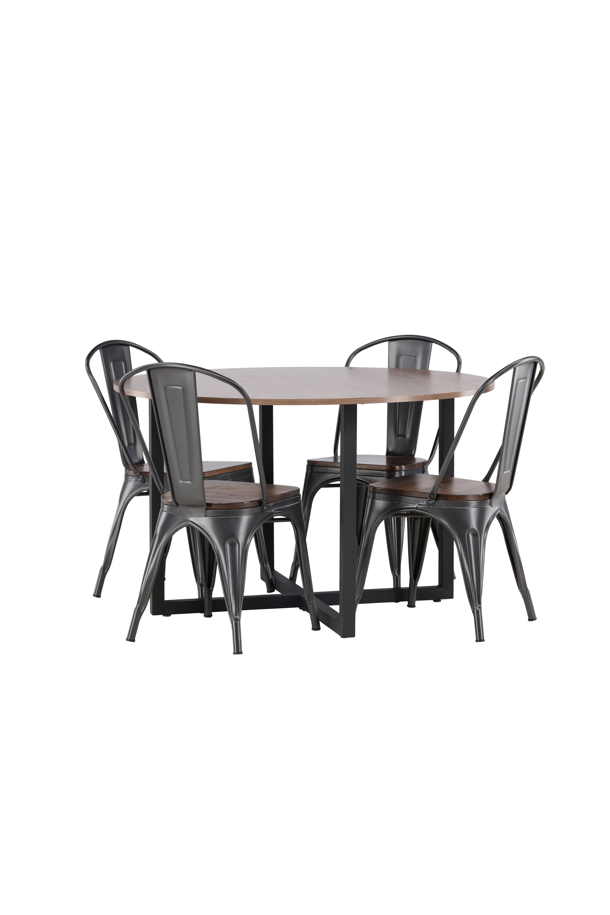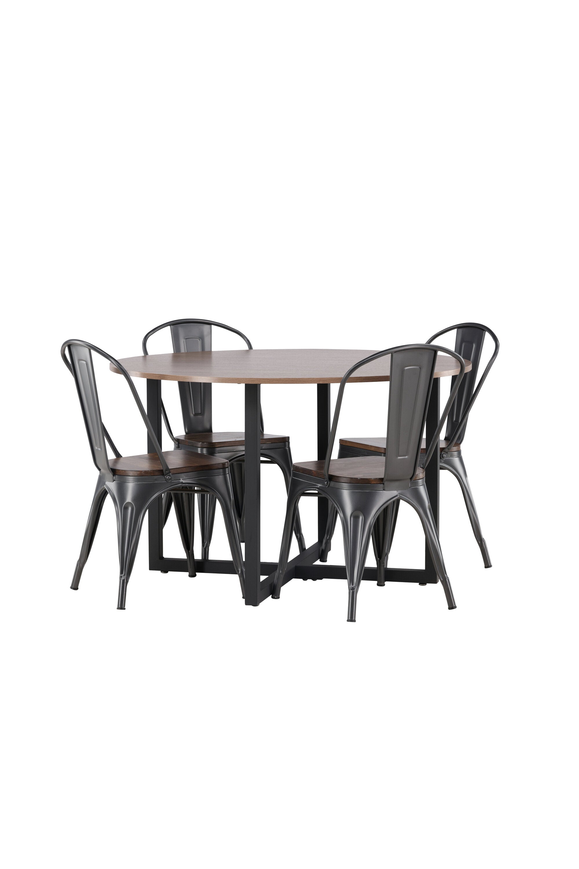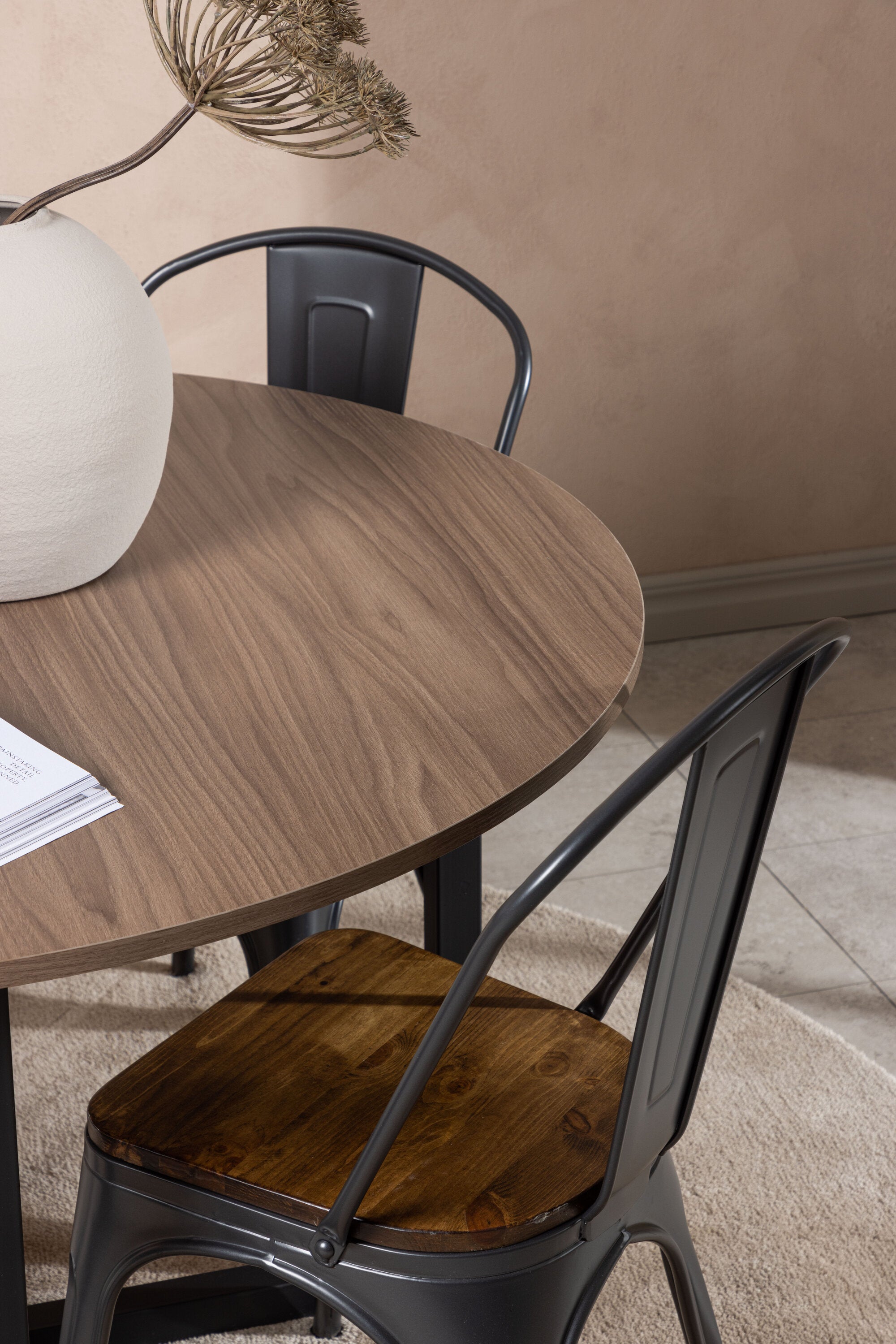 Trendová jídelní sestava s měkkými tvary. Náš kulatý jídelní stůl Durango má desku stolu z MDF v barvě ořechu a rovné nohy stolu z černé oceli, které se na podlaze sbíhají do kříže. Zde stylově ladí s trendy židlemi ze série Tempe. Židle má klasický design rustikální židle s mírně rozšířenými nohami z tmavě šedé oceli a sedákem z tmavého dřeva. Je stylový a luxusní! Rozměry stolu: 120 cm.