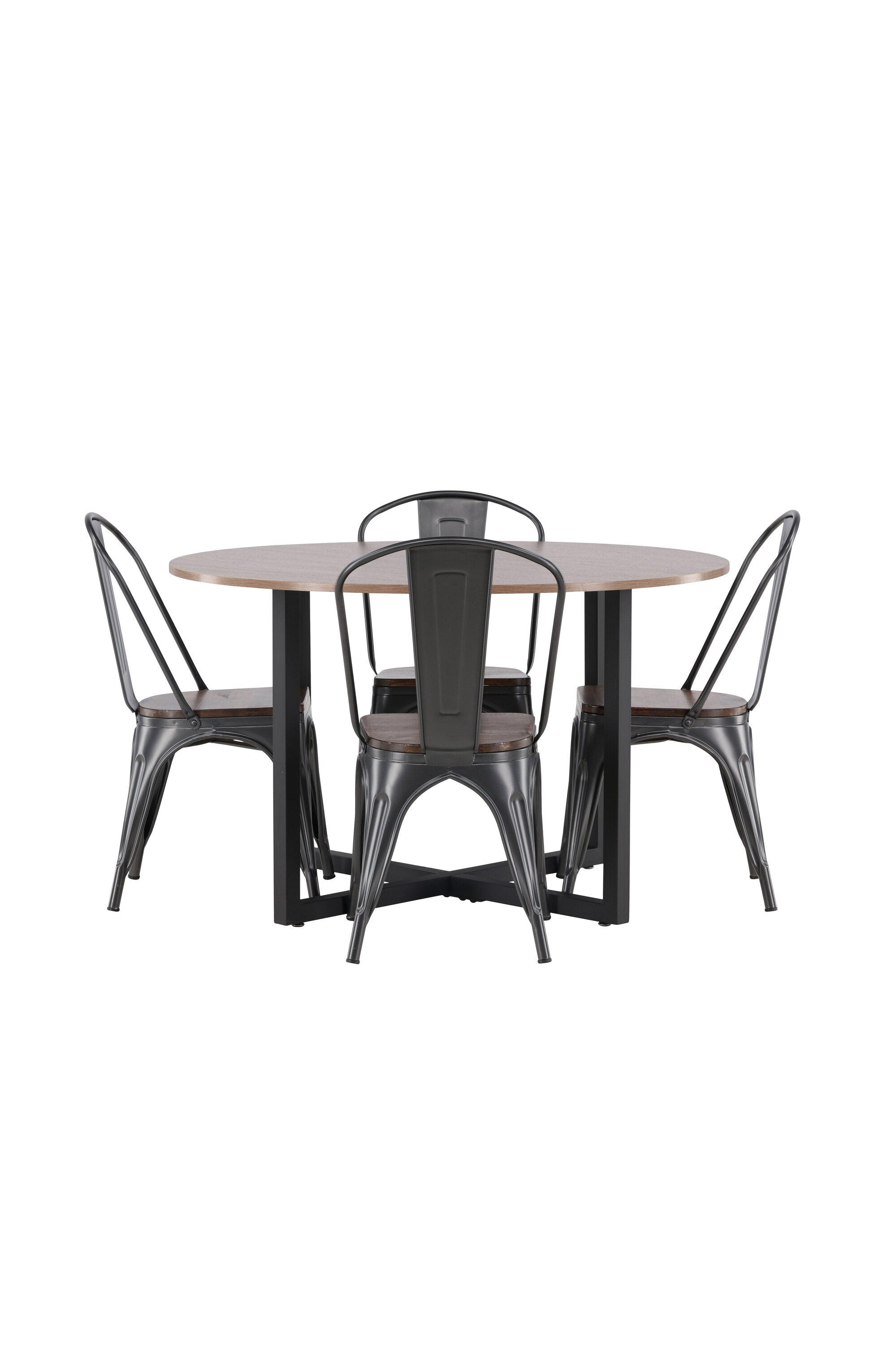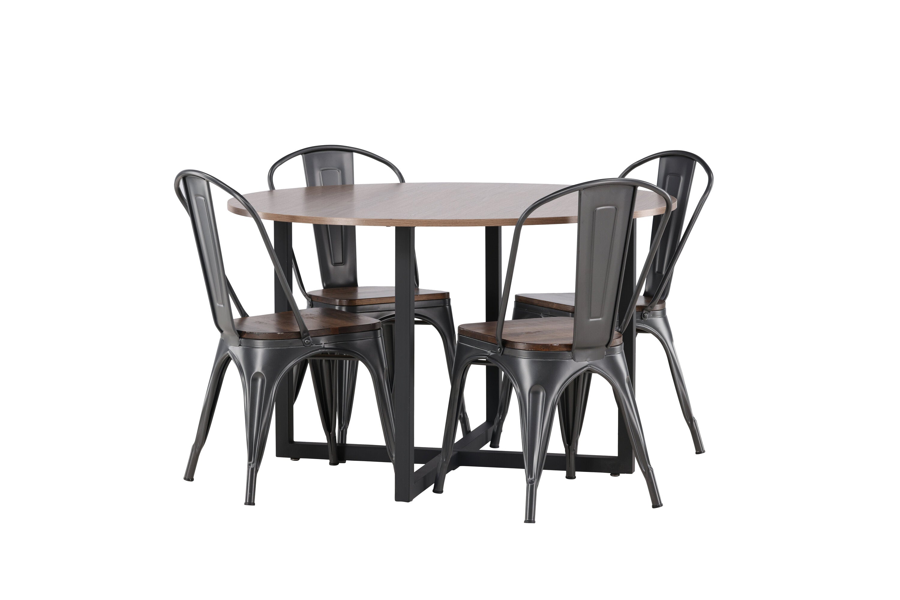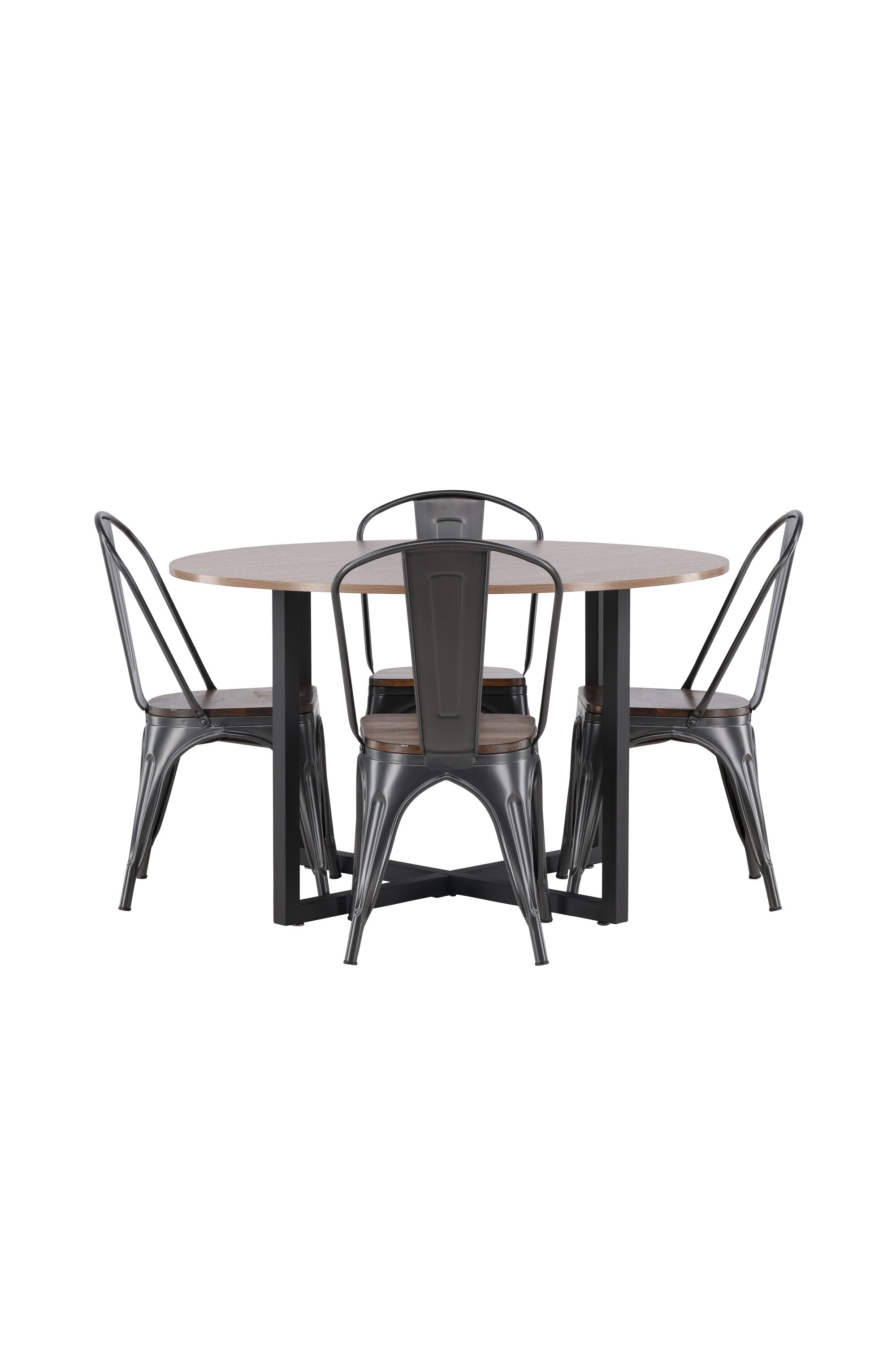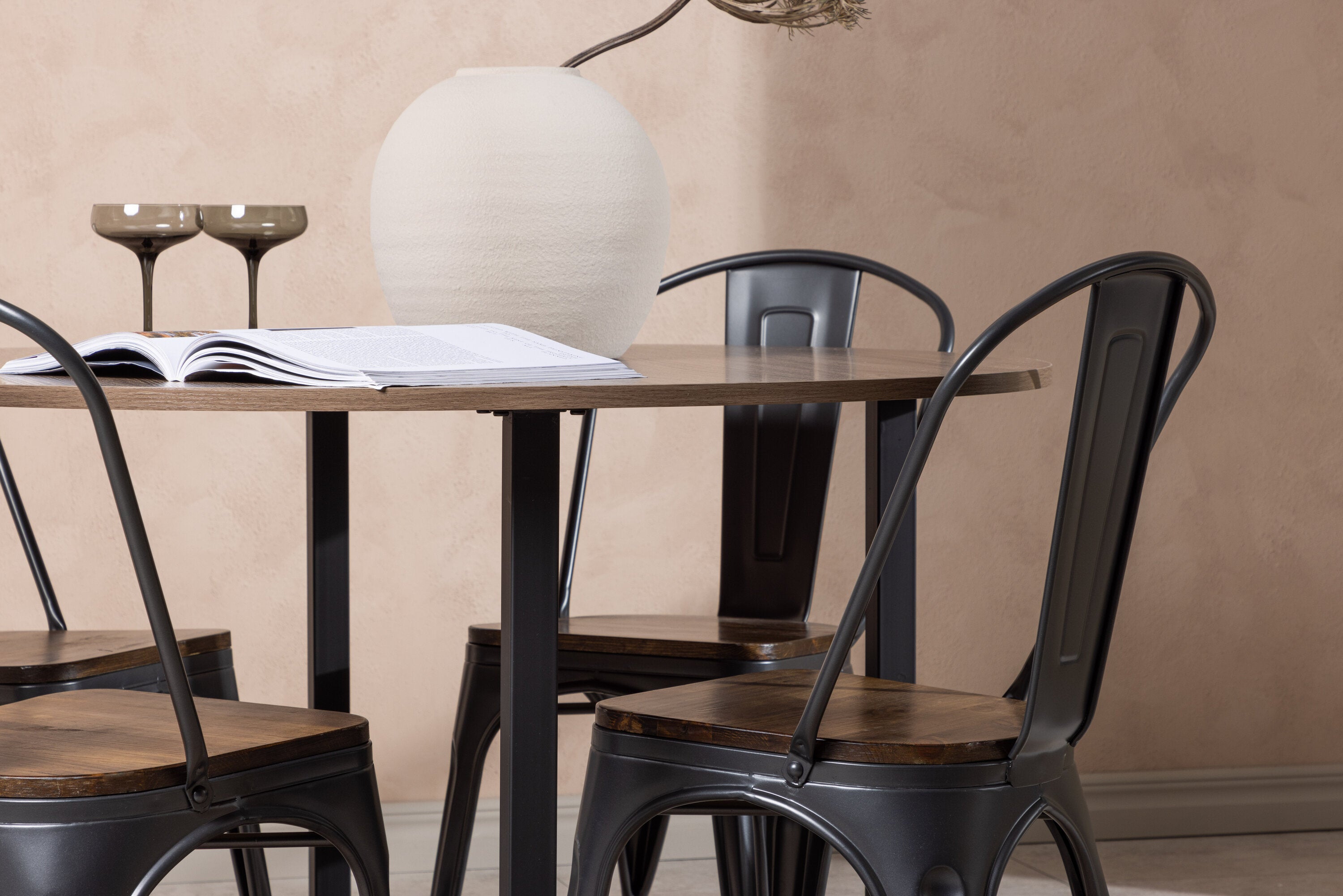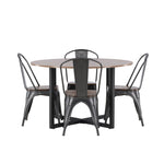 Trendová jídelní sestava s měkkými tvary. Náš kulatý jídelní stůl Durango má desku stolu z MDF v barvě ořechu a rovné nohy stolu z černé oceli, které se na podlaze sbíhají do kříže. Zde stylově ladí s trendy židlemi ze série Tempe. Židle má klasický design rustikální židle s mírně rozšířenými nohami z tmavě šedé oceli a sedákem z tmavého dřeva. Je stylový a luxusní! Rozměry stolu: 120 cm.