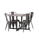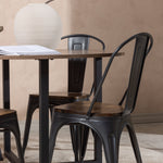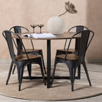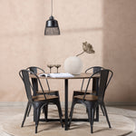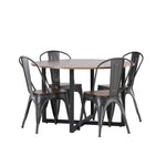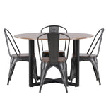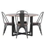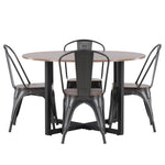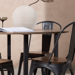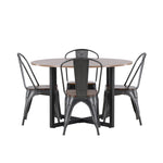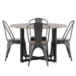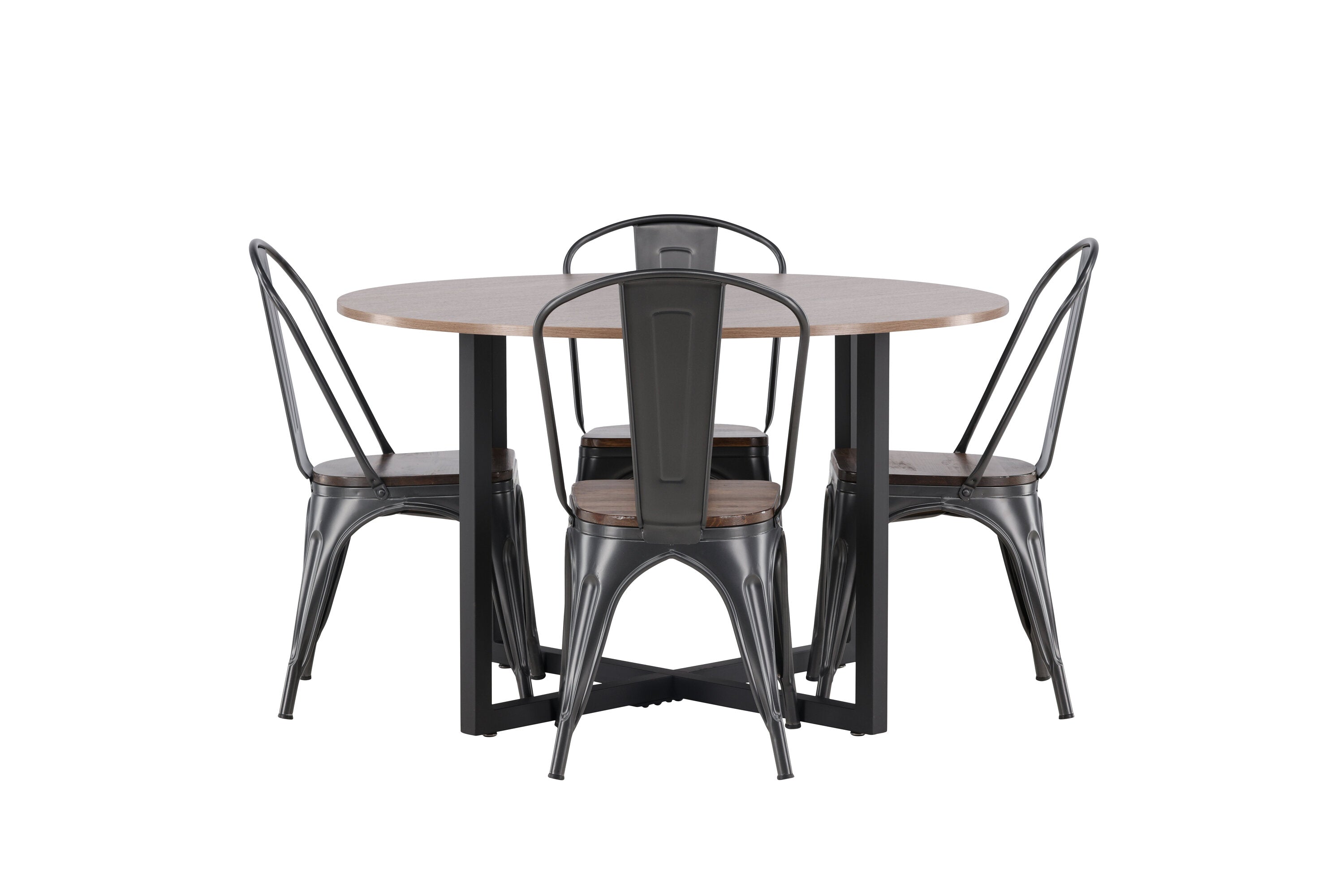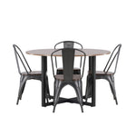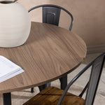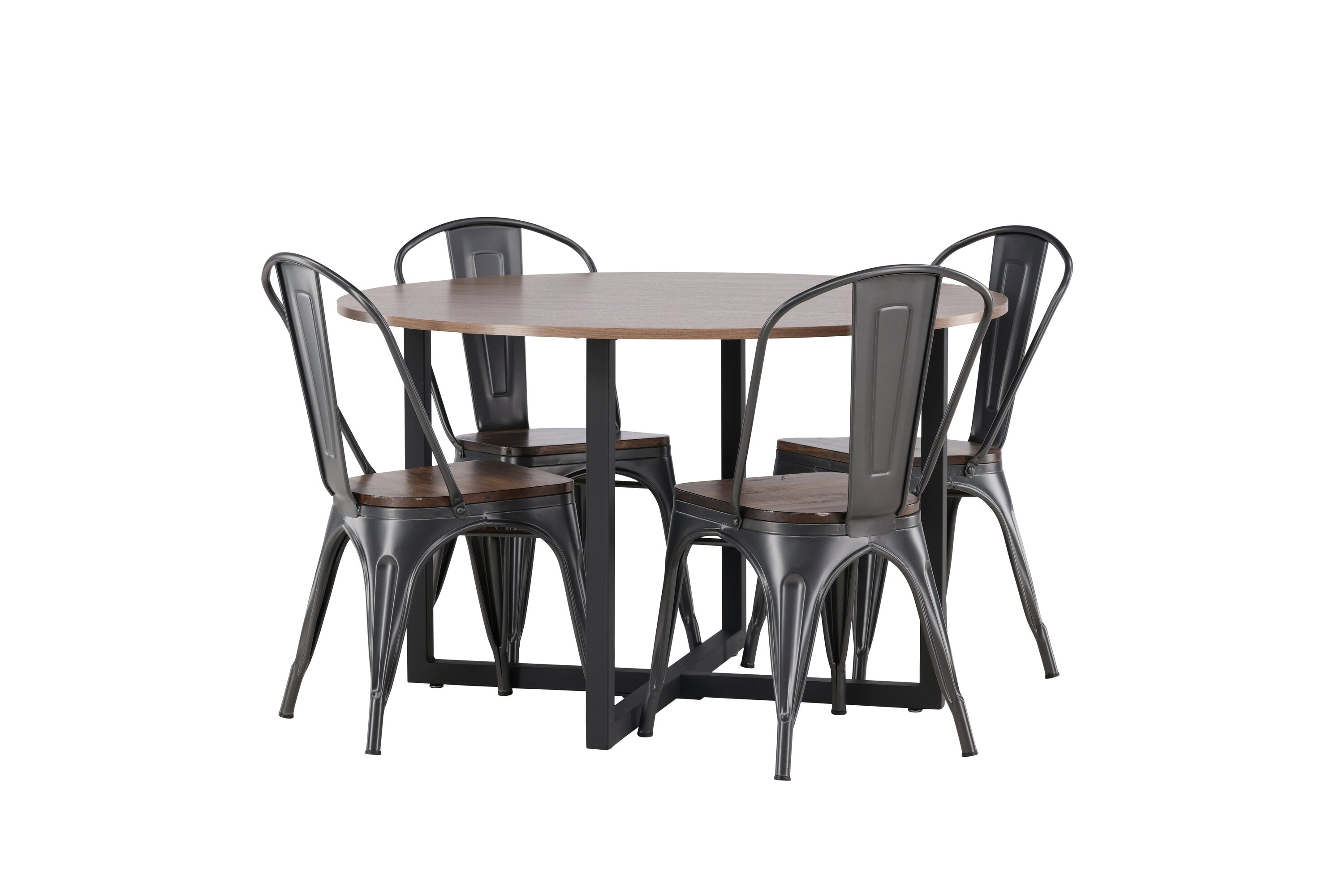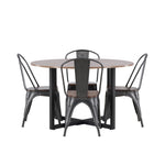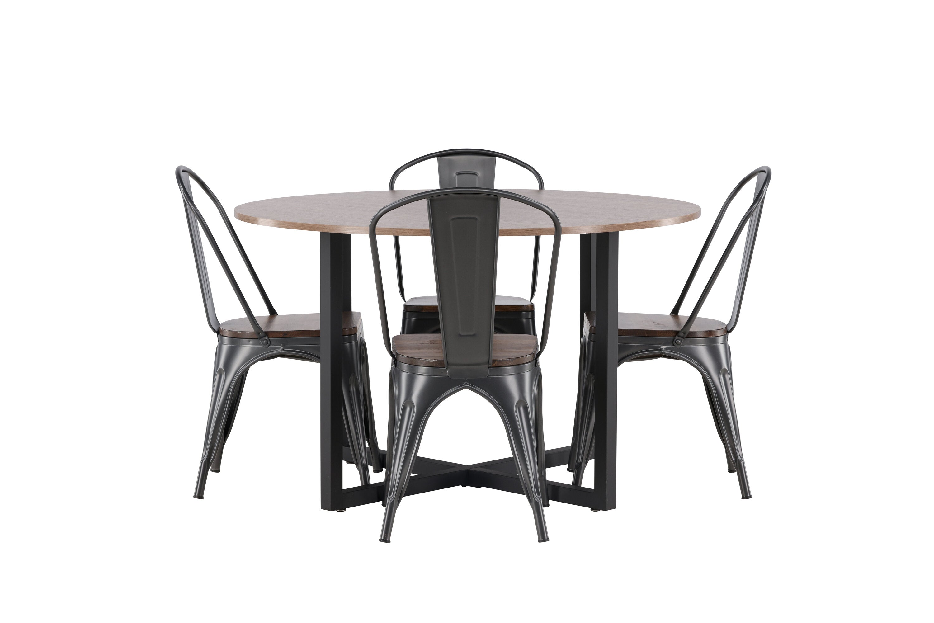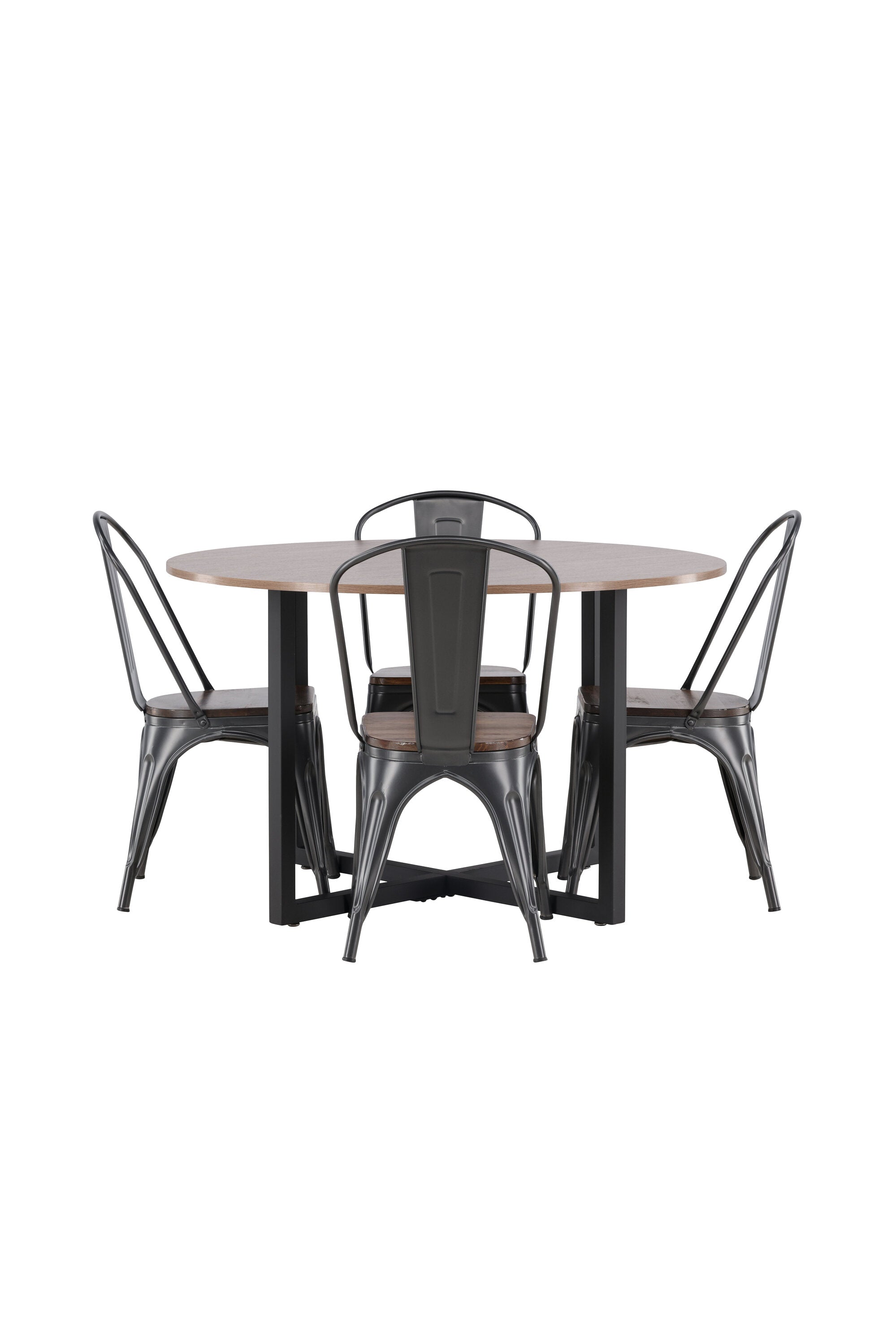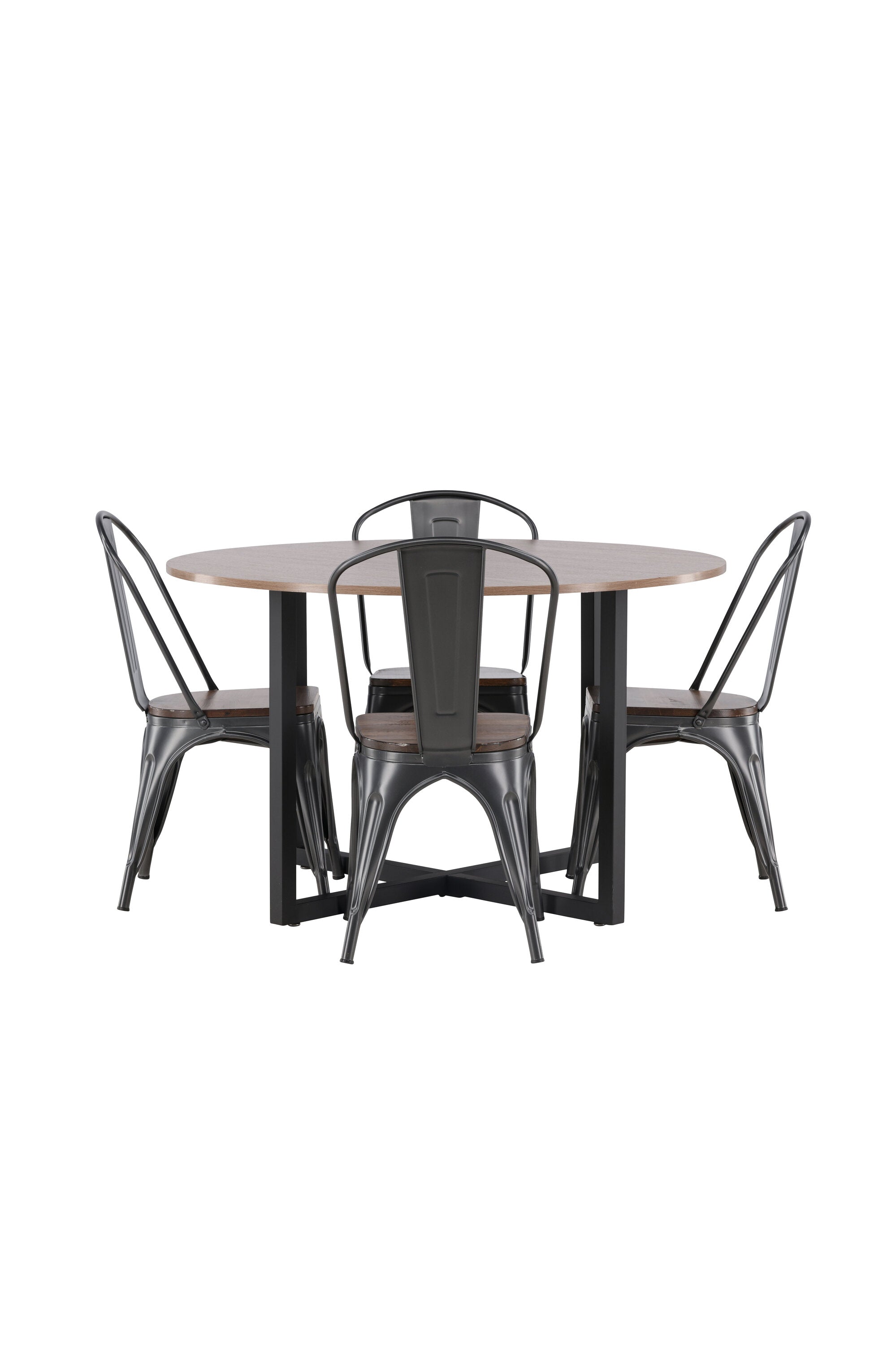 Trendová jídelní sestava s měkkými tvary. Náš kulatý jídelní stůl Durango má desku stolu z MDF v barvě ořechu a rovné nohy stolu z černé oceli, které se na podlaze sbíhají do kříže. Zde stylově ladí s trendy židlemi ze série Tempe. Židle má klasický design rustikální židle s mírně rozšířenými nohami z tmavě šedé oceli a sedákem z tmavého dřeva. Je stylový a luxusní! Rozměry stolu: 120 cm.