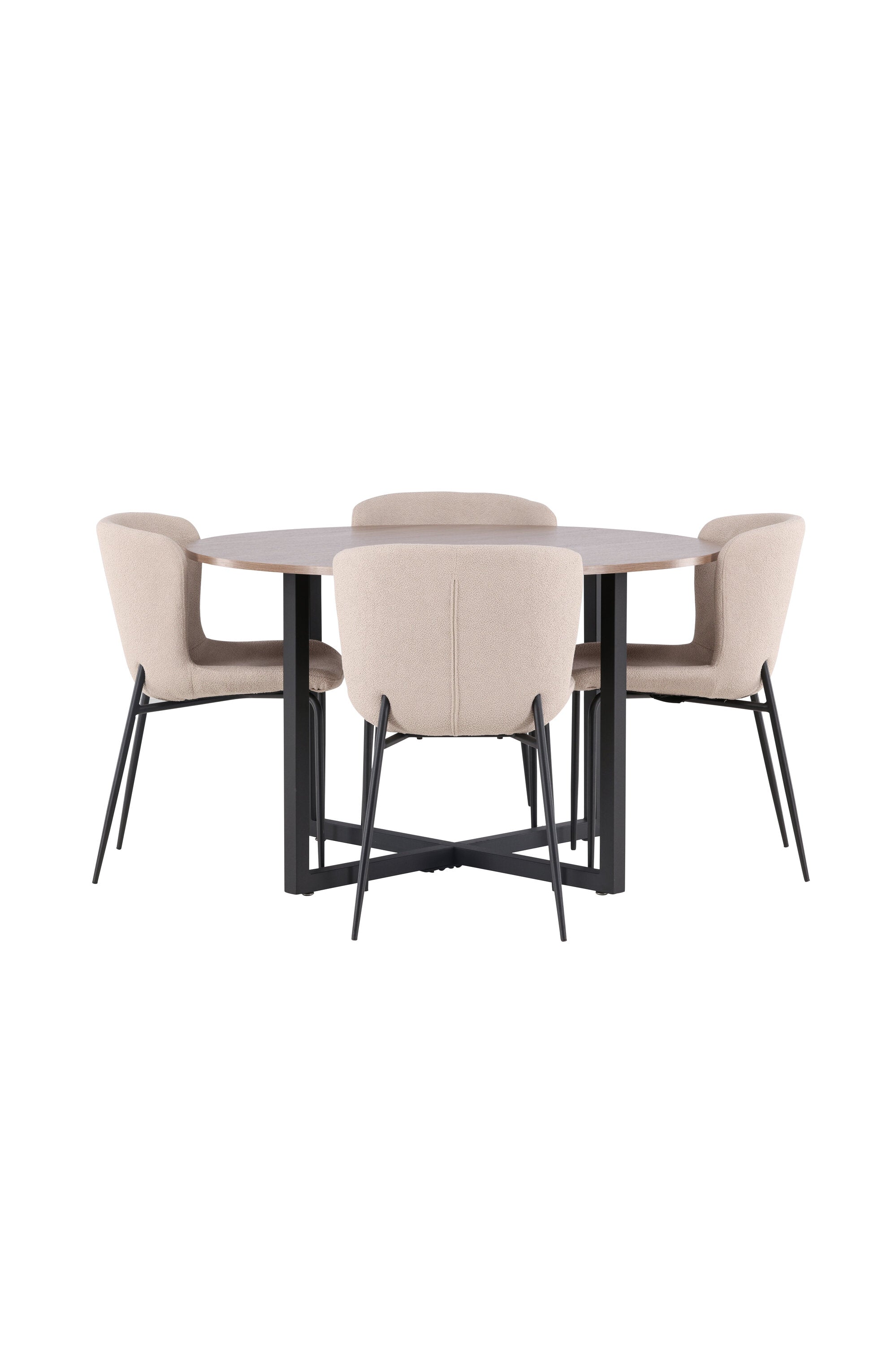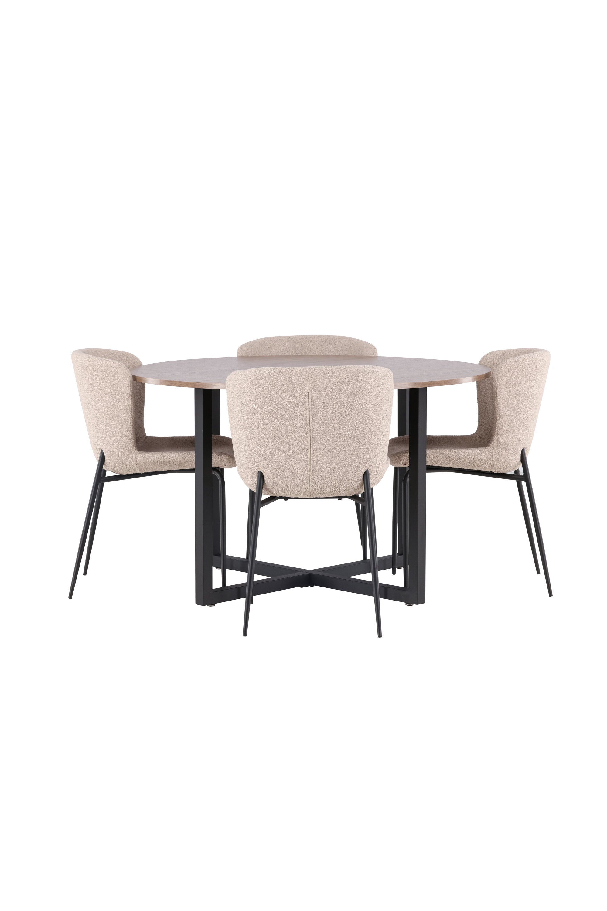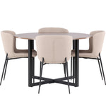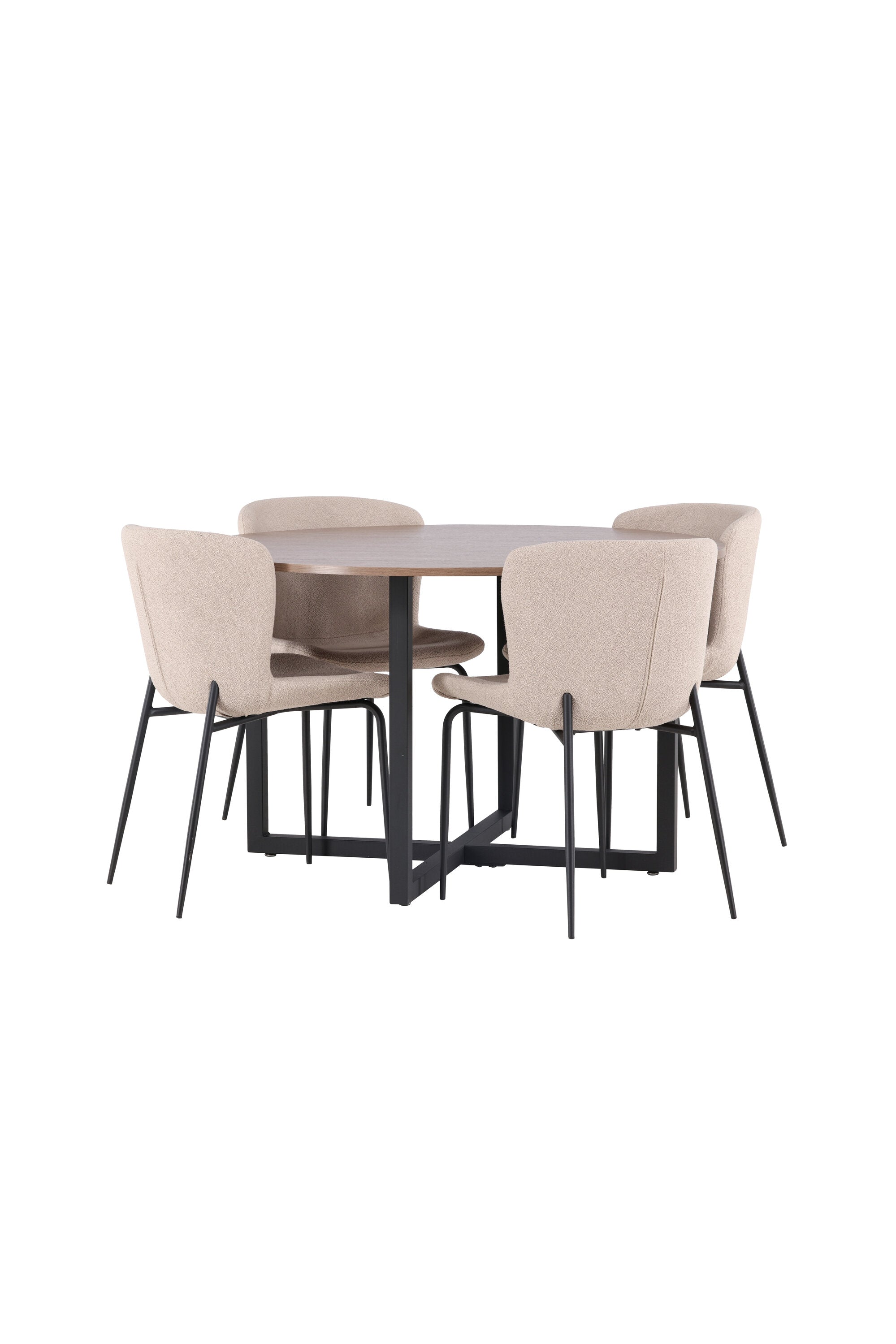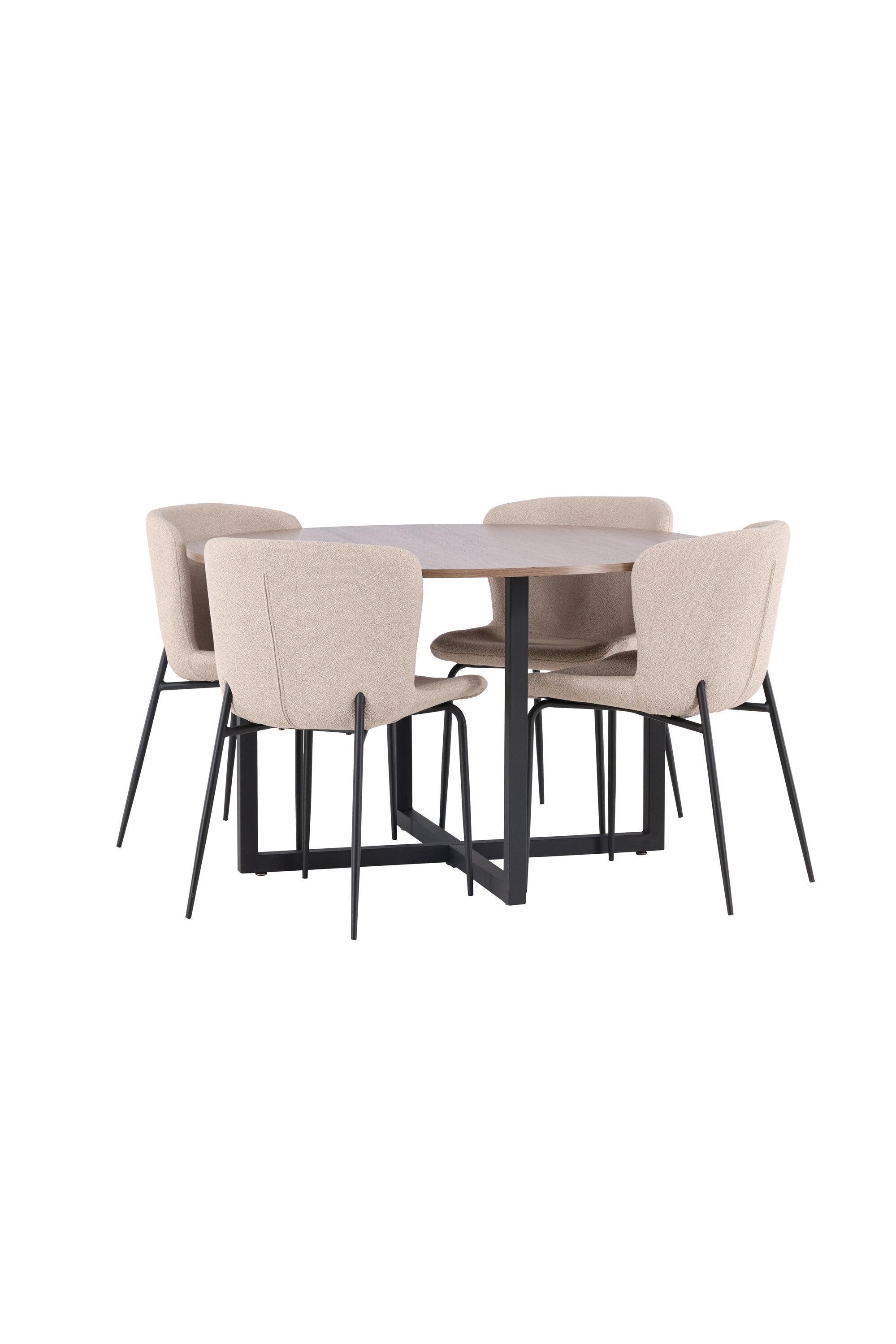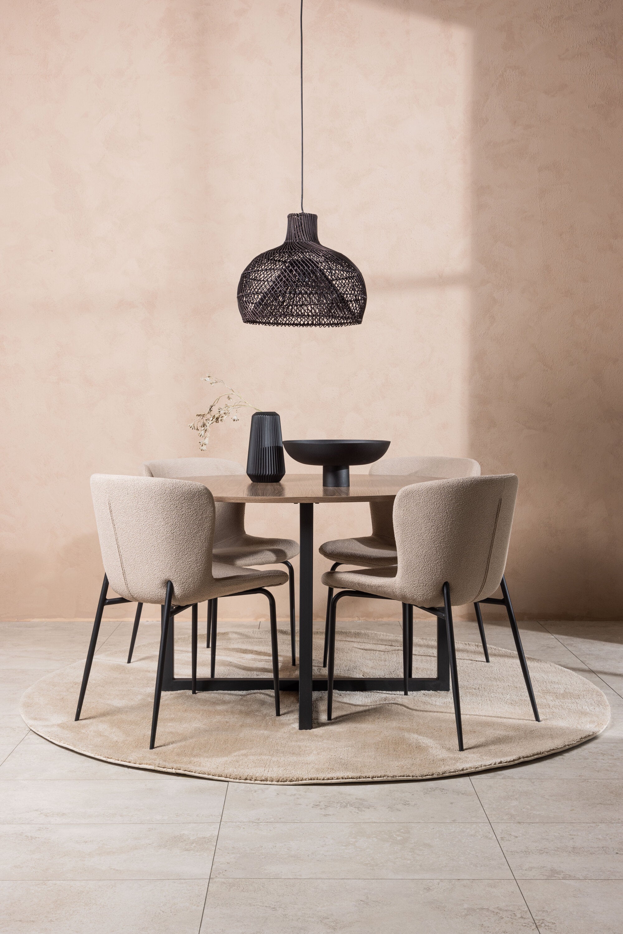 Zařiďte luxusně a lákavě! Náš kulatý jídelní stůl Durango má desku stolu z MDF v barvě ořechu a rovné nohy stolu z černé oceli, které se na podlaze sbíhají do kříže. Zde společně s módními jídelními židlemi ze série Modesto. Židle je celočalouněná béžovou chlupatou látkou se stylovými úzkými nohami židle v černém kovu. Mírně zaoblená záda a čalouněný sedák poskytují extra pohodlí a rozšiřují příjemné jídlo kolem jídelního stolu. Už to nebude lepší než tohle! Rozměry stolu: 120 cm.