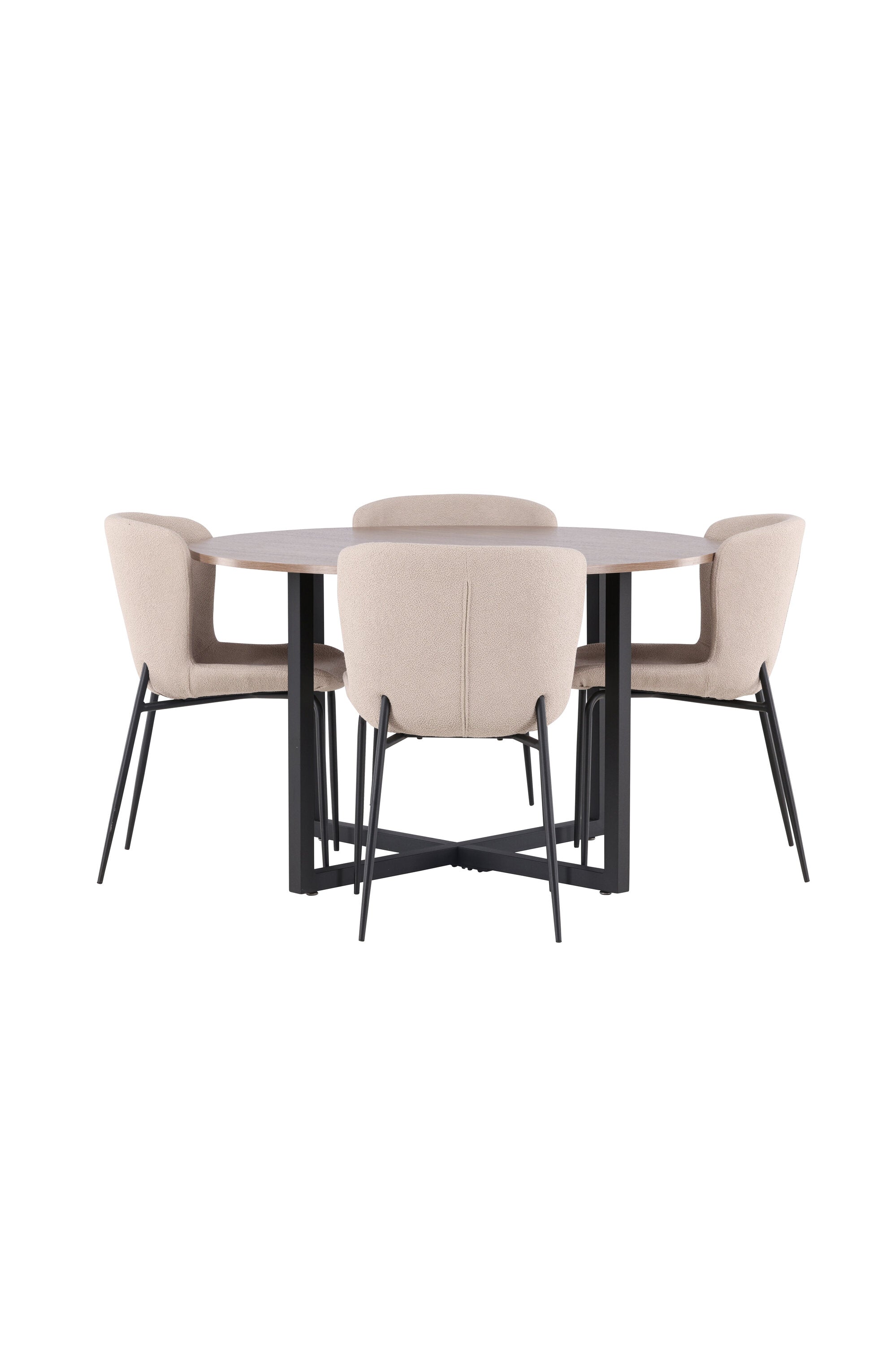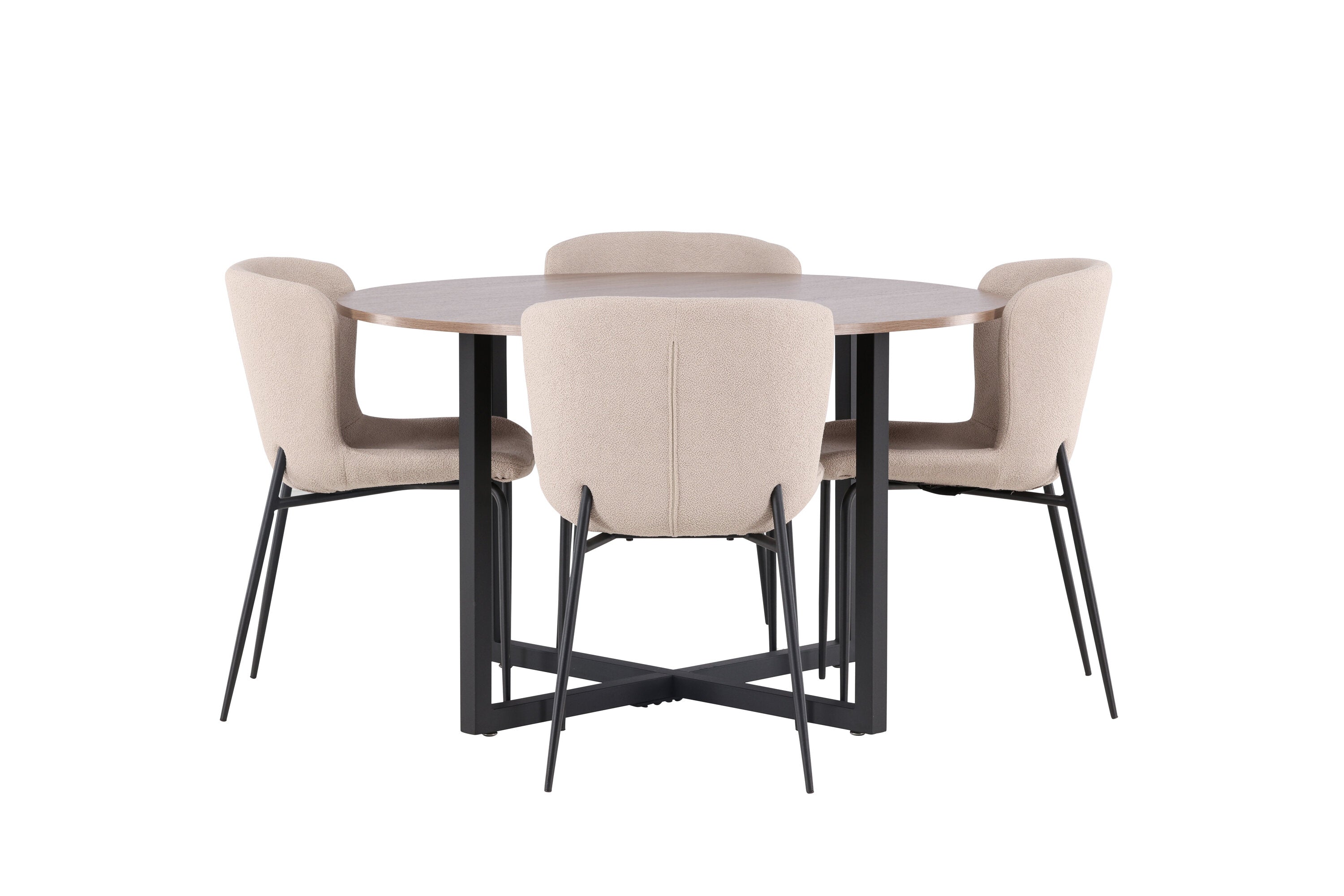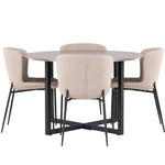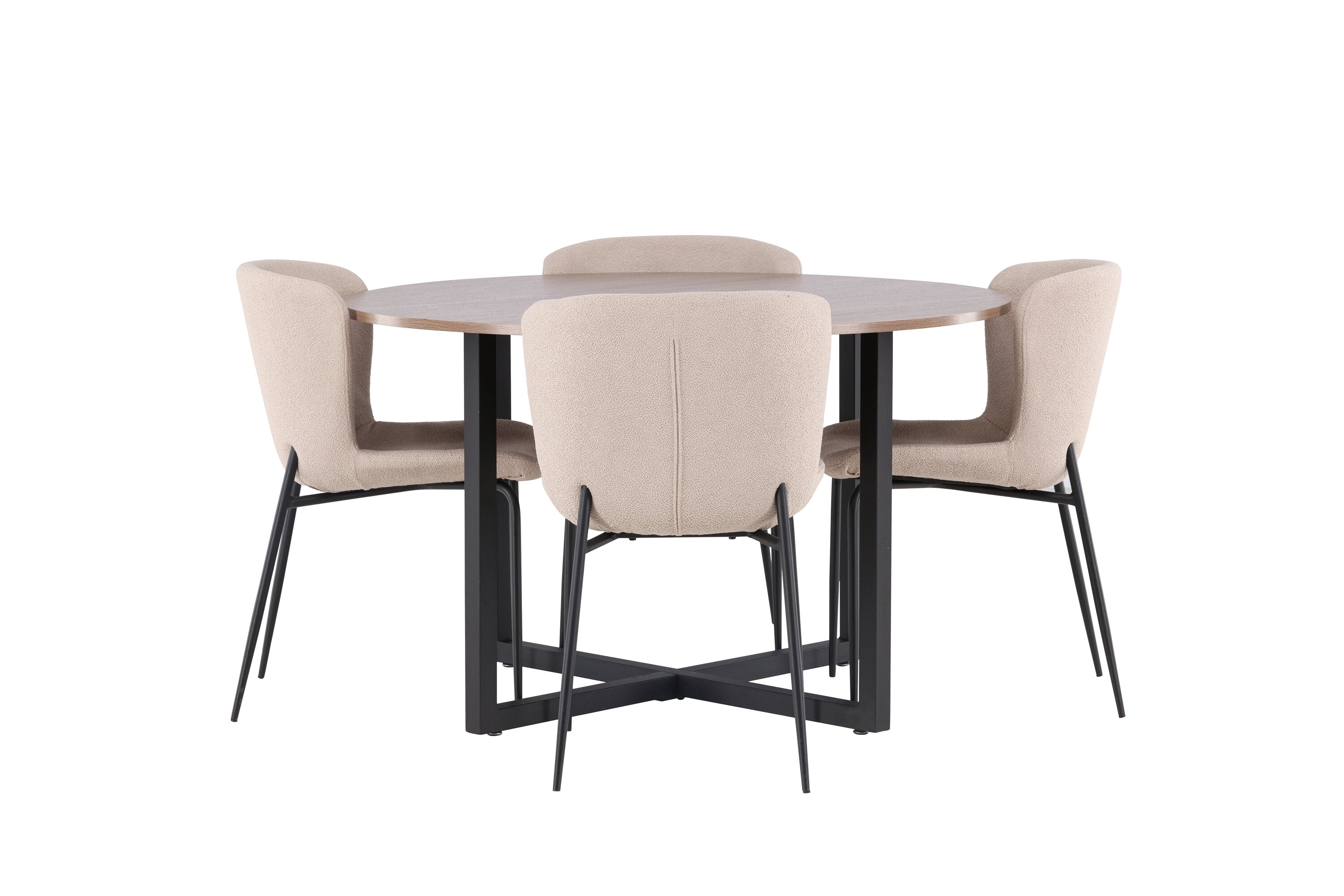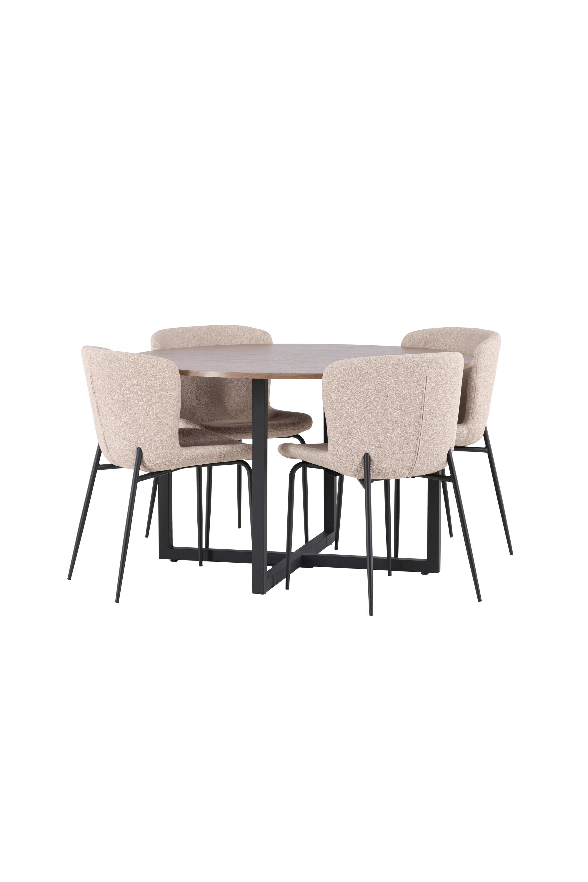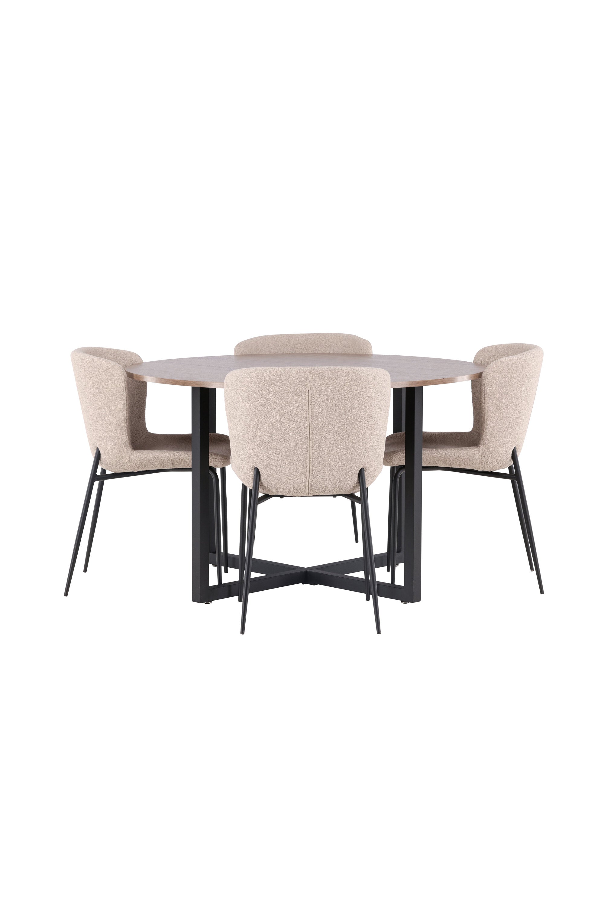 Zařiďte luxusně a lákavě! Náš kulatý jídelní stůl Durango má desku stolu z MDF v barvě ořechu a rovné nohy stolu z černé oceli, které se na podlaze sbíhají do kříže. Zde společně s módními jídelními židlemi ze série Modesto. Židle je celočalouněná béžovou chlupatou látkou se stylovými úzkými nohami židle v černém kovu. Mírně zaoblená záda a čalouněný sedák poskytují extra pohodlí a rozšiřují příjemné jídlo kolem jídelního stolu. Už to nebude lepší než tohle! Rozměry stolu: 120 cm.