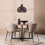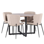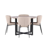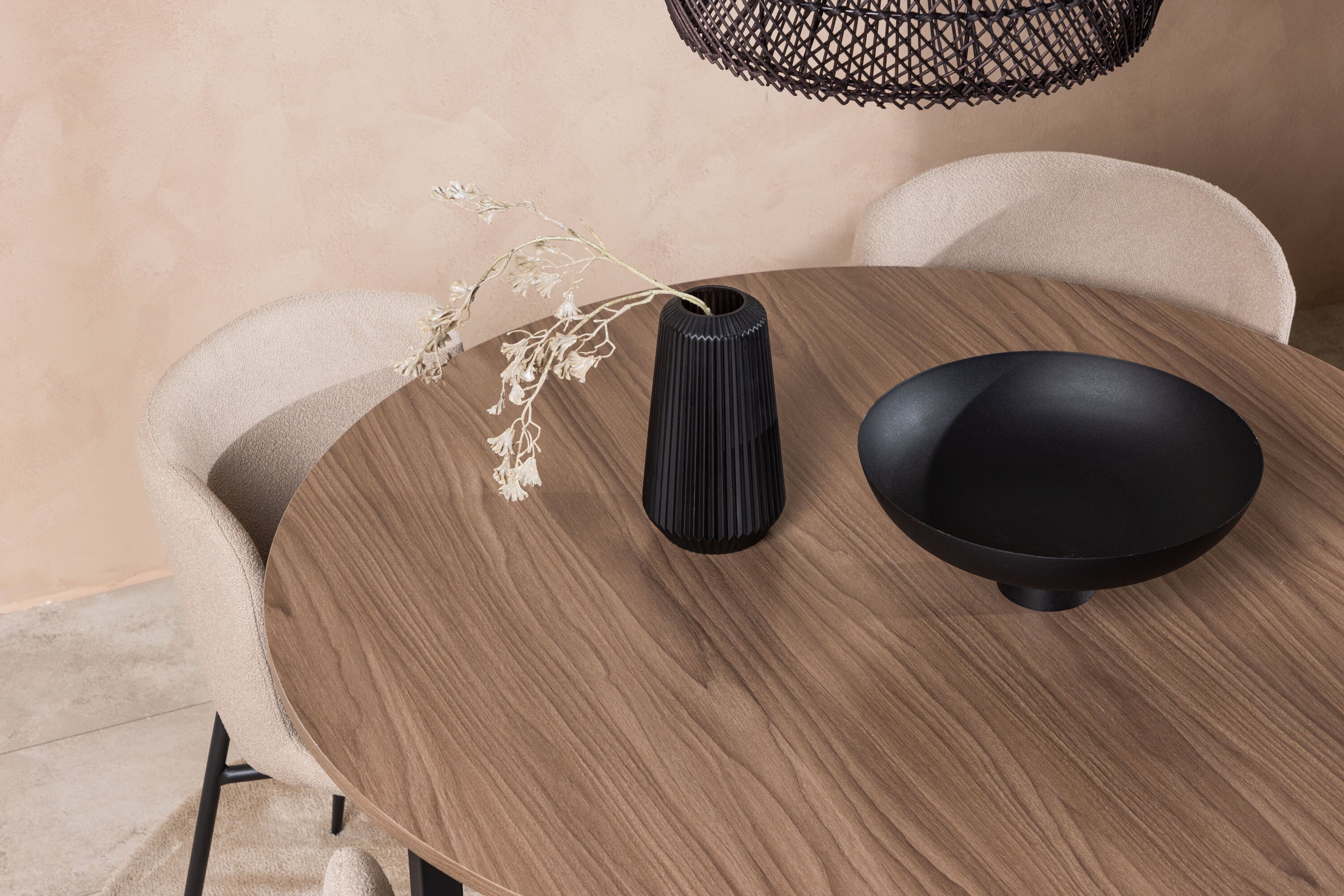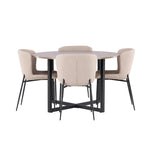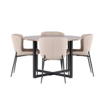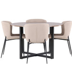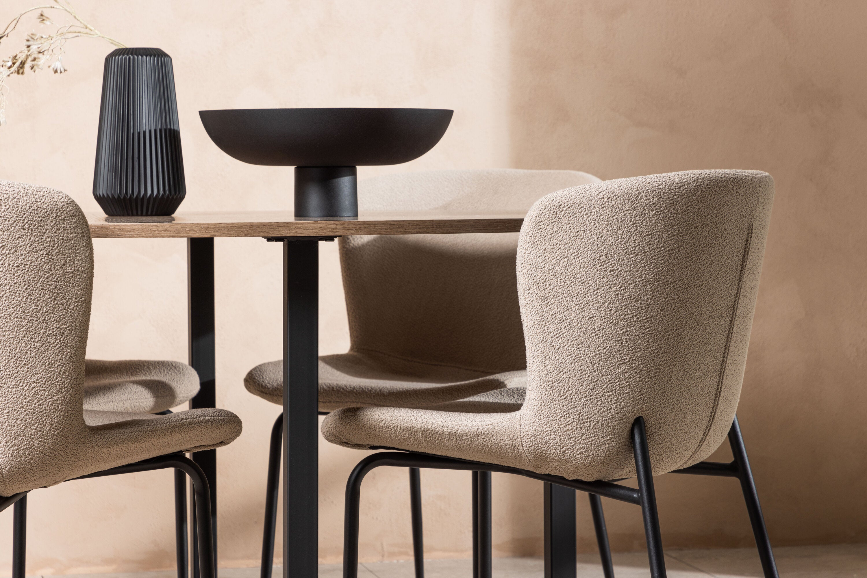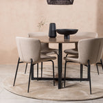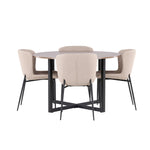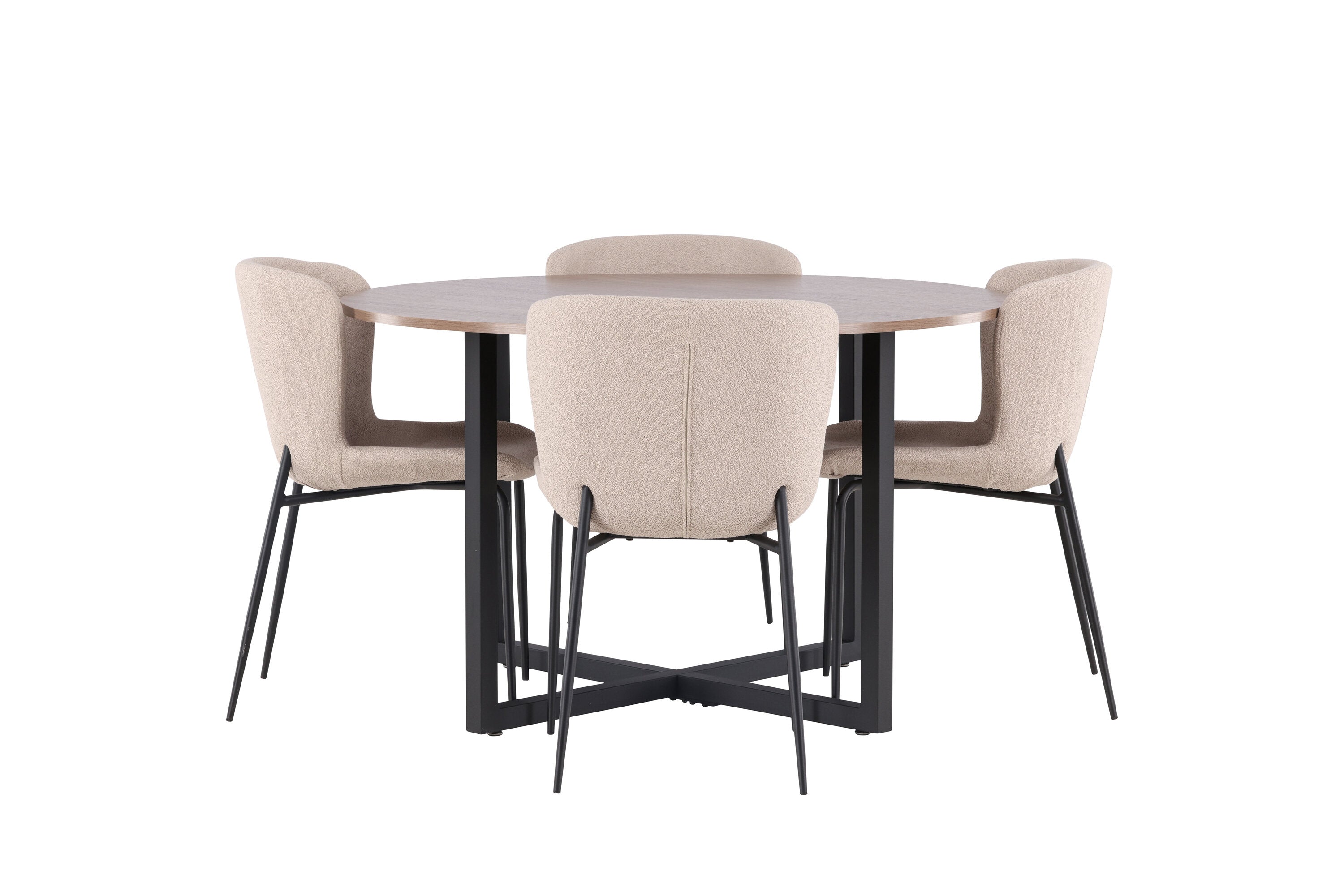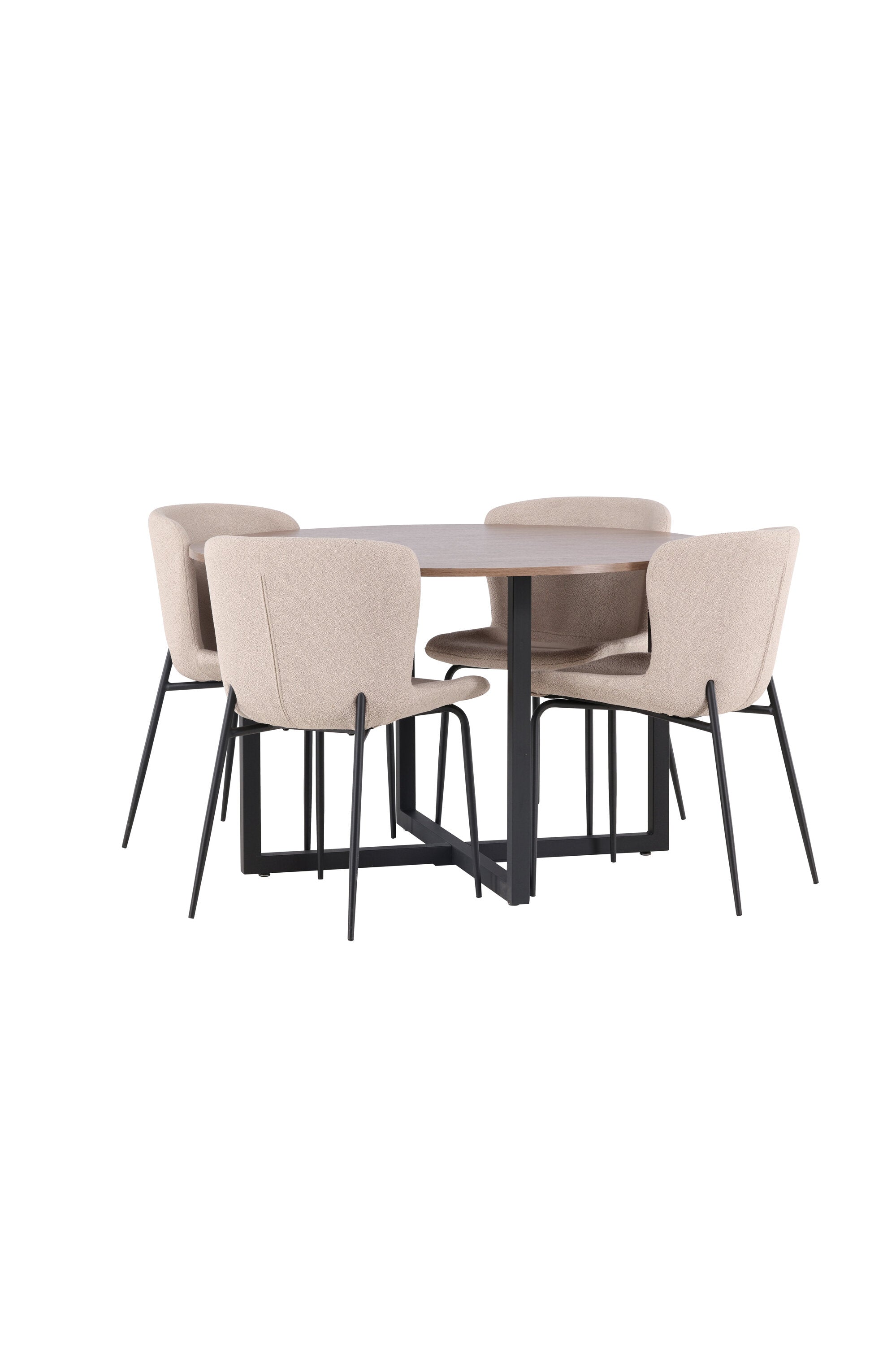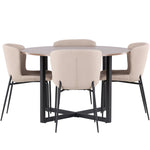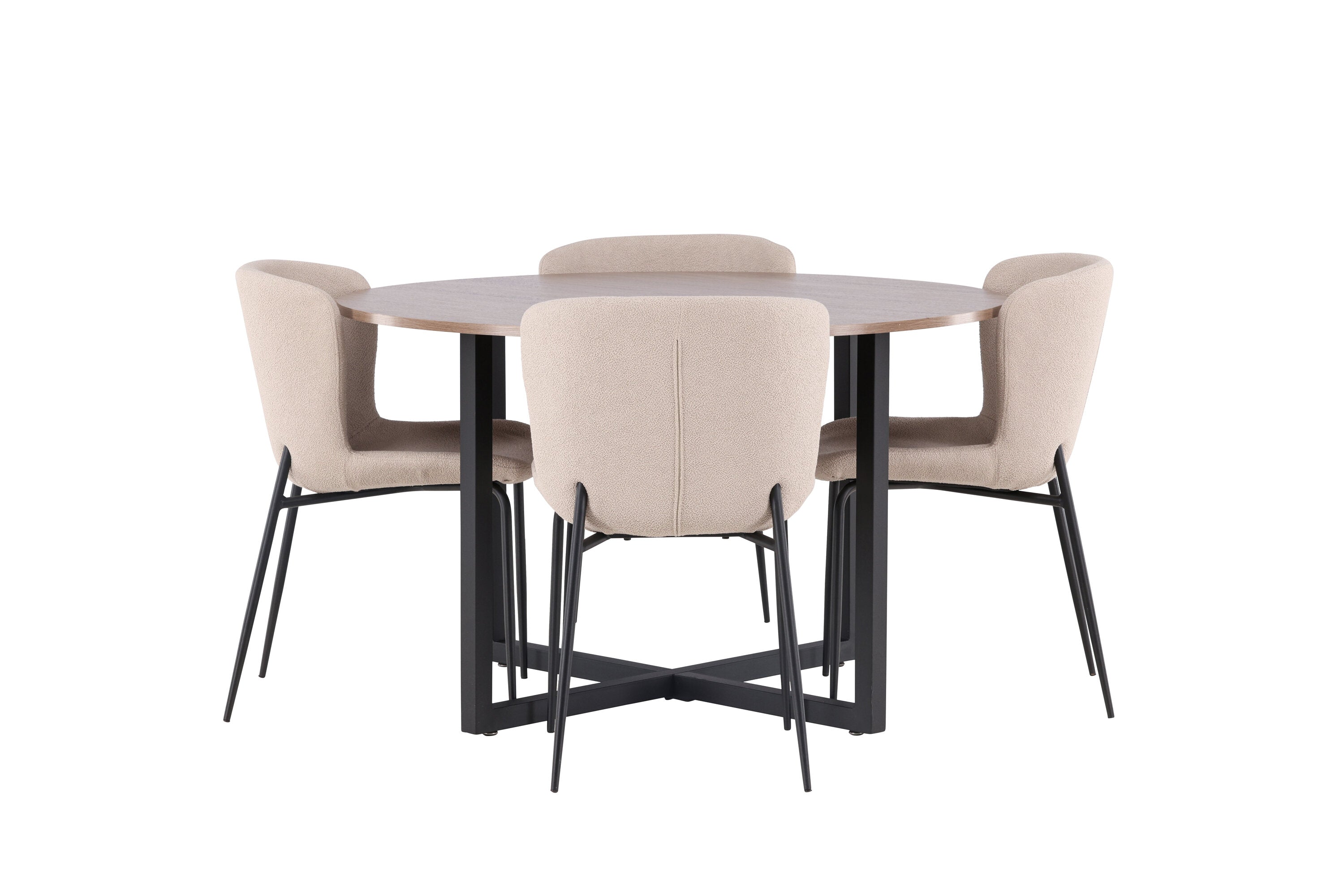 Zařiďte luxusně a lákavě! Náš kulatý jídelní stůl Durango má desku stolu z MDF v barvě ořechu a rovné nohy stolu z černé oceli, které se na podlaze sbíhají do kříže. Zde společně s módními jídelními židlemi ze série Modesto. Židle je celočalouněná béžovou chlupatou látkou se stylovými úzkými nohami židle v černém kovu. Mírně zaoblená záda a čalouněný sedák poskytují extra pohodlí a rozšiřují příjemné jídlo kolem jídelního stolu. Už to nebude lepší než tohle! Rozměry stolu: 120 cm.