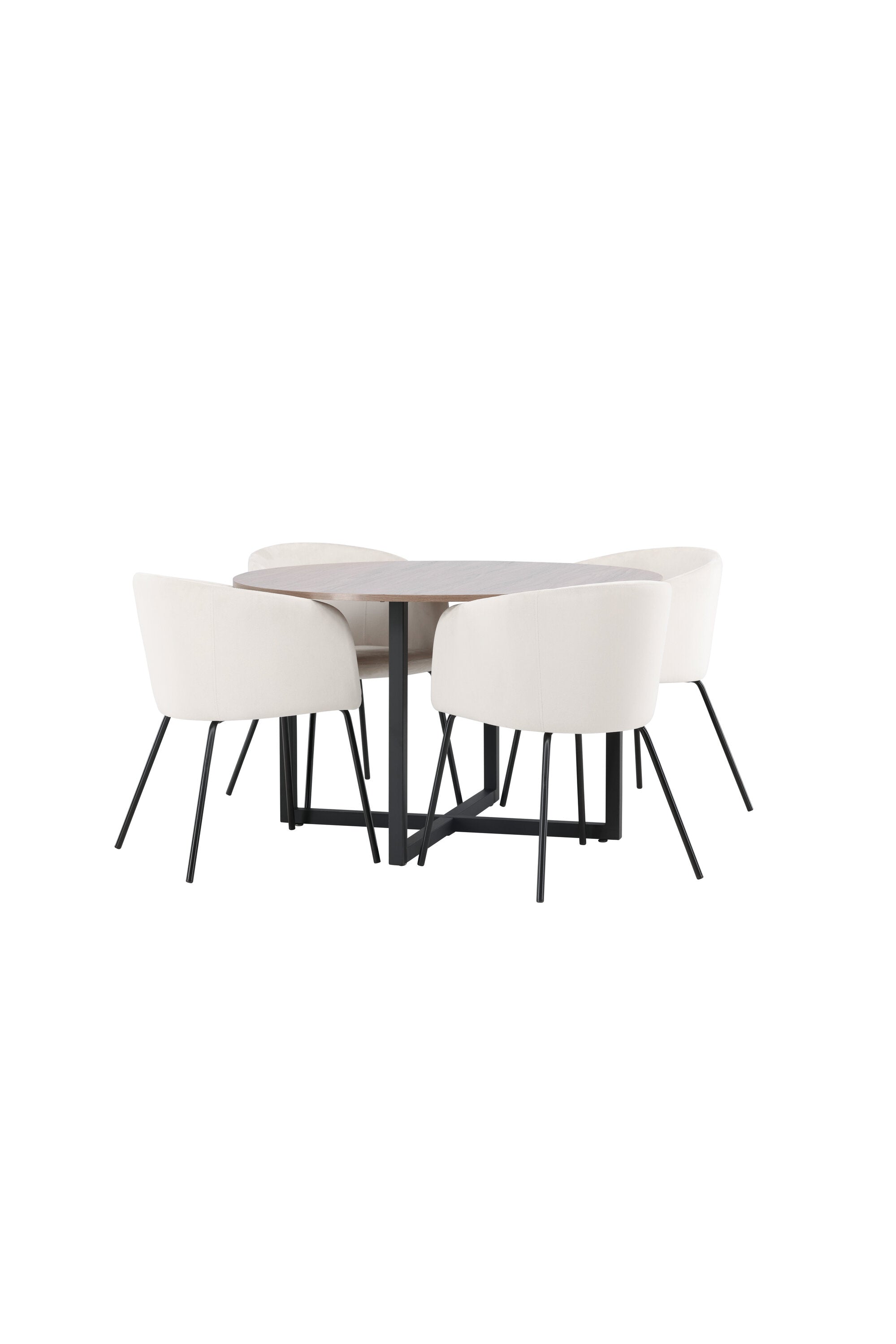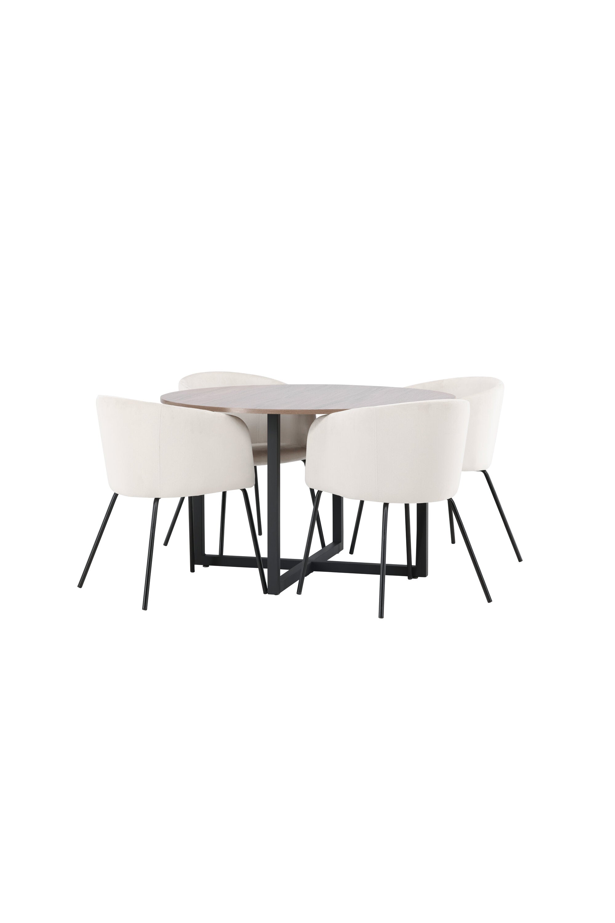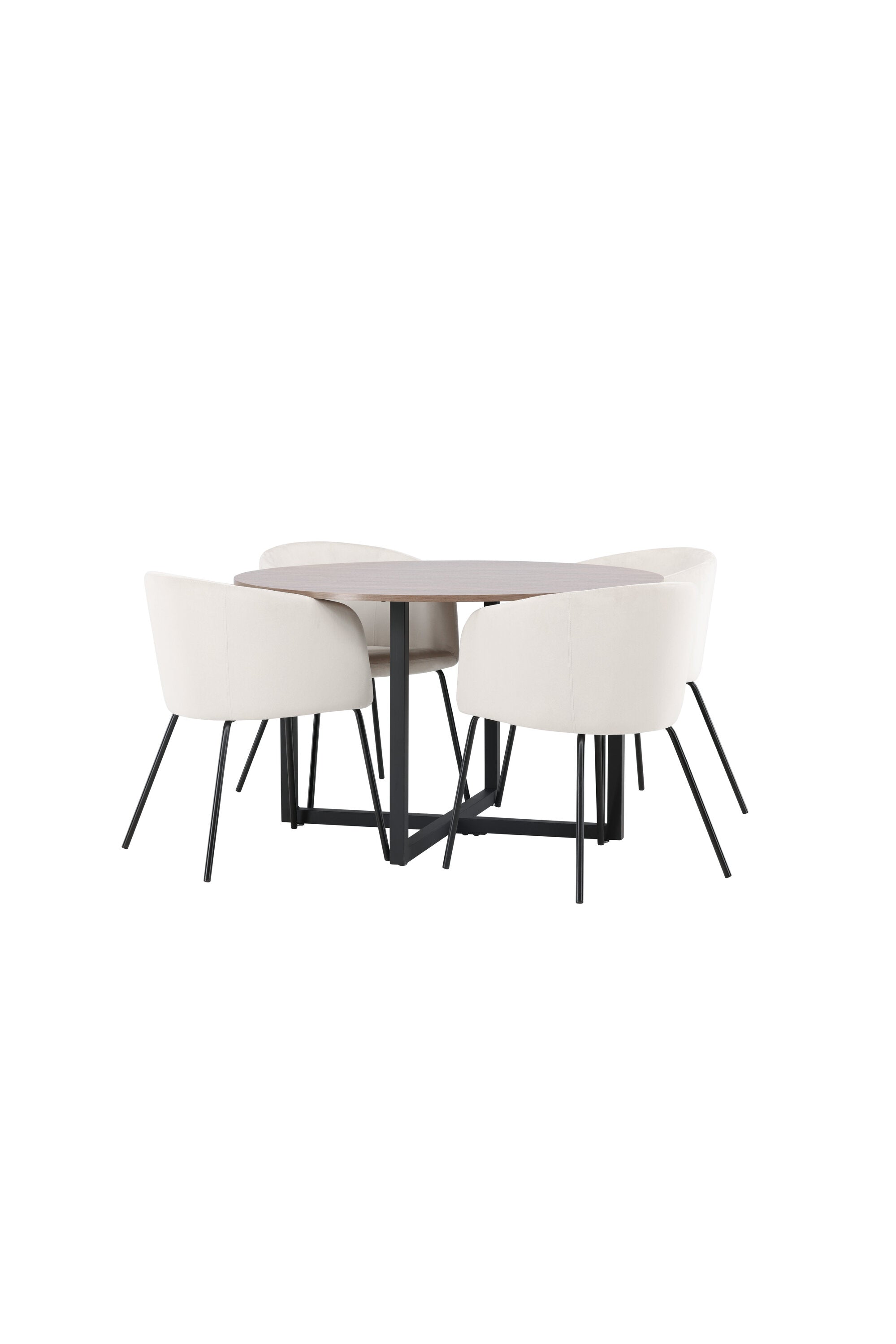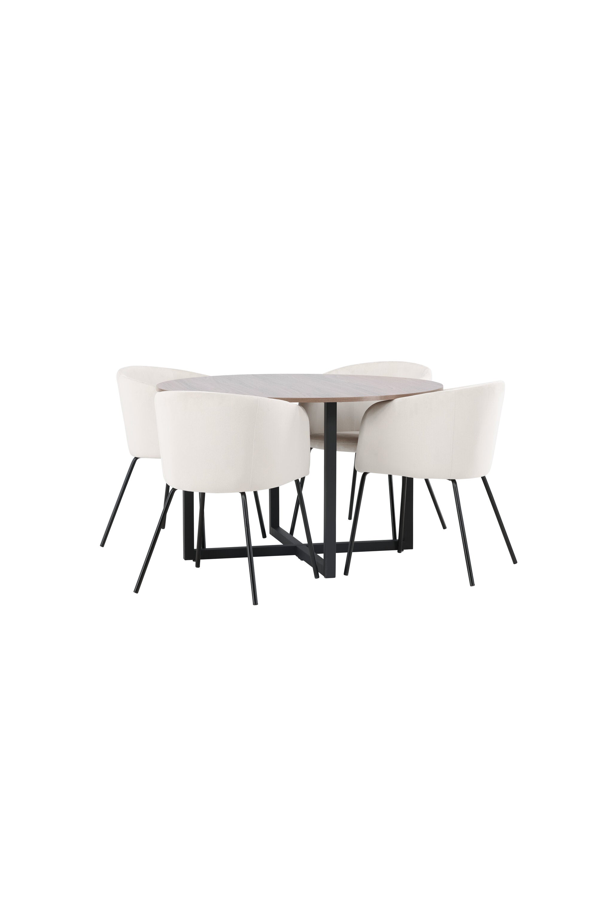 Neuvěřitelná jídelní skupina s měkkými tvary! Náš kulatý jídelní stůl Durango má desku stolu z MDF v barvě ořechu a rovné nohy stolu z černé oceli, které jsou na podlaze shromážděny do kříže. Zde v úžasné kombinaci s našimi pohodlnými jídelními židlemi Berit. Židle má celočalouněný design s mírně zaobleným opěradlem a sedákem z béžové sametové látky a úzkými nohami z černého železa. Usadit se zde by mělo být luxusní! Rozměry stolu: 120 cm.