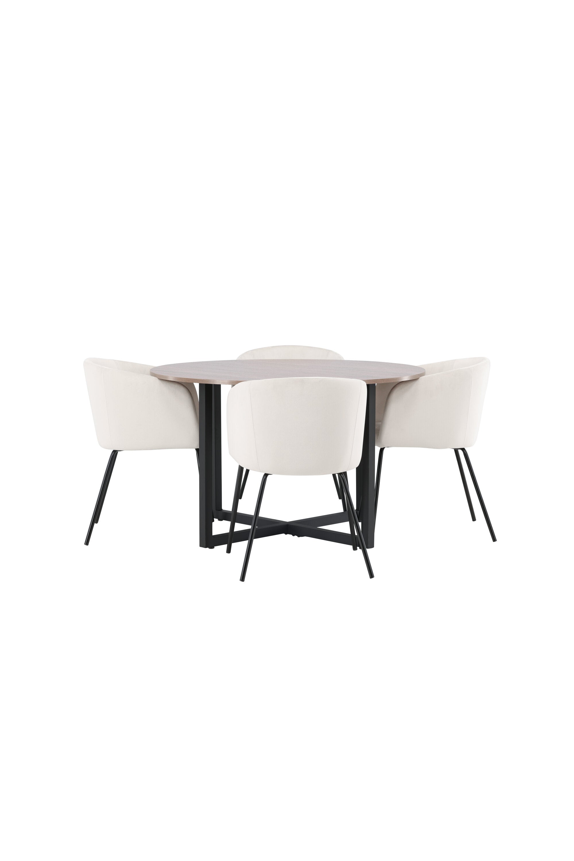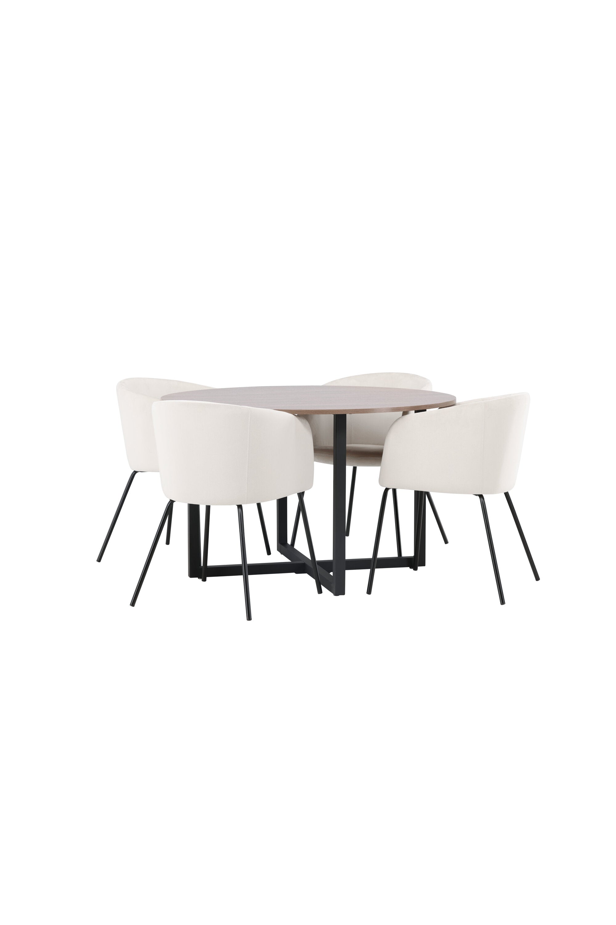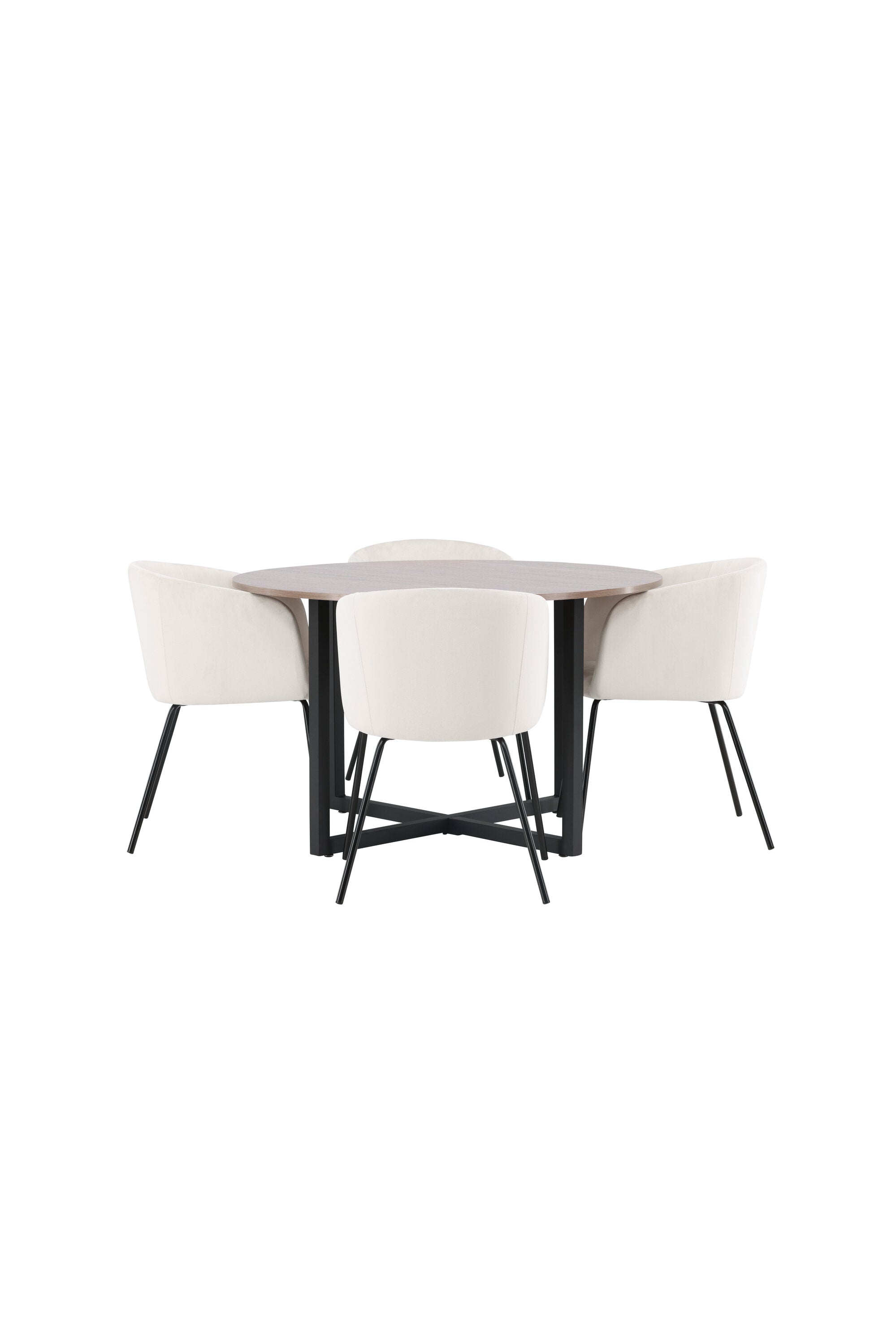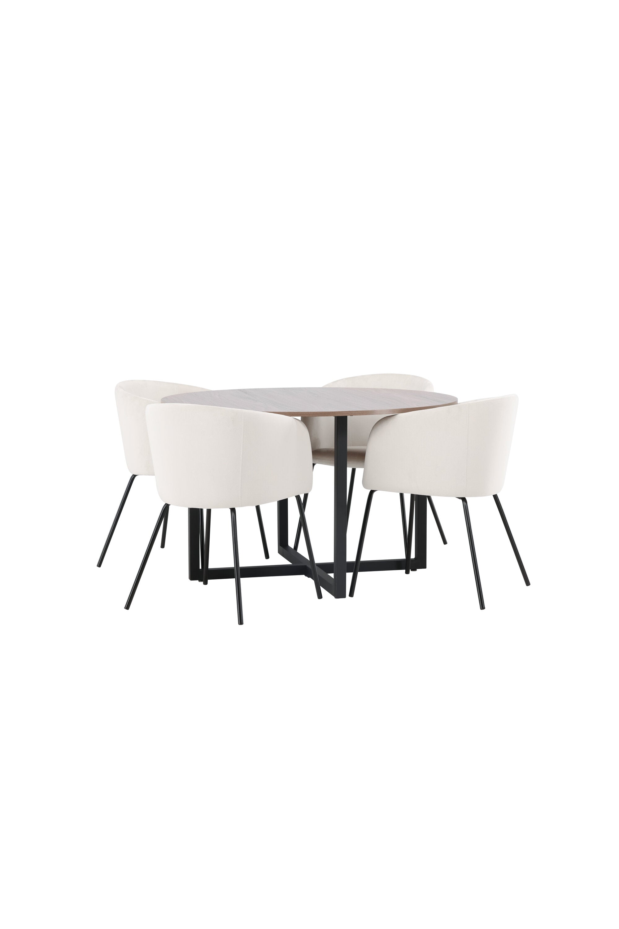 Neuvěřitelná jídelní skupina s měkkými tvary! Náš kulatý jídelní stůl Durango má desku stolu z MDF v barvě ořechu a rovné nohy stolu z černé oceli, které jsou na podlaze shromážděny do kříže. Zde v úžasné kombinaci s našimi pohodlnými jídelními židlemi Berit. Židle má celočalouněný design s mírně zaobleným opěradlem a sedákem z béžové sametové látky a úzkými nohami z černého železa. Usadit se zde by mělo být luxusní! Rozměry stolu: 120 cm.