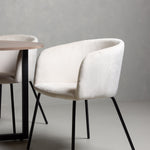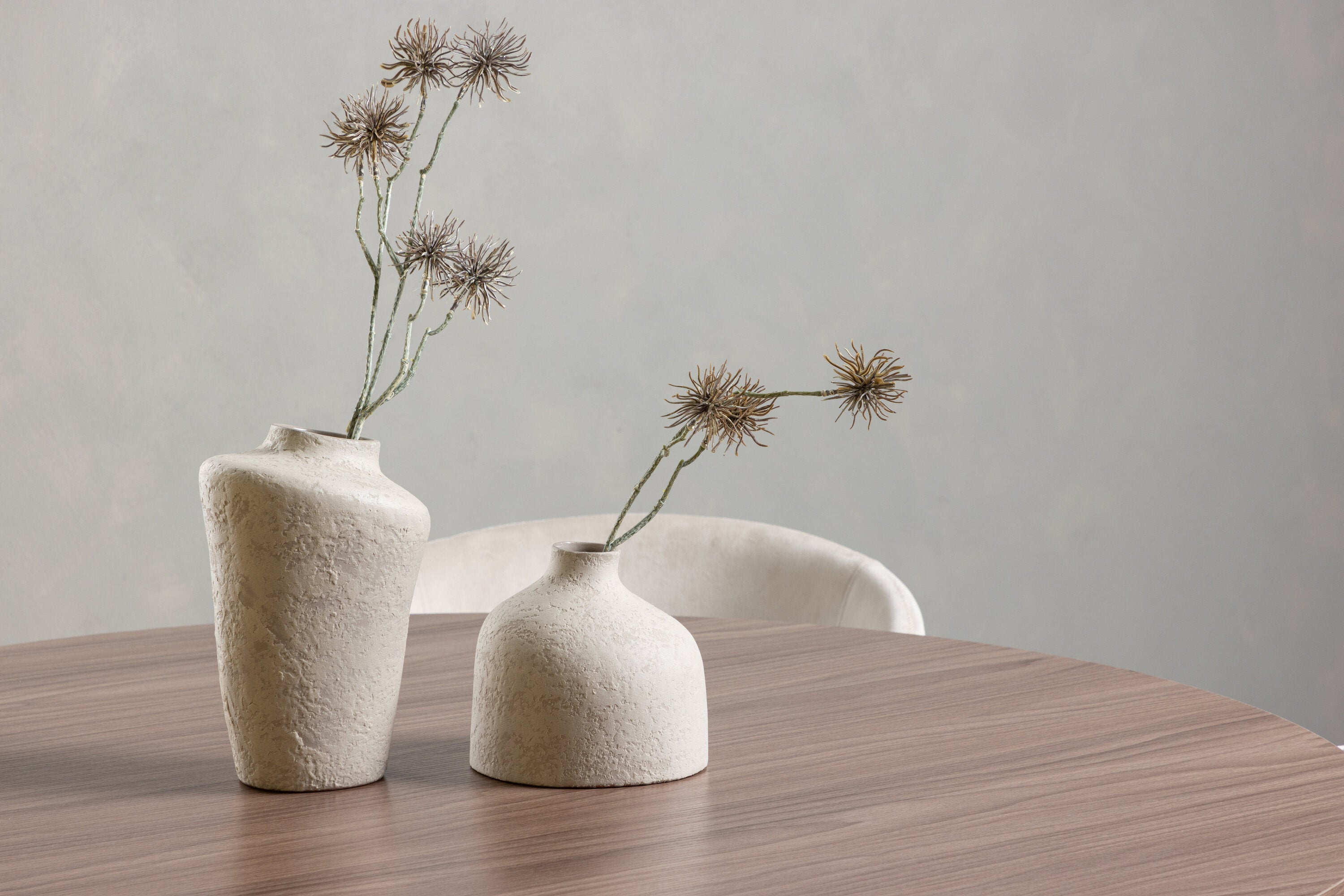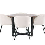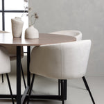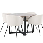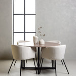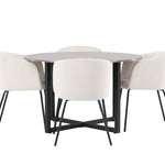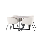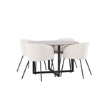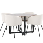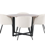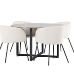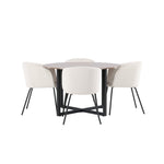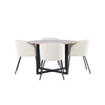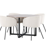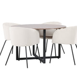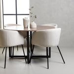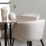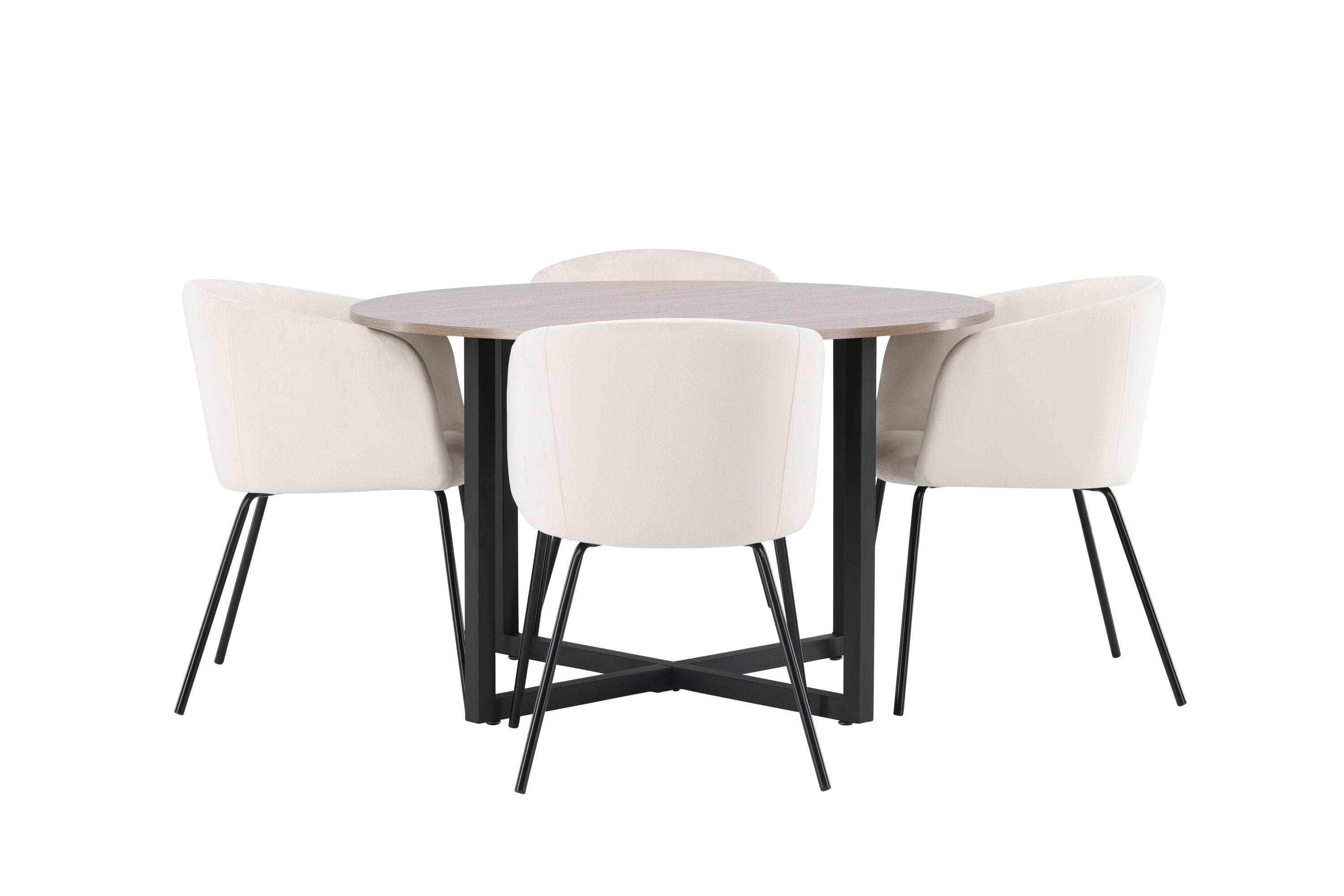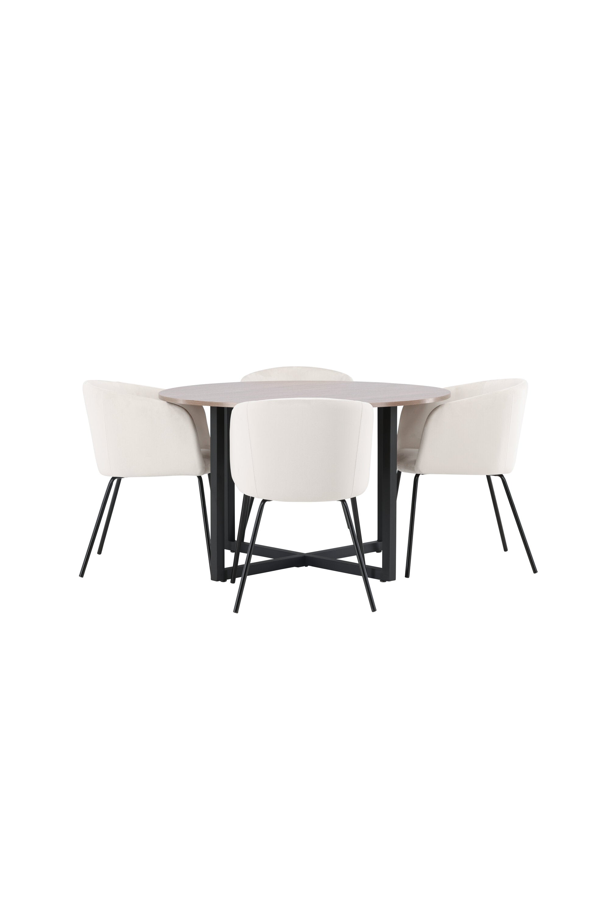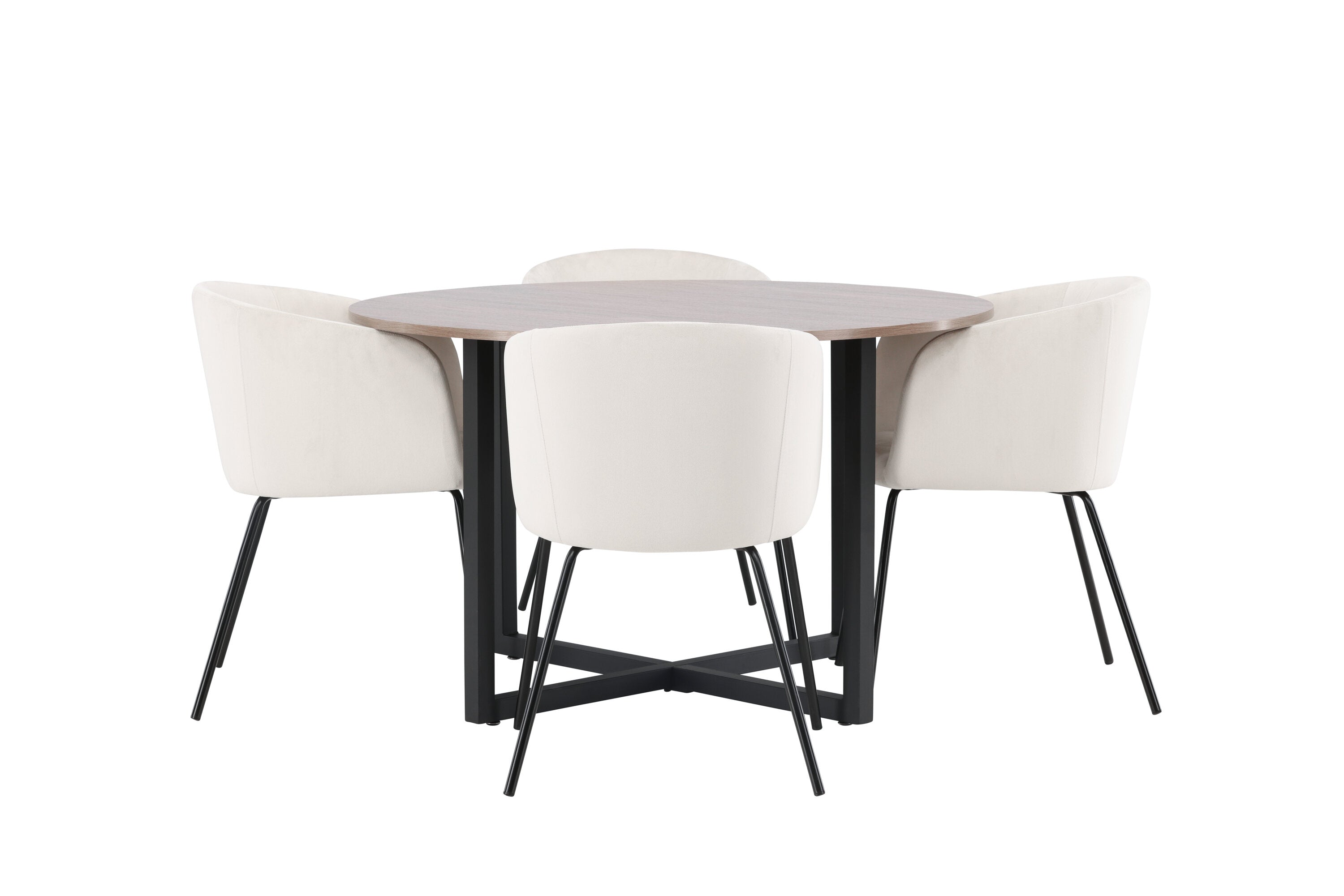 Neuvěřitelná jídelní skupina s měkkými tvary! Náš kulatý jídelní stůl Durango má desku stolu z MDF v barvě ořechu a rovné nohy stolu z černé oceli, které jsou na podlaze shromážděny do kříže. Zde v úžasné kombinaci s našimi pohodlnými jídelními židlemi Berit. Židle má celočalouněný design s mírně zaobleným opěradlem a sedákem z béžové sametové látky a úzkými nohami z černého železa. Usadit se zde by mělo být luxusní! Rozměry stolu: 120 cm.