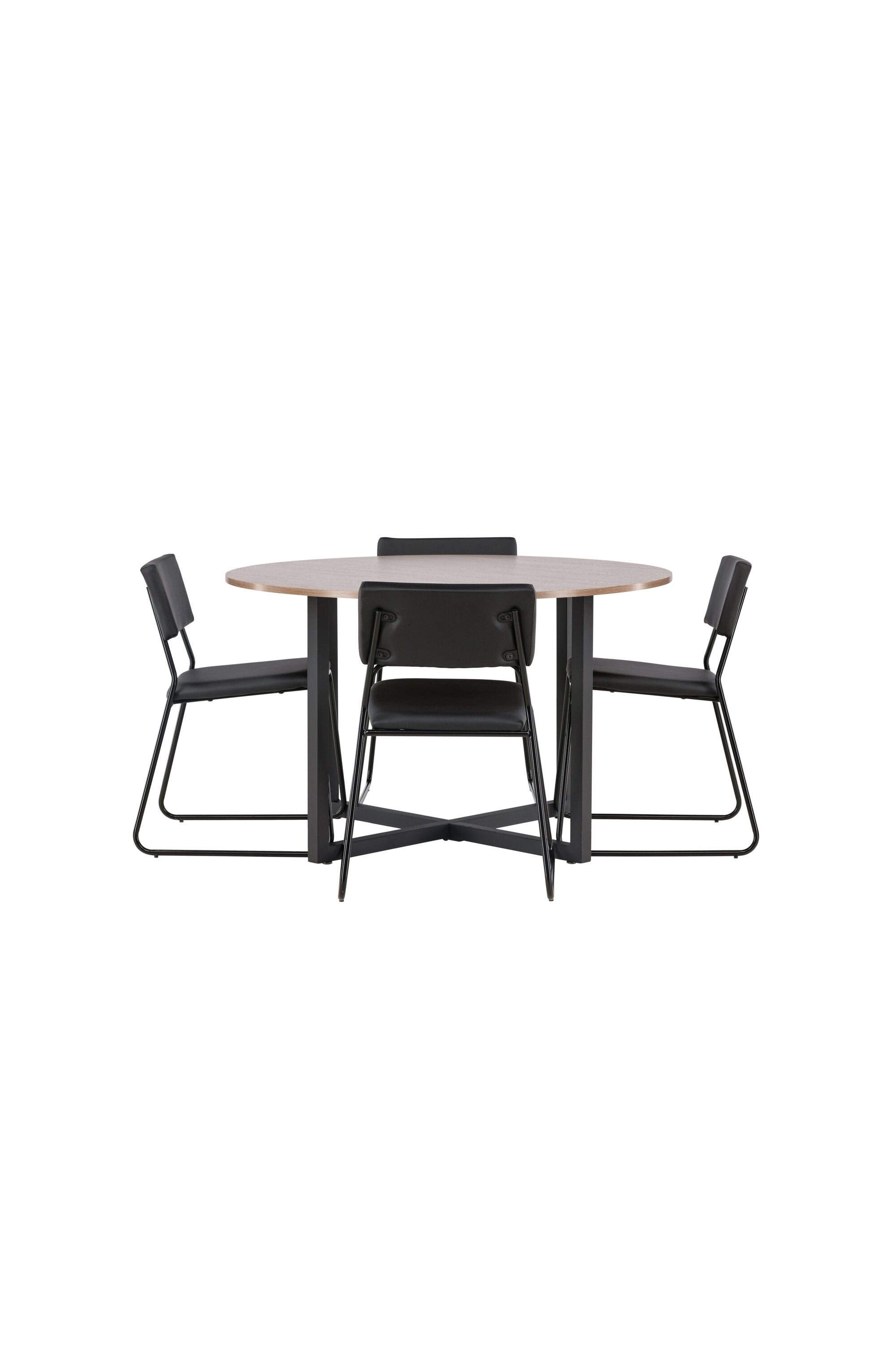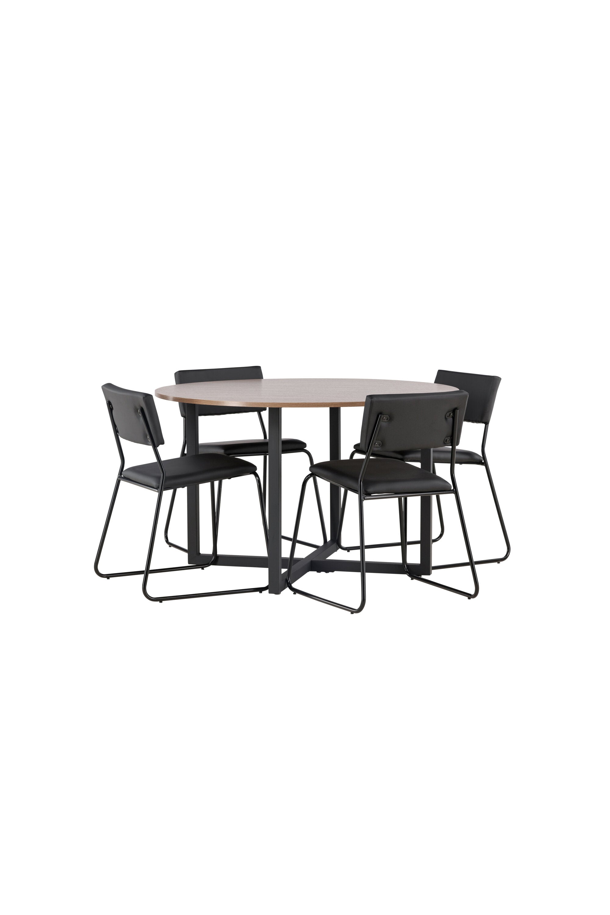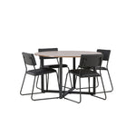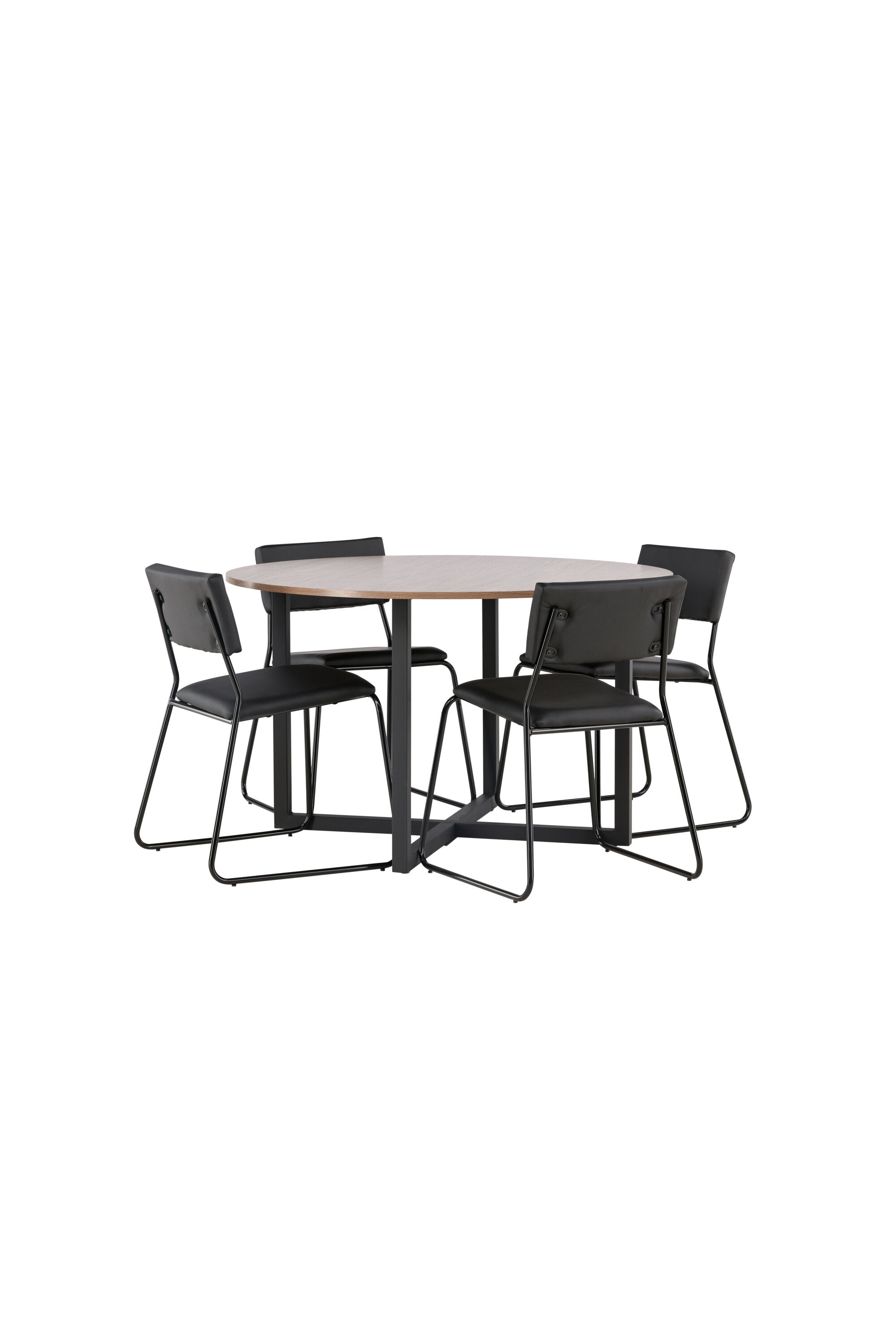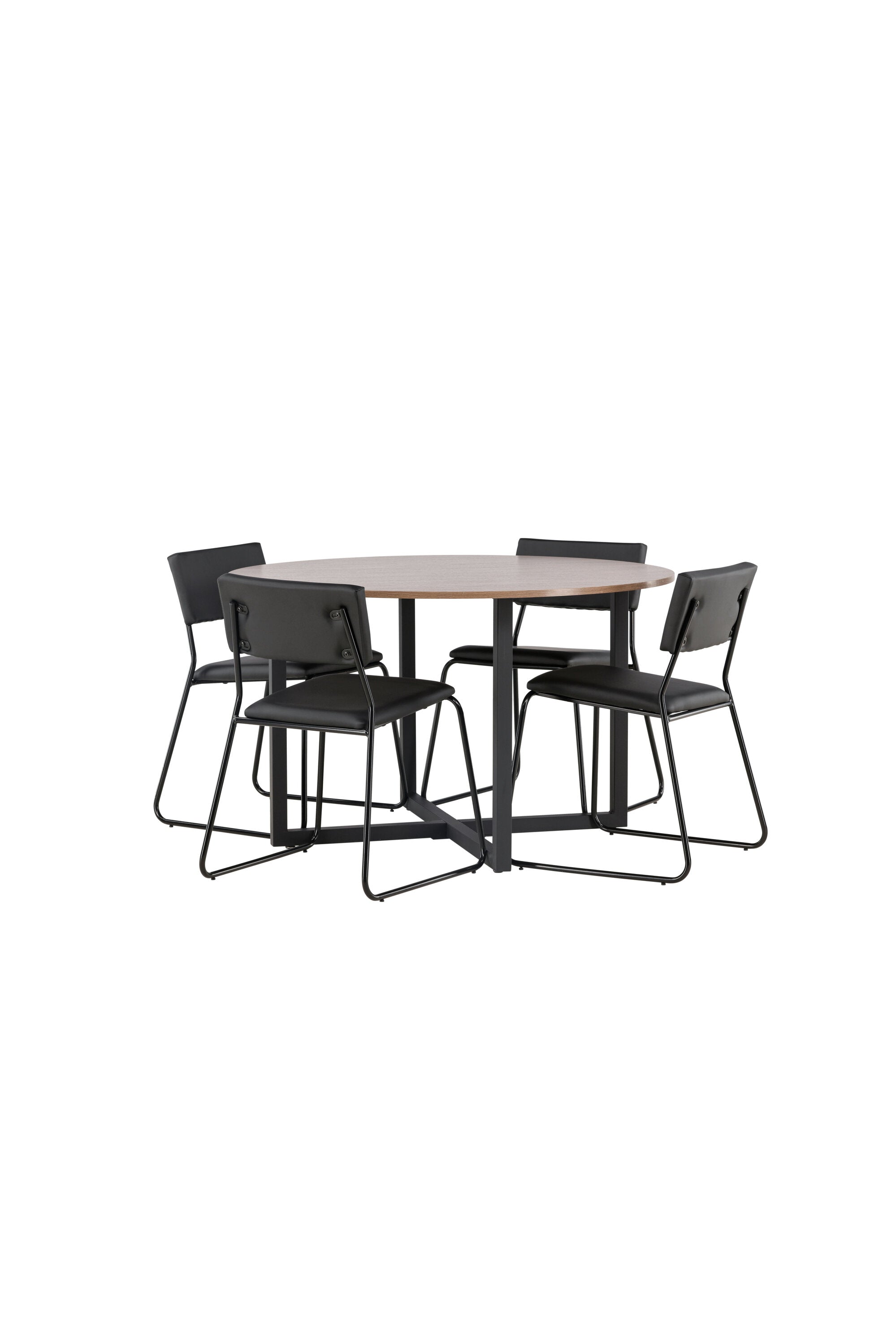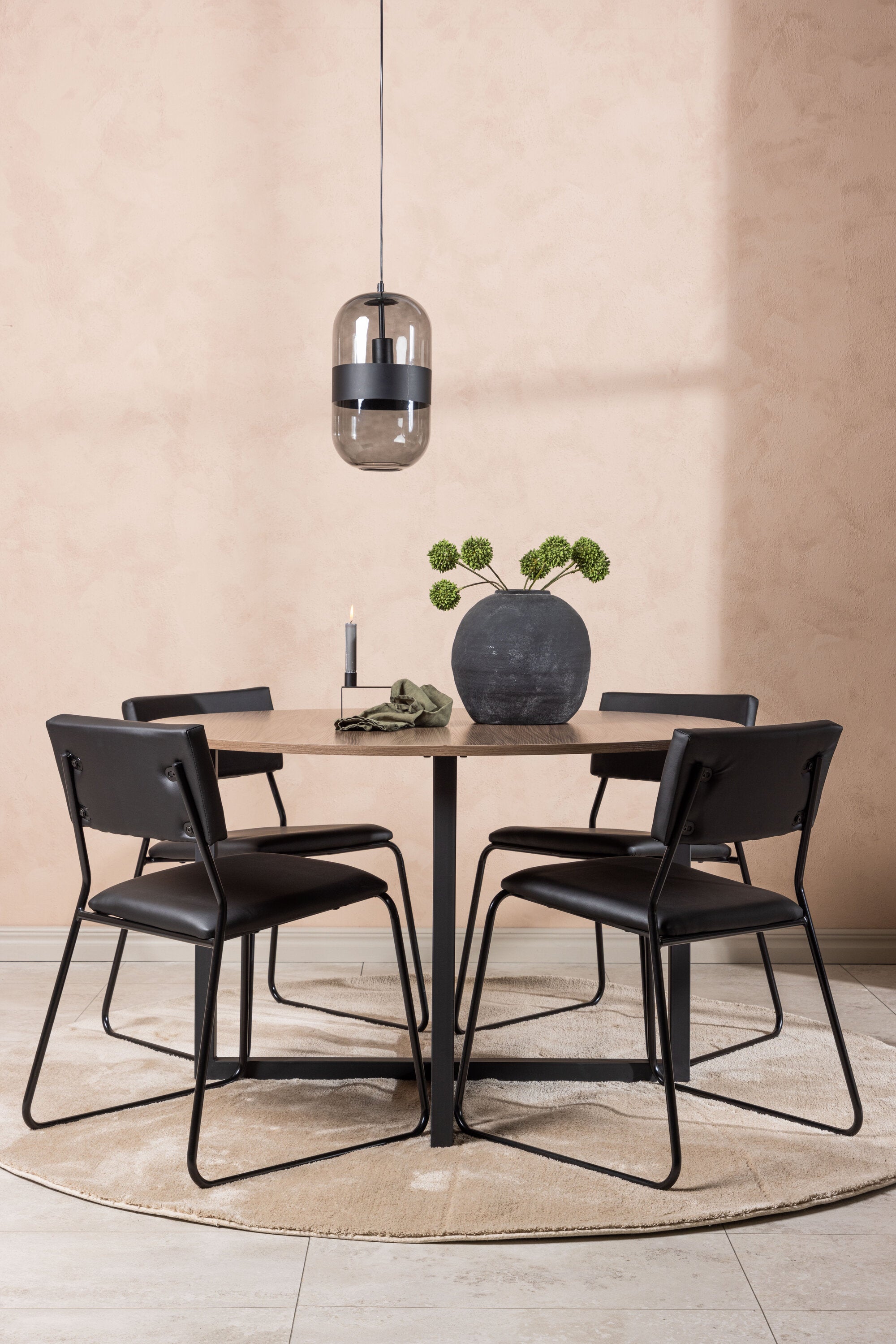 Minimalistický a moderní! Náš kulatý jídelní stůl Durango má desku stolu z MDF v barvě ořechu a rovné nohy stolu z černé oceli, které se na podlaze sbíhají do kříže. Zde společně s našimi černými jídelními židlemi ze série Kenth. Minimalistický, moderní design vytváří vzdušný pocit. Židle má opěradlo a sedák z černé polyuretanové kůže a polyesteru a ozdobné úzké nohy ze železa. Zde získáte dobře promyšlenou jídelní skupinu v módním duchu! Rozměry stolu: 120 cm.