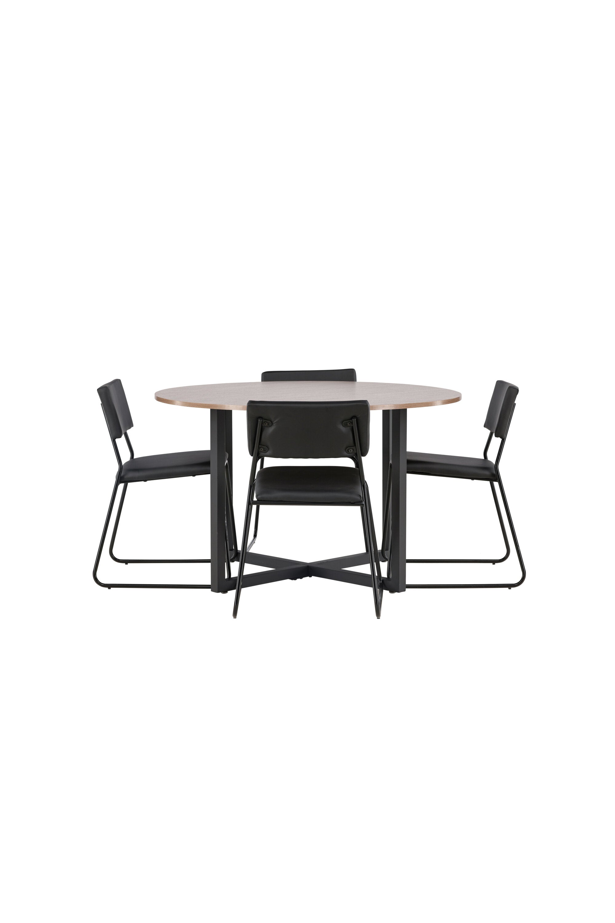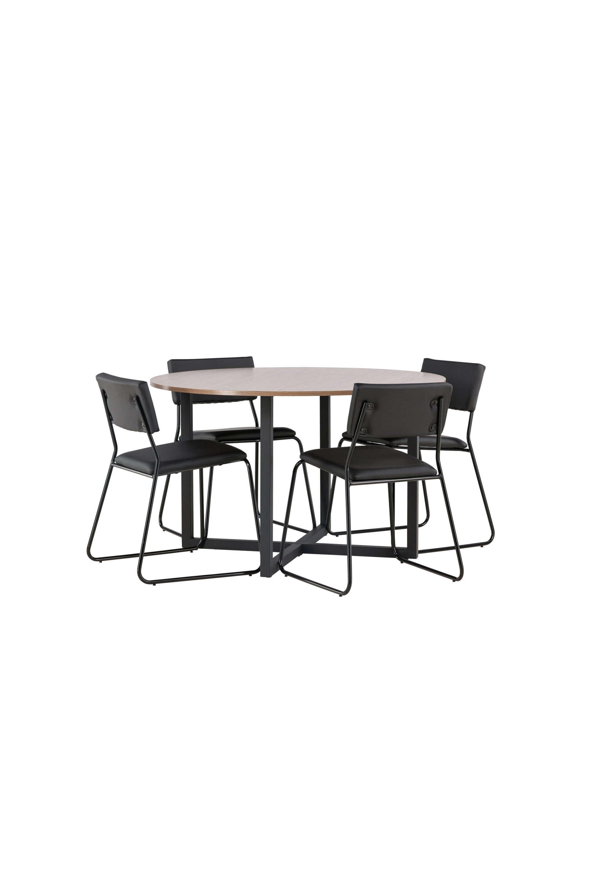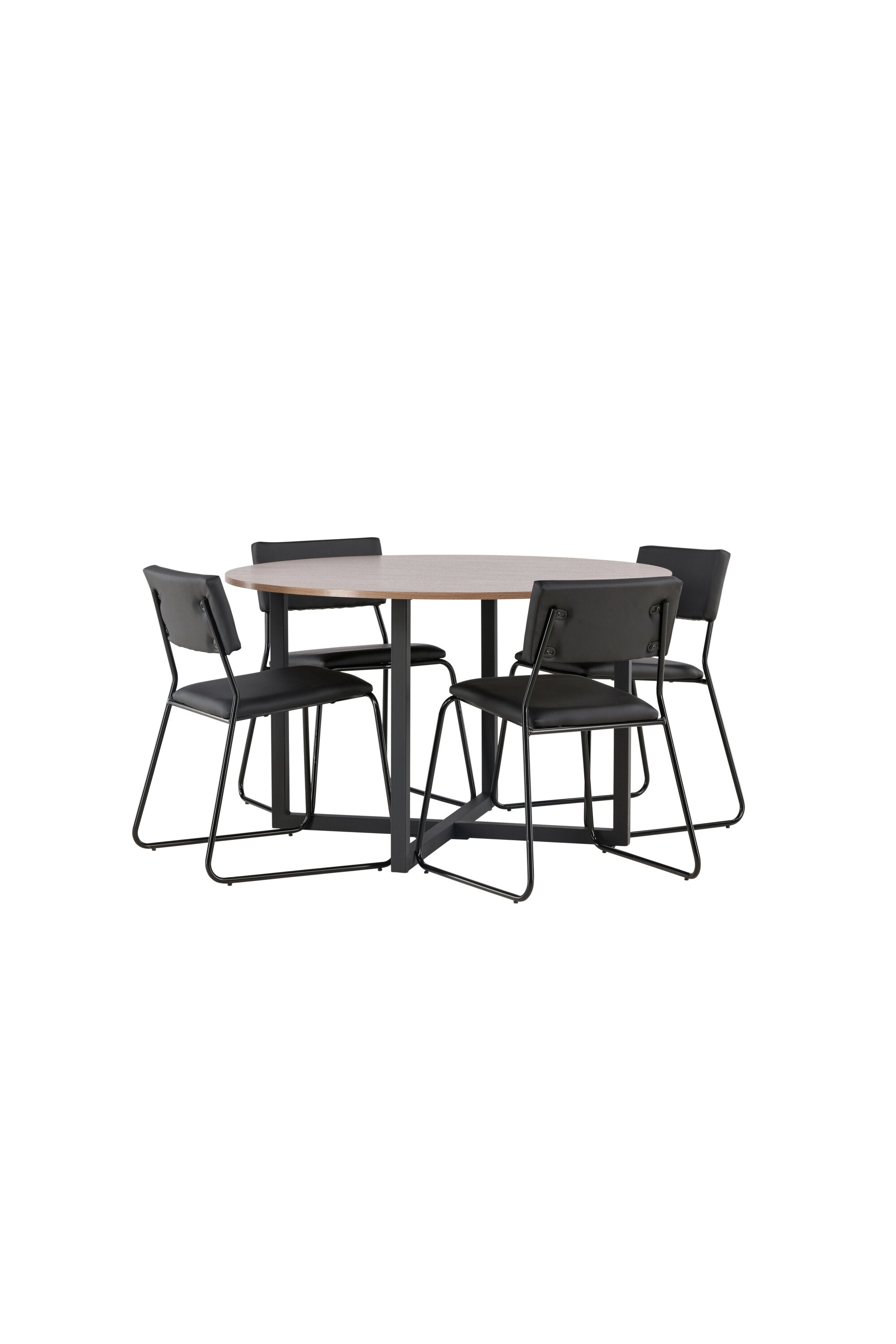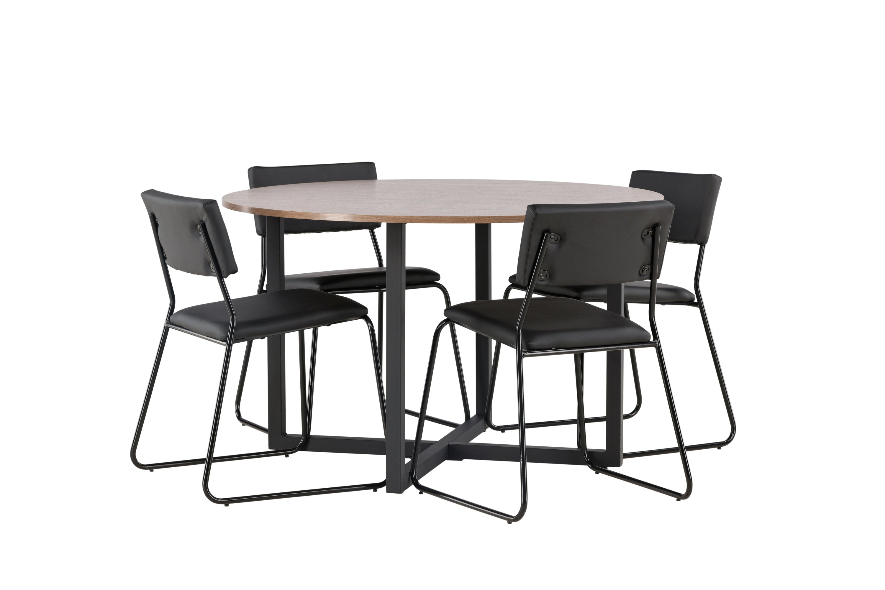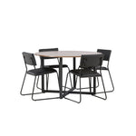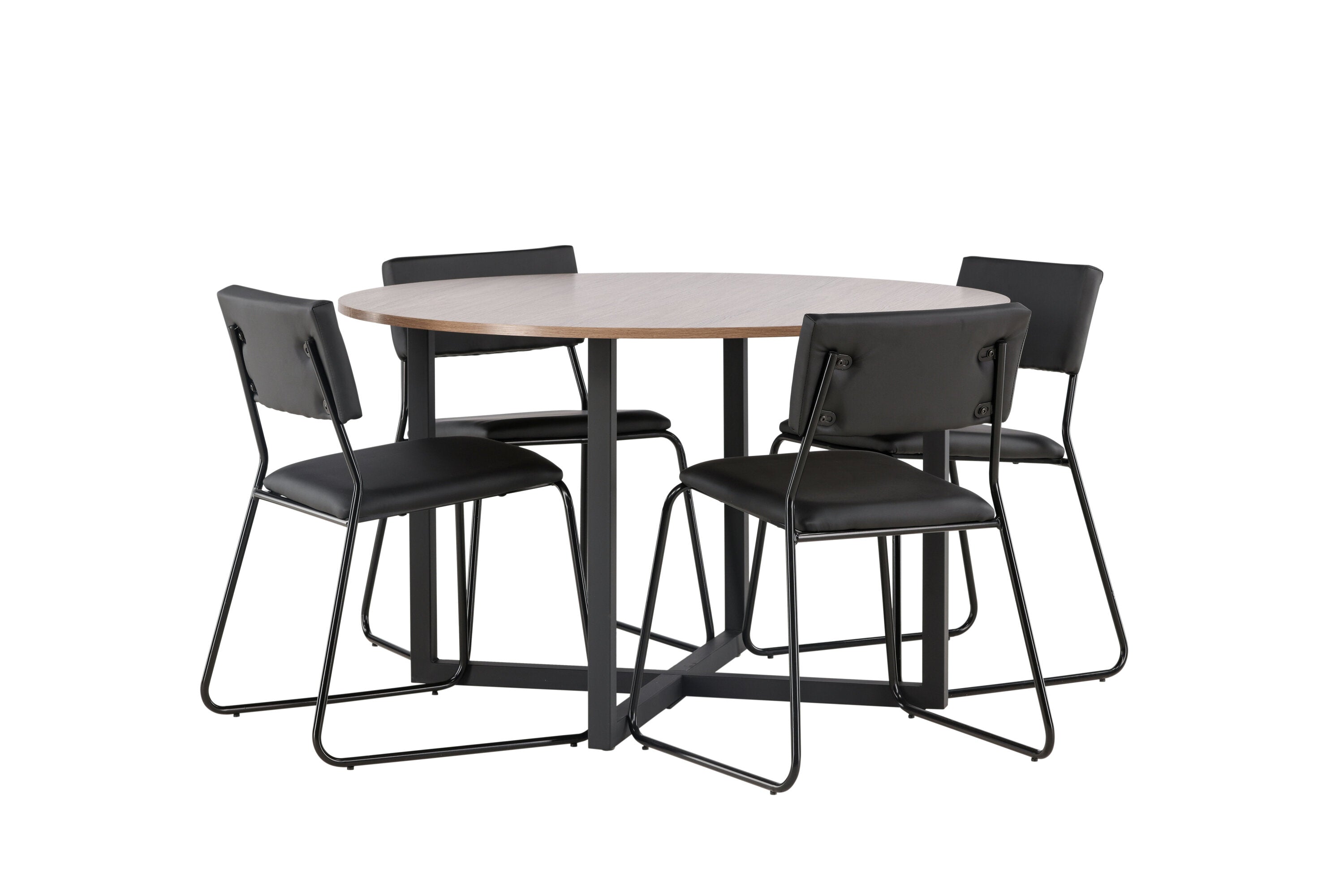 Minimalistický a moderní! Náš kulatý jídelní stůl Durango má desku stolu z MDF v barvě ořechu a rovné nohy stolu z černé oceli, které se na podlaze sbíhají do kříže. Zde společně s našimi černými jídelními židlemi ze série Kenth. Minimalistický, moderní design vytváří vzdušný pocit. Židle má opěradlo a sedák z černé polyuretanové kůže a polyesteru a ozdobné úzké nohy ze železa. Zde získáte dobře promyšlenou jídelní skupinu v módním duchu! Rozměry stolu: 120 cm.