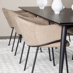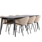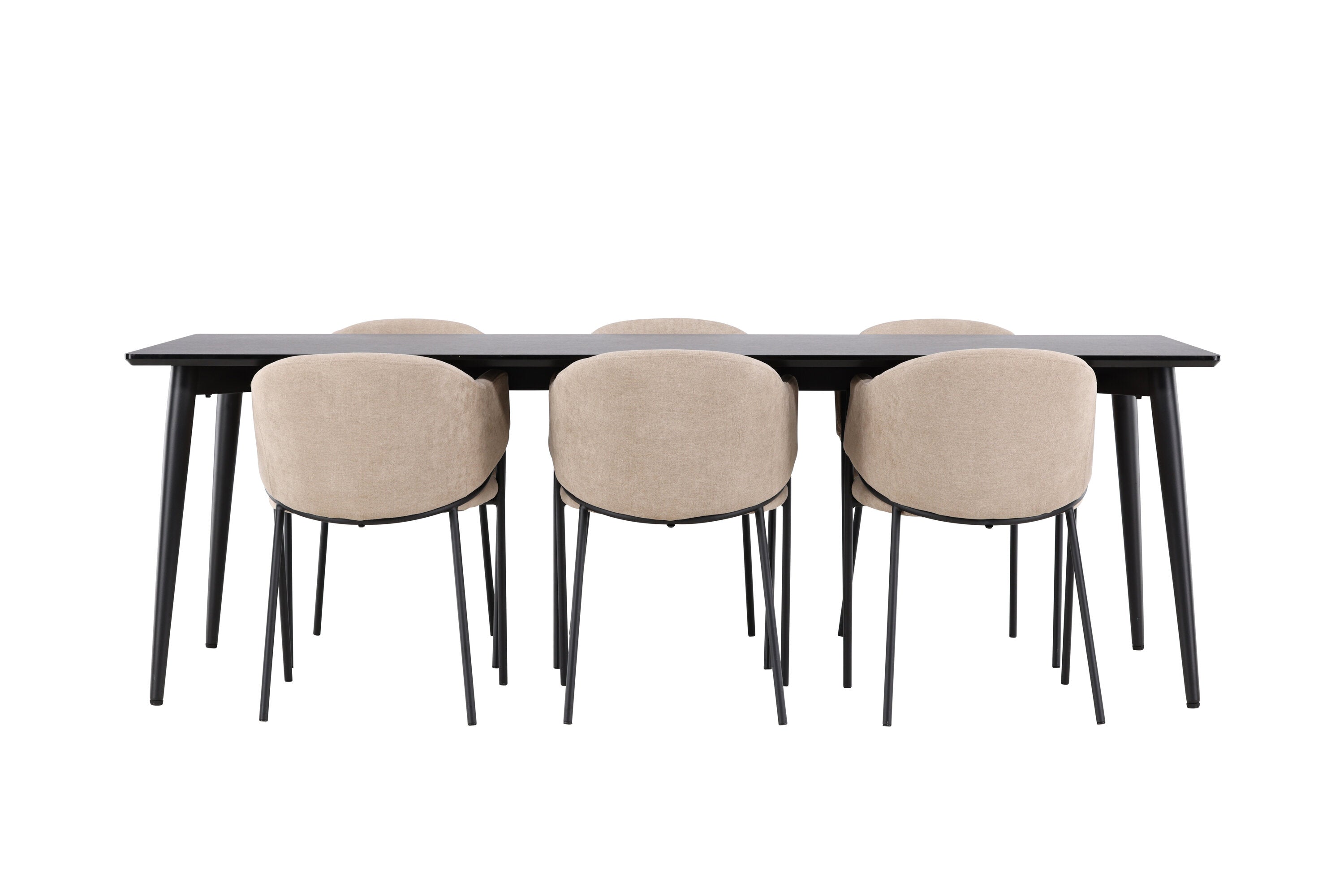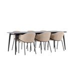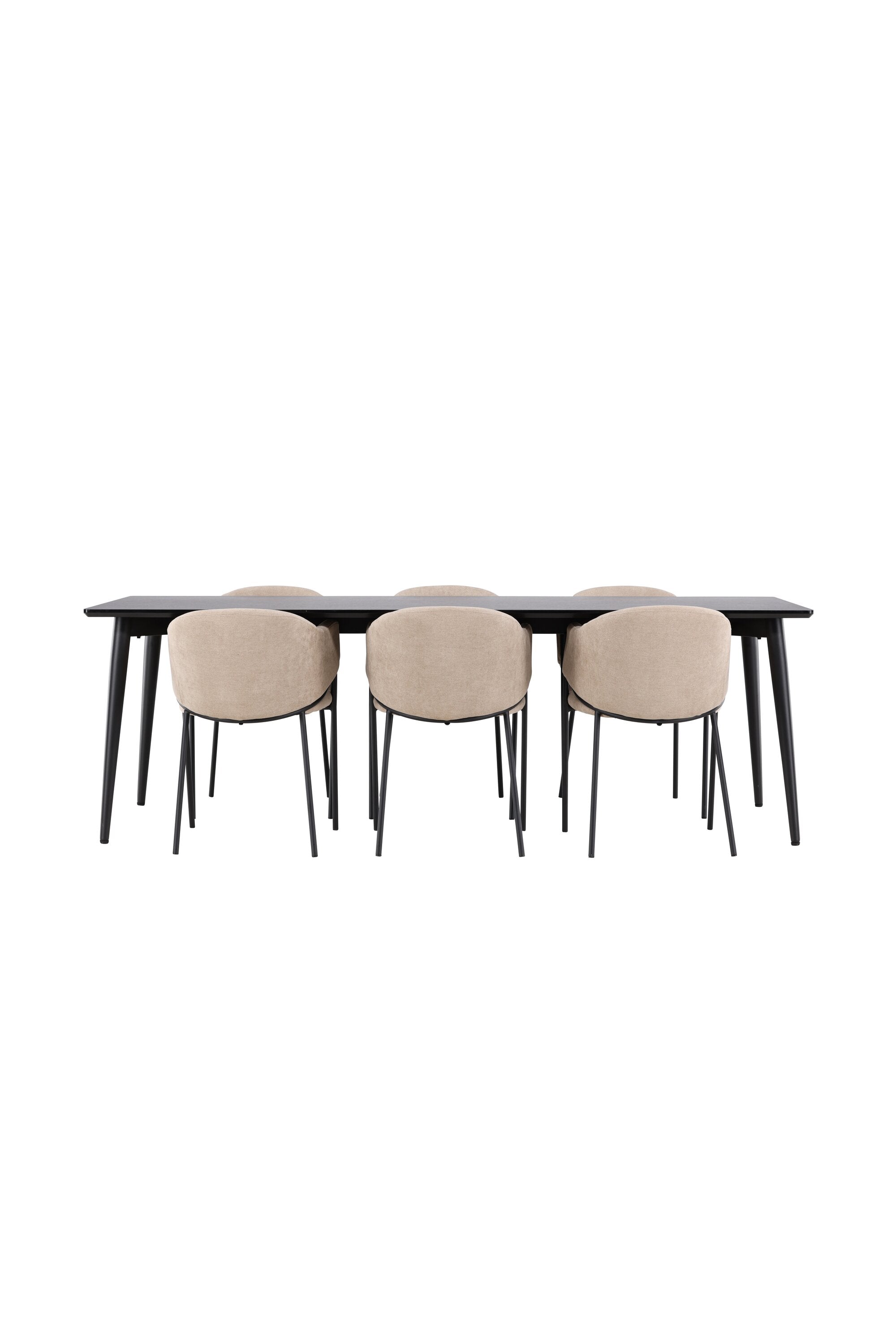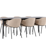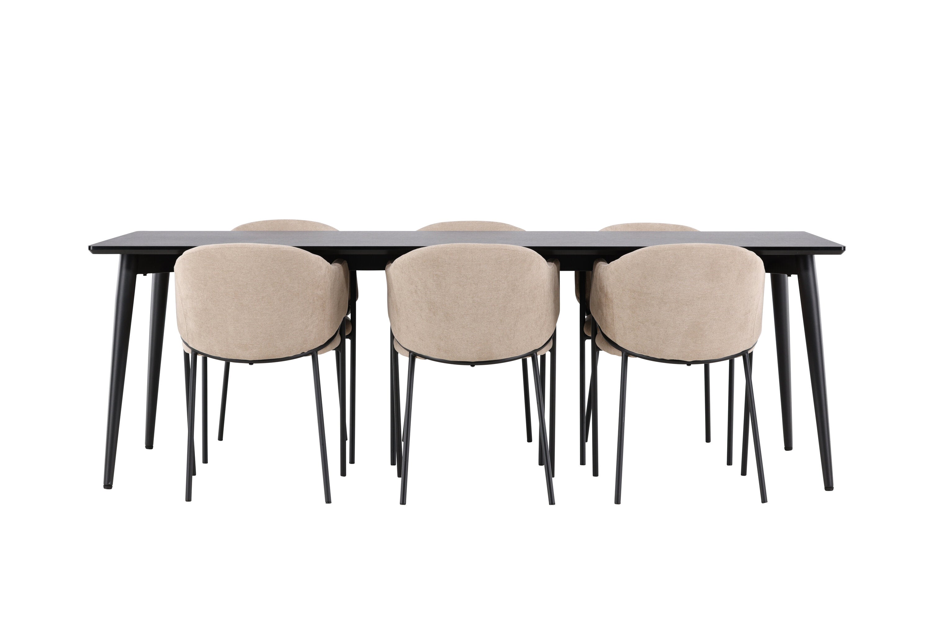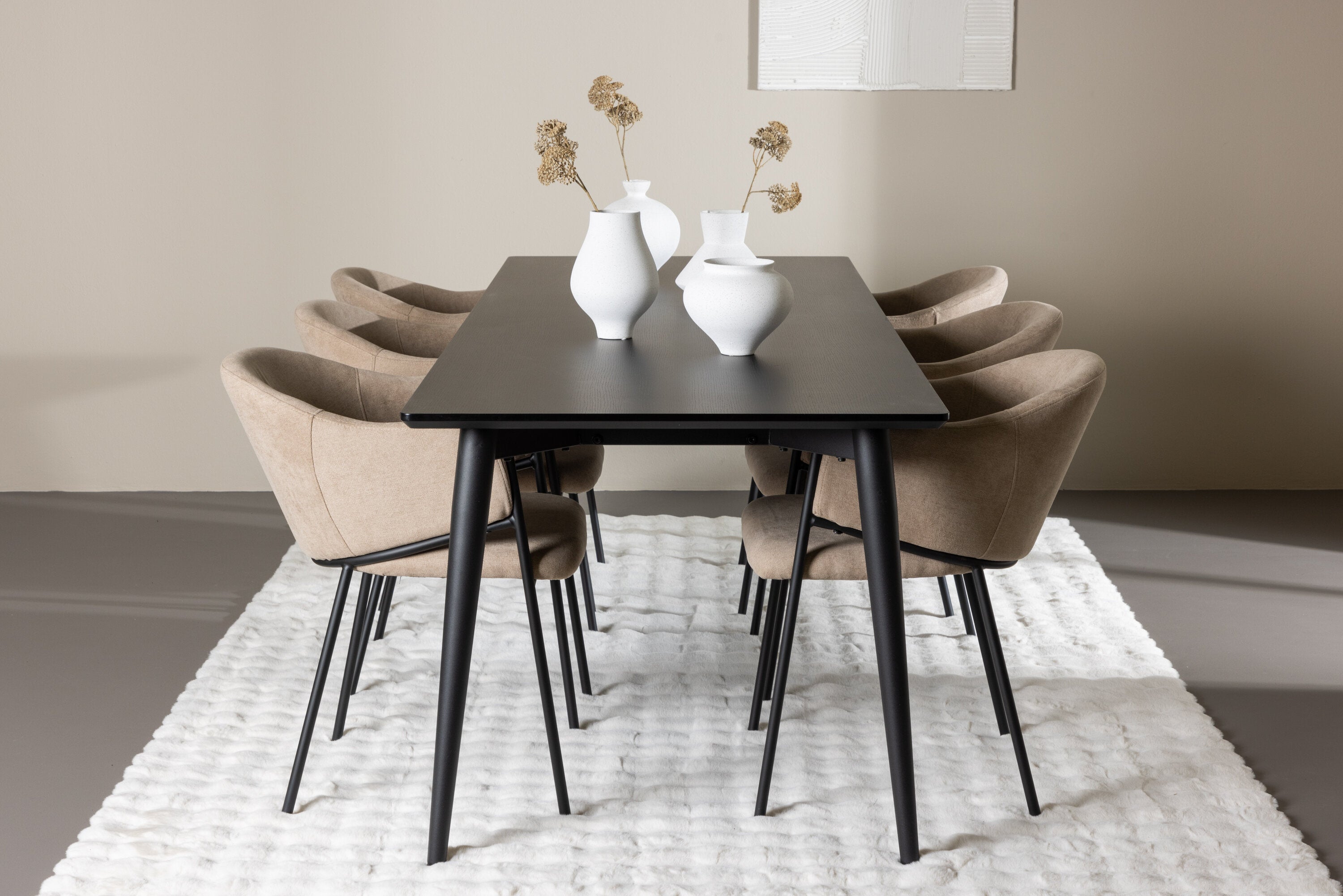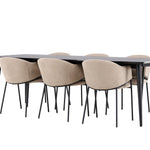 Objevte perfektní jídelní set s jídelní židlí Evelina a jídelním stolem Ellis – kombinaci, která vyzařuje eleganci i funkčnost pro váš domov. Jídelní židle Evelina je nejlepší volbou pro teplý a příjemný jídelní zážitek. Se sedadlem čalouněným polyesterovým lnem v jemné béžové barvě vnáší Evelina do vaší jídelny elegantní a zemitý nádech. Robustní konstrukce dělá z Eveliny spolehlivého společníka pro dlouhá a příjemná jídla. Prozkoumejte Ellis, robustní jídelní stůl, který se stane středobodem vašeho jídelního prostředí. Díky černé barvě dodává Ellis vašemu pokoji elegantní a moderní nádech. Stůl je vyroben s ocelovými nohami a deskou z MDF, což poskytuje dokonalou rovnováhu mezi robustností a stylem. S velkorysými rozměry 230x85 cm je stůl Ellis jako stvořený pro společenské večeře a setkání s přáteli a rodinou. Dopřejte své jídelně dokonalý výtah s jídelní židlí Evelina a jídelním stolem Ellis. Tato jídelní souprava vytváří trendy a stylovou atmosféru a zanechává trvalý dojem. Tato kombinace je ideální jak pro každodenní večeři, tak pro slavnostní příležitosti, nabízí rovnováhu mezi nadčasovým designem a moderními detaily, díky čemuž je perfektní volbou pro všechna vaše společenská setkání.