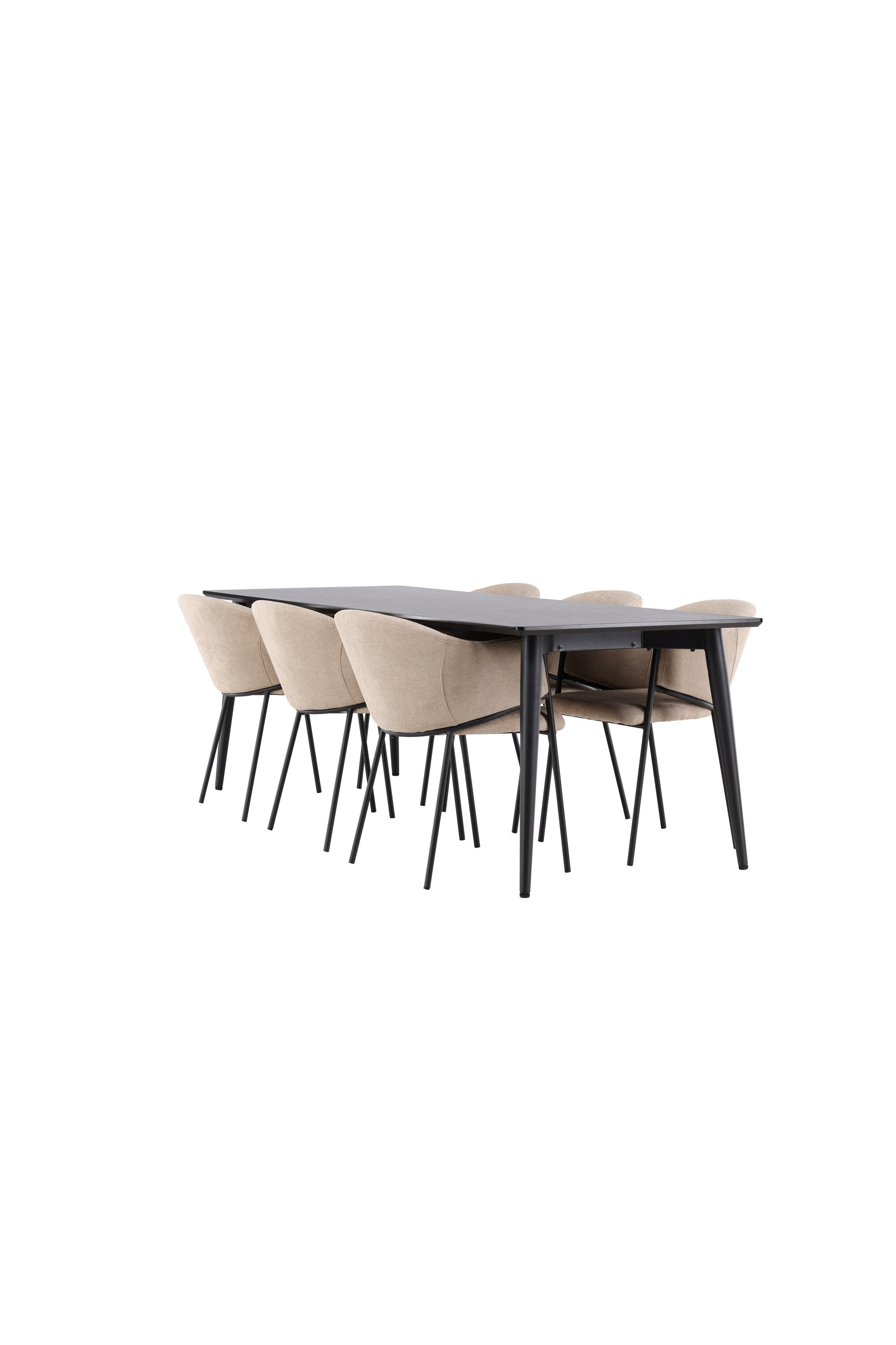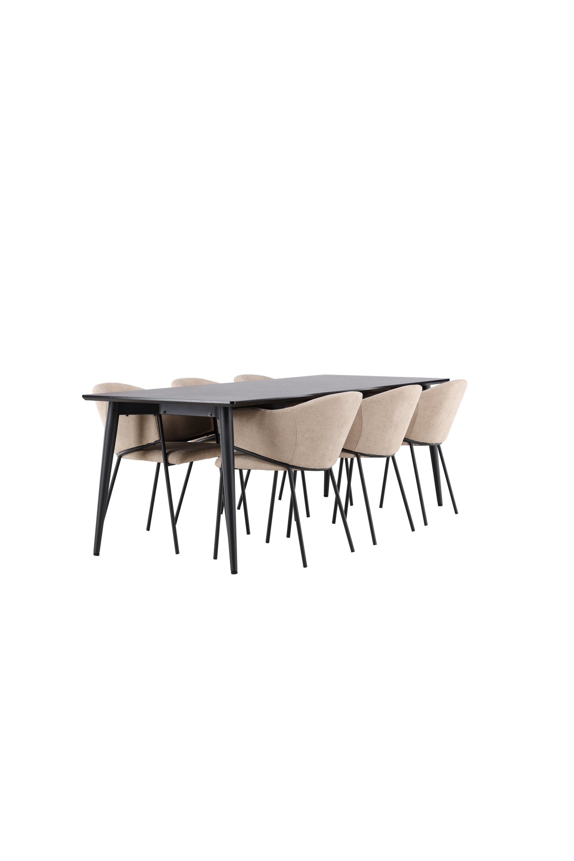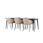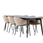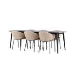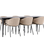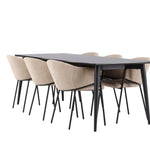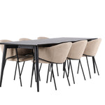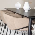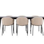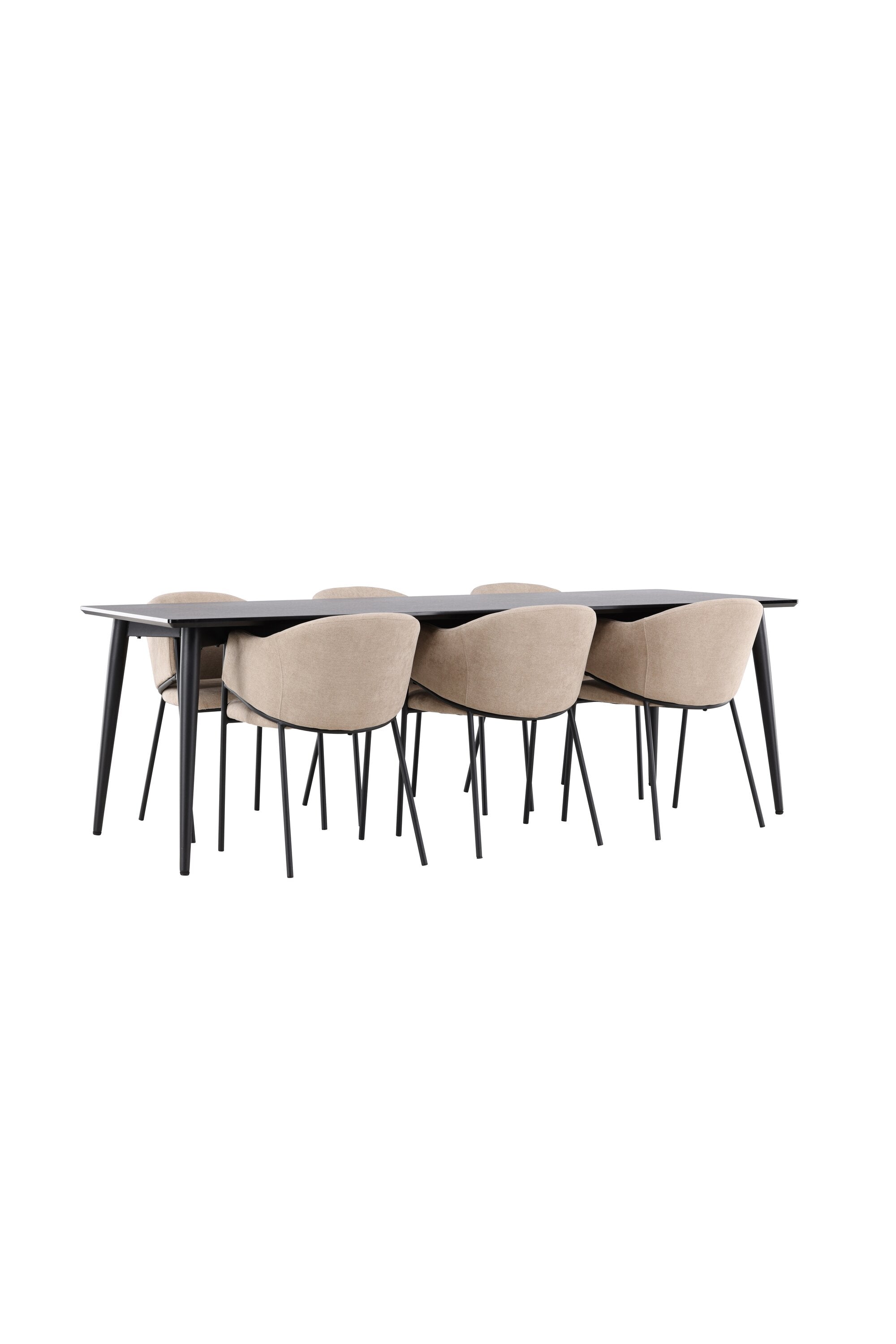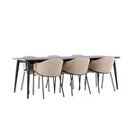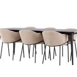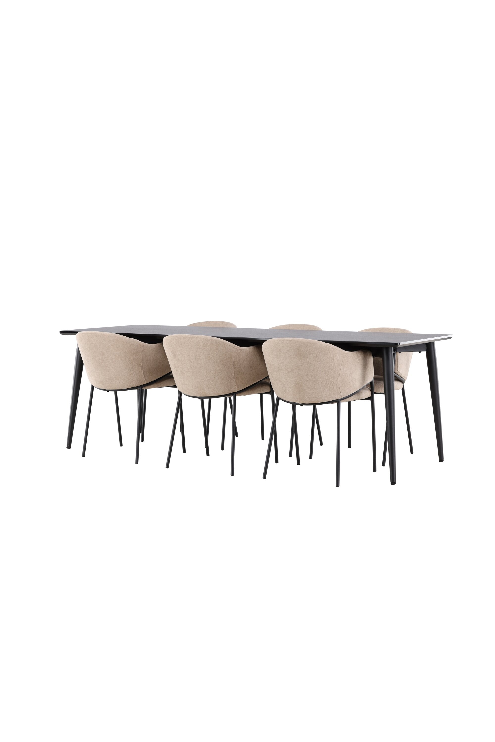 Objevte perfektní jídelní set s jídelní židlí Evelina a jídelním stolem Ellis – kombinaci, která vyzařuje eleganci i funkčnost pro váš domov. Jídelní židle Evelina je nejlepší volbou pro teplý a příjemný jídelní zážitek. Se sedadlem čalouněným polyesterovým lnem v jemné béžové barvě vnáší Evelina do vaší jídelny elegantní a zemitý nádech. Robustní konstrukce dělá z Eveliny spolehlivého společníka pro dlouhá a příjemná jídla. Prozkoumejte Ellis, robustní jídelní stůl, který se stane středobodem vašeho jídelního prostředí. Díky černé barvě dodává Ellis vašemu pokoji elegantní a moderní nádech. Stůl je vyroben s ocelovými nohami a deskou z MDF, což poskytuje dokonalou rovnováhu mezi robustností a stylem. S velkorysými rozměry 230x85 cm je stůl Ellis jako stvořený pro společenské večeře a setkání s přáteli a rodinou. Dopřejte své jídelně dokonalý výtah s jídelní židlí Evelina a jídelním stolem Ellis. Tato jídelní souprava vytváří trendy a stylovou atmosféru a zanechává trvalý dojem. Tato kombinace je ideální jak pro každodenní večeři, tak pro slavnostní příležitosti, nabízí rovnováhu mezi nadčasovým designem a moderními detaily, díky čemuž je perfektní volbou pro všechna vaše společenská setkání.