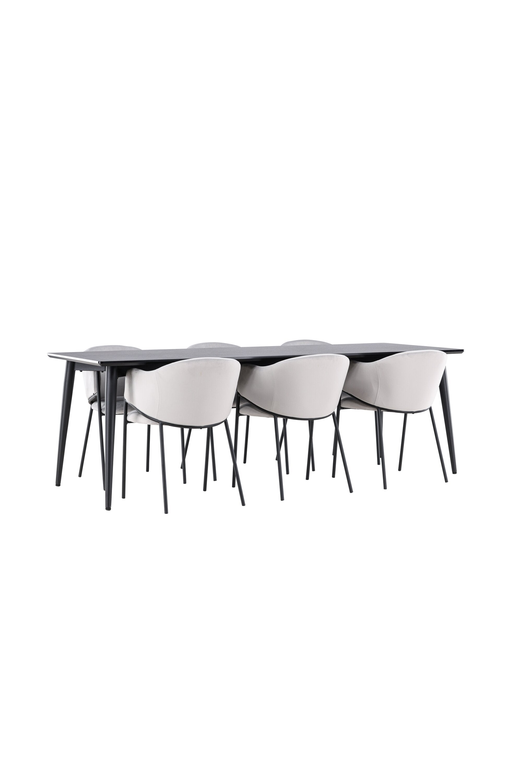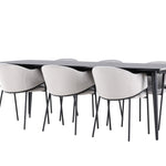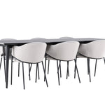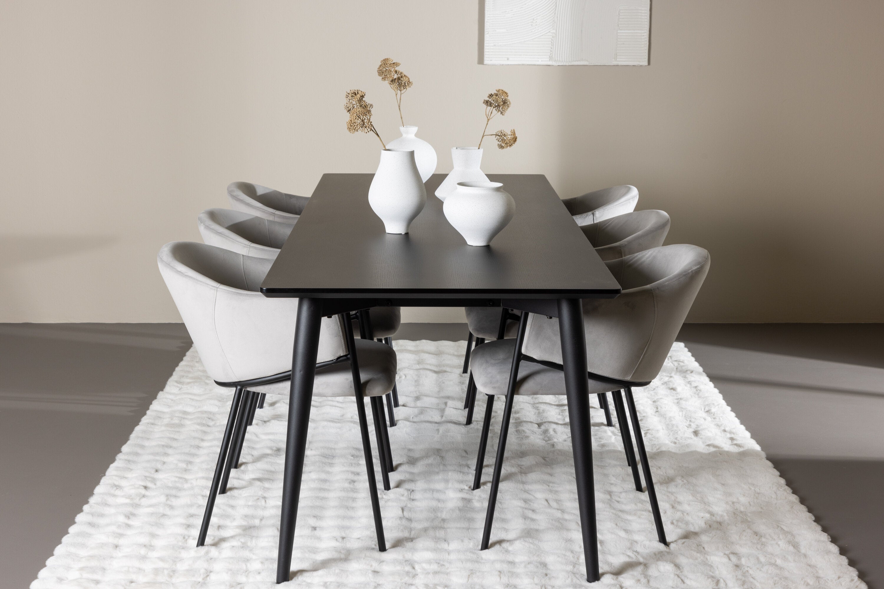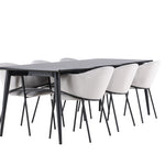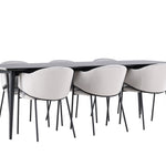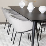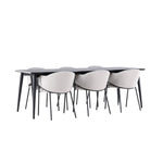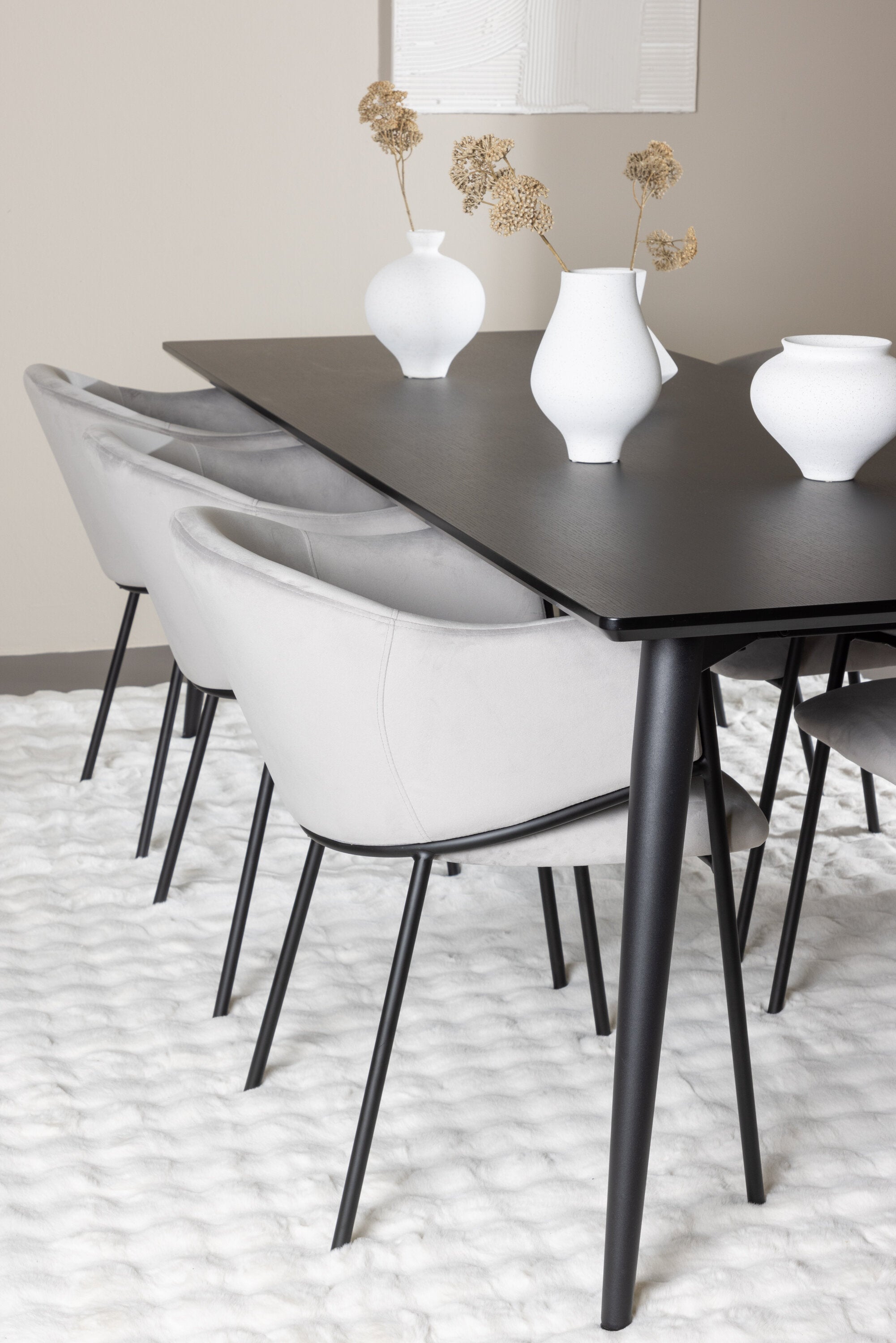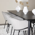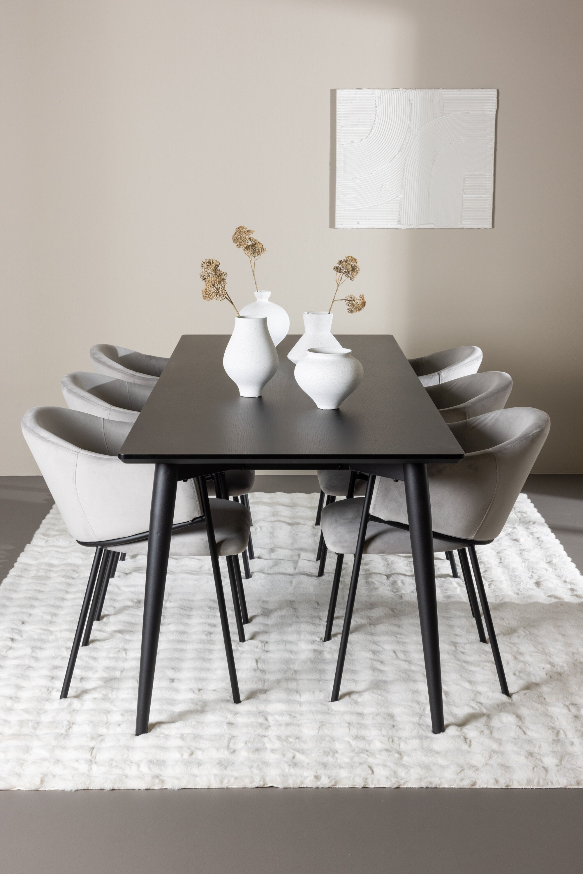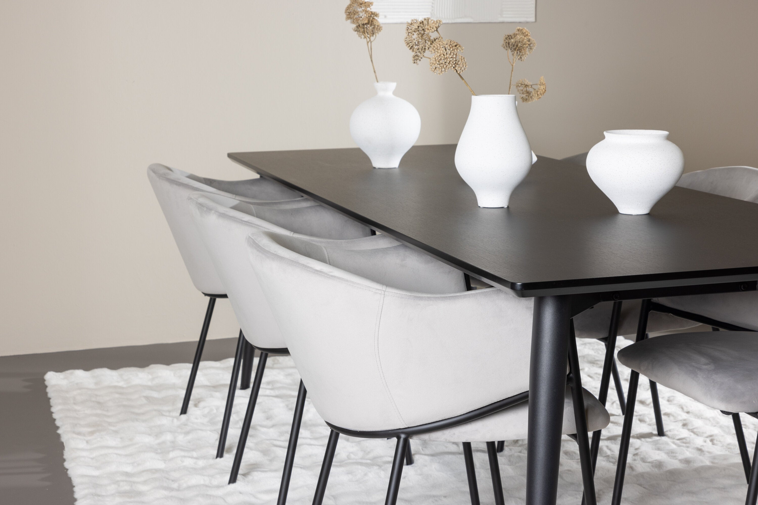 Dopřejte své jídelně vylepšení s jídelní židlí Evelina a jídelním stolem Ellis - kombinací, která kombinuje eleganci a robustnost v sofistikované jídelní sestavě. Jídelní židle řady Evelina má nostalgický výraz, je stylová i pohodlná a vytváří luxusní ústřední bod kolem vašeho jídelního stolu! Židle má celočalouněný sedák se zaobleným opěradlem ze světle šedé sametové látky a ozdobným, minimalistickým rámem z černé oceli. Trendový design zaujme a je zcela v souladu s nejnovějšími trendy. Pohodlně se usaďte a vychutnejte si jídlo v těchto elegantních jídelních židlích! Prozkoumejte Ellis, robustní jídelní stůl, který se stane centrem vašeho jídelního prostředí. Díky černé barvě dodá Ellis vašemu pokoji elegantní a moderní nádech. Stůl je vyroben s ocelovými nohami a stolní deskou z MDF, což poskytuje dokonalou rovnováhu mezi robustností a stylem. S velkorysými rozměry 230x85 cm je stůl Ellis jako stvořený pro společenské večeře a setkání s přáteli a rodinou. Jeho robustní konstrukce a elegantní design z něj činí spolehlivý kus nábytku, který se hodí pro všechny příležitosti. Ať už tuto jídelní skupinu využijete k rodinné večeři nebo k pozvání hostů na večírek, Evelina a Ellis u vás doma vytvoří trendy a stylovou atmosféru. Vylepšete svůj jídelní kout elegantním a robustním jídelním stolem Ellis a luxusními jídelními židlemi Evelina.