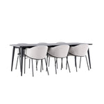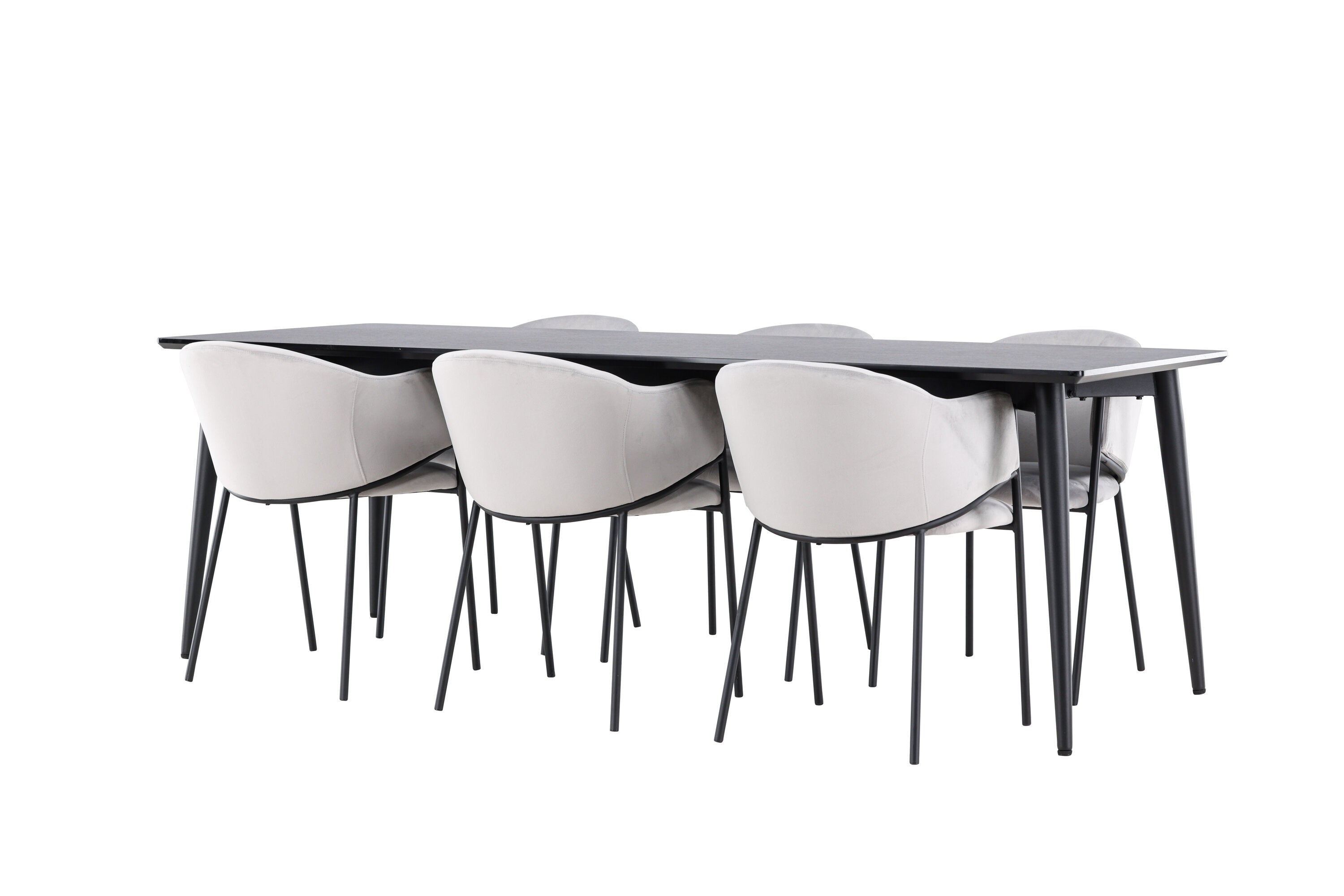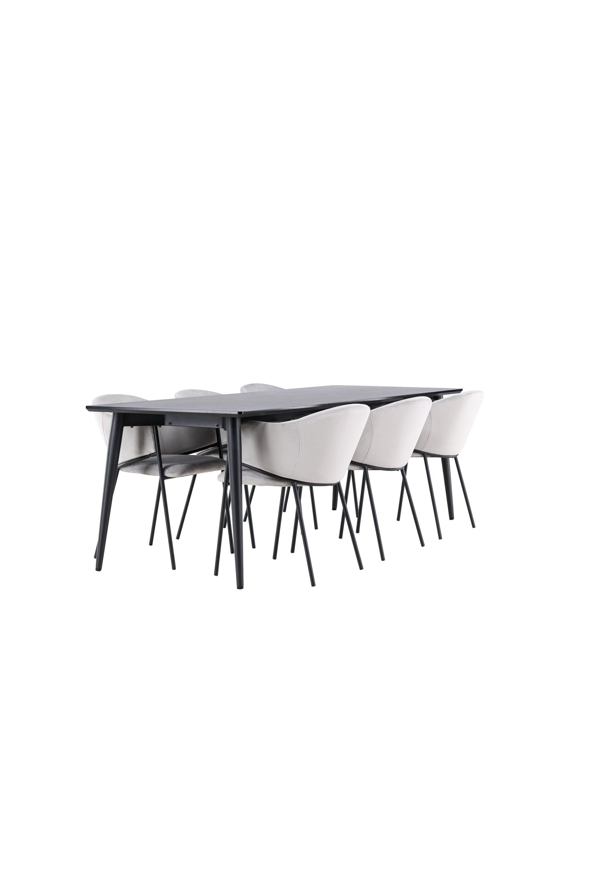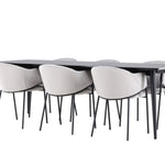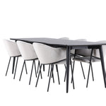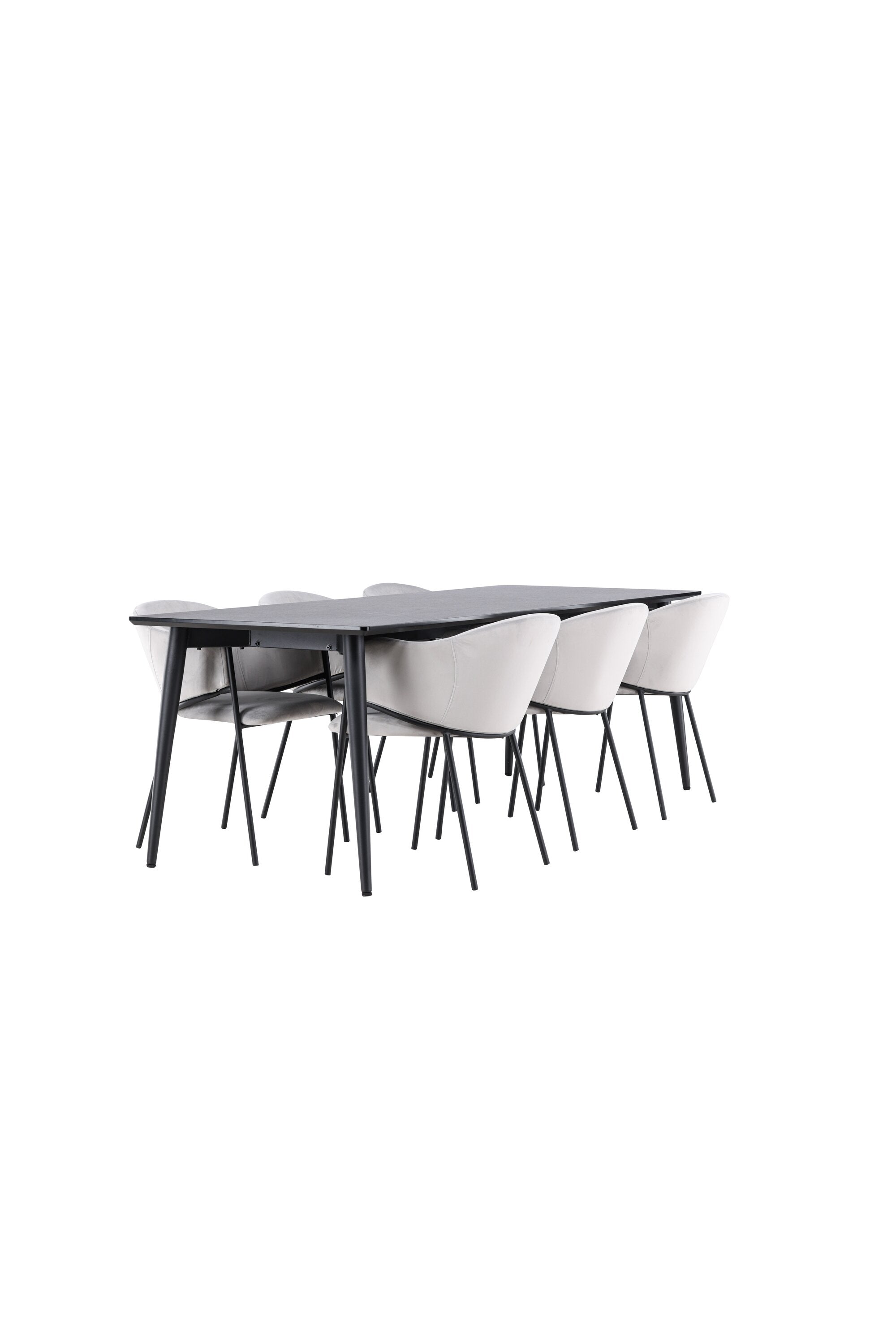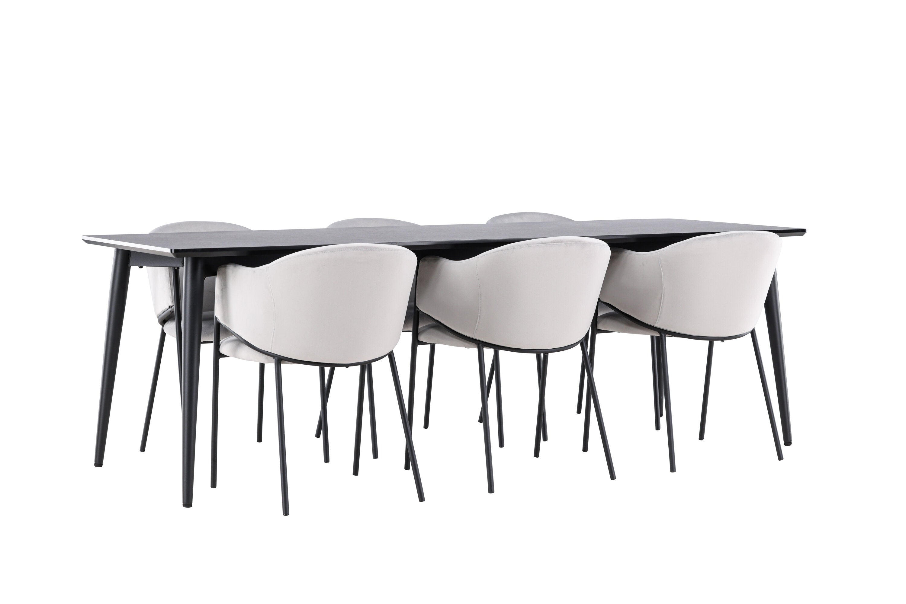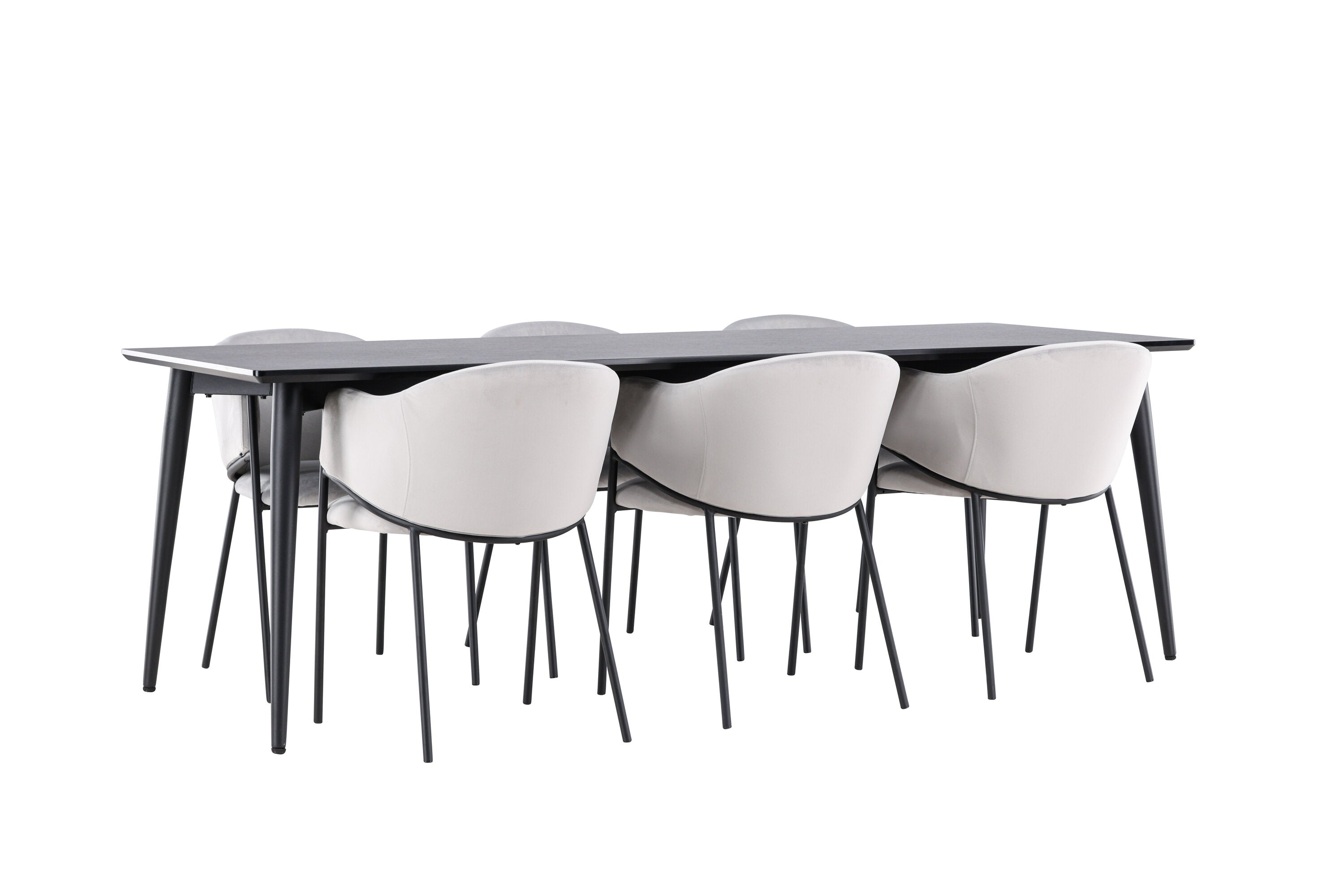 Dopřejte své jídelně vylepšení s jídelní židlí Evelina a jídelním stolem Ellis - kombinací, která kombinuje eleganci a robustnost v sofistikované jídelní sestavě. Jídelní židle řady Evelina má nostalgický výraz, je stylová i pohodlná a vytváří luxusní ústřední bod kolem vašeho jídelního stolu! Židle má celočalouněný sedák se zaobleným opěradlem ze světle šedé sametové látky a ozdobným, minimalistickým rámem z černé oceli. Trendový design zaujme a je zcela v souladu s nejnovějšími trendy. Pohodlně se usaďte a vychutnejte si jídlo v těchto elegantních jídelních židlích! Prozkoumejte Ellis, robustní jídelní stůl, který se stane centrem vašeho jídelního prostředí. Díky černé barvě dodá Ellis vašemu pokoji elegantní a moderní nádech. Stůl je vyroben s ocelovými nohami a stolní deskou z MDF, což poskytuje dokonalou rovnováhu mezi robustností a stylem. S velkorysými rozměry 230x85 cm je stůl Ellis jako stvořený pro společenské večeře a setkání s přáteli a rodinou. Jeho robustní konstrukce a elegantní design z něj činí spolehlivý kus nábytku, který se hodí pro všechny příležitosti. Ať už tuto jídelní skupinu využijete k rodinné večeři nebo k pozvání hostů na večírek, Evelina a Ellis u vás doma vytvoří trendy a stylovou atmosféru. Vylepšete svůj jídelní kout elegantním a robustním jídelním stolem Ellis a luxusními jídelními židlemi Evelina.