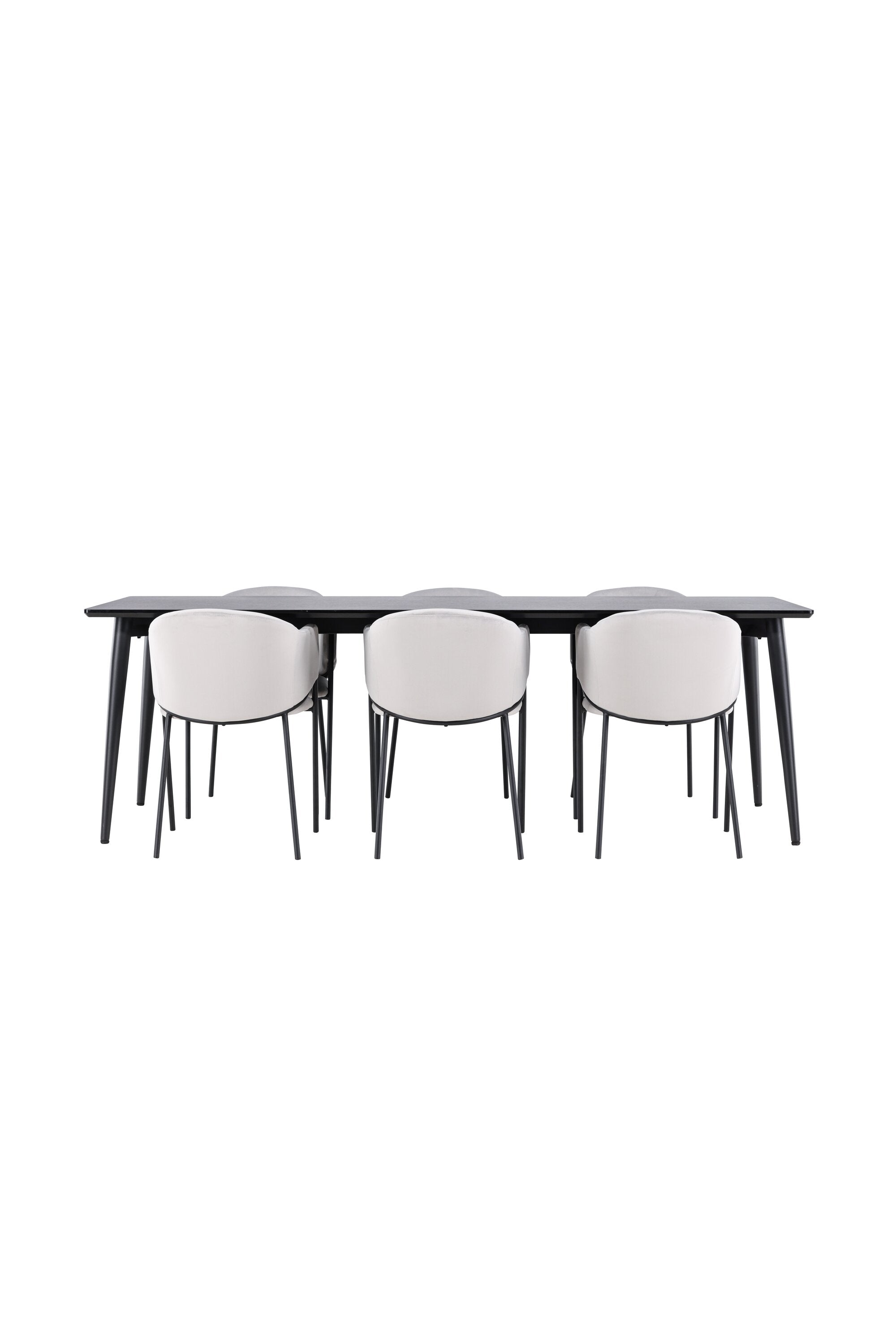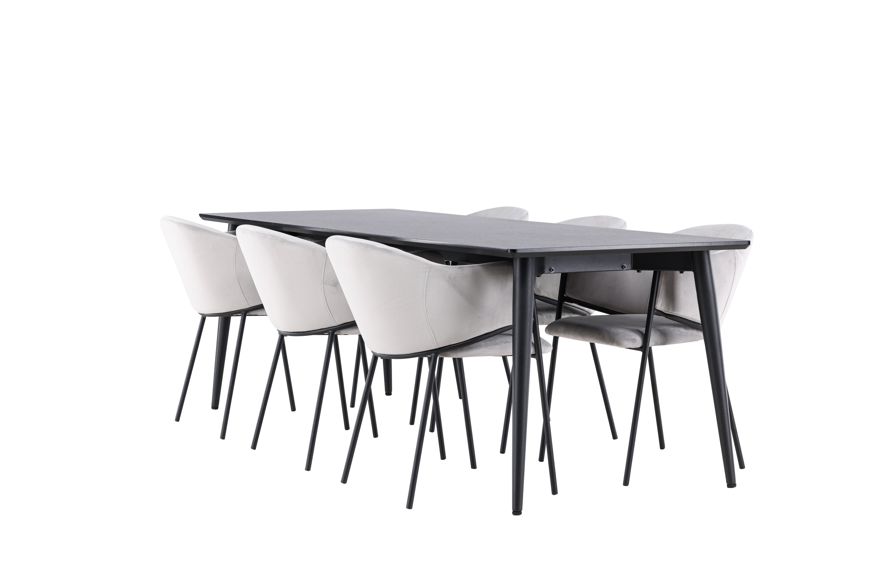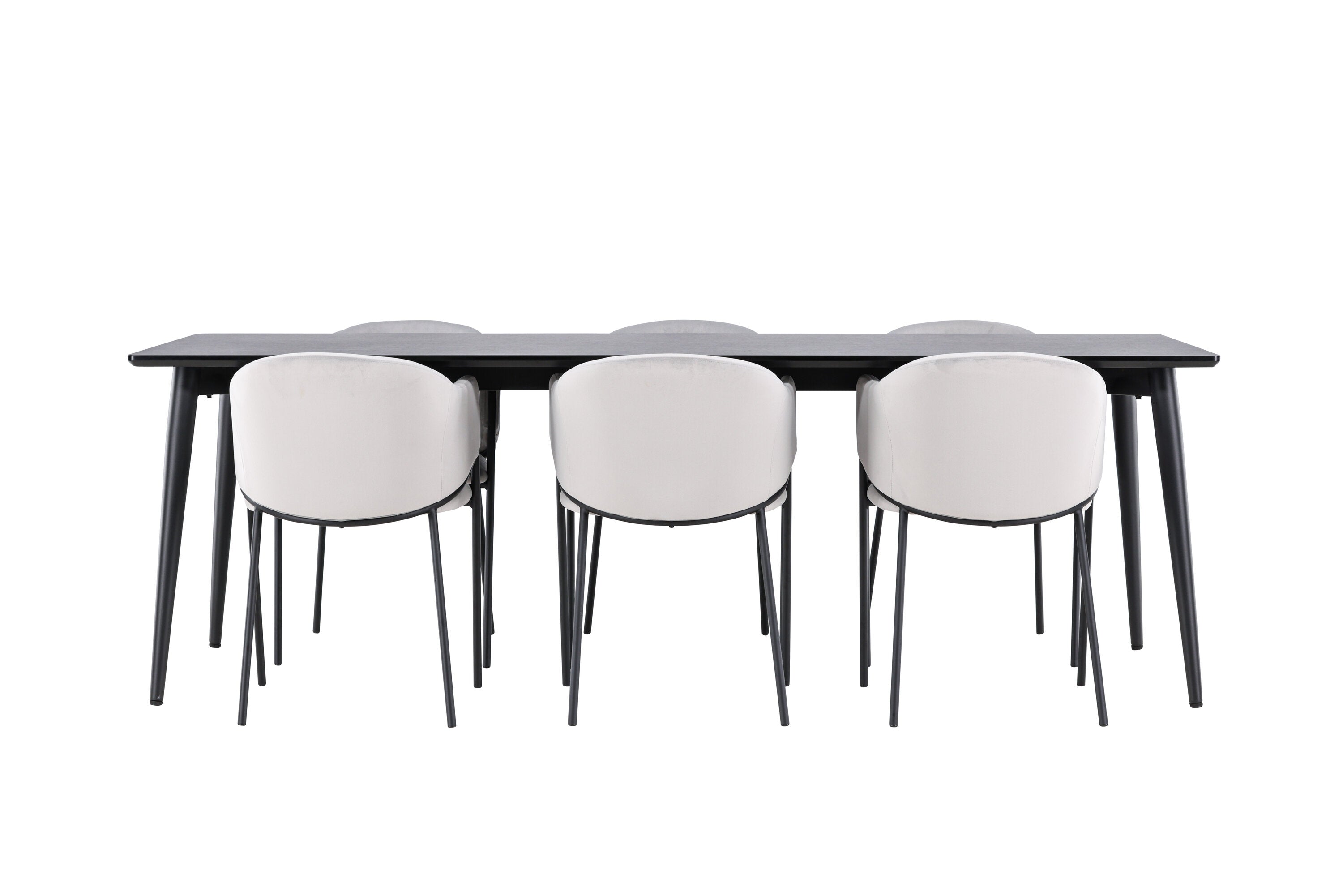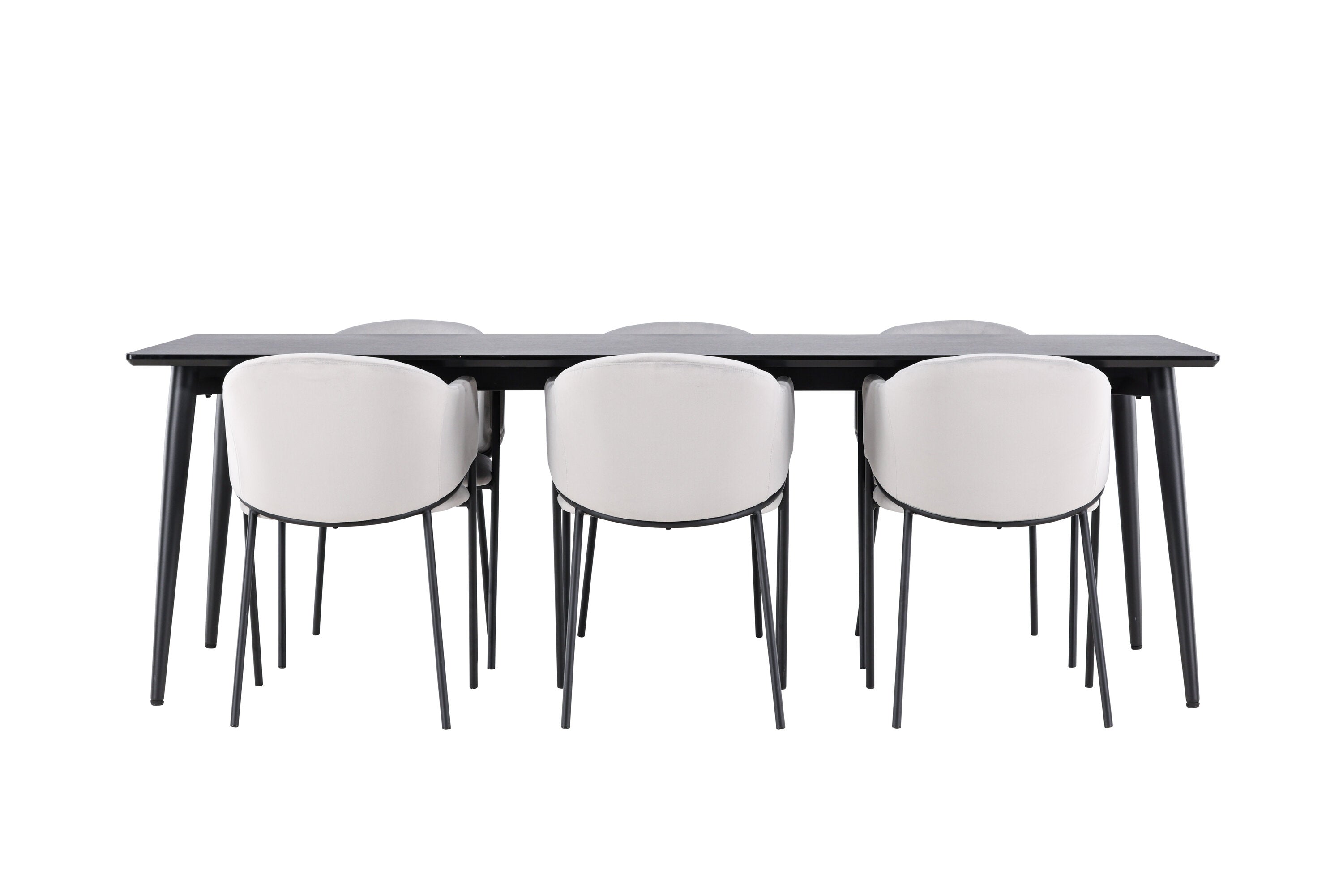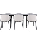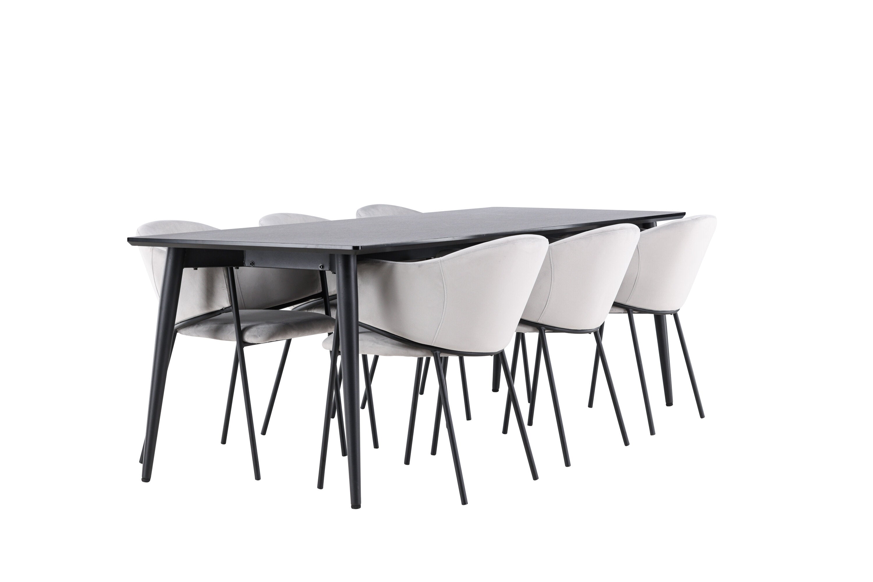Dopřejte své jídelně vylepšení s jídelní židlí Evelina a jídelním stolem Ellis - kombinací, která kombinuje eleganci a robustnost v sofistikované jídelní sestavě. Jídelní židle řady Evelina má nostalgický výraz, je stylová i pohodlná a vytváří luxusní ústřední bod kolem vašeho jídelního stolu! Židle má celočalouněný sedák se zaobleným opěradlem ze světle šedé sametové látky a ozdobným, minimalistickým rámem z černé oceli. Trendový design zaujme a je zcela v souladu s nejnovějšími trendy. Pohodlně se usaďte a vychutnejte si jídlo v těchto elegantních jídelních židlích! Prozkoumejte Ellis, robustní jídelní stůl, který se stane centrem vašeho jídelního prostředí. Díky černé barvě dodá Ellis vašemu pokoji elegantní a moderní nádech. Stůl je vyroben s ocelovými nohami a stolní deskou z MDF, což poskytuje dokonalou rovnováhu mezi robustností a stylem. S velkorysými rozměry 230x85 cm je stůl Ellis jako stvořený pro společenské večeře a setkání s přáteli a rodinou. Jeho robustní konstrukce a elegantní design z něj činí spolehlivý kus nábytku, který se hodí pro všechny příležitosti. Ať už tuto jídelní skupinu využijete k rodinné večeři nebo k pozvání hostů na večírek, Evelina a Ellis u vás doma vytvoří trendy a stylovou atmosféru. Vylepšete svůj jídelní kout elegantním a robustním jídelním stolem Ellis a luxusními jídelními židlemi Evelina.