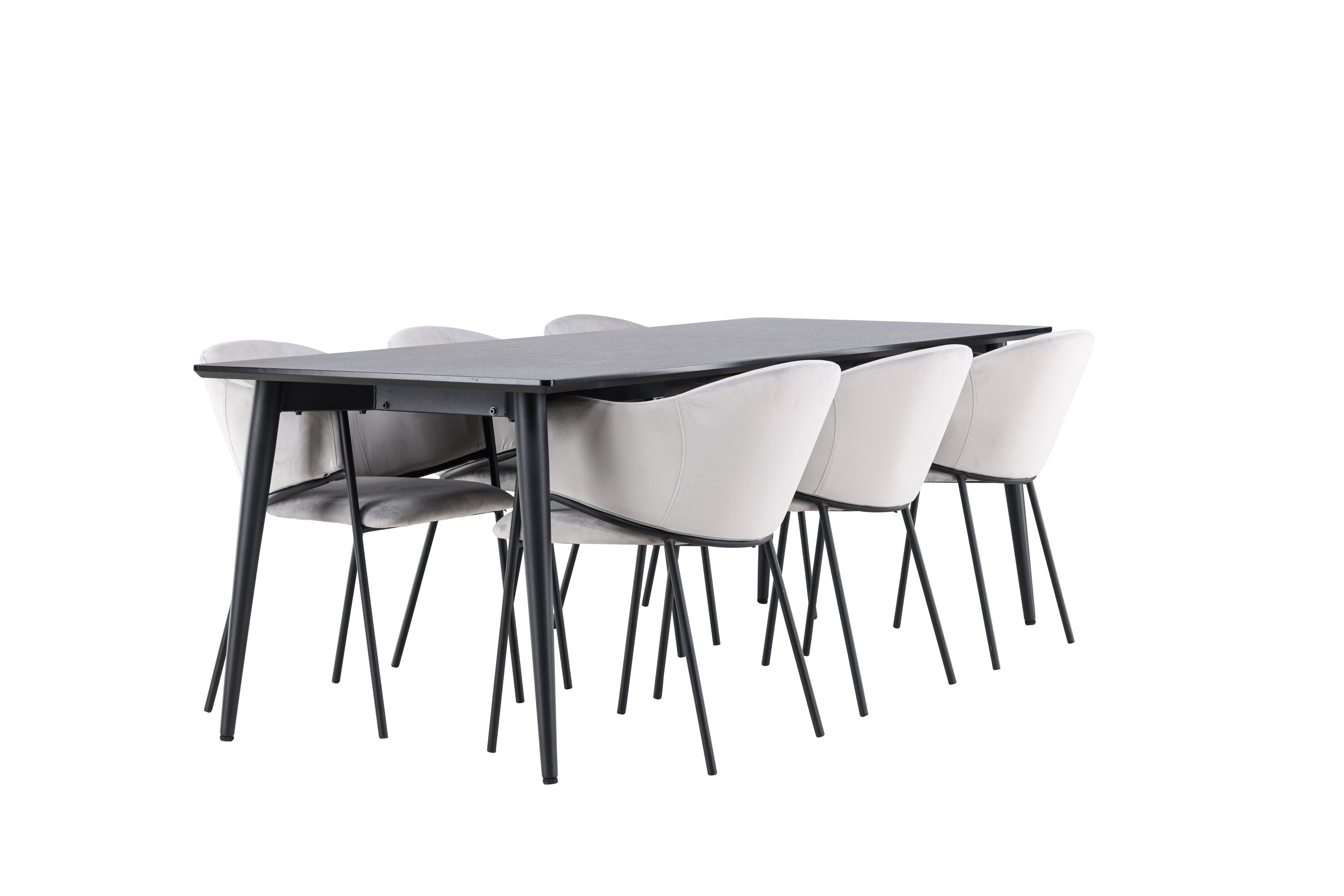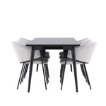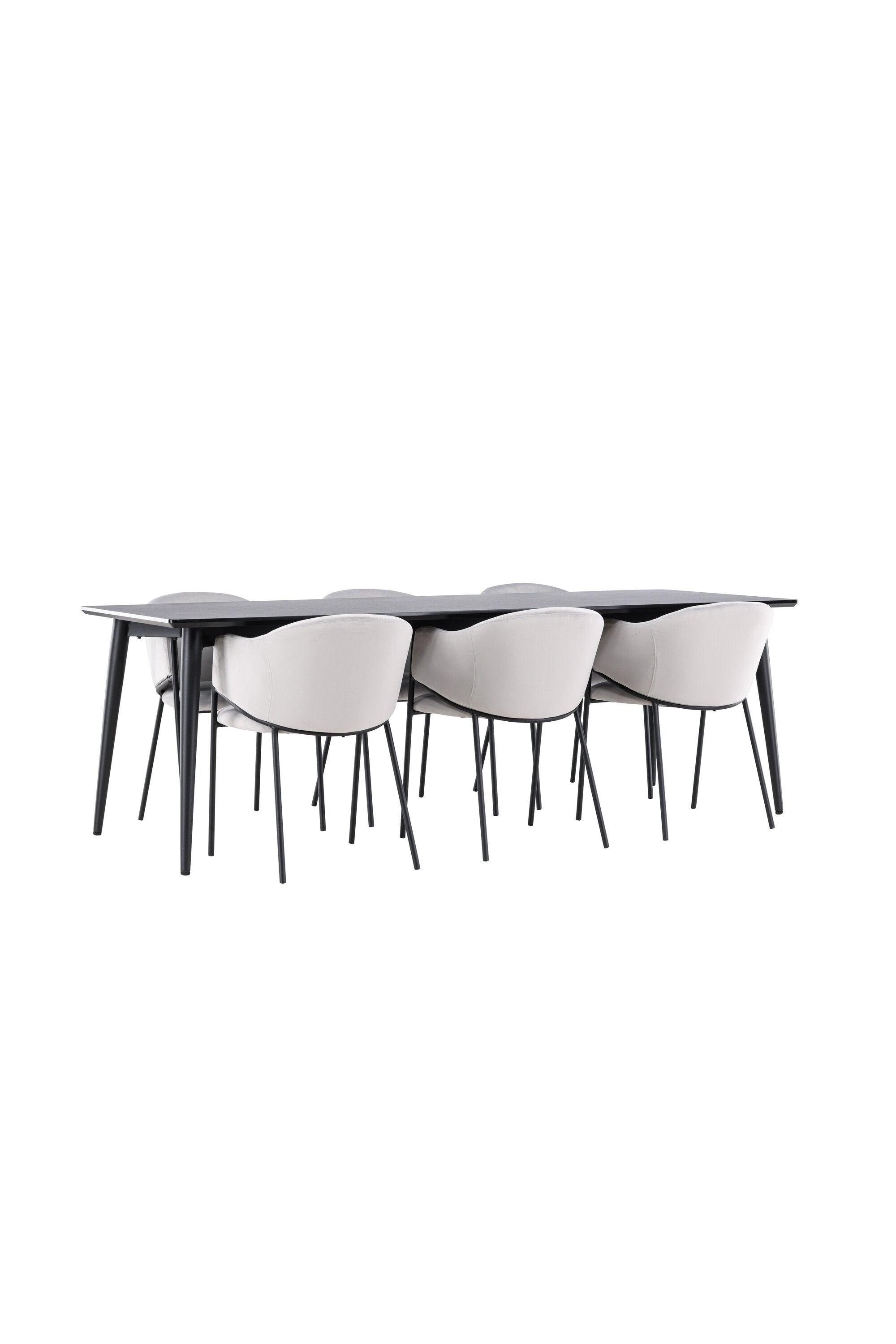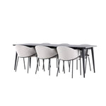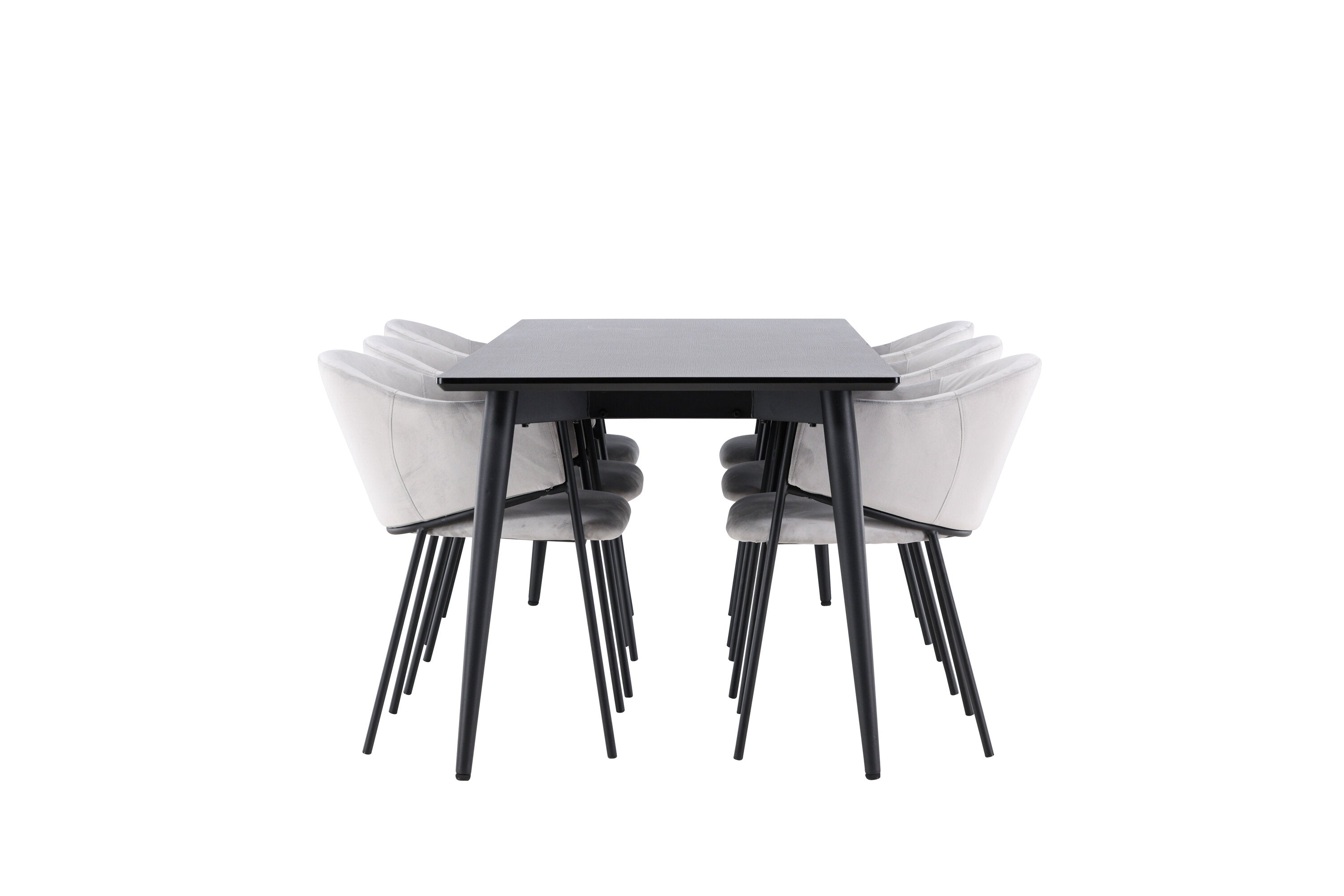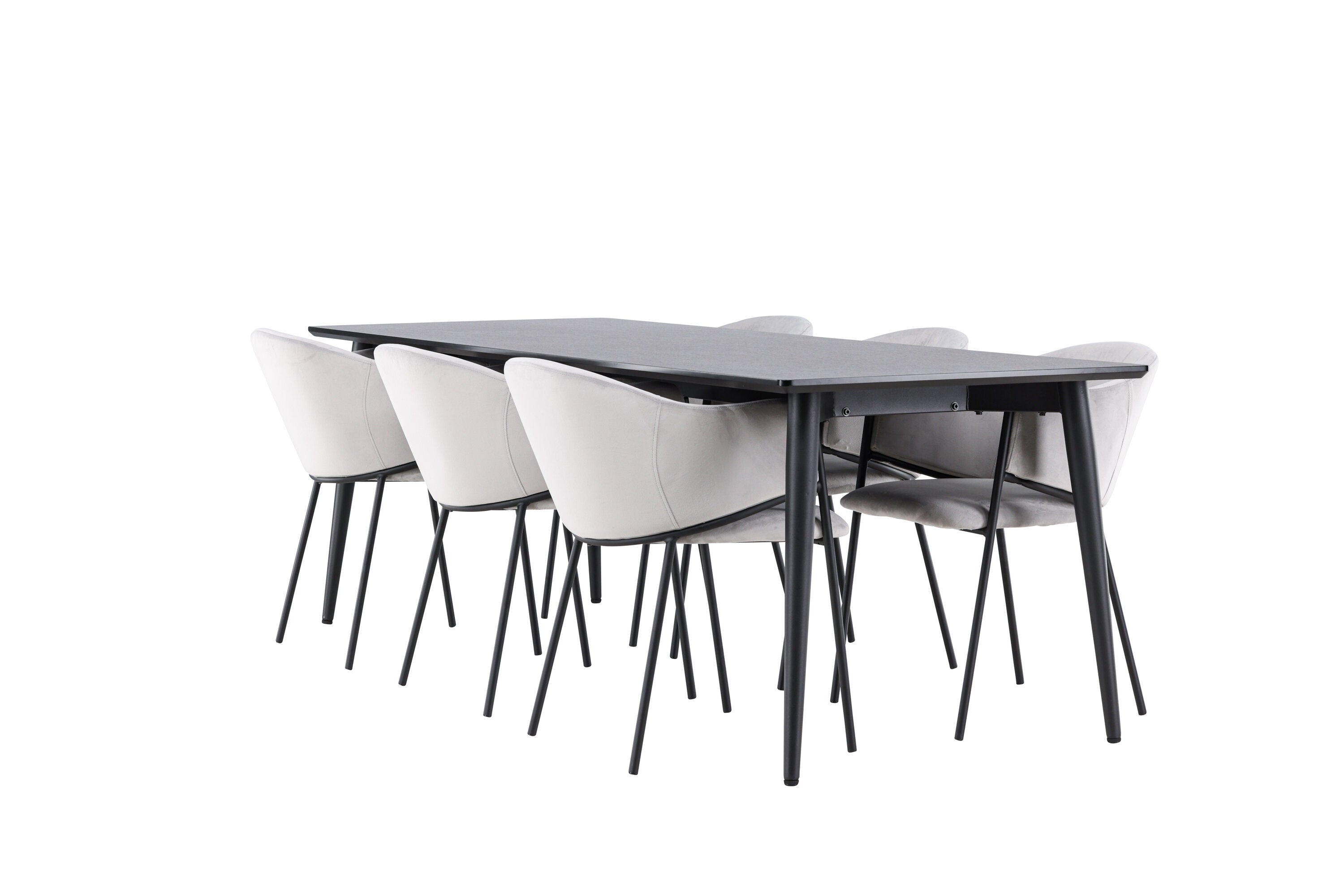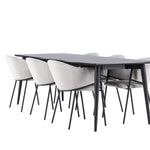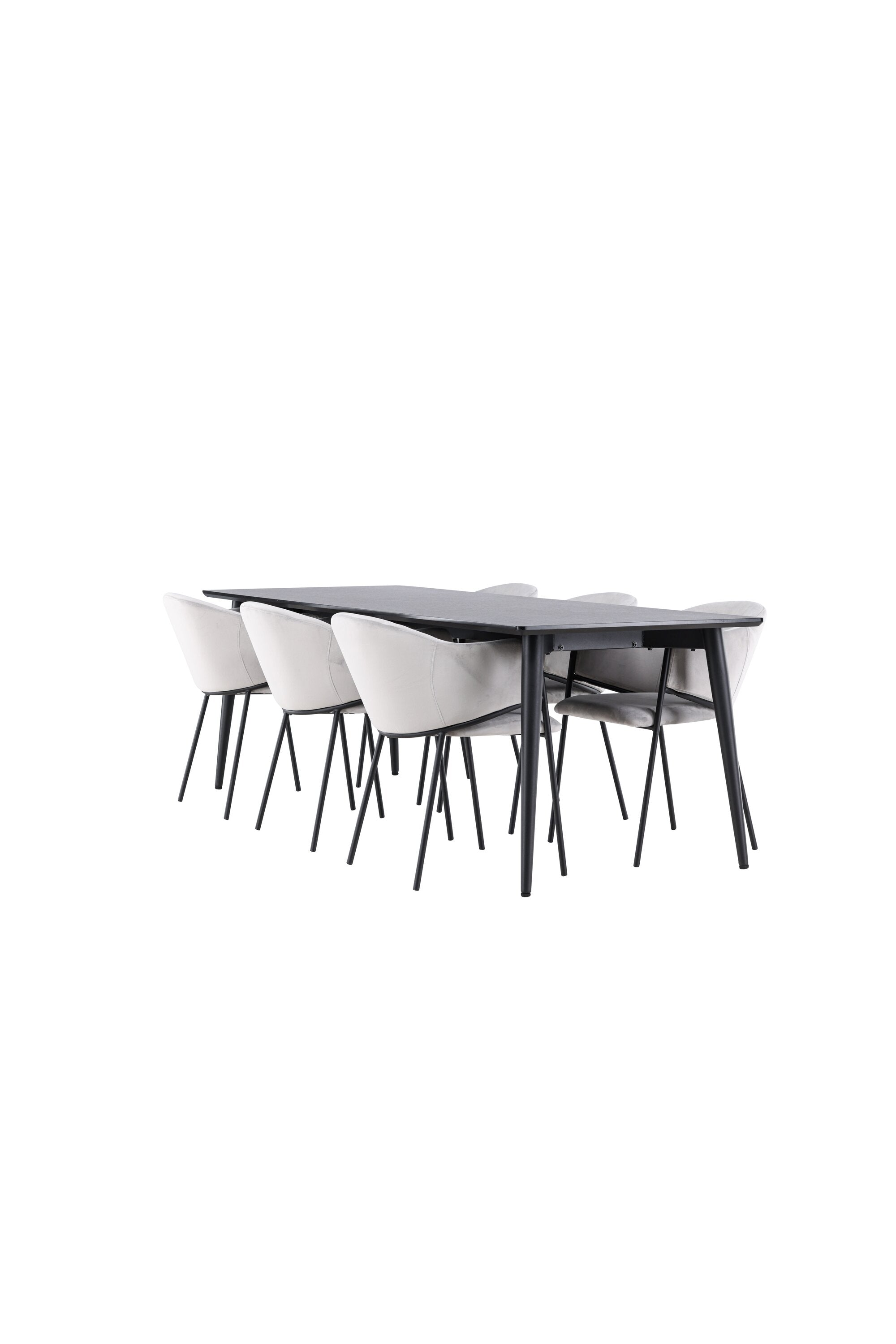 Dopřejte své jídelně vylepšení s jídelní židlí Evelina a jídelním stolem Ellis - kombinací, která kombinuje eleganci a robustnost v sofistikované jídelní sestavě. Jídelní židle řady Evelina má nostalgický výraz, je stylová i pohodlná a vytváří luxusní ústřední bod kolem vašeho jídelního stolu! Židle má celočalouněný sedák se zaobleným opěradlem ze světle šedé sametové látky a ozdobným, minimalistickým rámem z černé oceli. Trendový design zaujme a je zcela v souladu s nejnovějšími trendy. Pohodlně se usaďte a vychutnejte si jídlo v těchto elegantních jídelních židlích! Prozkoumejte Ellis, robustní jídelní stůl, který se stane centrem vašeho jídelního prostředí. Díky černé barvě dodá Ellis vašemu pokoji elegantní a moderní nádech. Stůl je vyroben s ocelovými nohami a stolní deskou z MDF, což poskytuje dokonalou rovnováhu mezi robustností a stylem. S velkorysými rozměry 230x85 cm je stůl Ellis jako stvořený pro společenské večeře a setkání s přáteli a rodinou. Jeho robustní konstrukce a elegantní design z něj činí spolehlivý kus nábytku, který se hodí pro všechny příležitosti. Ať už tuto jídelní skupinu využijete k rodinné večeři nebo k pozvání hostů na večírek, Evelina a Ellis u vás doma vytvoří trendy a stylovou atmosféru. Vylepšete svůj jídelní kout elegantním a robustním jídelním stolem Ellis a luxusními jídelními židlemi Evelina.