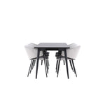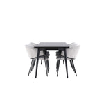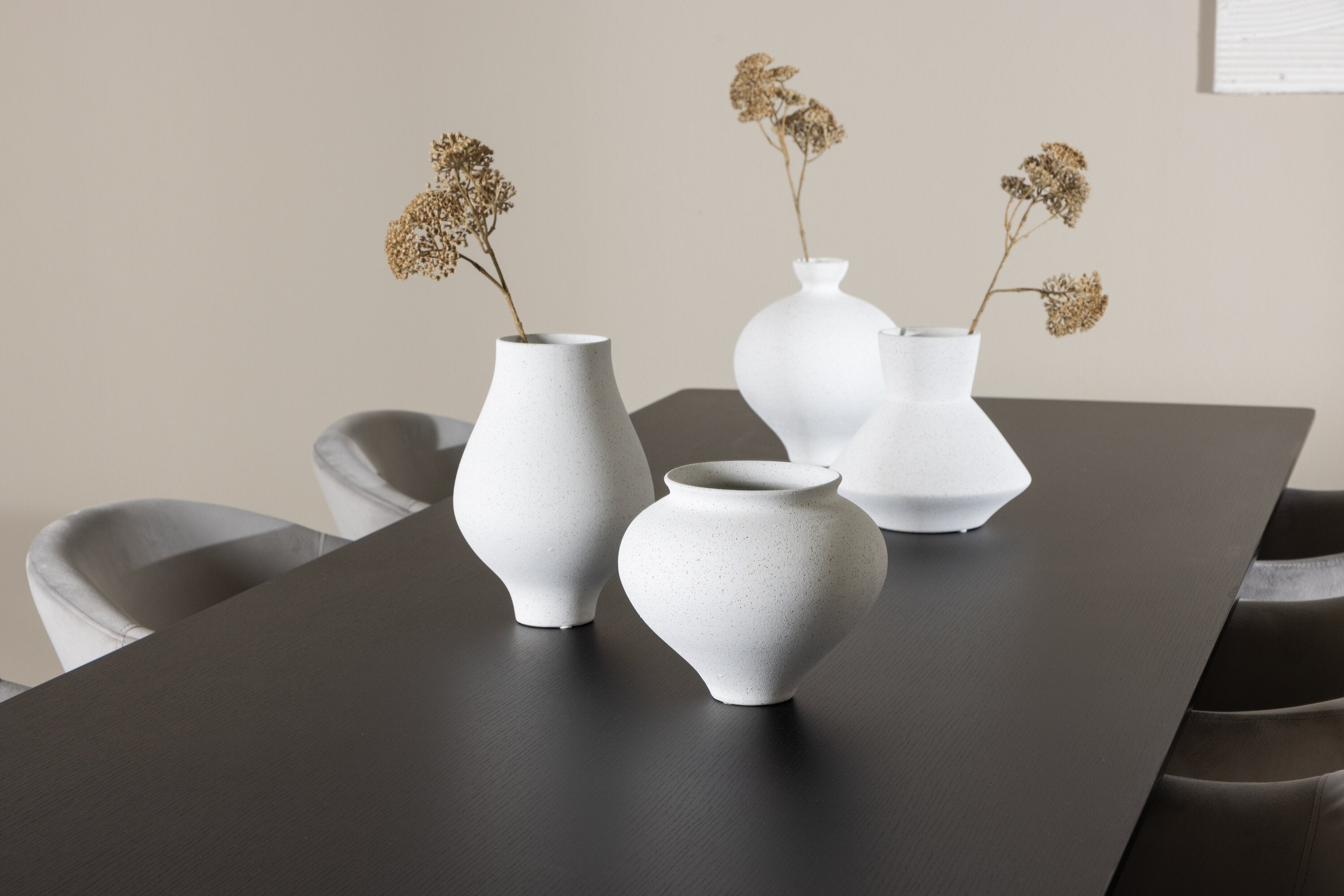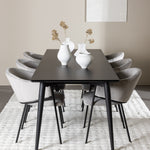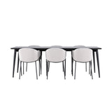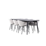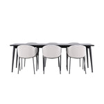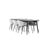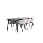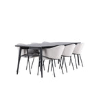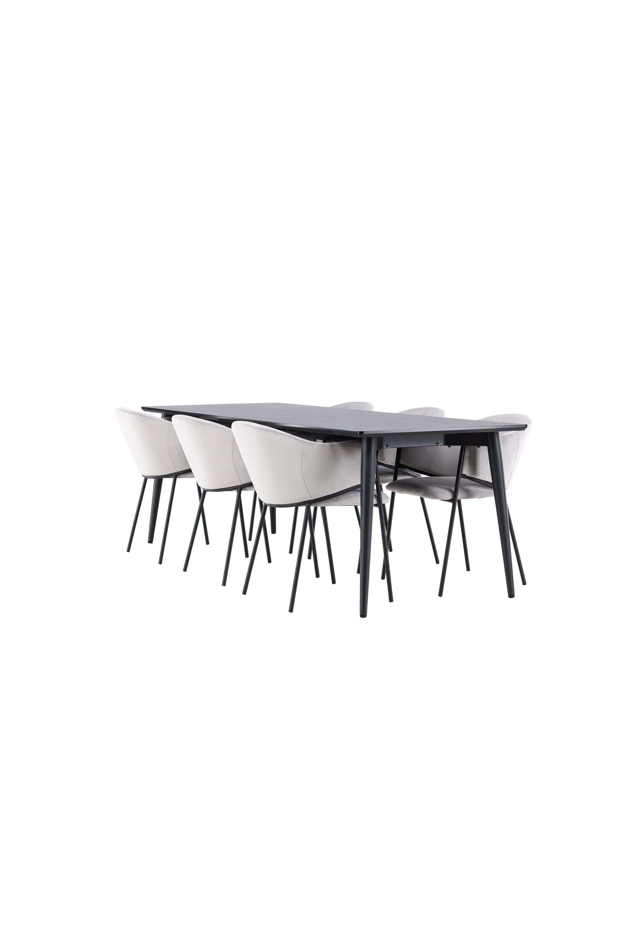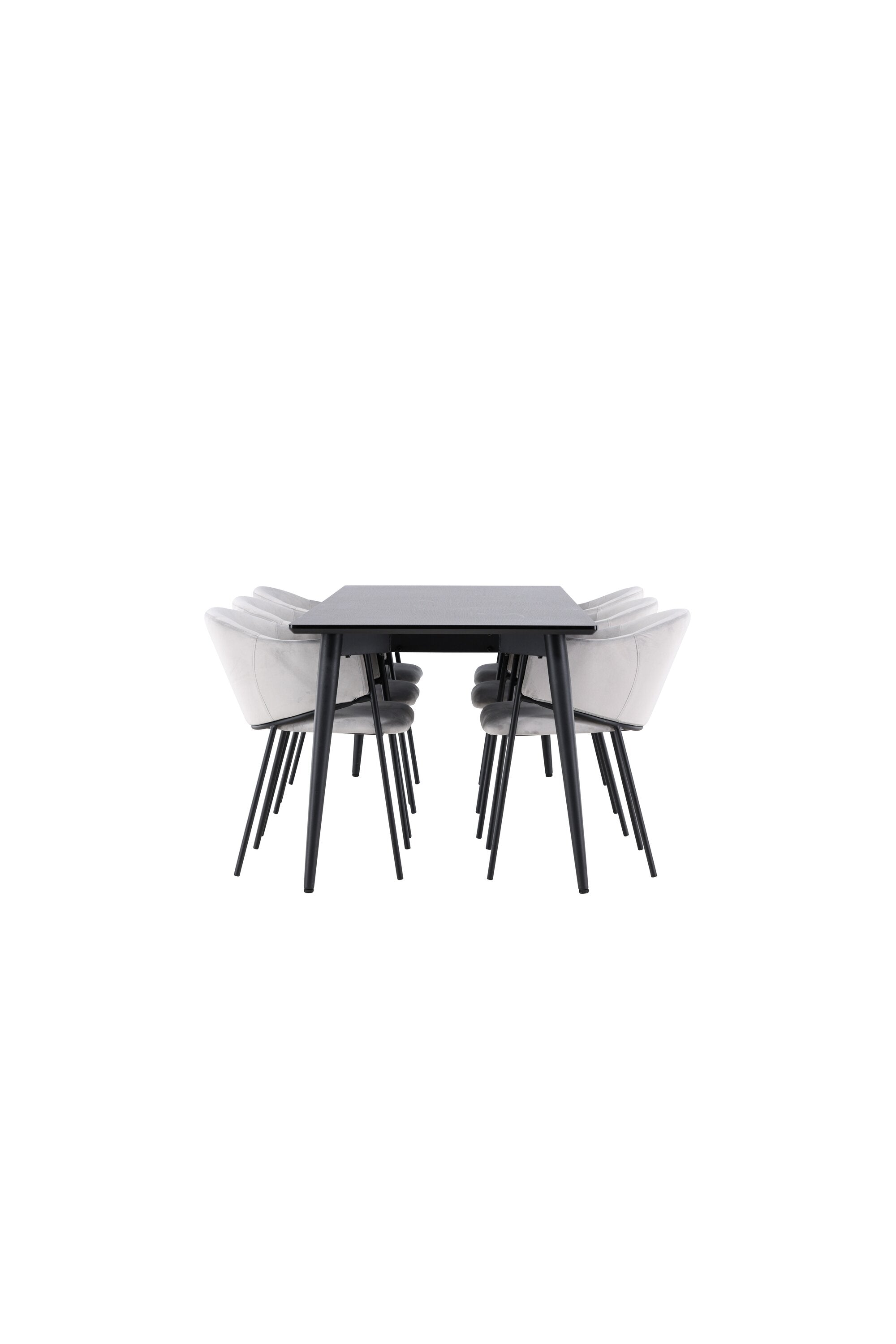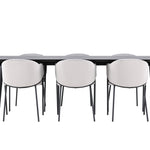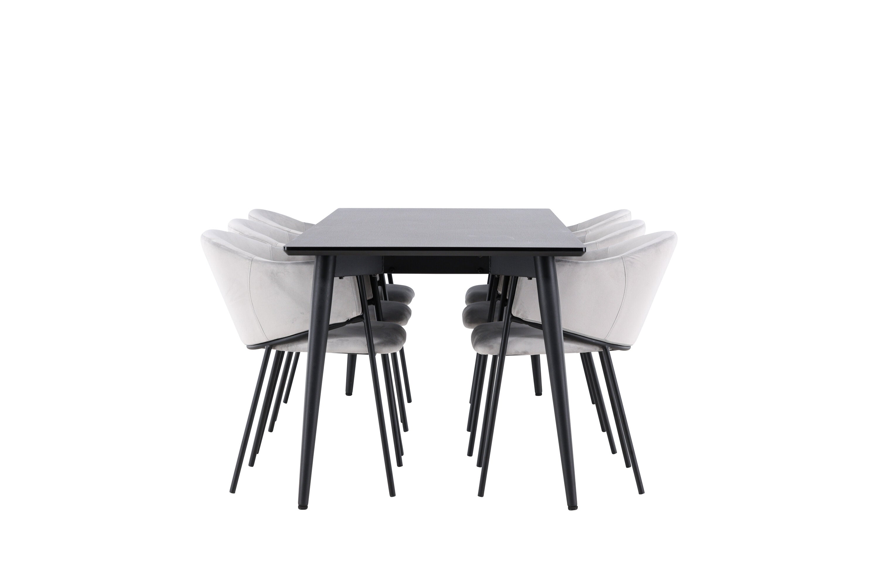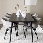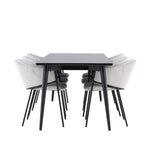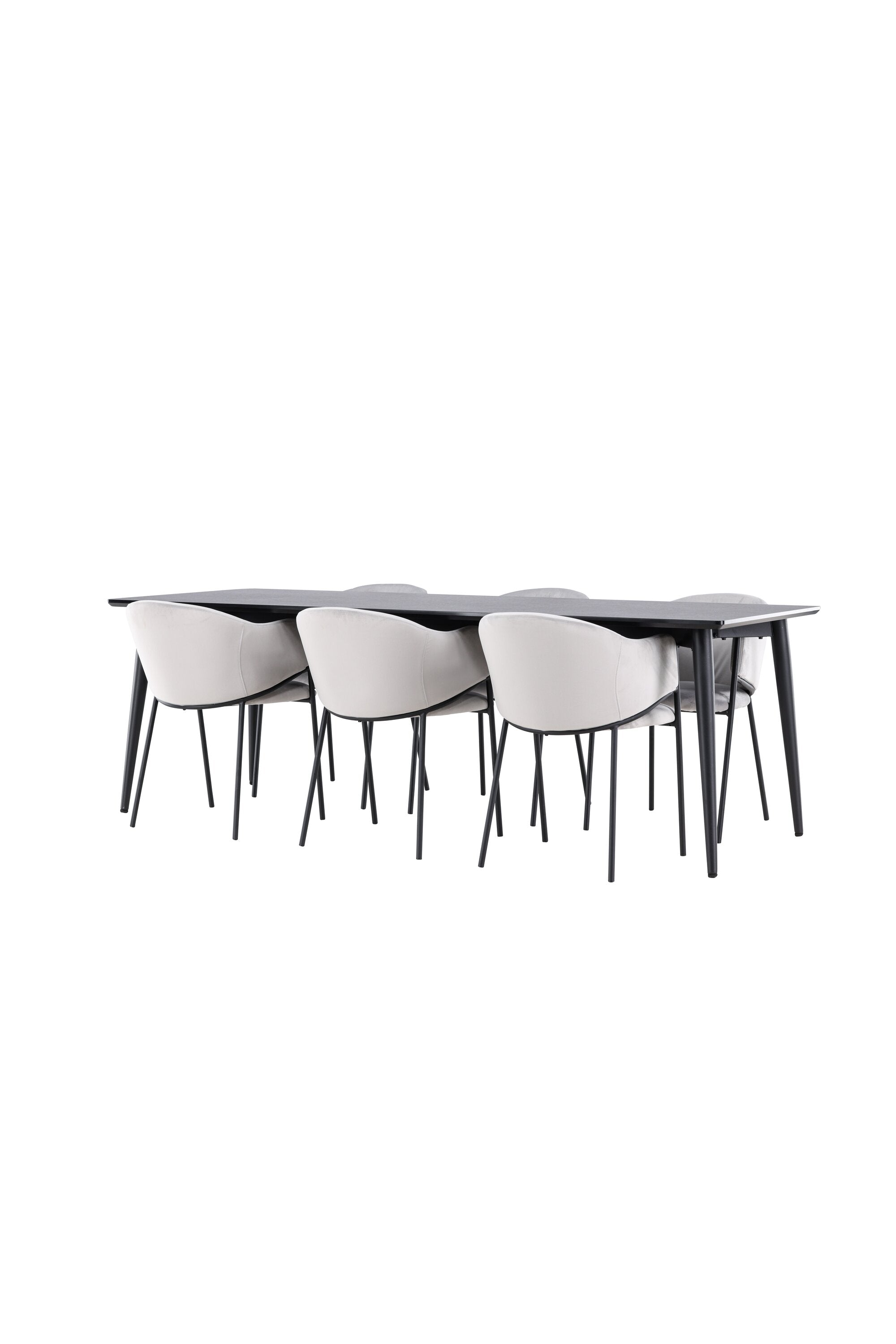 Dopřejte své jídelně vylepšení s jídelní židlí Evelina a jídelním stolem Ellis - kombinací, která kombinuje eleganci a robustnost v sofistikované jídelní sestavě. Jídelní židle řady Evelina má nostalgický výraz, je stylová i pohodlná a vytváří luxusní ústřední bod kolem vašeho jídelního stolu! Židle má celočalouněný sedák se zaobleným opěradlem ze světle šedé sametové látky a ozdobným, minimalistickým rámem z černé oceli. Trendový design zaujme a je zcela v souladu s nejnovějšími trendy. Pohodlně se usaďte a vychutnejte si jídlo v těchto elegantních jídelních židlích! Prozkoumejte Ellis, robustní jídelní stůl, který se stane centrem vašeho jídelního prostředí. Díky černé barvě dodá Ellis vašemu pokoji elegantní a moderní nádech. Stůl je vyroben s ocelovými nohami a stolní deskou z MDF, což poskytuje dokonalou rovnováhu mezi robustností a stylem. S velkorysými rozměry 230x85 cm je stůl Ellis jako stvořený pro společenské večeře a setkání s přáteli a rodinou. Jeho robustní konstrukce a elegantní design z něj činí spolehlivý kus nábytku, který se hodí pro všechny příležitosti. Ať už tuto jídelní skupinu využijete k rodinné večeři nebo k pozvání hostů na večírek, Evelina a Ellis u vás doma vytvoří trendy a stylovou atmosféru. Vylepšete svůj jídelní kout elegantním a robustním jídelním stolem Ellis a luxusními jídelními židlemi Evelina.