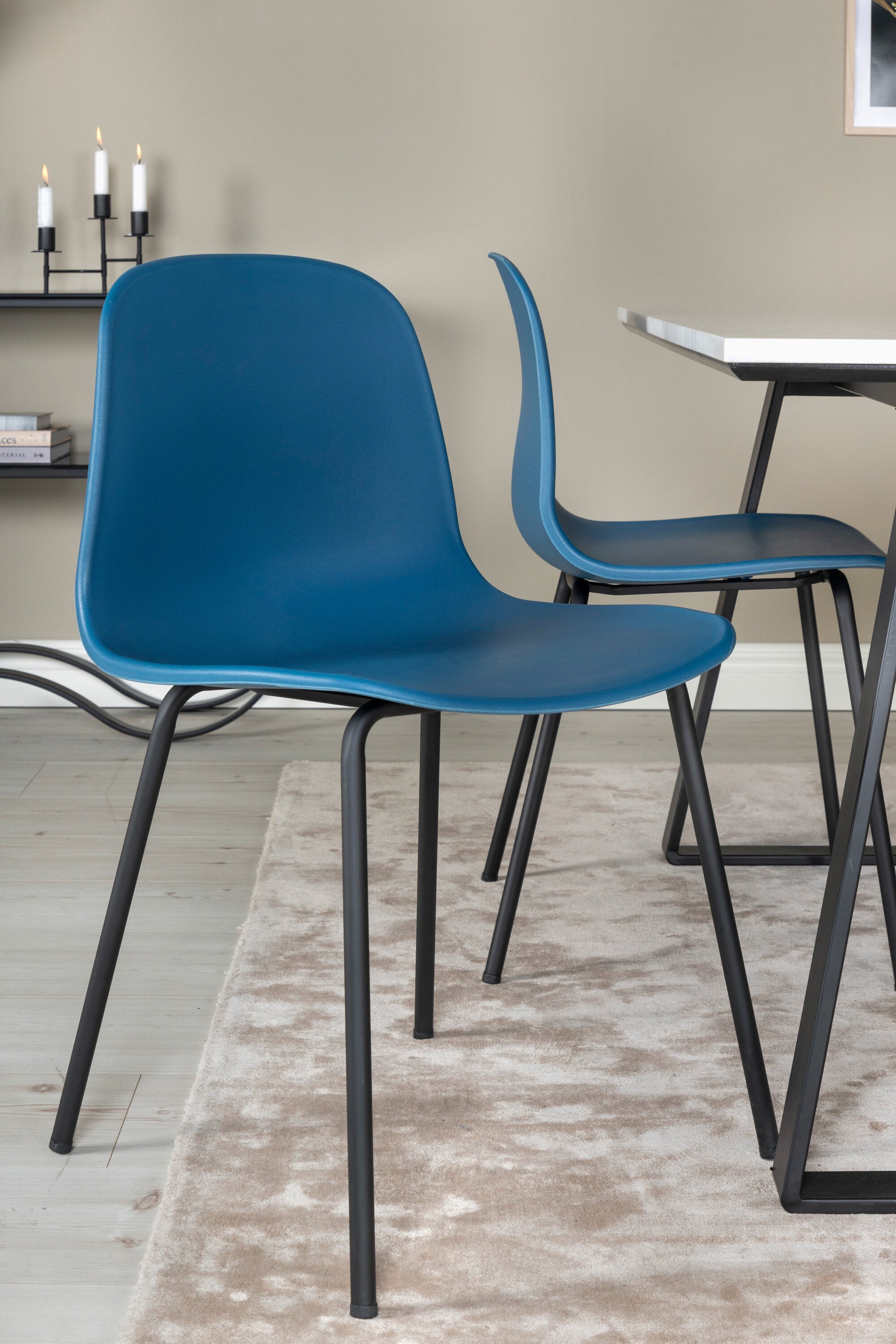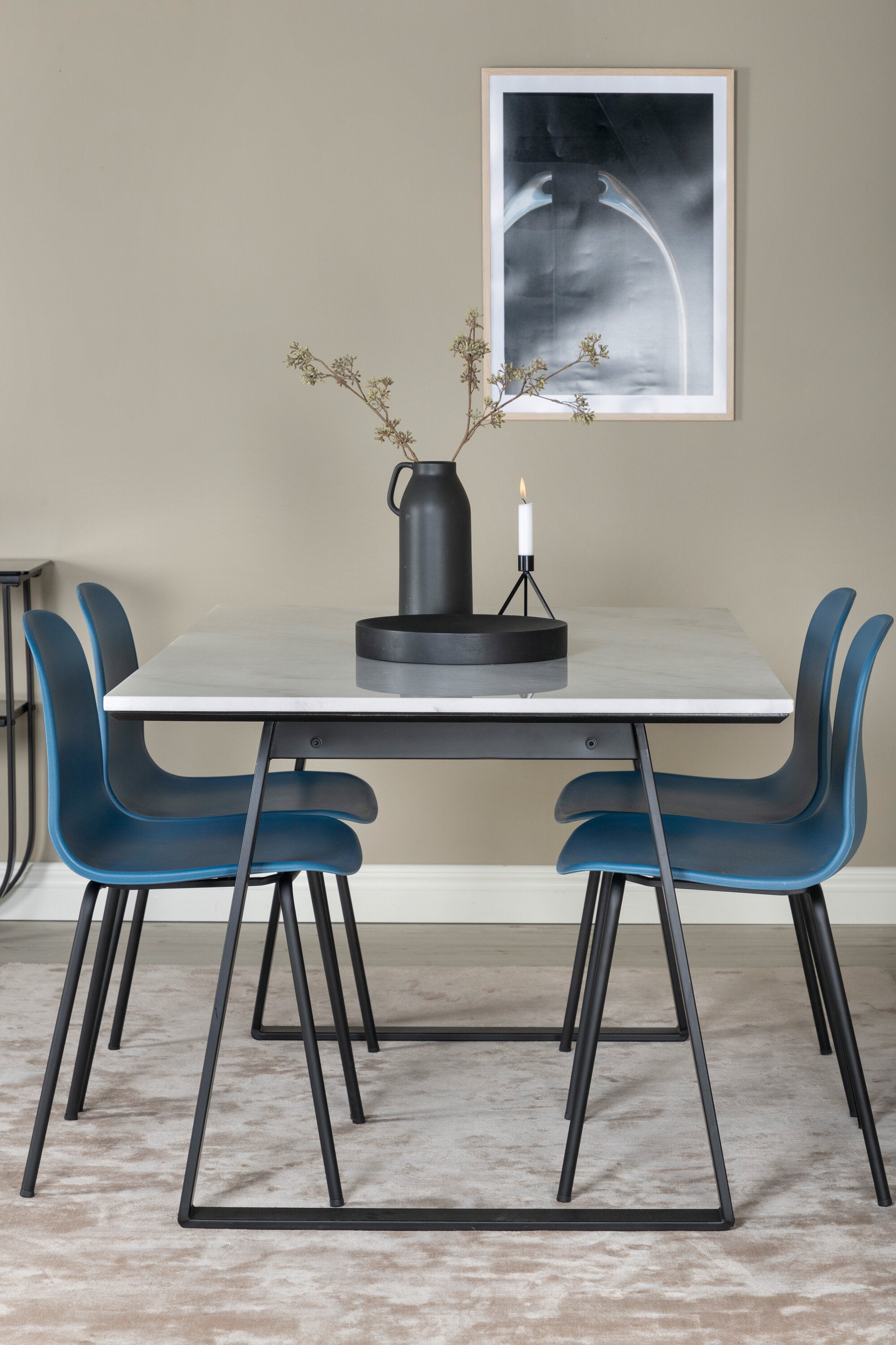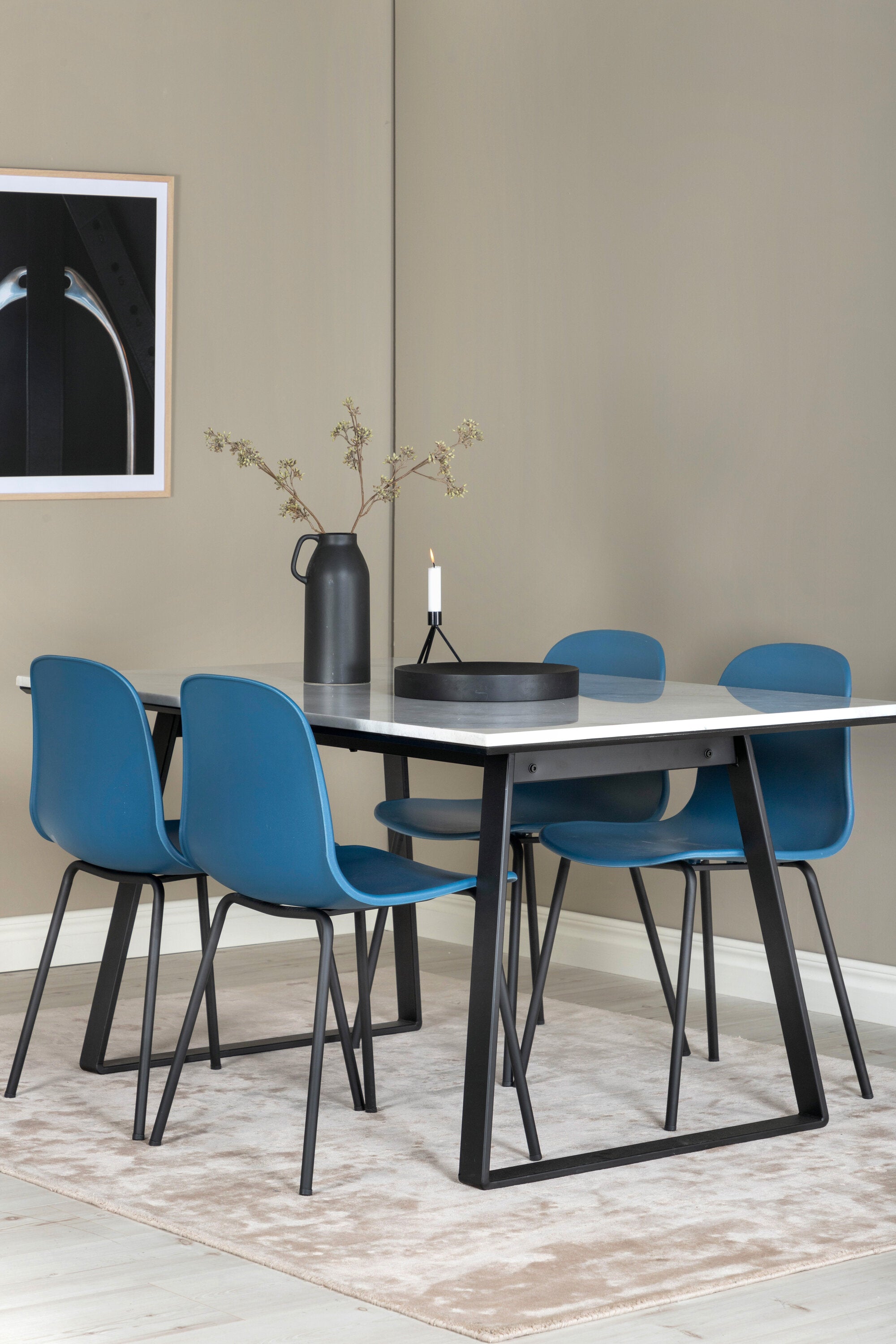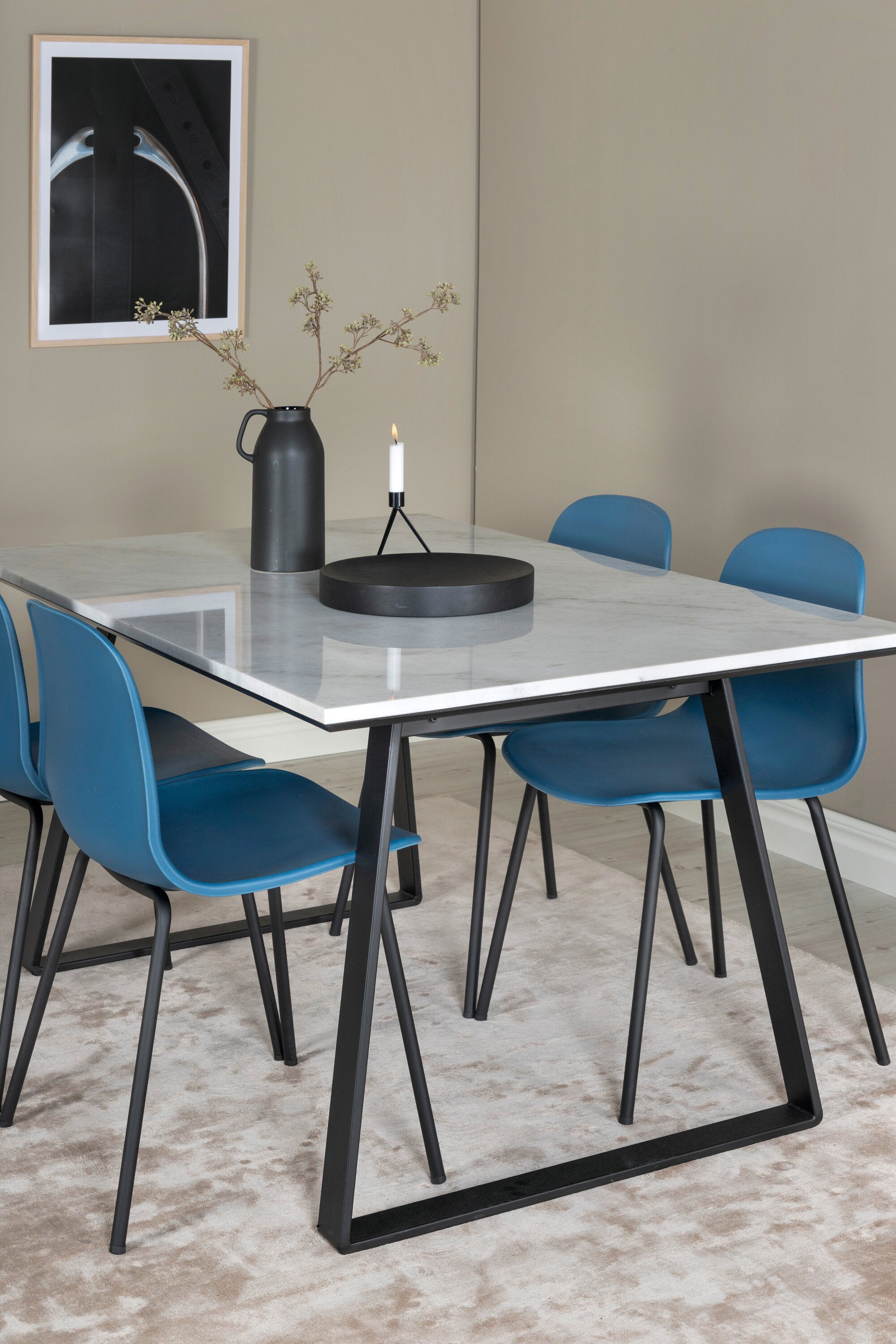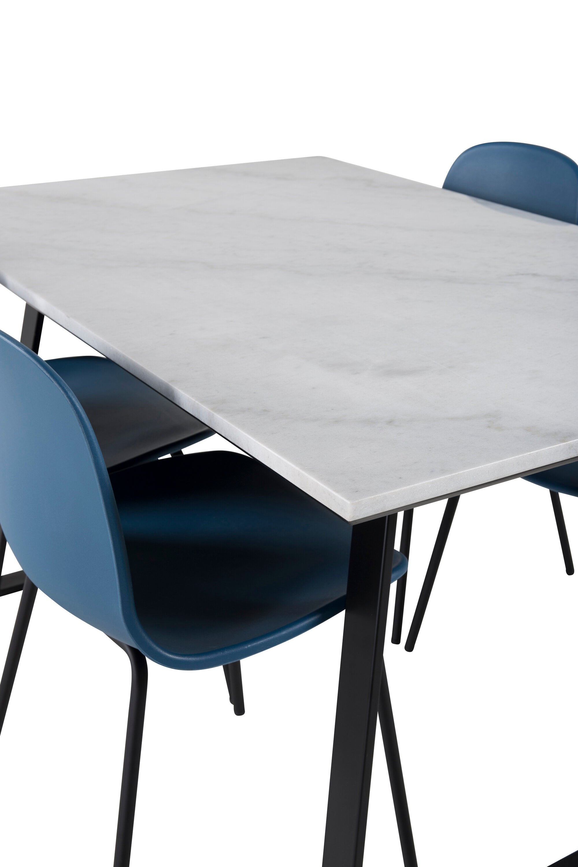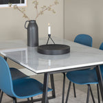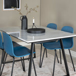 Náš krásný mramorový jídelní stůl s modrými jídelními židlemi Arctic. Dejte domovu barvu a pozvěte v budoucnu k mnoha nádherným okamžikům!