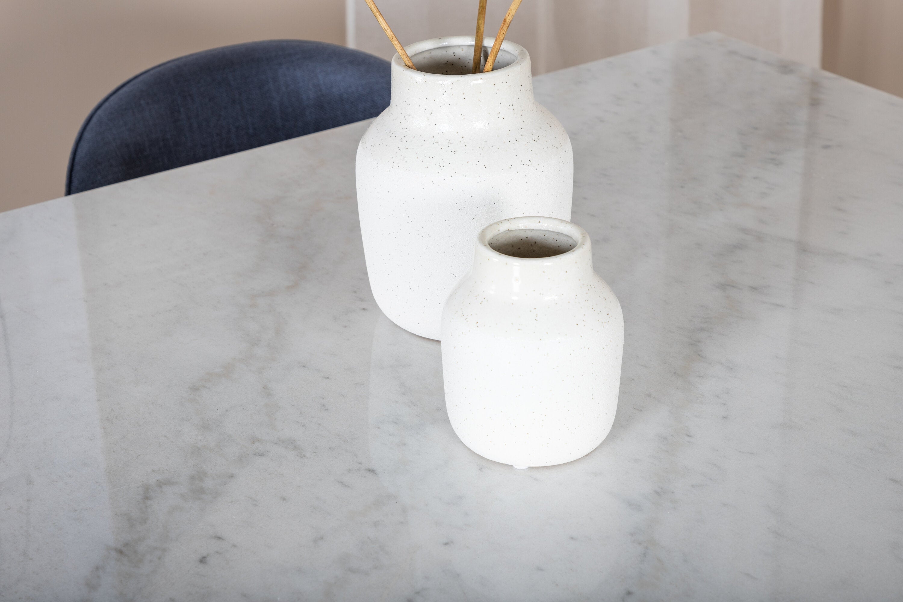 Jídelní stůl Estelle v moderním a rustikálním designu spolu s příjemnými modrými jídelními židlemi ze série Velvet. Klasický výraz skupiny potravin znamená, že se ve většině domácností hodí domů. Ať se skupina jídla stane přirozeným místem setkávání domova!