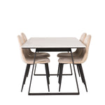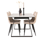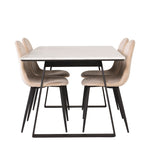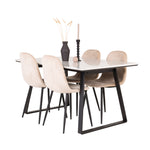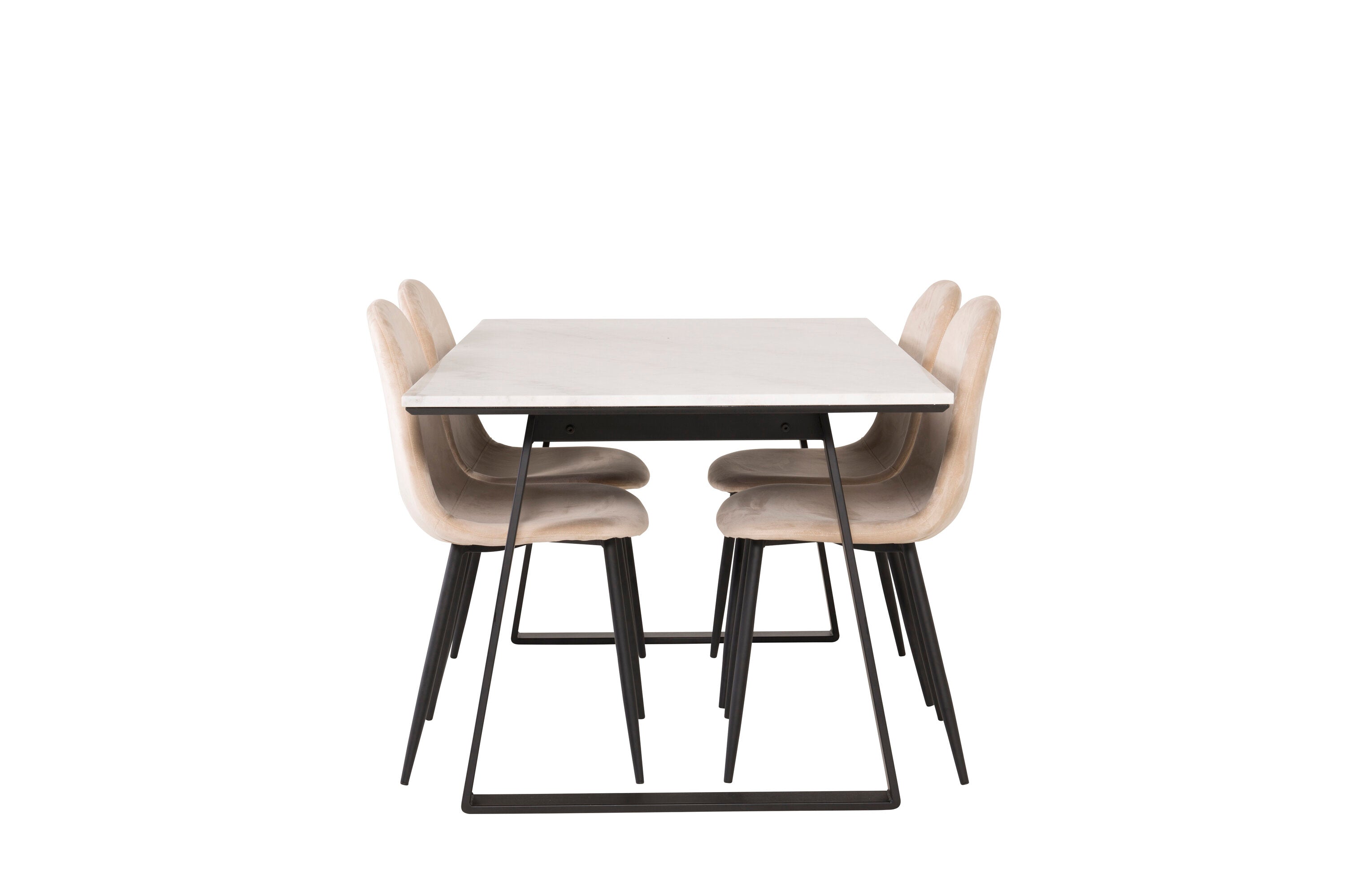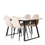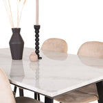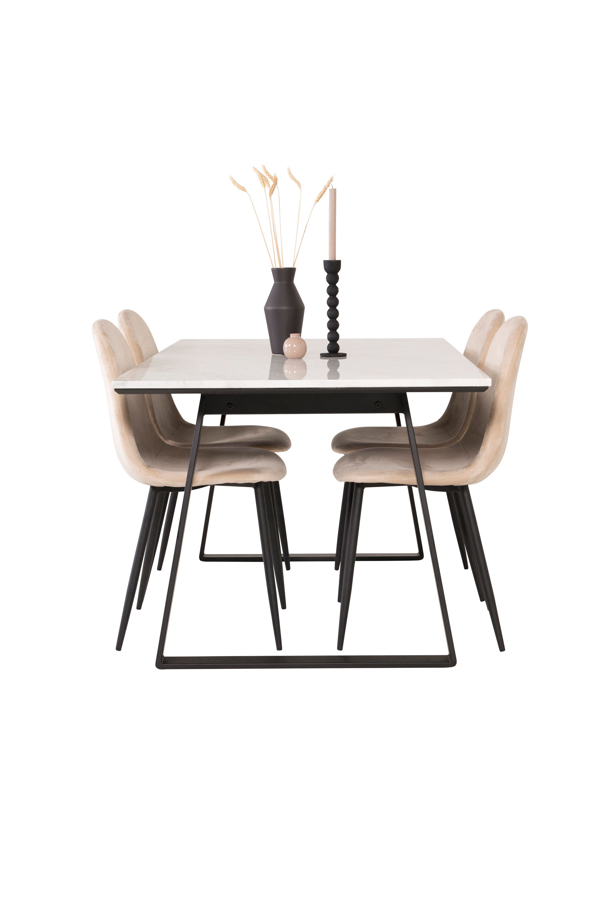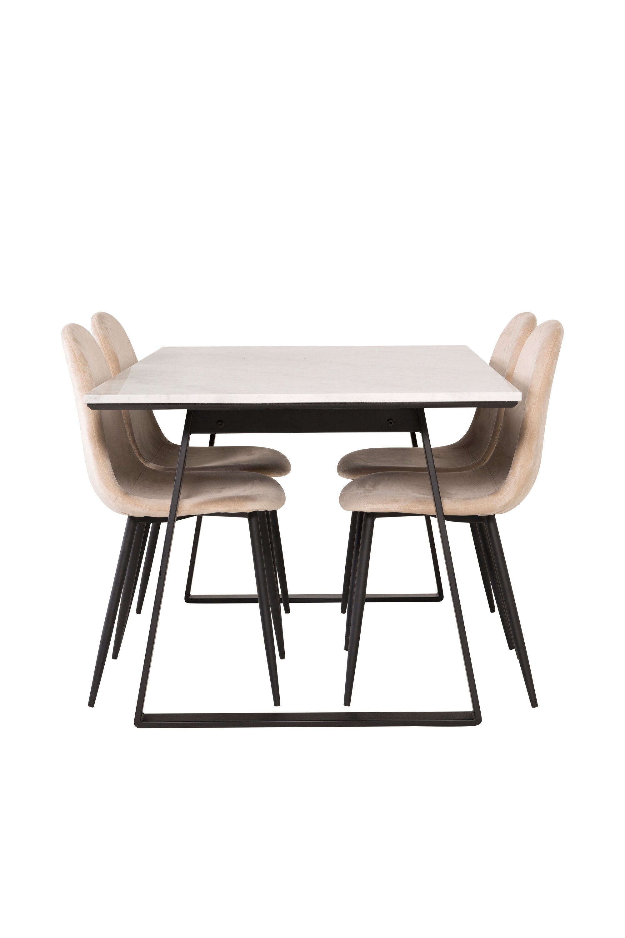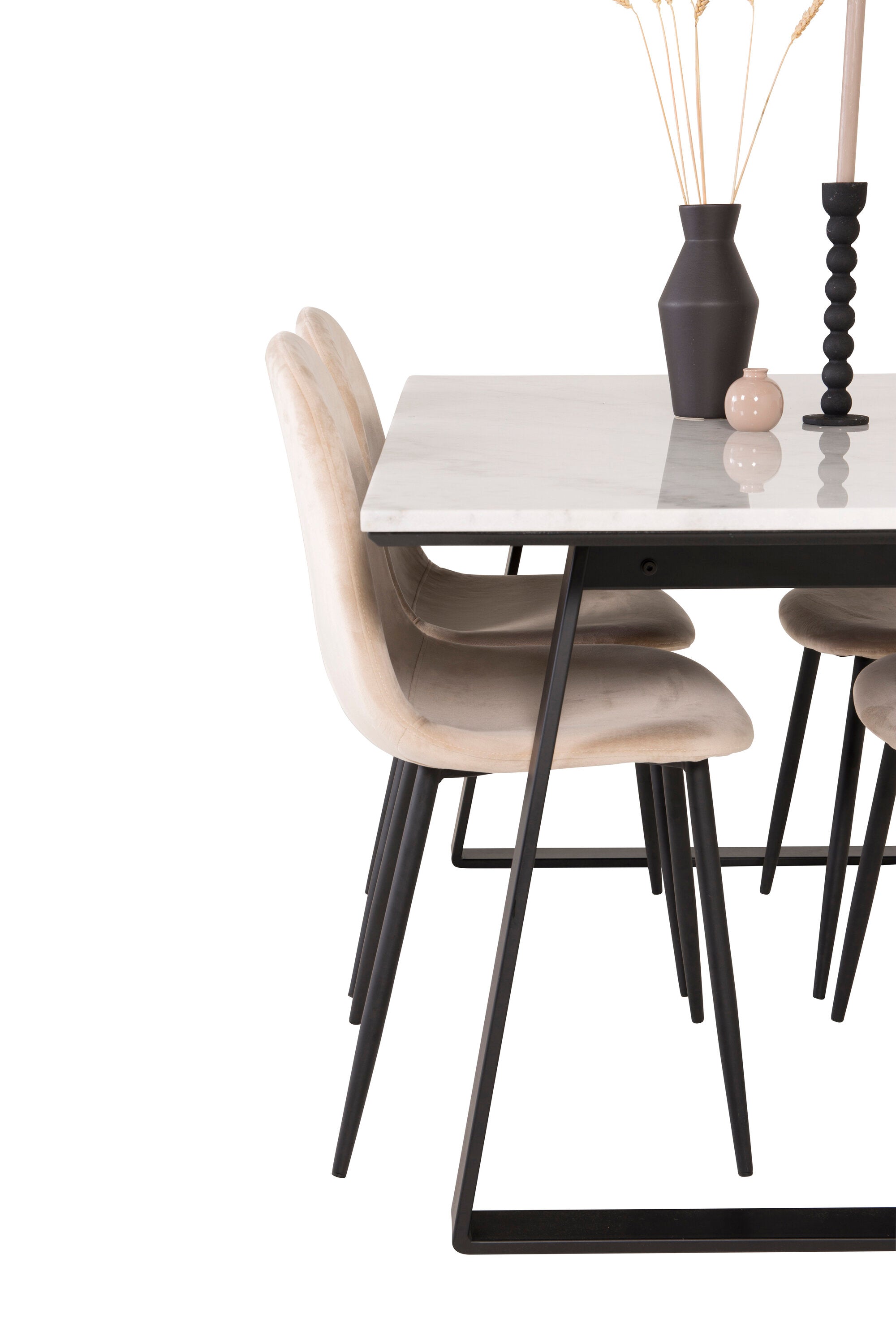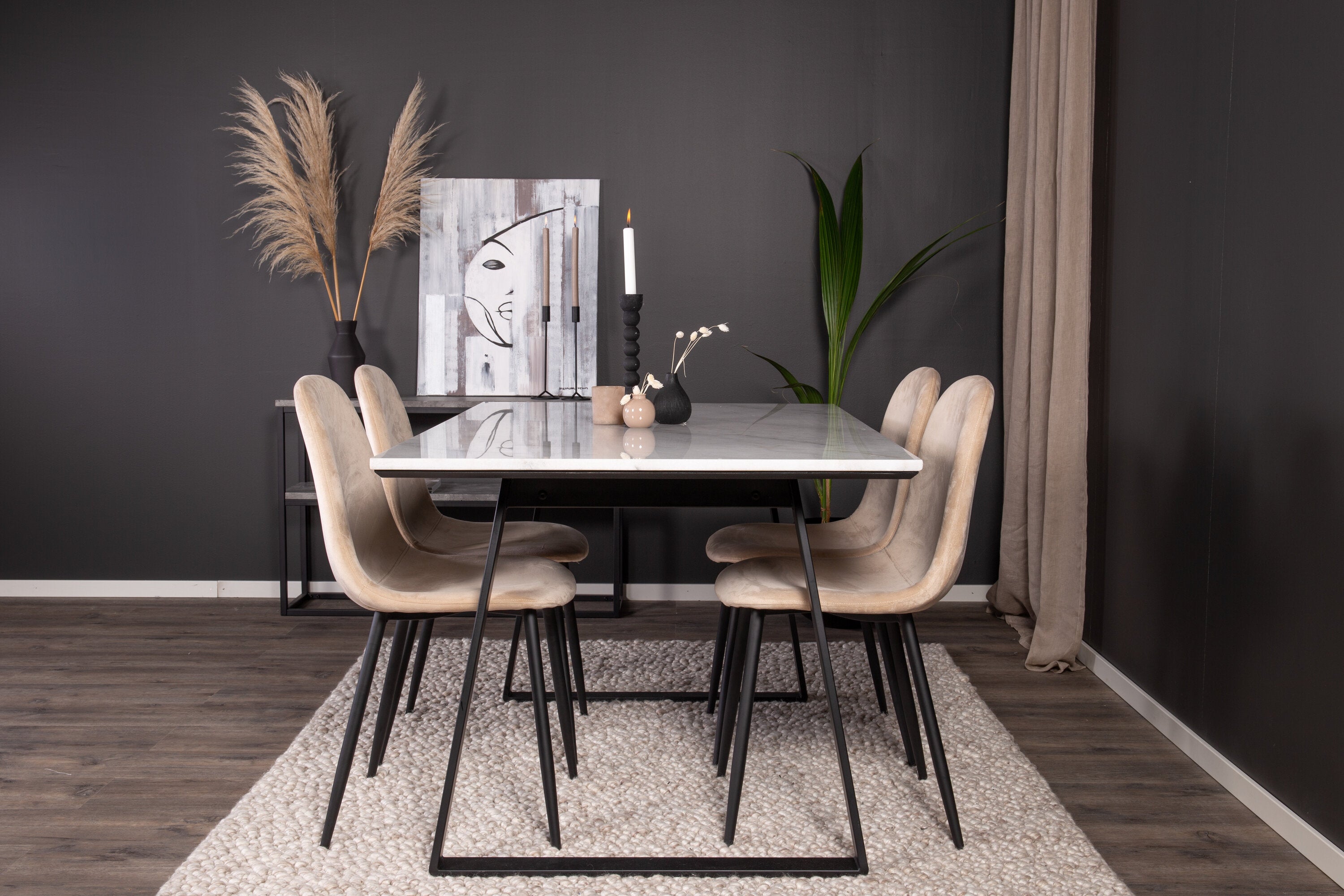Náš lahodný jídelní stůl Estelle ve stylovém mramorovém vzhledu spolu s béžovými jídelními židlemi Polar. Oblečte svou skupinu jídel nahoru nebo dolů jinou výzdobou všude kolem, která se hodí pro každodenní život i na párty!