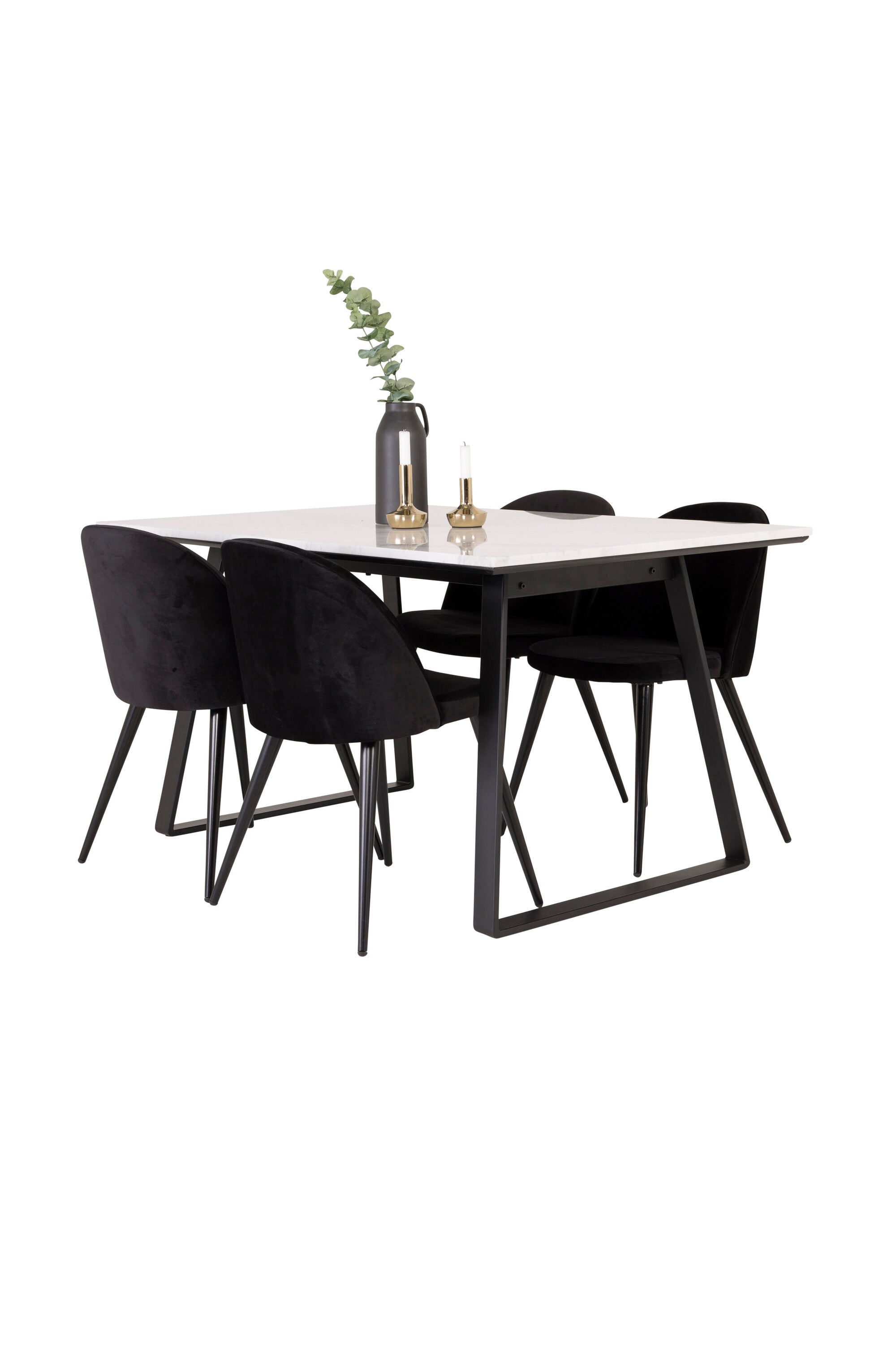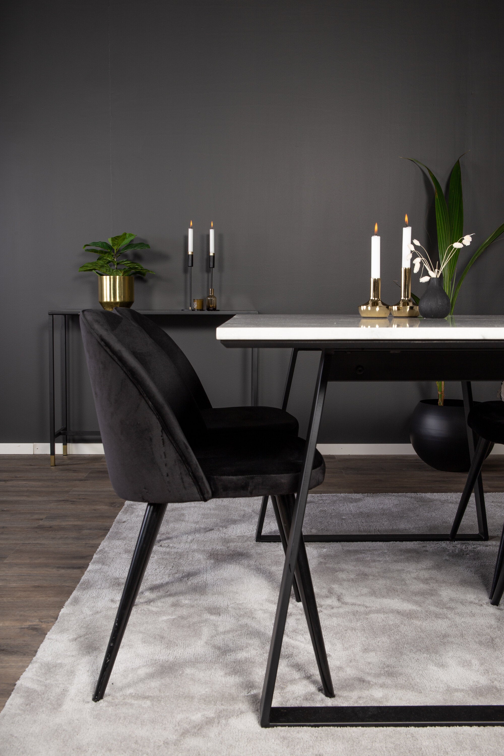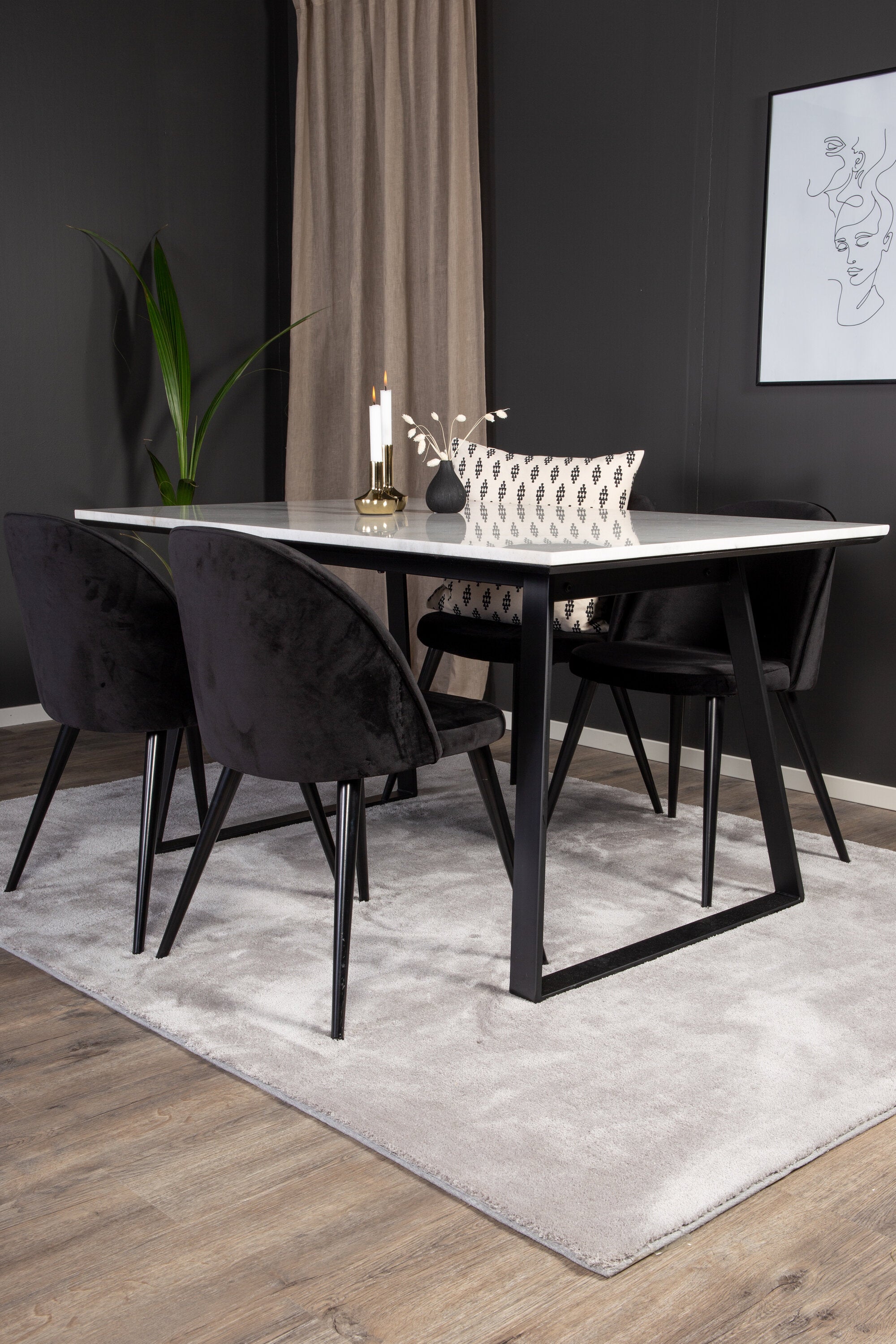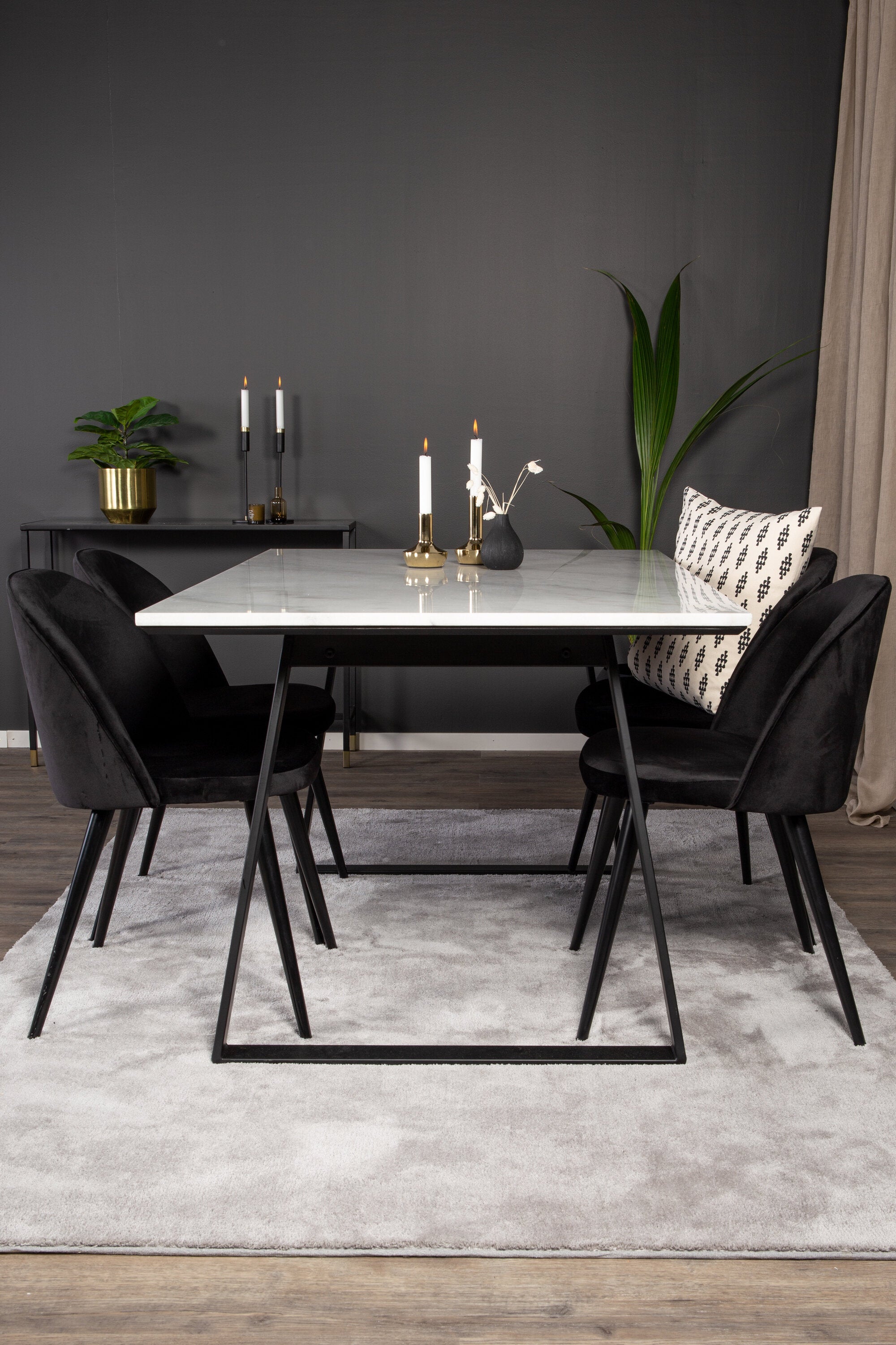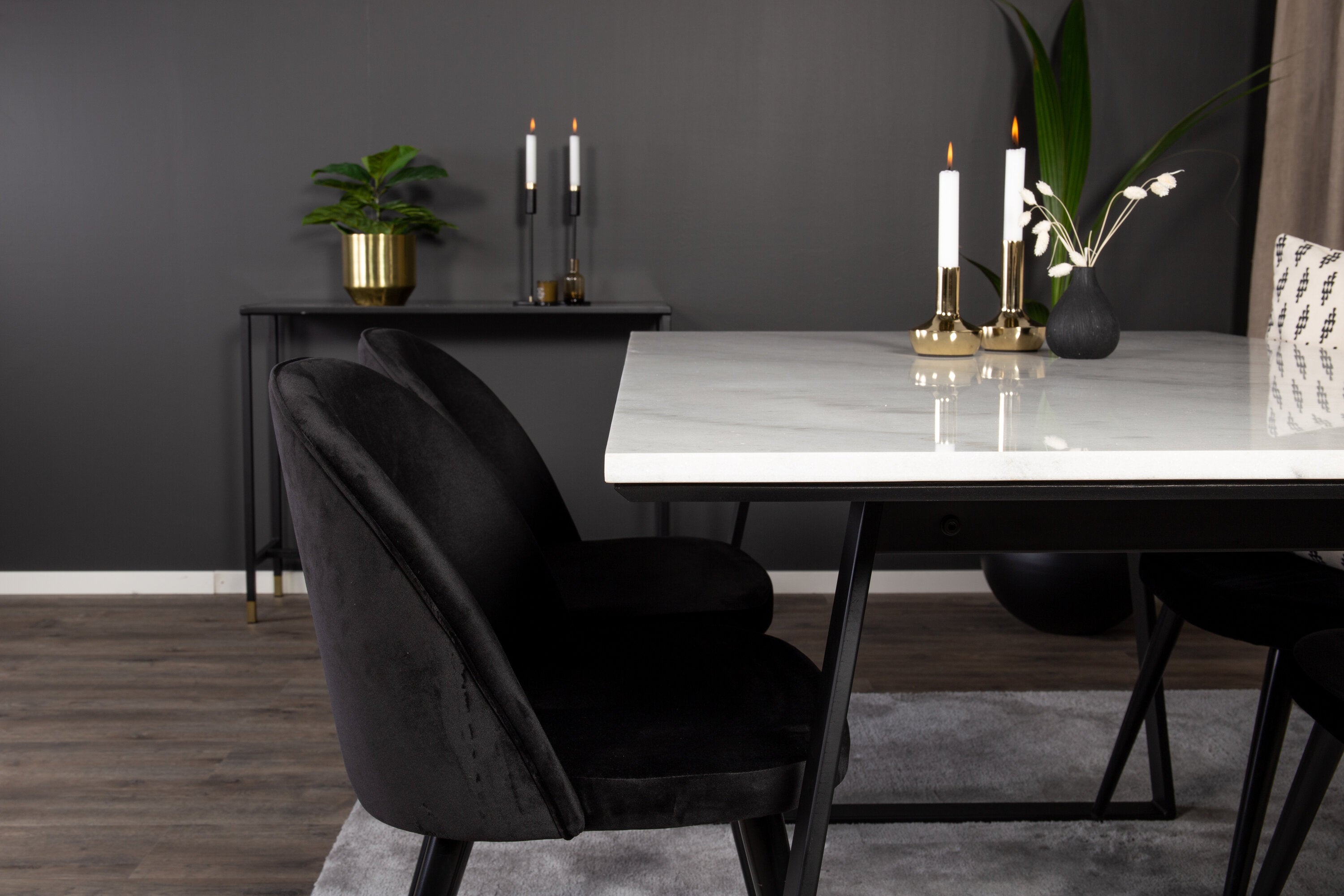Jídelní stůl Estelle ve štíhlém designu spolu s jídelními židlemi Velvet - perfektní kombinace pro ty, kteří chtějí trendy skupinu jídel. Vysoký komfort sezení křesel zve k dlouhým a úžasným chvilkám společenského života!