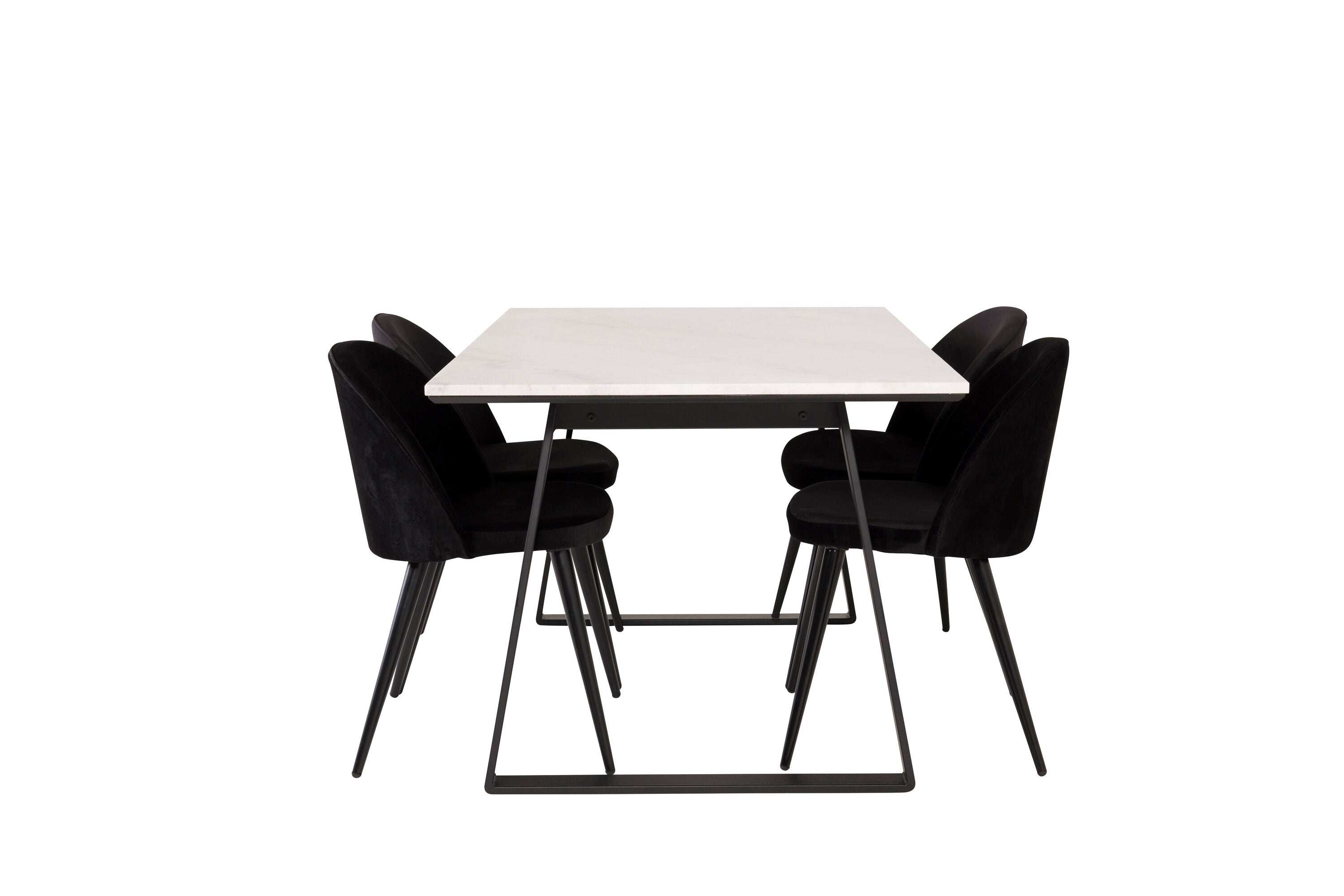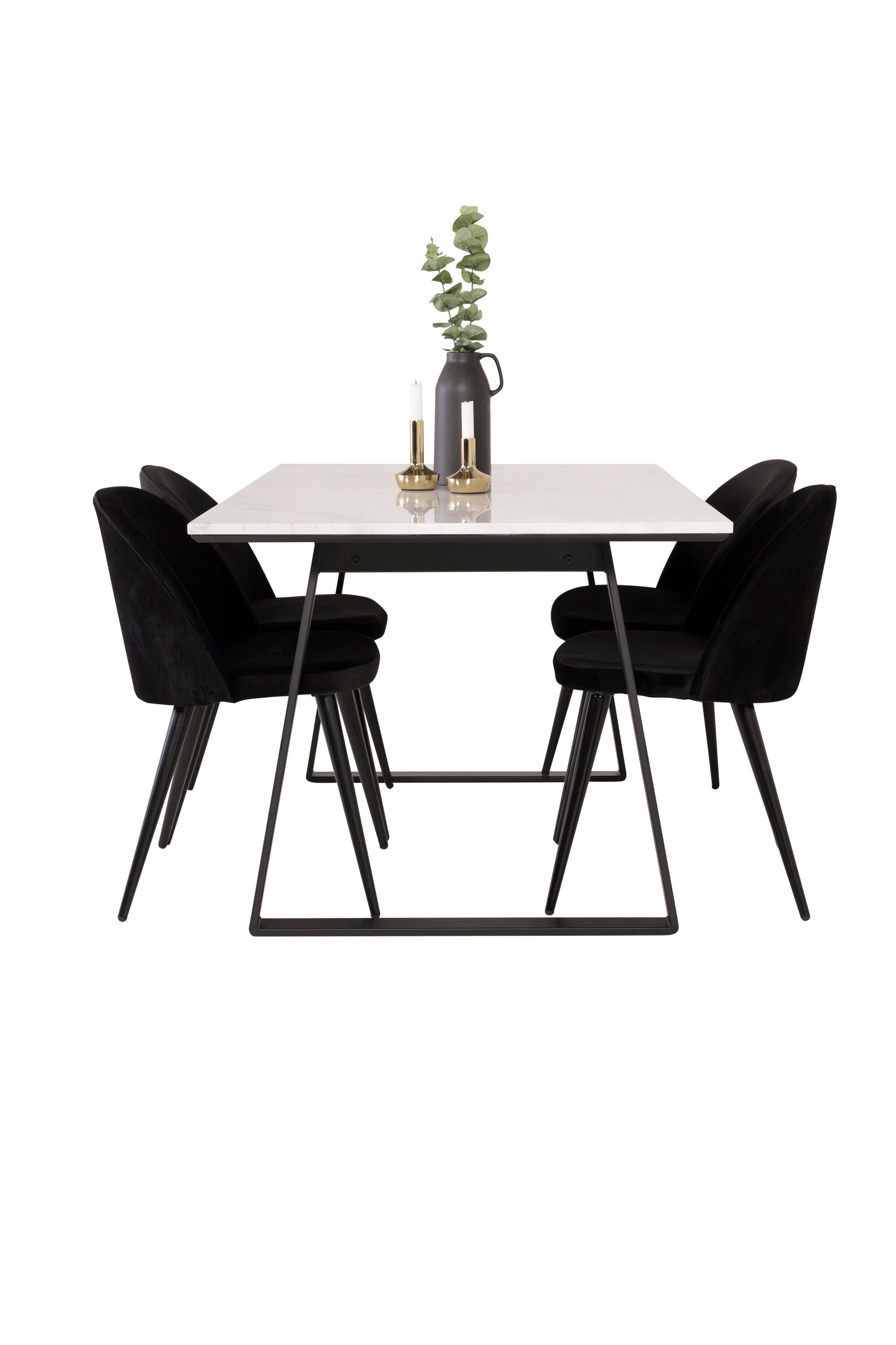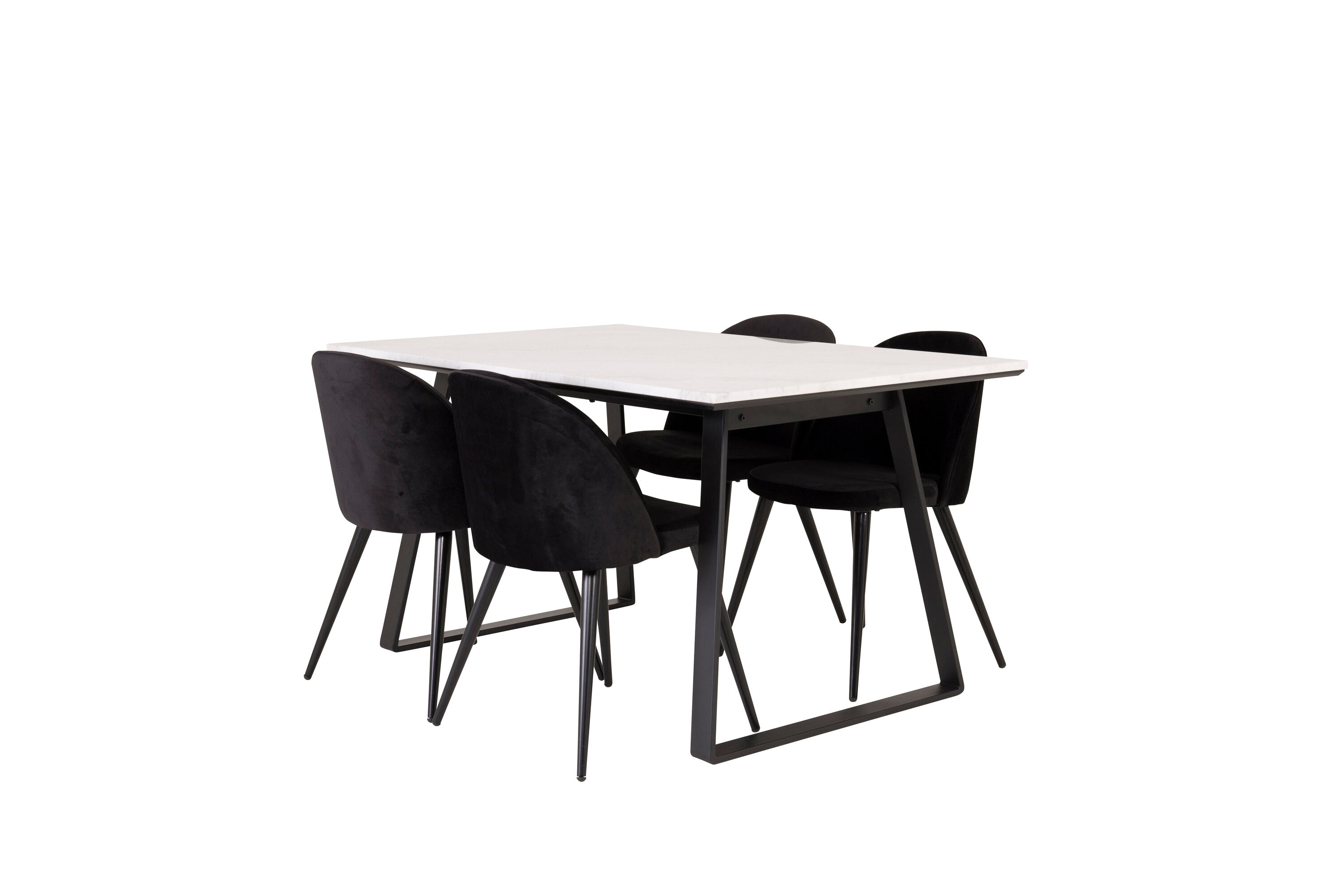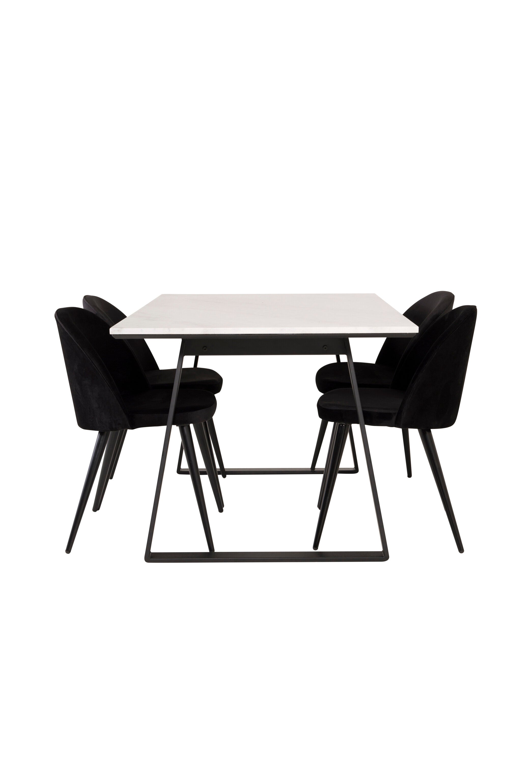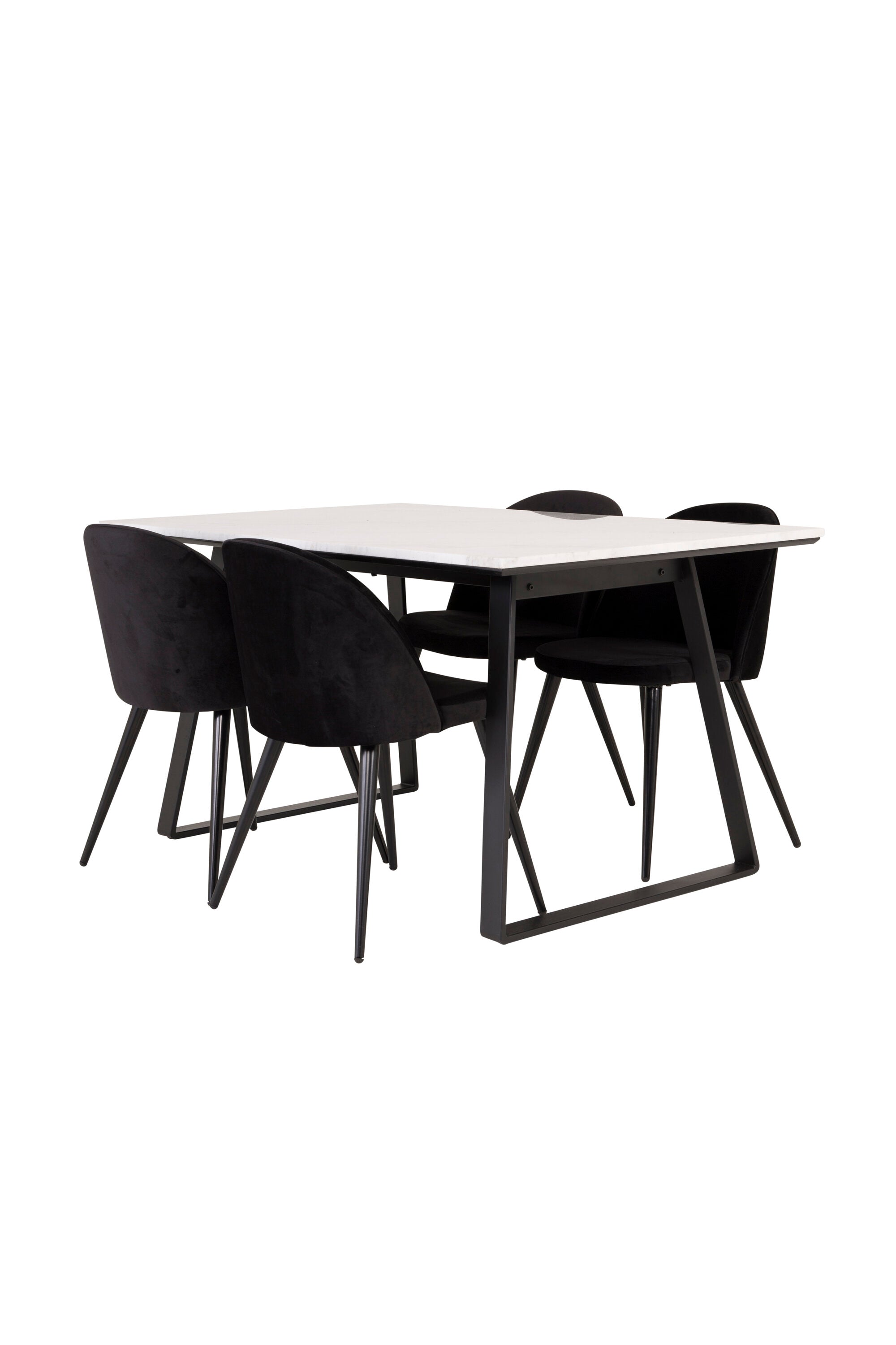 Jídelní stůl Estelle ve štíhlém designu spolu s jídelními židlemi Velvet - perfektní kombinace pro ty, kteří chtějí trendy skupinu jídel. Vysoký komfort sezení křesel zve k dlouhým a úžasným chvilkám společenského života!