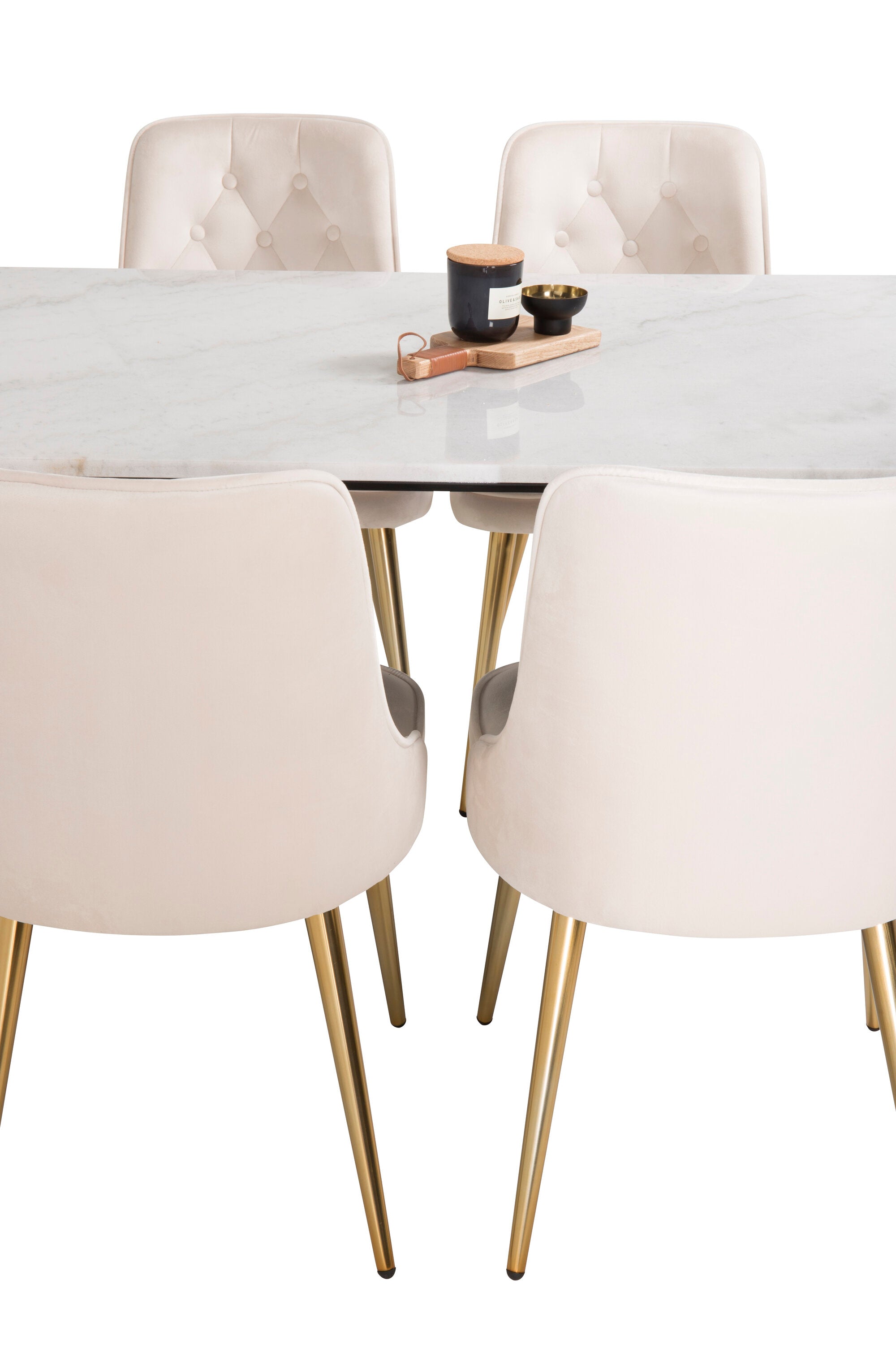 Náš krásný mramorový jídelní stůl spolu s pohodlnými jídelními židlemi ze série Velvet. Zde získáte skupinu potravin, která přímo vštěpuje luxus a eleganci. Oblečte svou skupinu jídel nahoru nebo dolů jinou výzdobou všude kolem, která se hodí pro každodenní život i na párty!