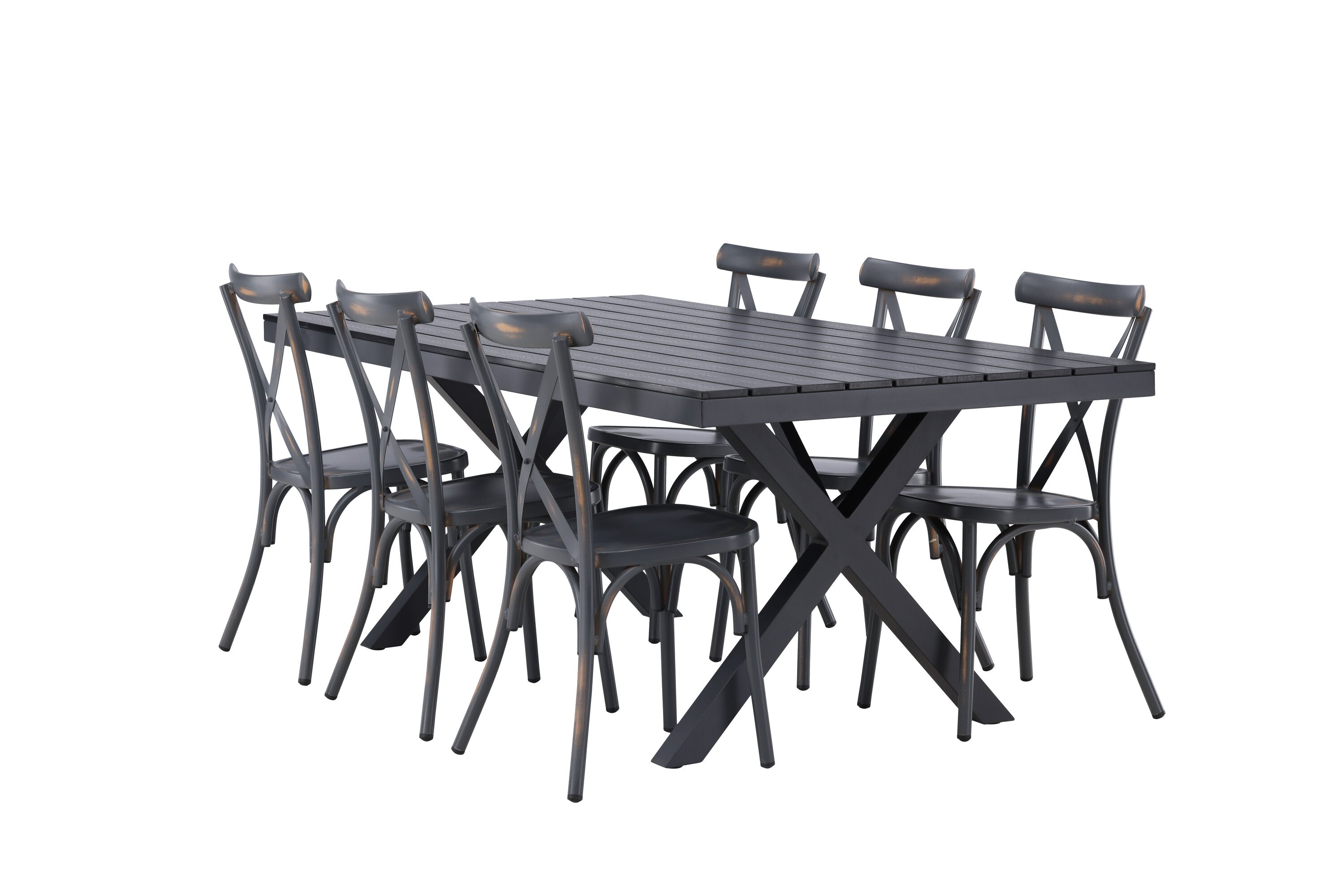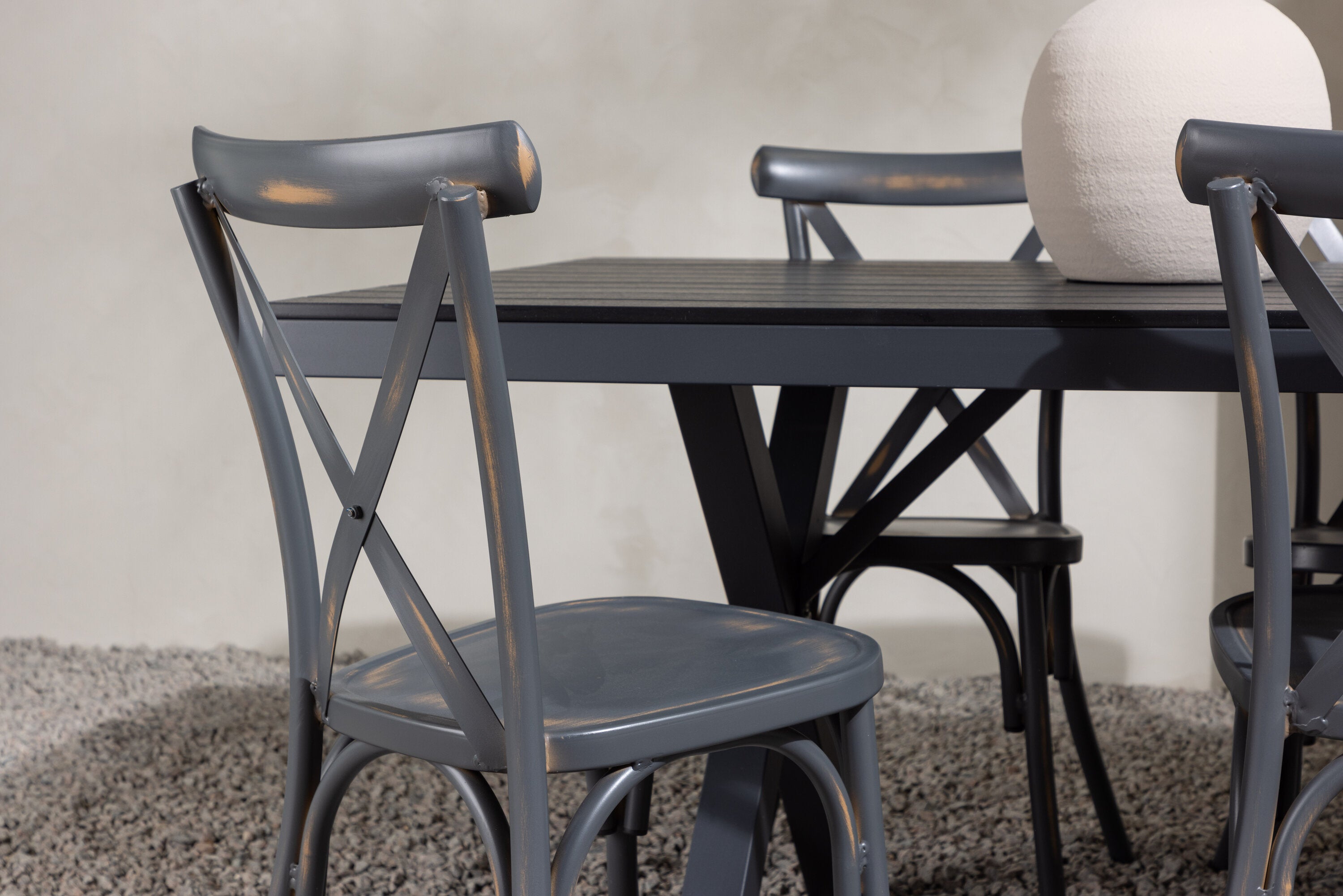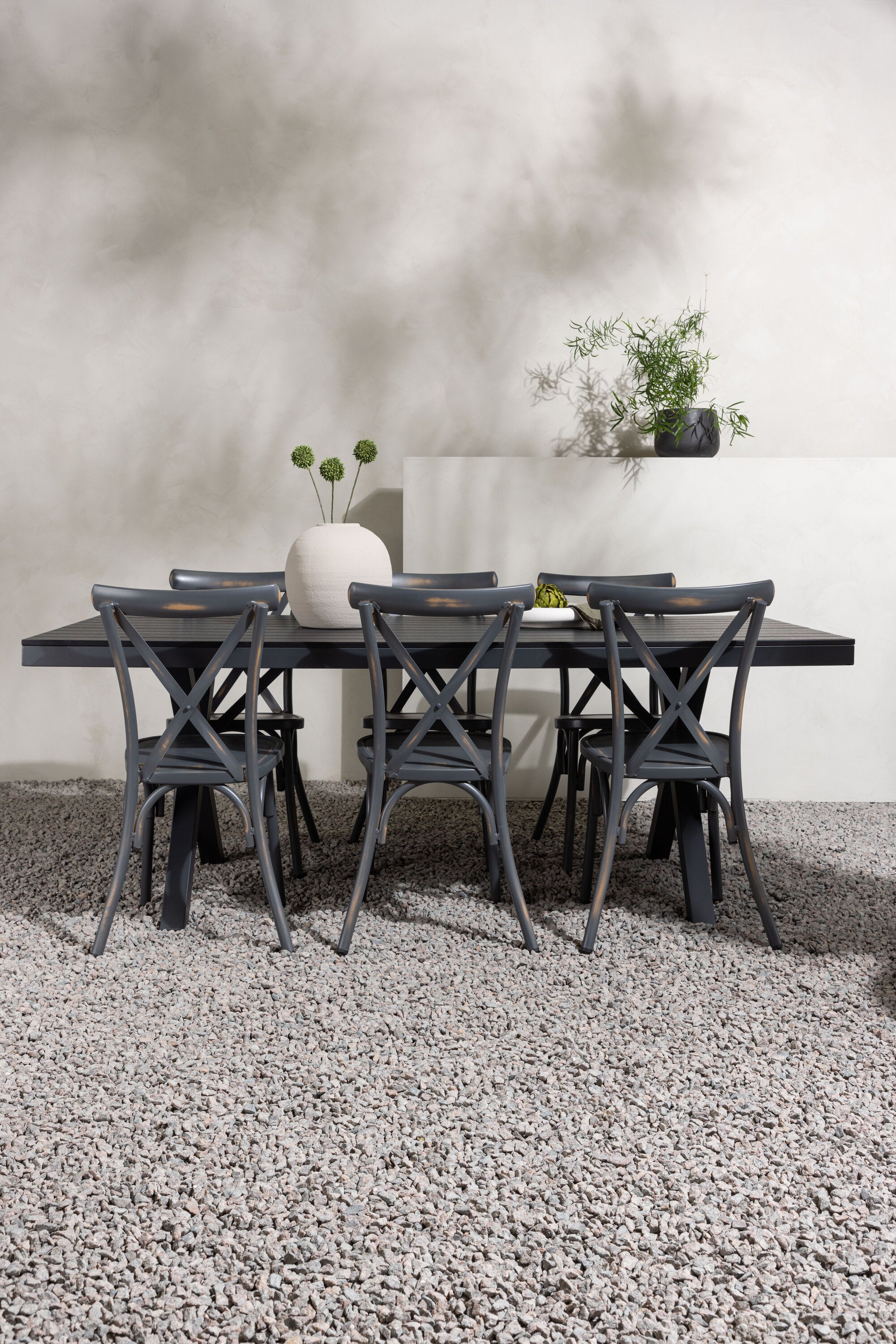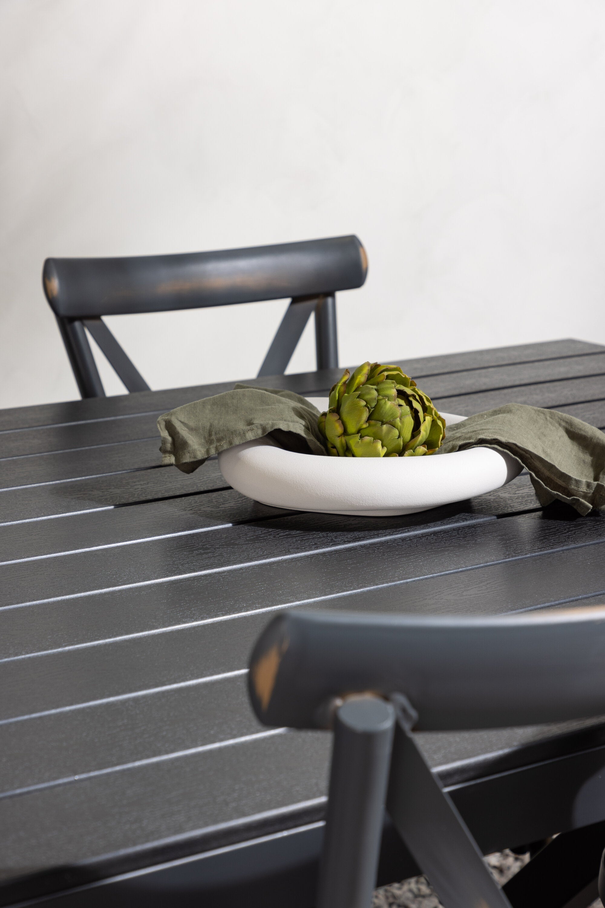Elegantní černá jídelní sestava ve skandinávském designu – ideální pro vaši terasu! Náš obdélníkový jídelní stůl Garcia má klasický design s deskou stolu v černém aintwood a zkříženými nohami stolu v černém hliníku. Zde v kombinaci s našimi moderními jídelními židlemi ze série Tablas. Židle má industriální styl a je vyrobena z odolného hliníku v ušpiněné černé barvě. Vytvořte poutač, který udělá dojem na vaše blízké, a pohodlně se v létě usaďte! Rozměry stolu: 200 x 100 cm.