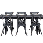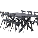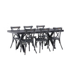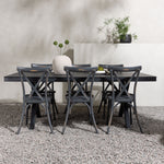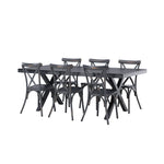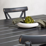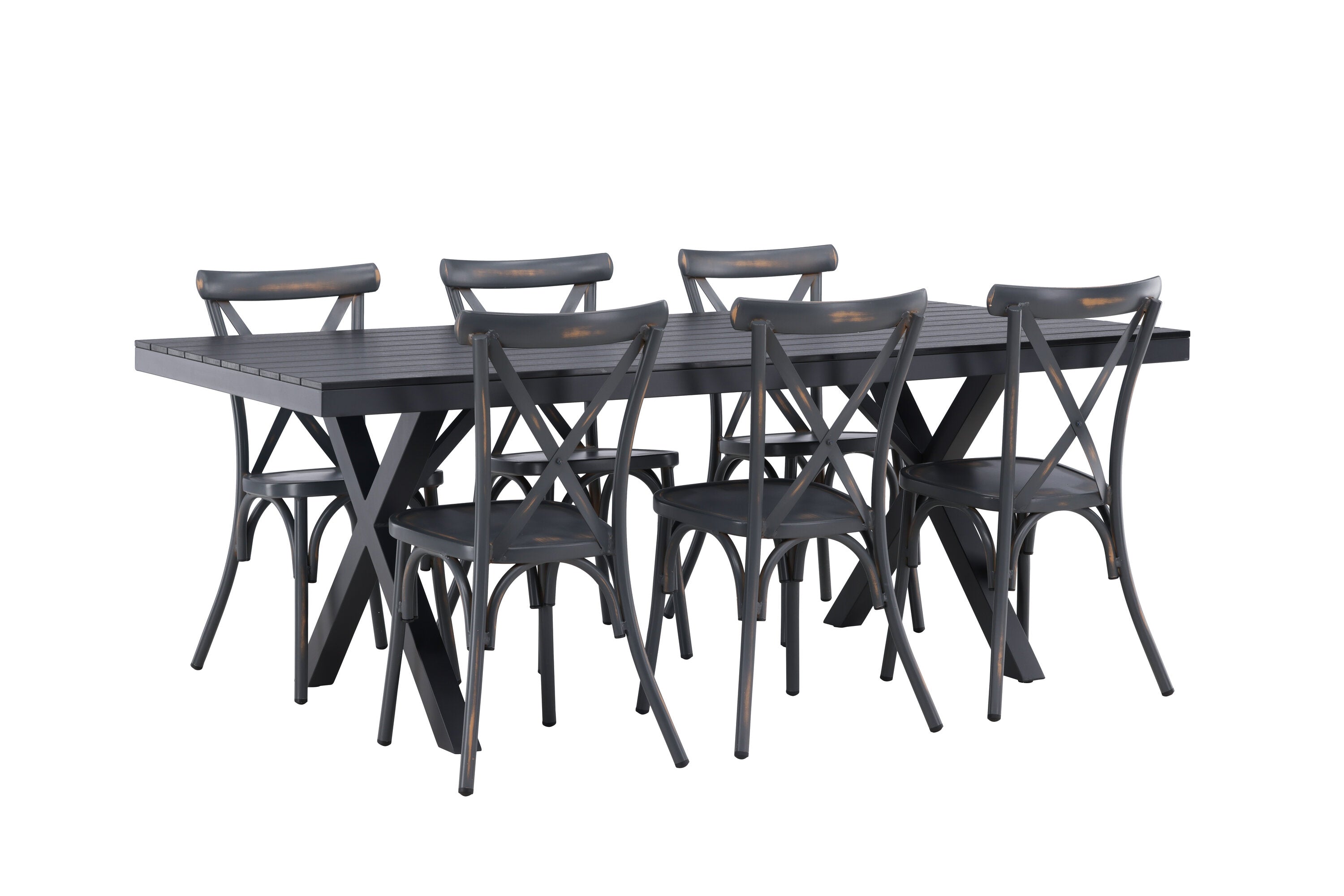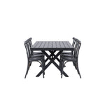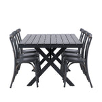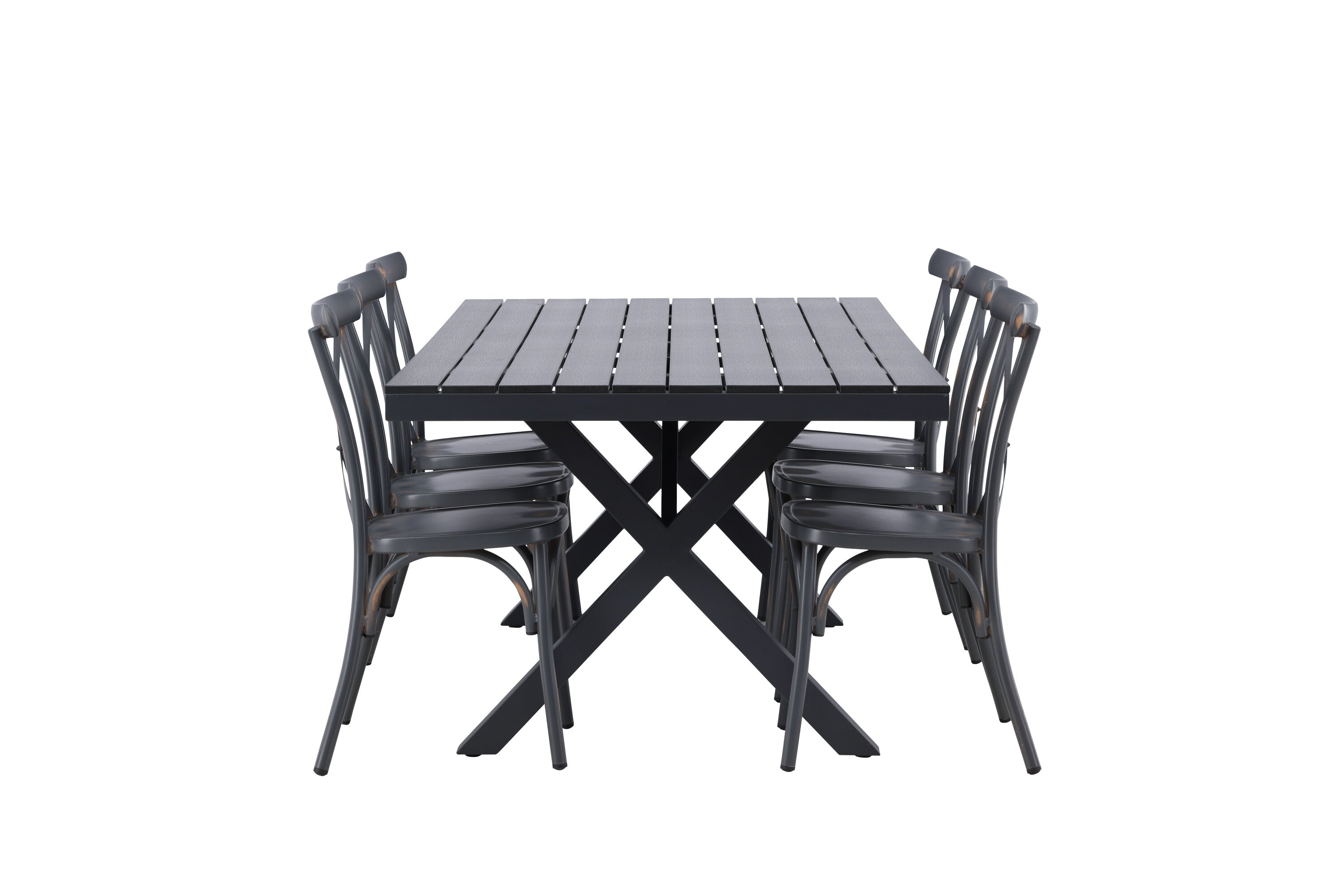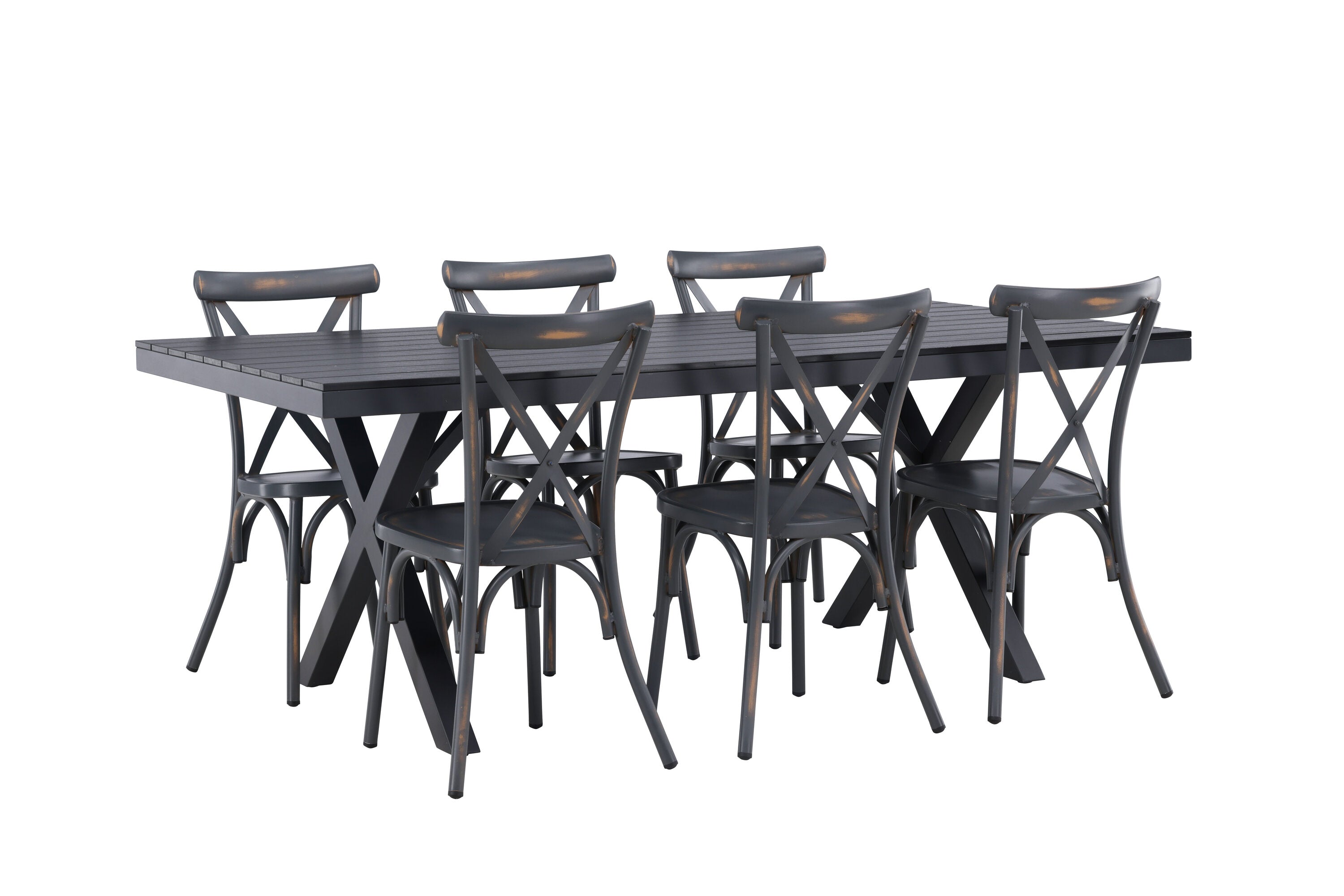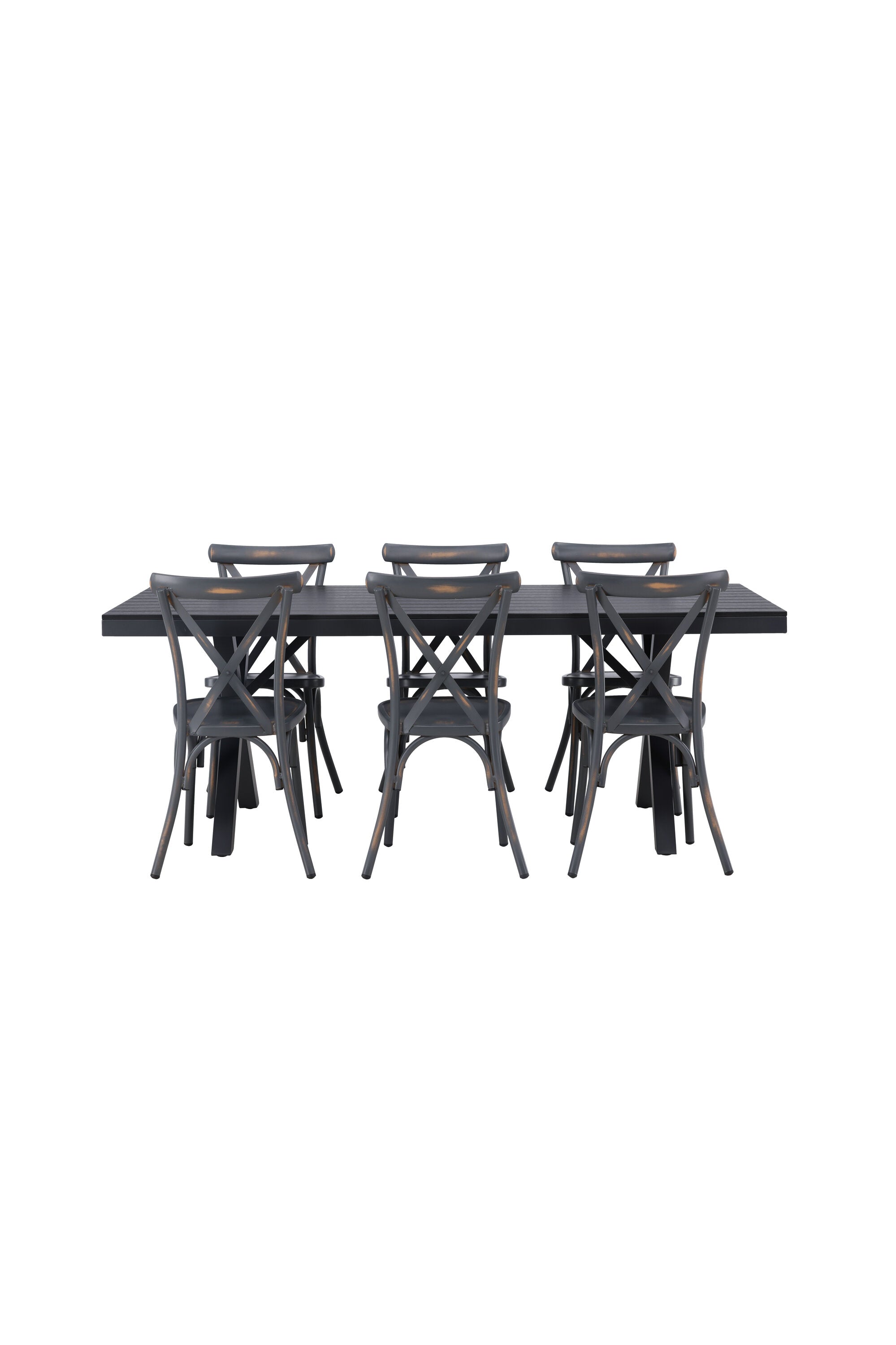 Elegantní černá jídelní sestava ve skandinávském designu – ideální pro vaši terasu! Náš obdélníkový jídelní stůl Garcia má klasický design s deskou stolu v černém aintwood a zkříženými nohami stolu v černém hliníku. Zde v kombinaci s našimi moderními jídelními židlemi ze série Tablas. Židle má industriální styl a je vyrobena z odolného hliníku v ušpiněné černé barvě. Vytvořte poutač, který udělá dojem na vaše blízké, a pohodlně se v létě usaďte! Rozměry stolu: 200 x 100 cm.