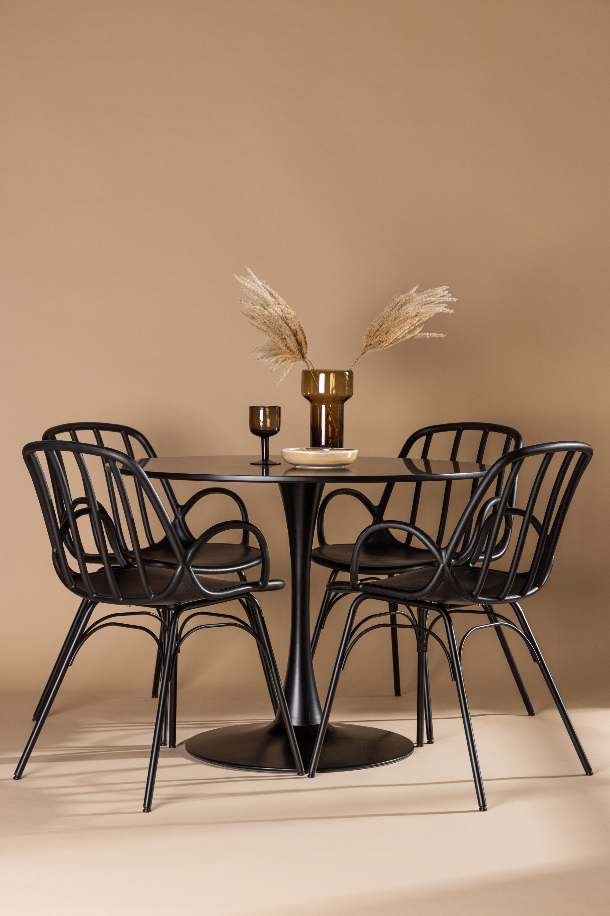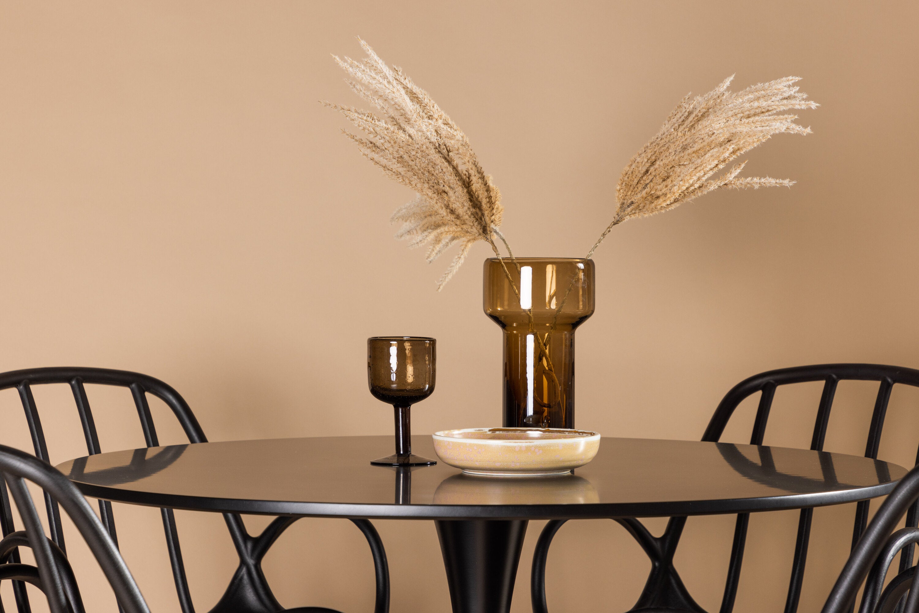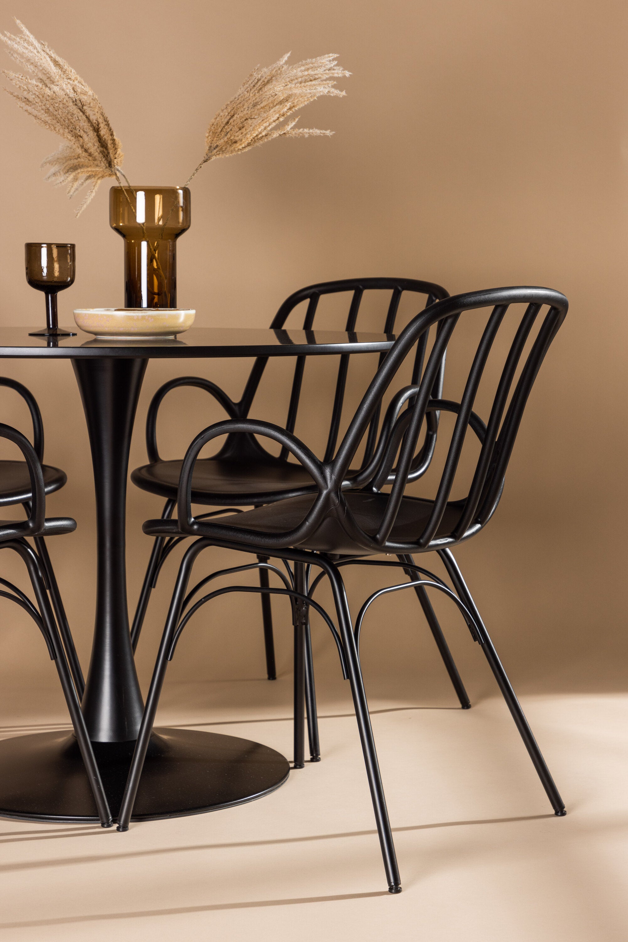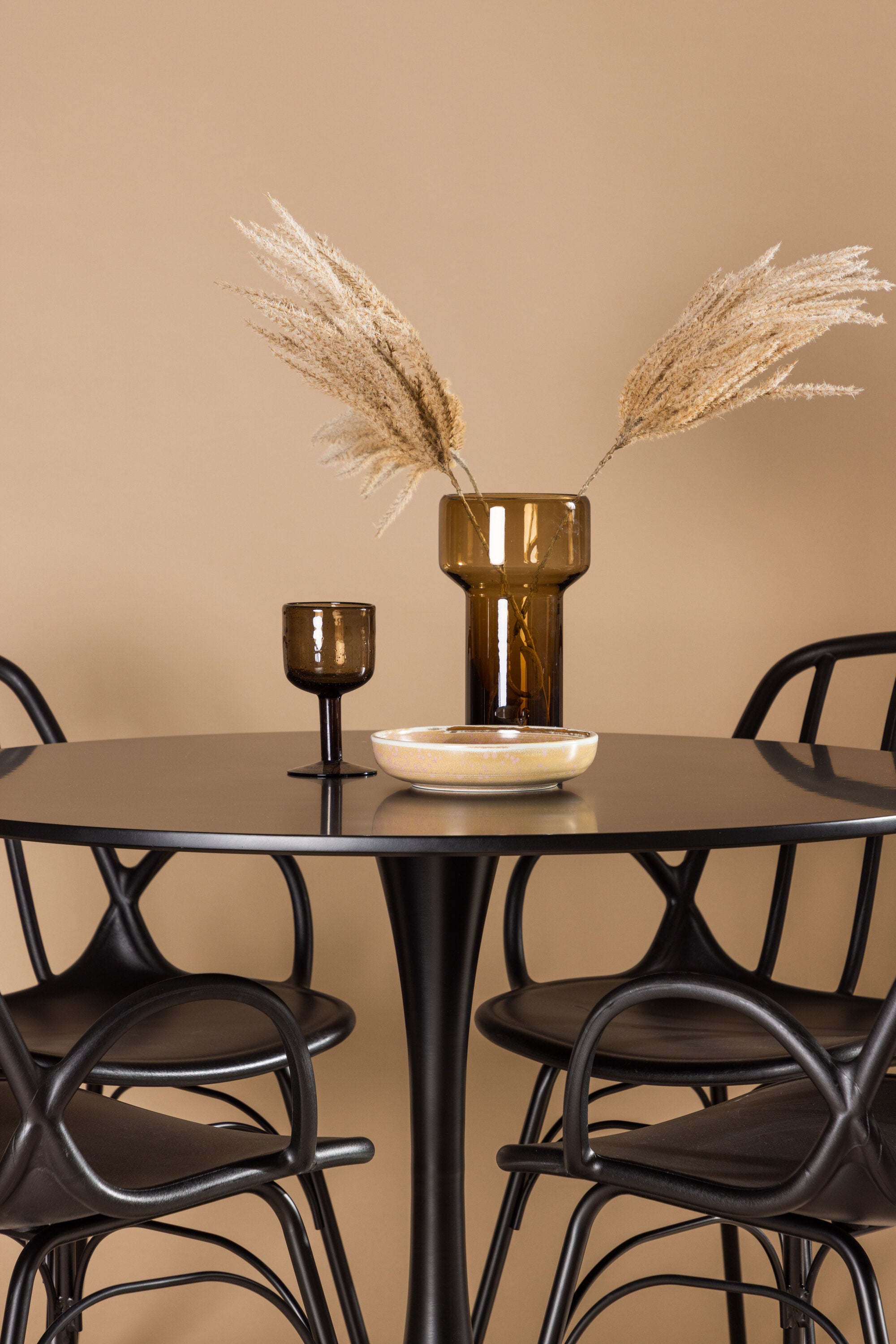 Vytvořte si u vás doma módní atmosféru! Jídelní stůl Glade má stylový skandinávský design se štíhlou trumpetovou nohou z černé oceli a černou desku stolu z MDF. Zde společně s promyšlenou jídelní židlí ze série Dyrön. Židle je stylová i praktická, vyrobena z černého plastu a oceli. Sedák má integrované područky a žebrovaný design v mírně zaoblené zadní části. Nohy židle jsou stylově úzké a mírně rozšířené ve skandinávském designu. Ať je čas zde příjemný a pohodlný! Rozměry stolu: 100 cm.