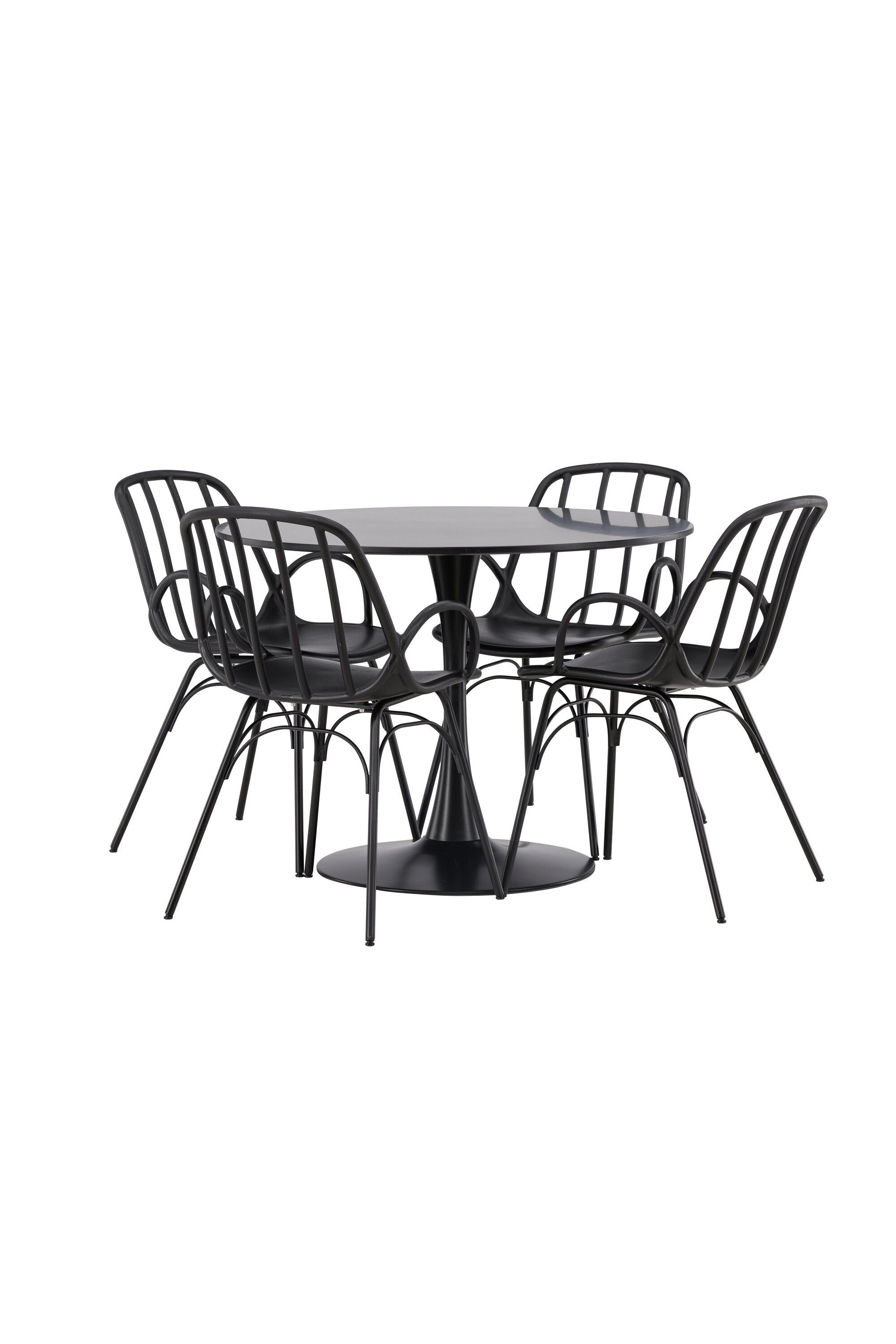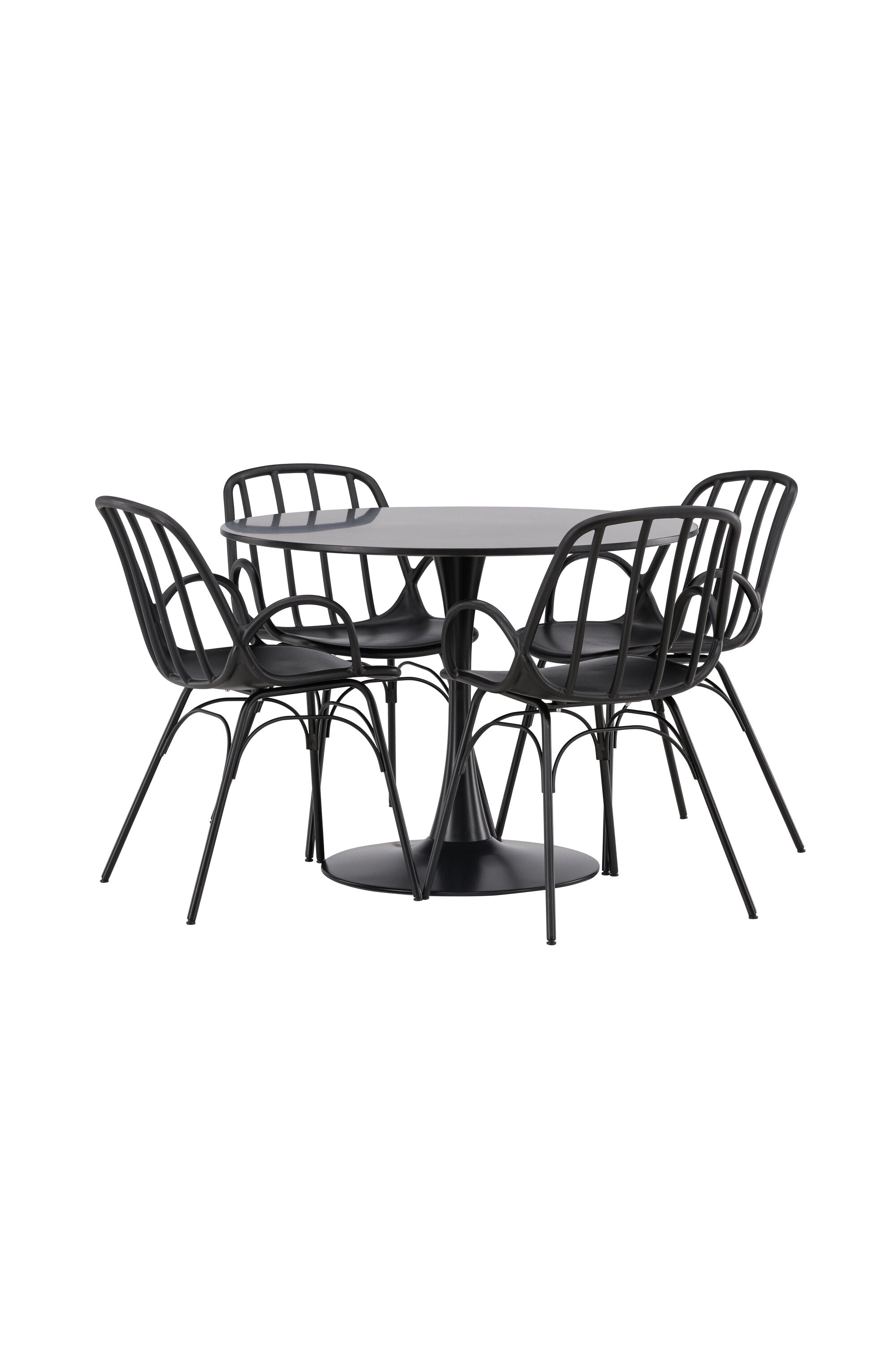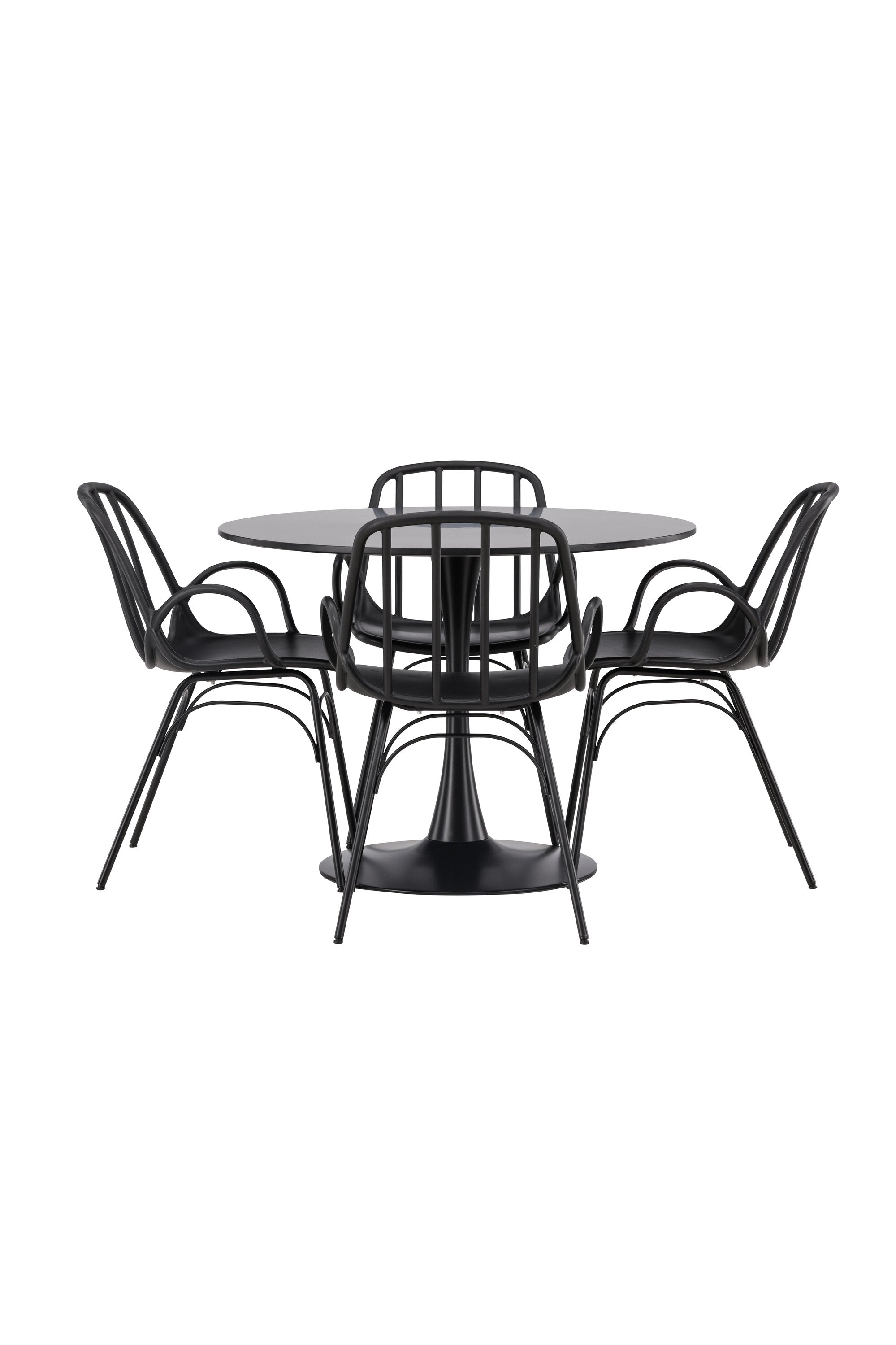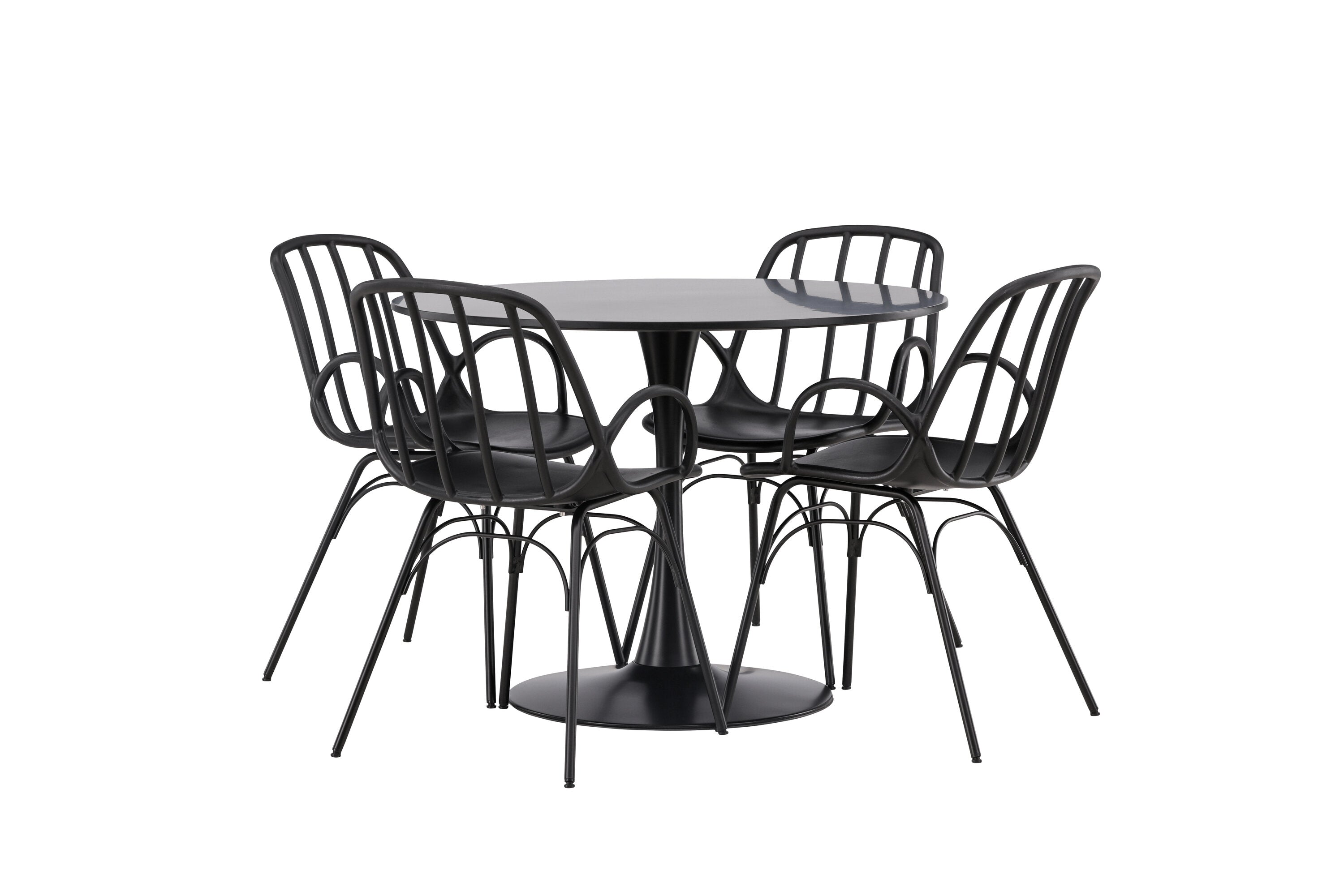 Vytvořte si u vás doma módní atmosféru! Jídelní stůl Glade má stylový skandinávský design se štíhlou trumpetovou nohou z černé oceli a černou desku stolu z MDF. Zde společně s promyšlenou jídelní židlí ze série Dyrön. Židle je stylová i praktická, vyrobena z černého plastu a oceli. Sedák má integrované područky a žebrovaný design v mírně zaoblené zadní části. Nohy židle jsou stylově úzké a mírně rozšířené ve skandinávském designu. Ať je čas zde příjemný a pohodlný! Rozměry stolu: 100 cm.
