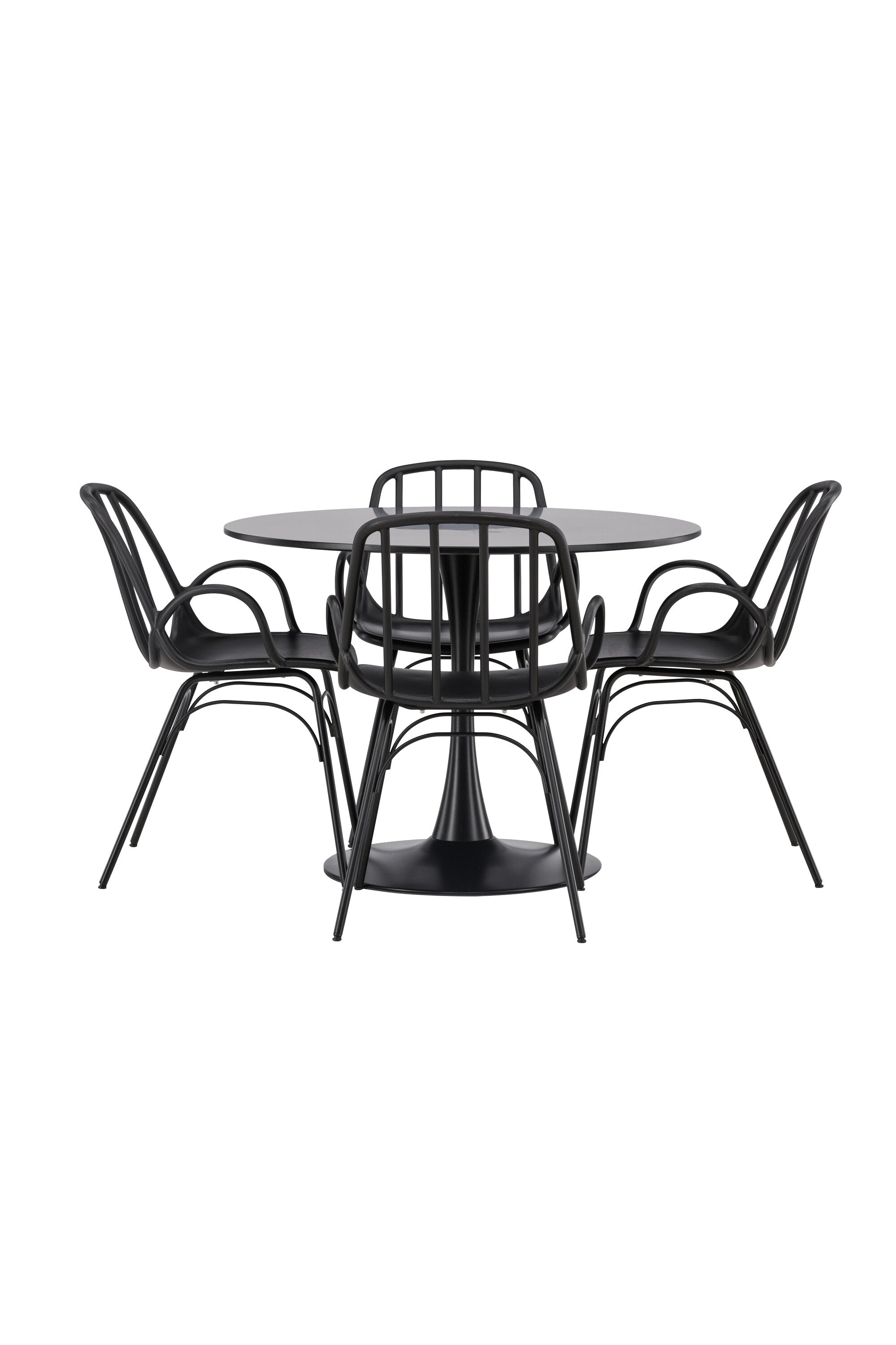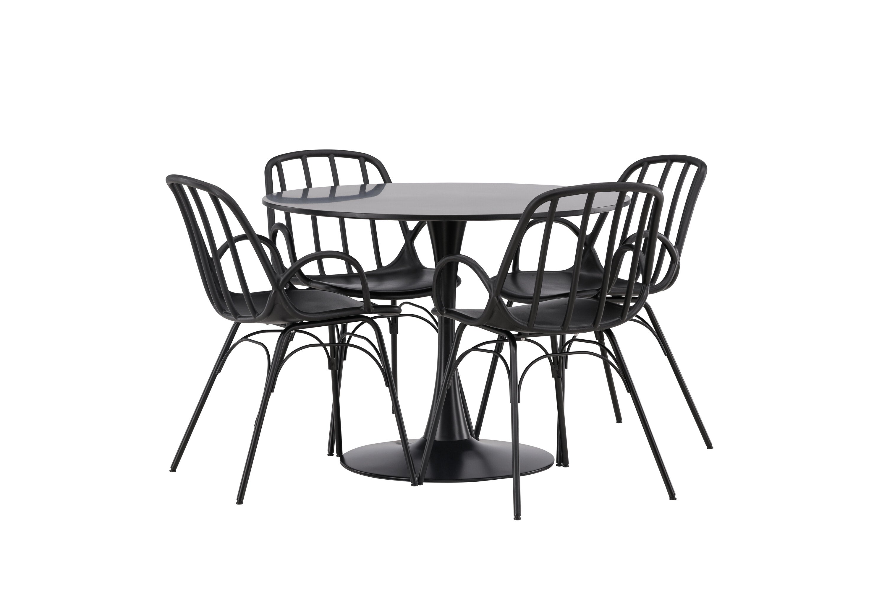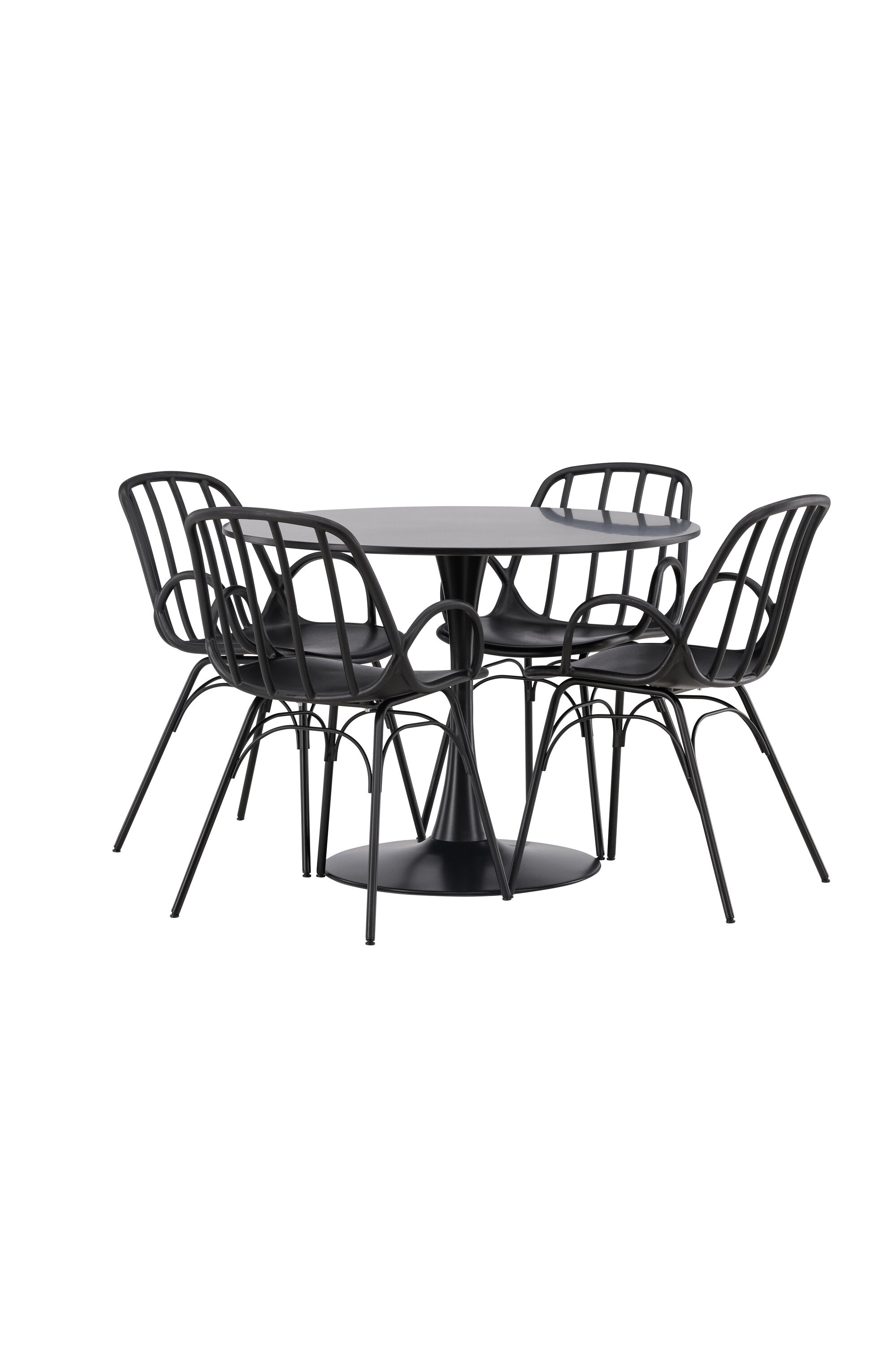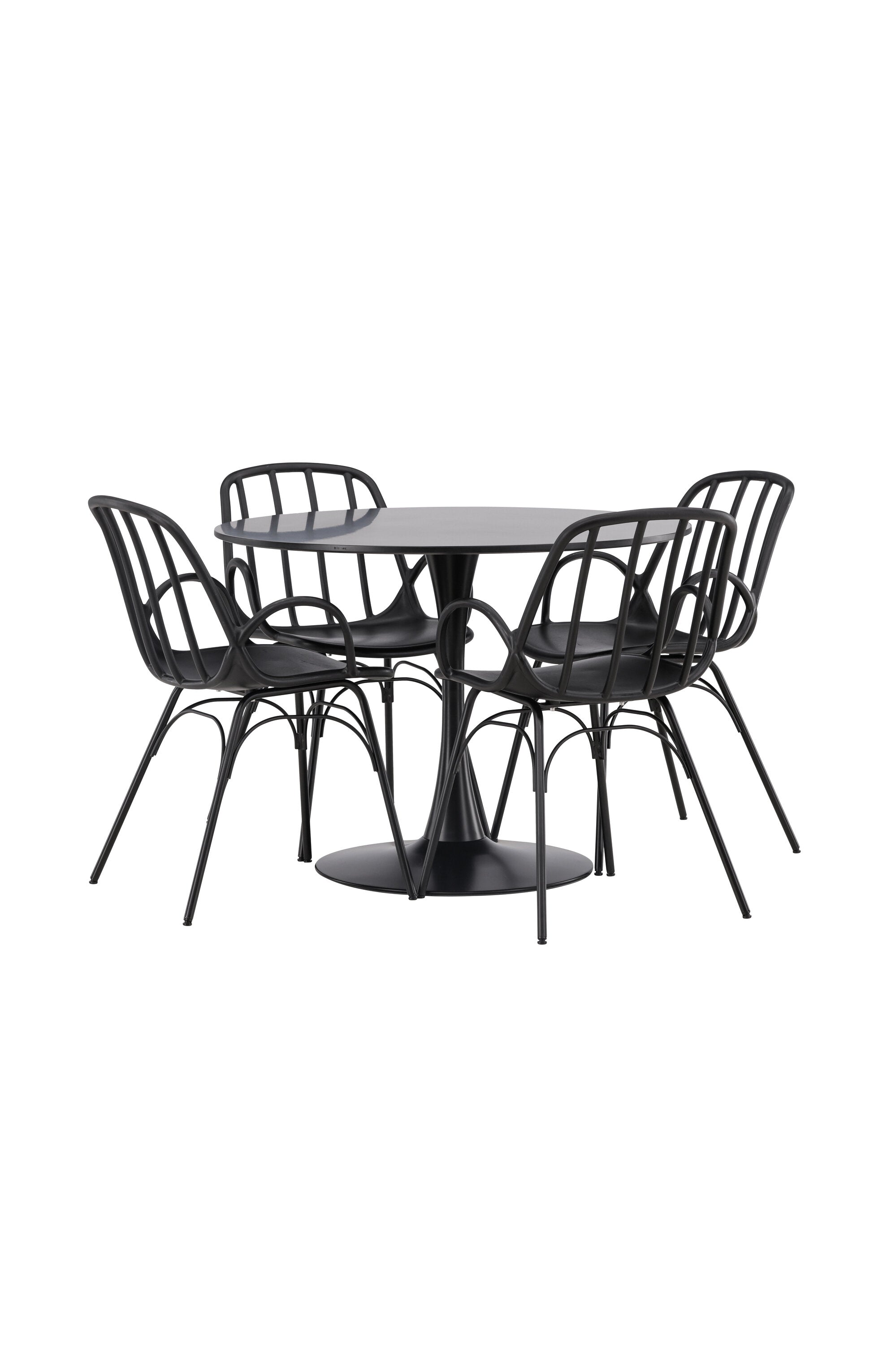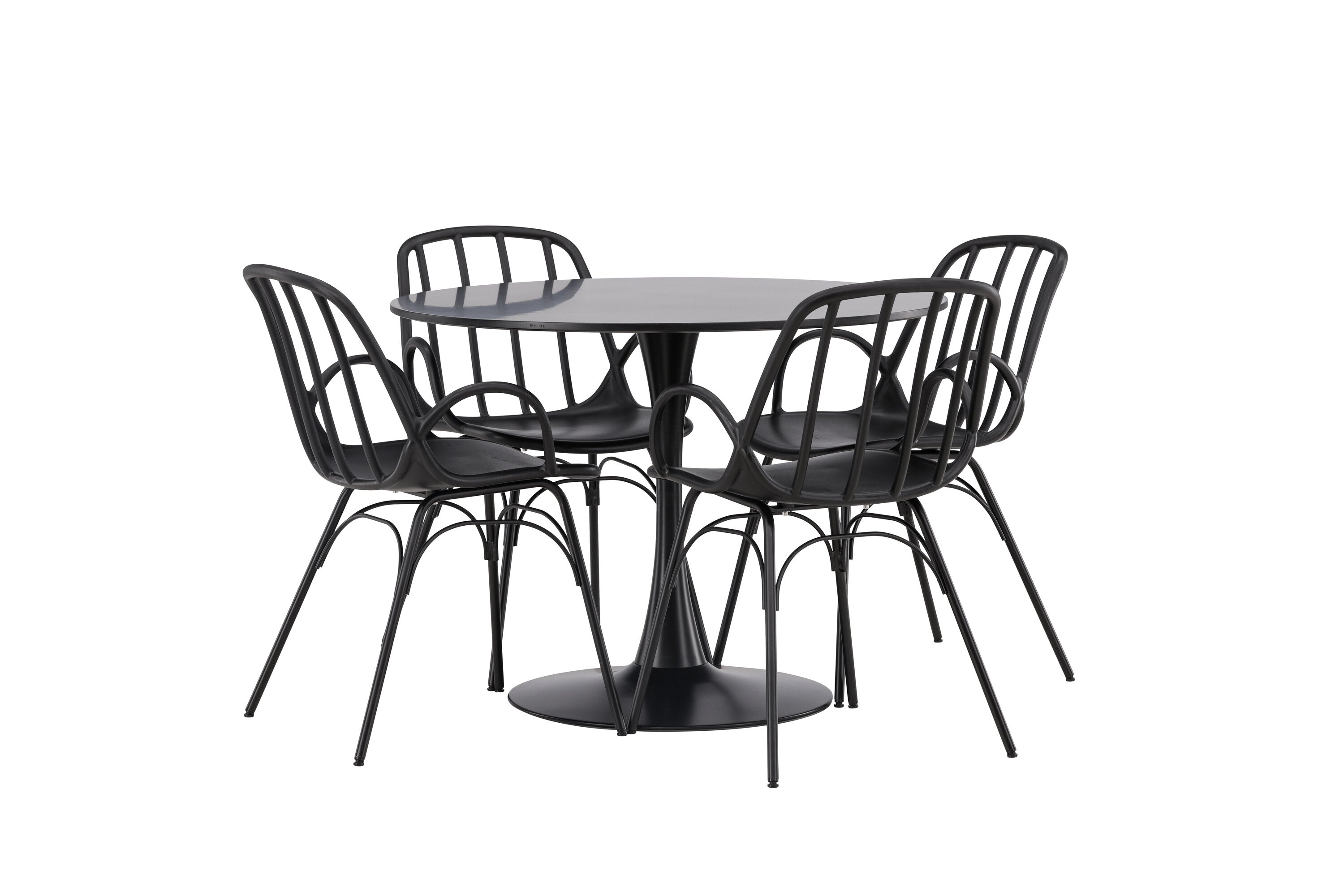 Vytvořte si u vás doma módní atmosféru! Jídelní stůl Glade má stylový skandinávský design se štíhlou trumpetovou nohou z černé oceli a černou desku stolu z MDF. Zde společně s promyšlenou jídelní židlí ze série Dyrön. Židle je stylová i praktická, vyrobena z černého plastu a oceli. Sedák má integrované područky a žebrovaný design v mírně zaoblené zadní části. Nohy židle jsou stylově úzké a mírně rozšířené ve skandinávském designu. Ať je čas zde příjemný a pohodlný! Rozměry stolu: 100 cm.