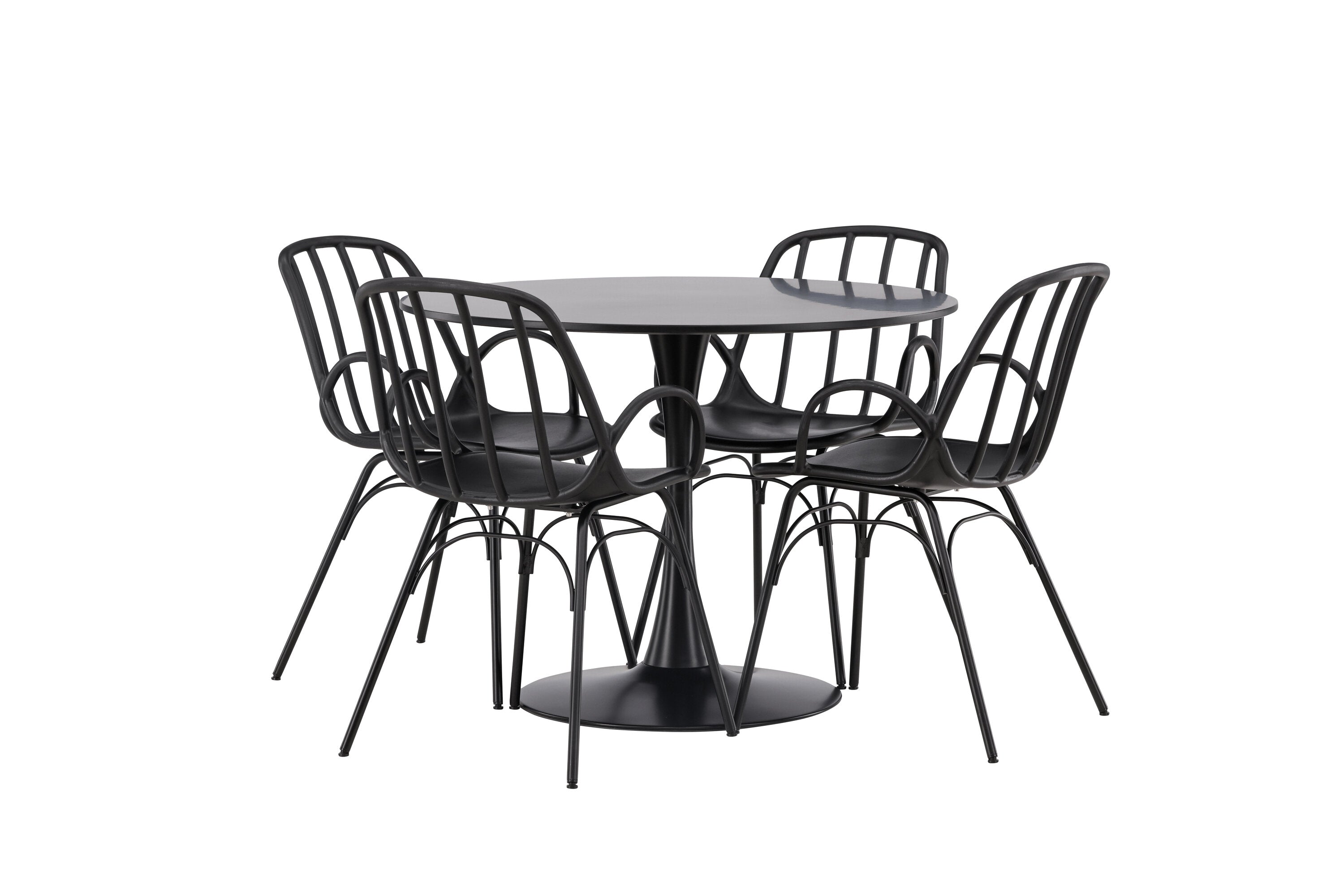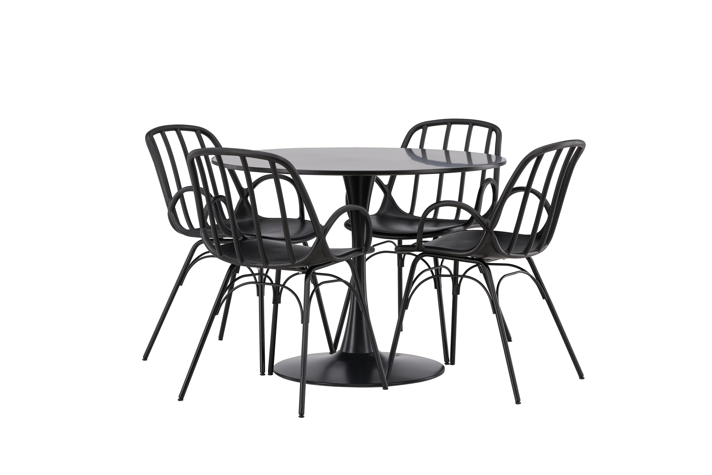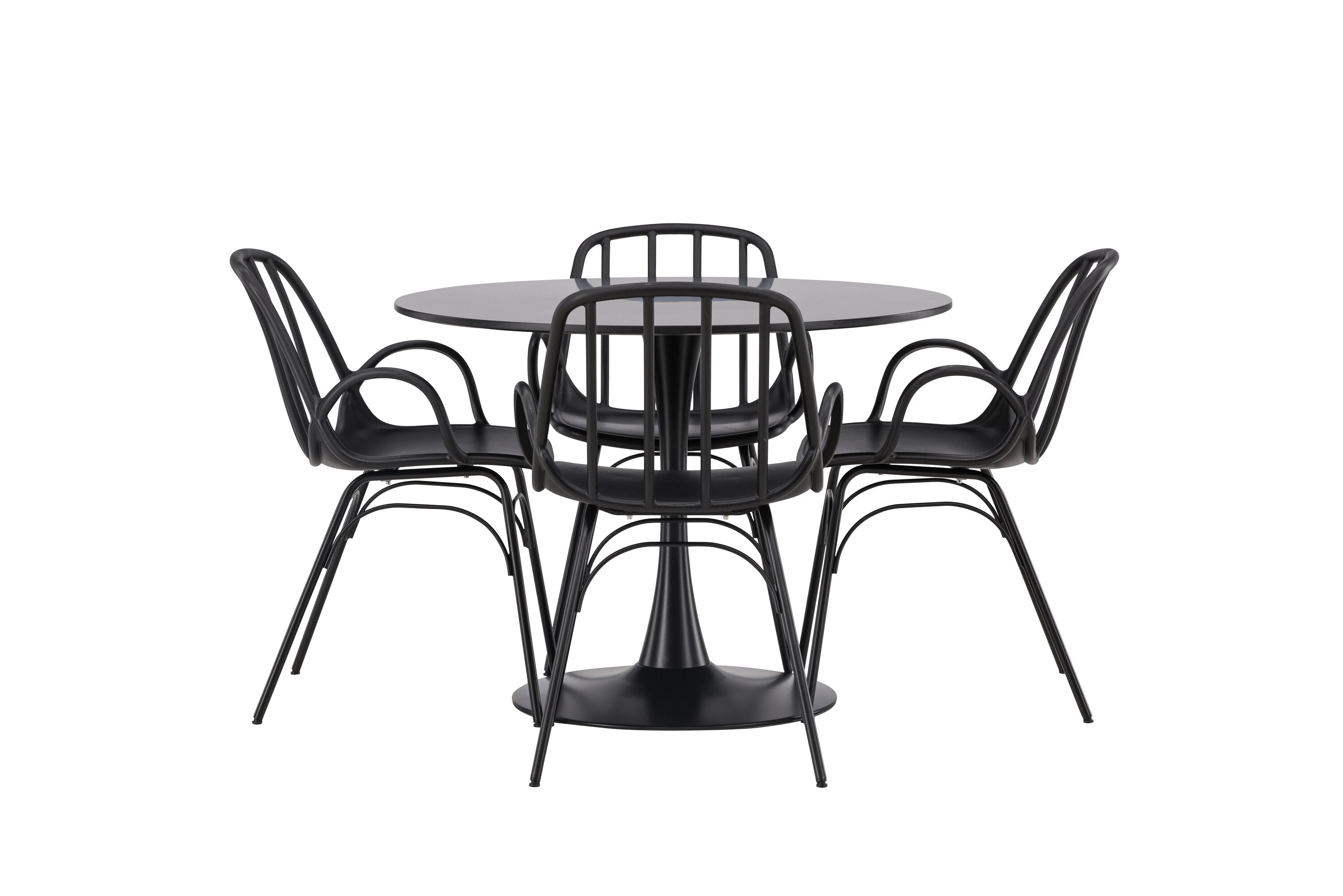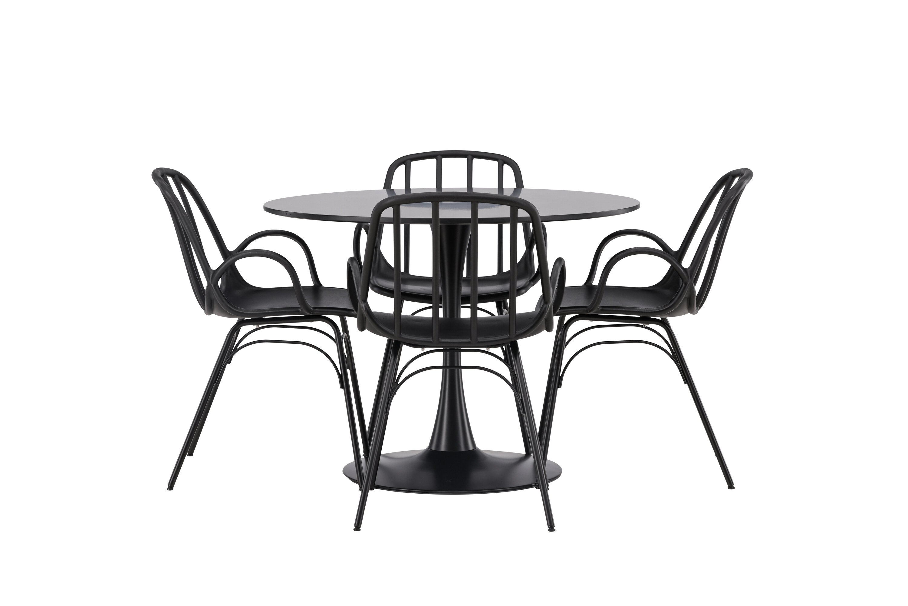 Vytvořte si u vás doma módní atmosféru! Jídelní stůl Glade má stylový skandinávský design se štíhlou trumpetovou nohou z černé oceli a černou desku stolu z MDF. Zde společně s promyšlenou jídelní židlí ze série Dyrön. Židle je stylová i praktická, vyrobena z černého plastu a oceli. Sedák má integrované područky a žebrovaný design v mírně zaoblené zadní části. Nohy židle jsou stylově úzké a mírně rozšířené ve skandinávském designu. Ať je čas zde příjemný a pohodlný! Rozměry stolu: 100 cm.