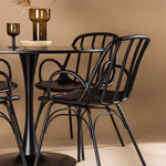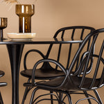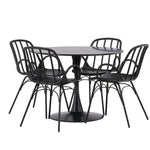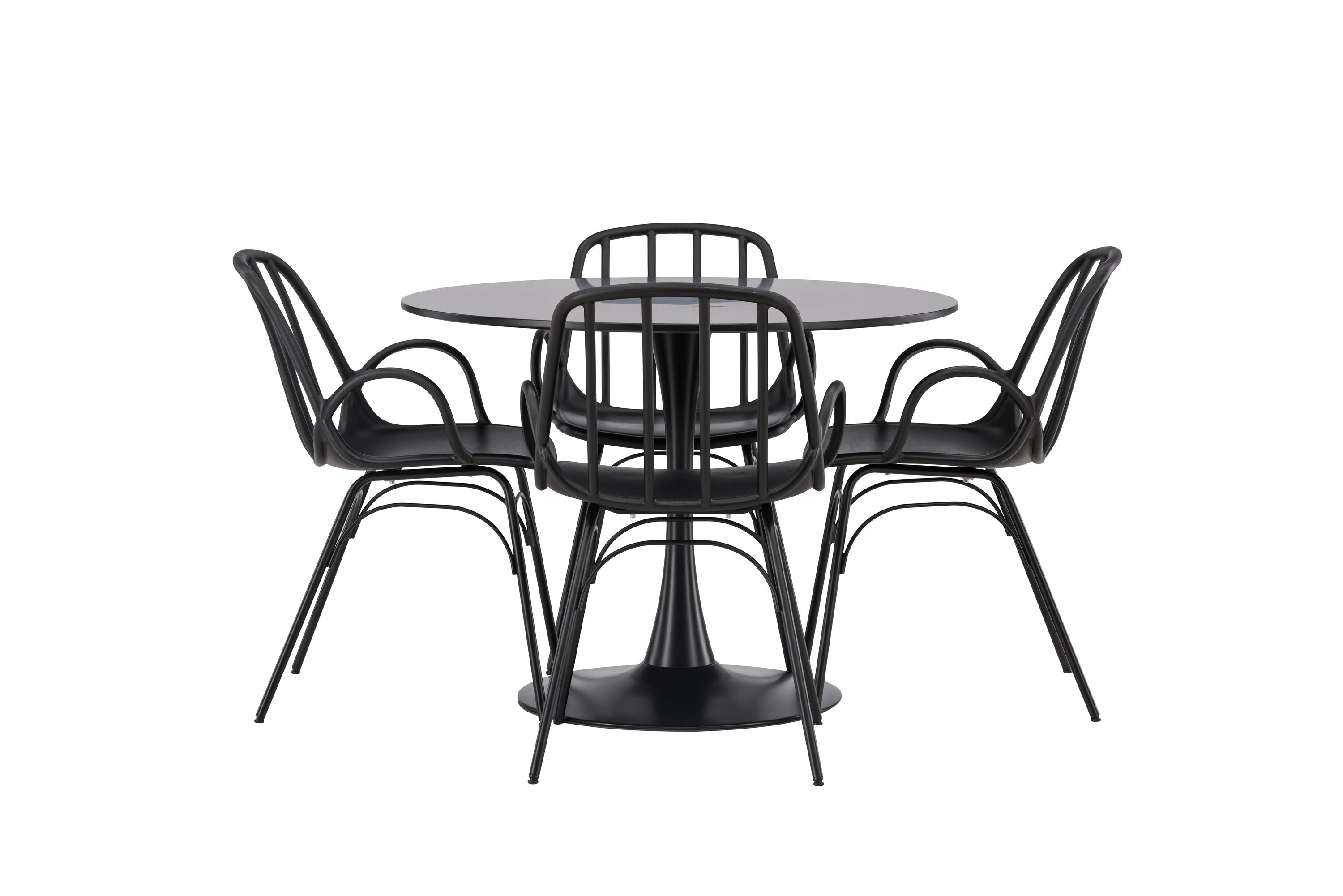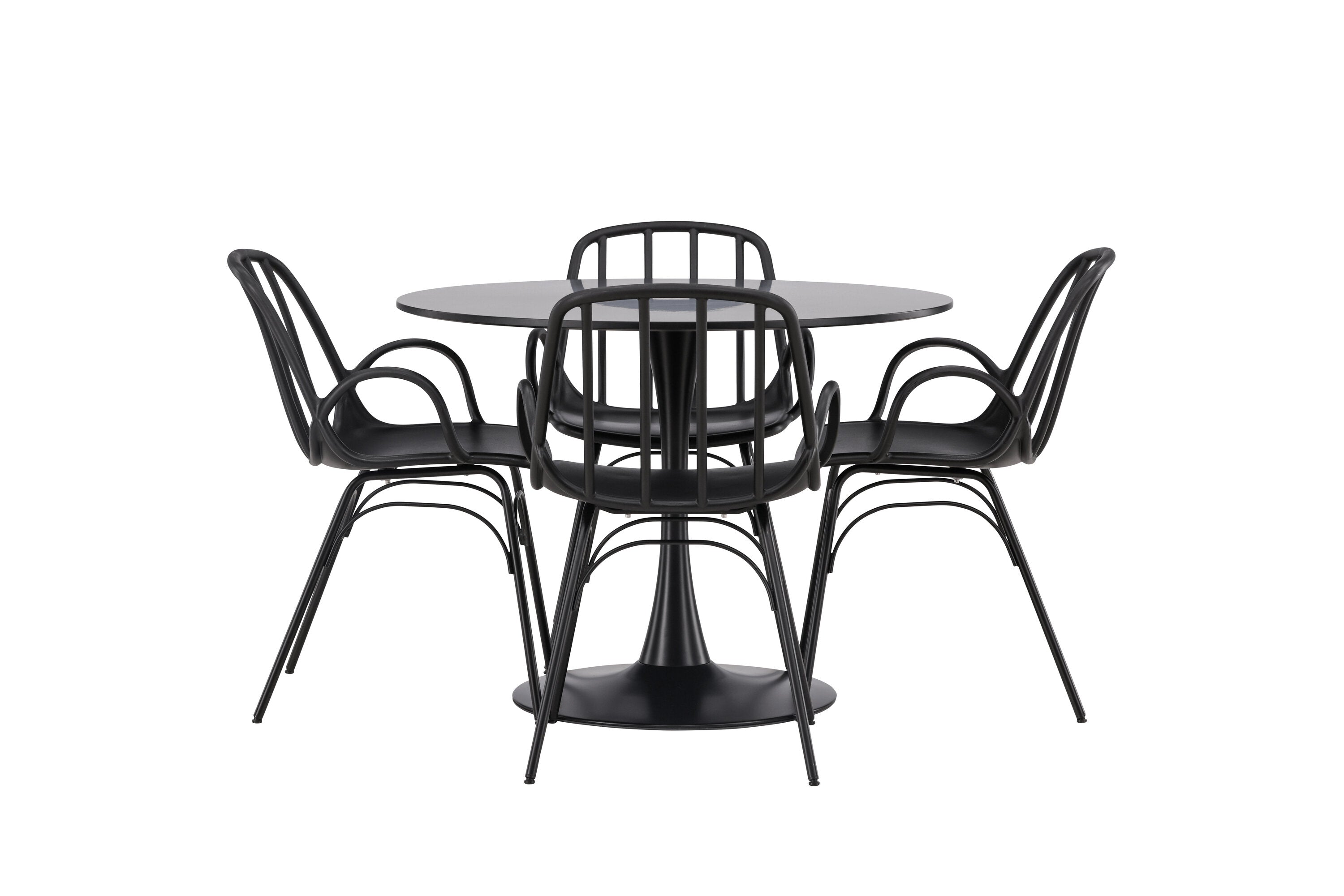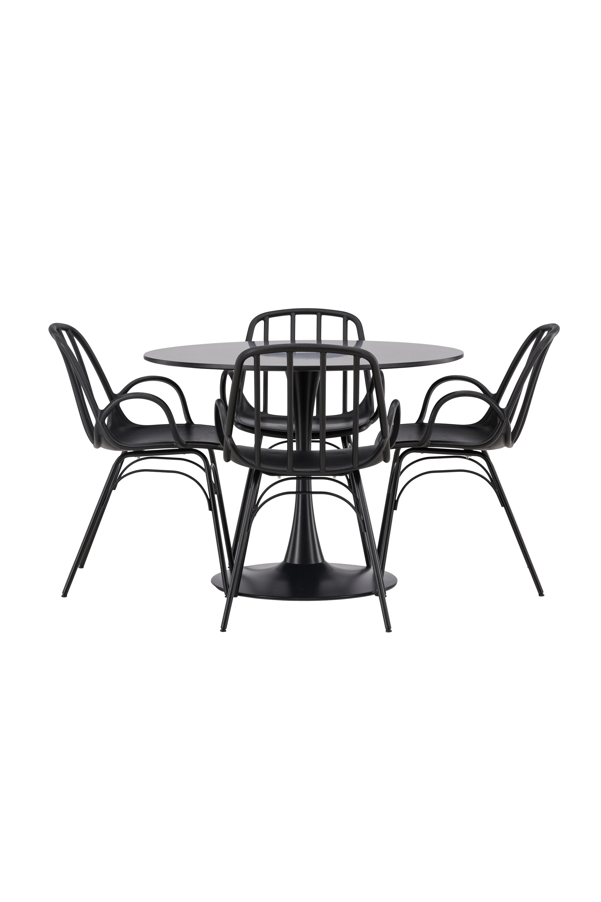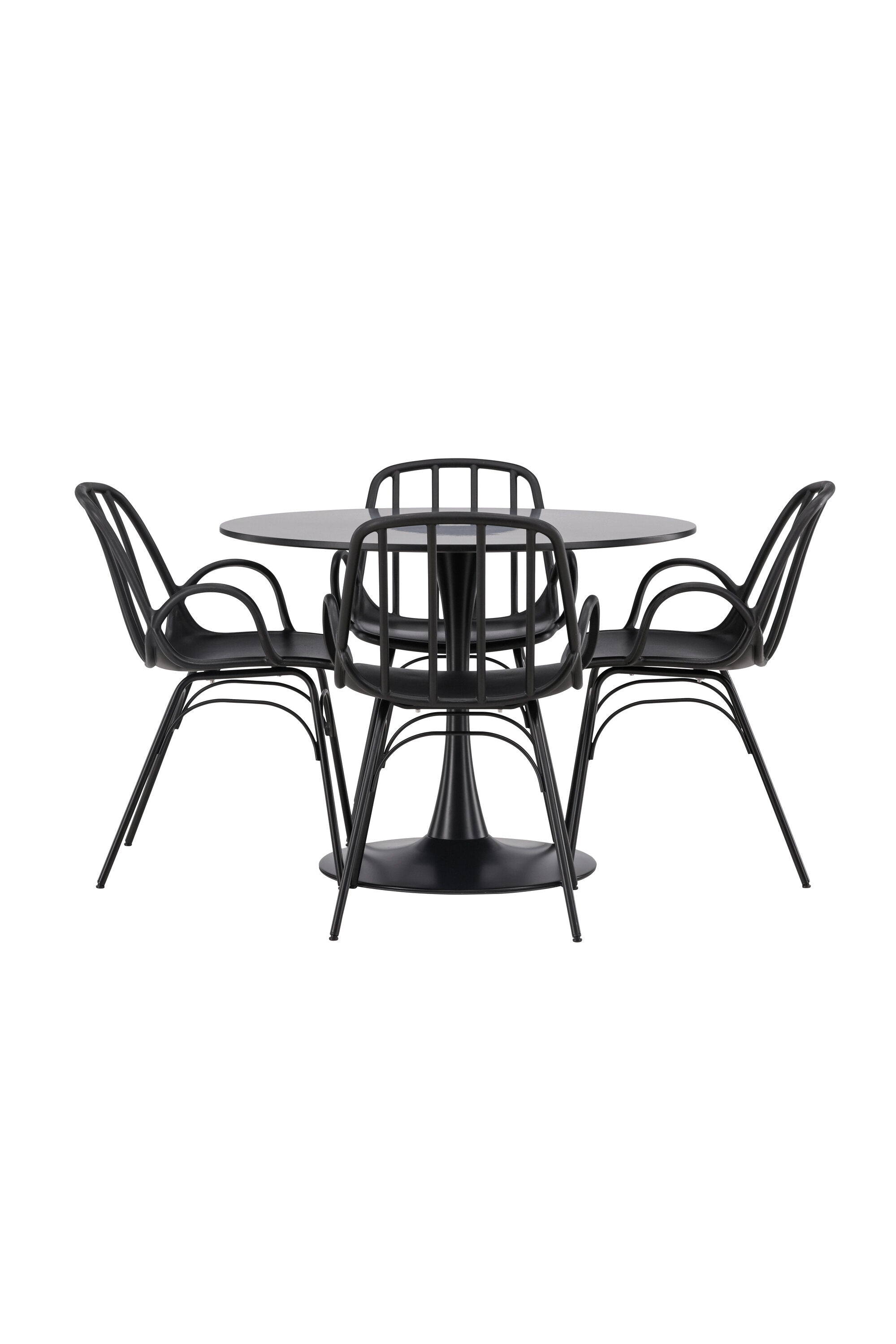 Vytvořte si u vás doma módní atmosféru! Jídelní stůl Glade má stylový skandinávský design se štíhlou trumpetovou nohou z černé oceli a černou desku stolu z MDF. Zde společně s promyšlenou jídelní židlí ze série Dyrön. Židle je stylová i praktická, vyrobena z černého plastu a oceli. Sedák má integrované područky a žebrovaný design v mírně zaoblené zadní části. Nohy židle jsou stylově úzké a mírně rozšířené ve skandinávském designu. Ať je čas zde příjemný a pohodlný! Rozměry stolu: 100 cm.