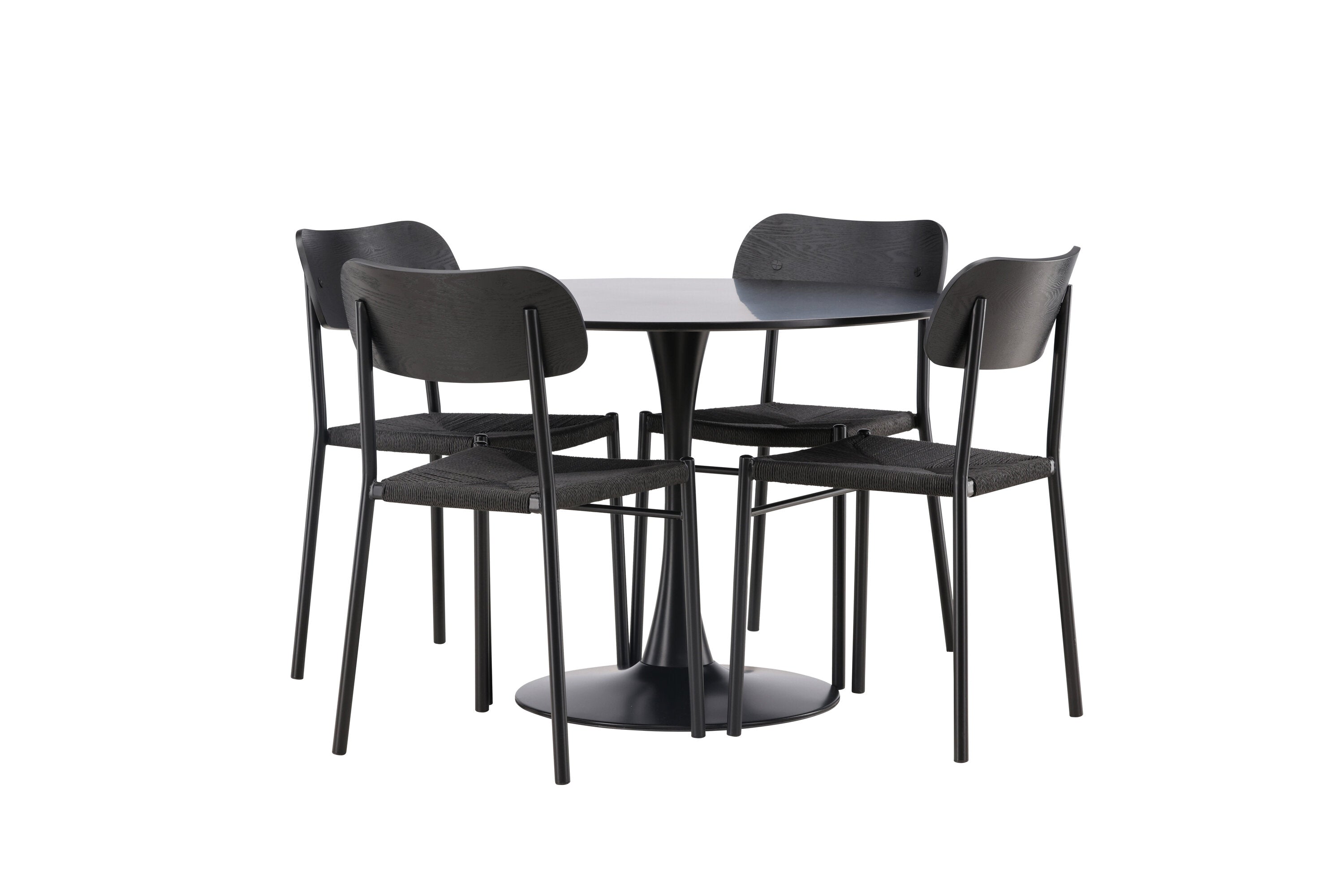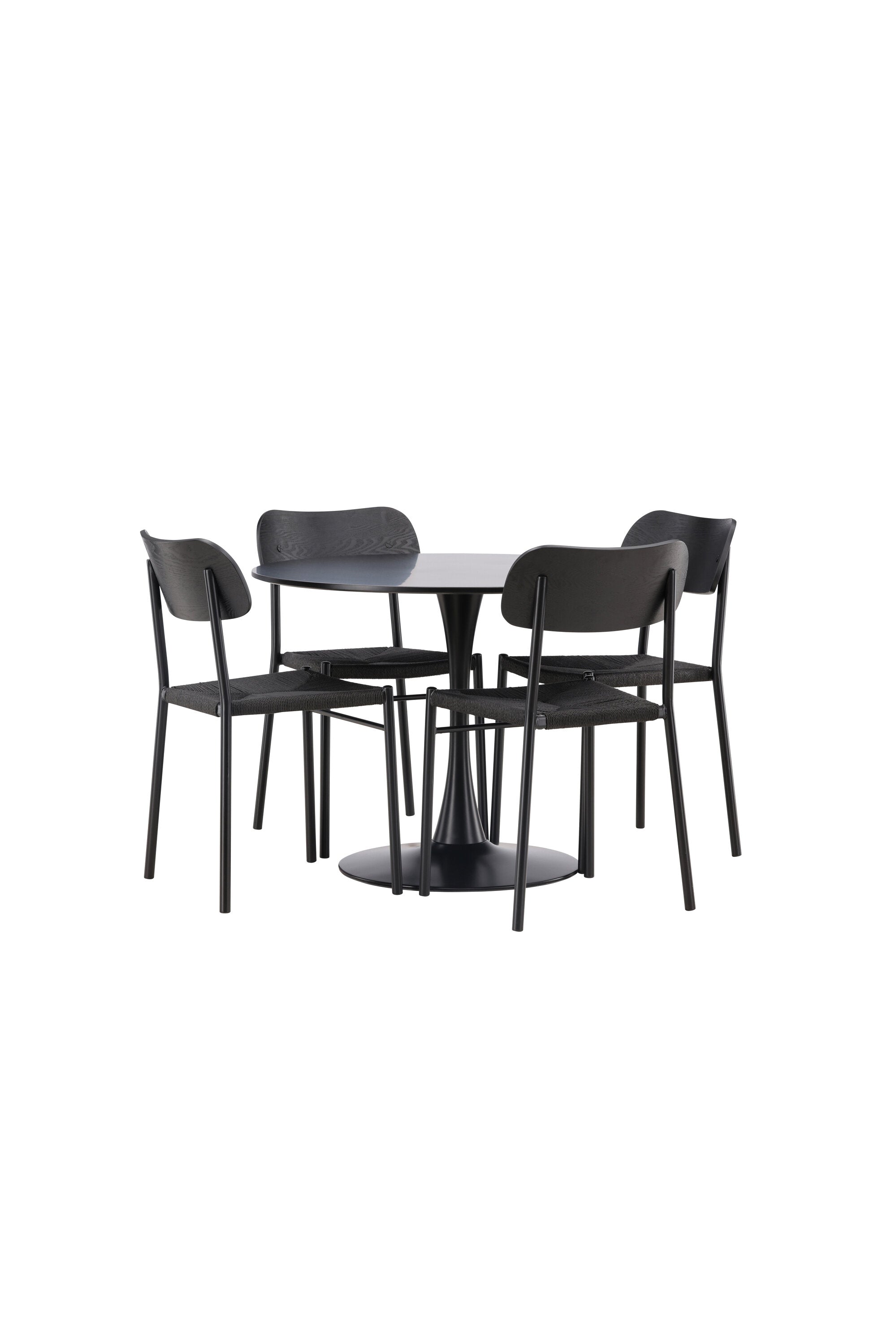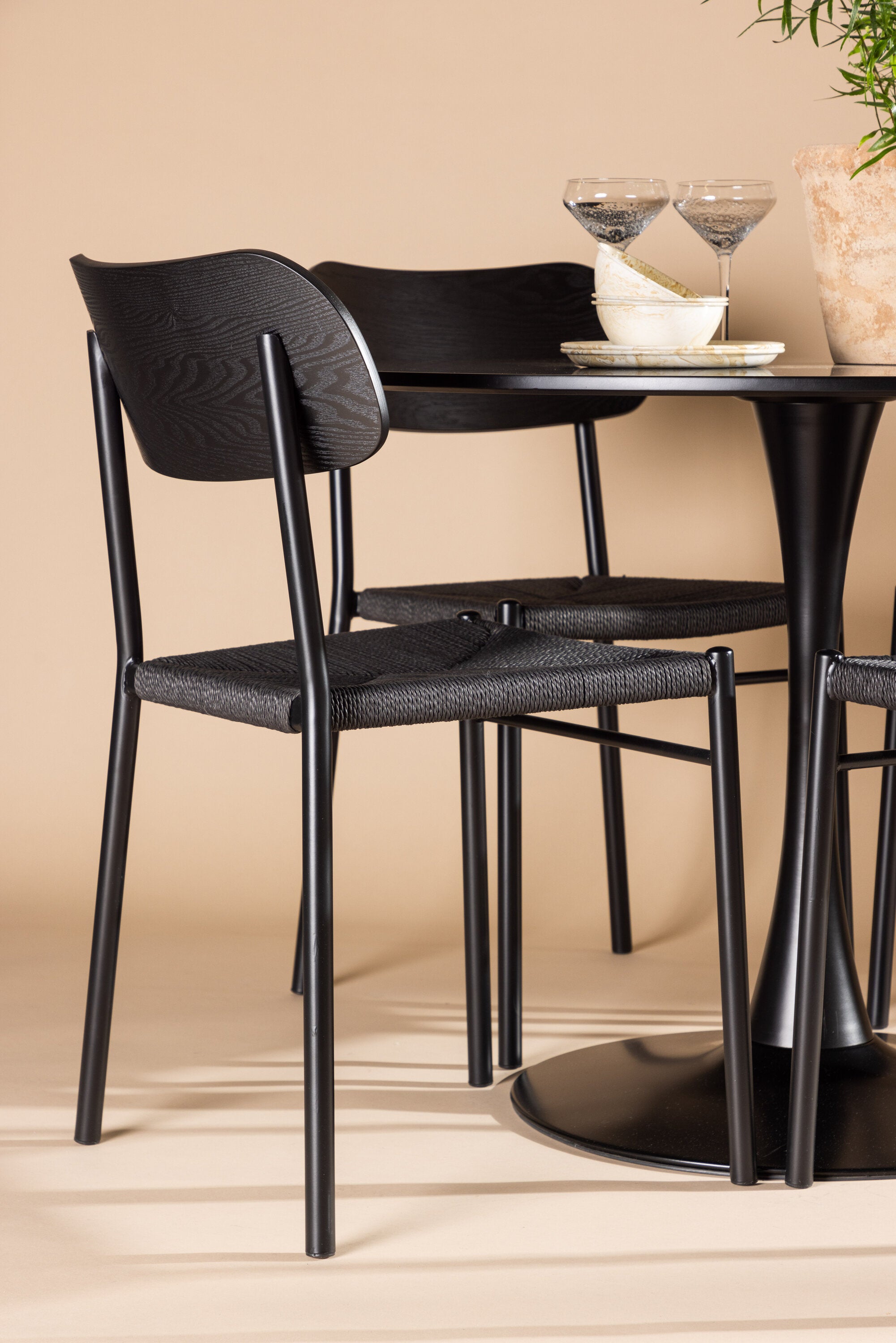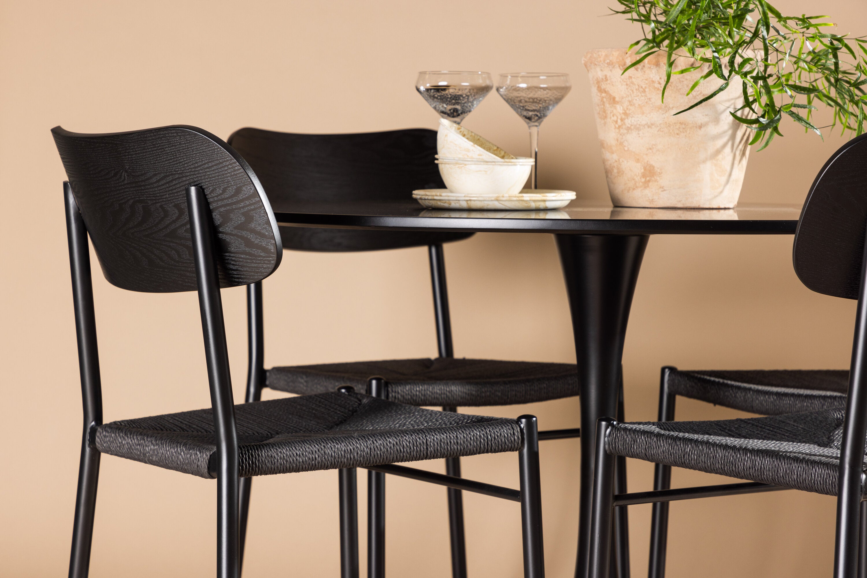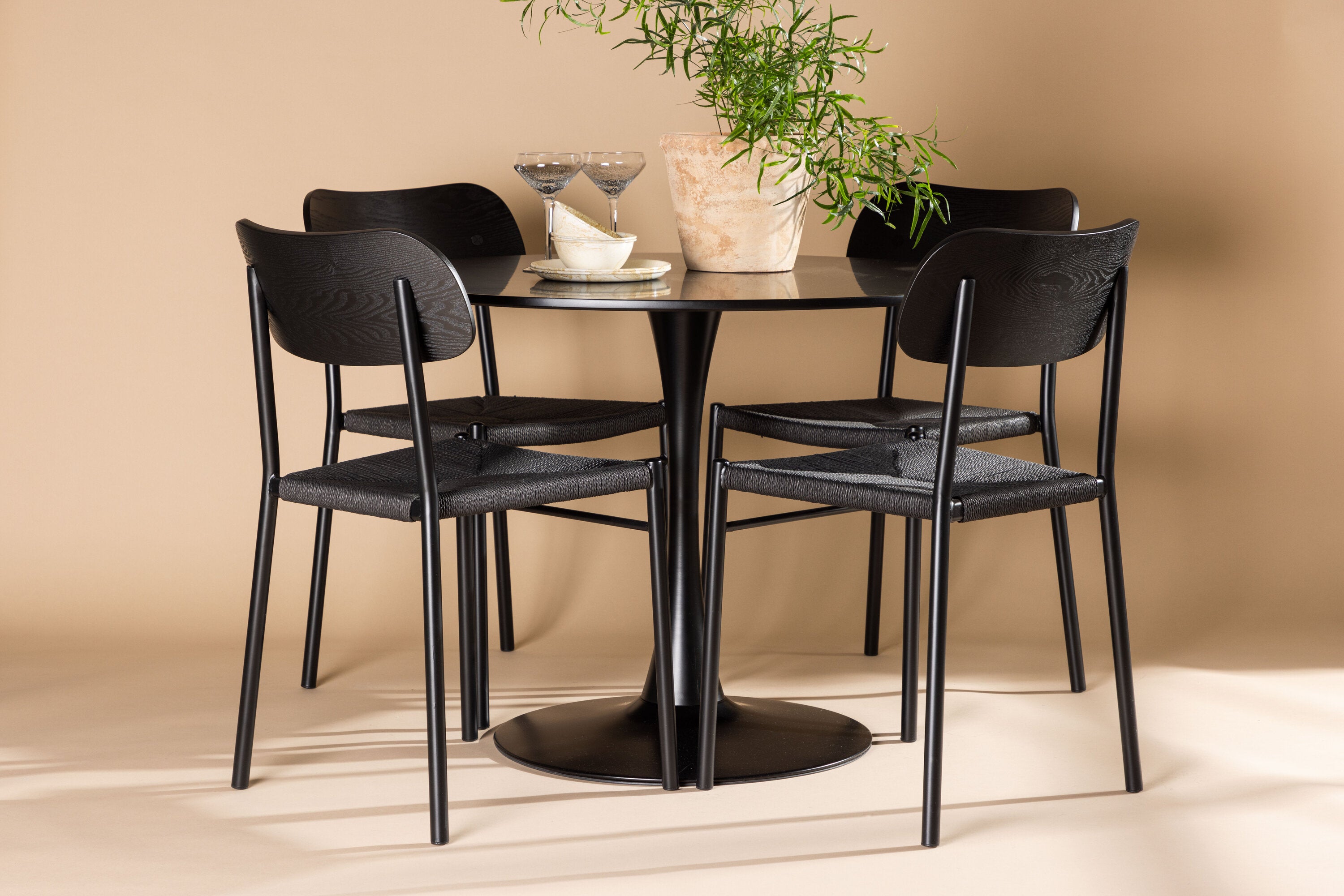 Perfektní jídelní skupina s příjemným pocitem a přitažlivými detaily! Jídelní stůl Glade má stylový skandinávský design se štíhlou trumpetovou nohou z černé oceli a černou desku stolu z MDF. Zde spolu s odpovídajícími černými jídelními židlemi ze série Polly. Židle má opěradlo z černé MDF s dýhou a sedák z módní černé tkaniny z přírodních vláken. Rám a nohy jsou z kovu s černou práškovou barvou. Hodí se stejně dobře do kuchyně jako do obývacího pokoje! Rozměry stolu: 100 cm.