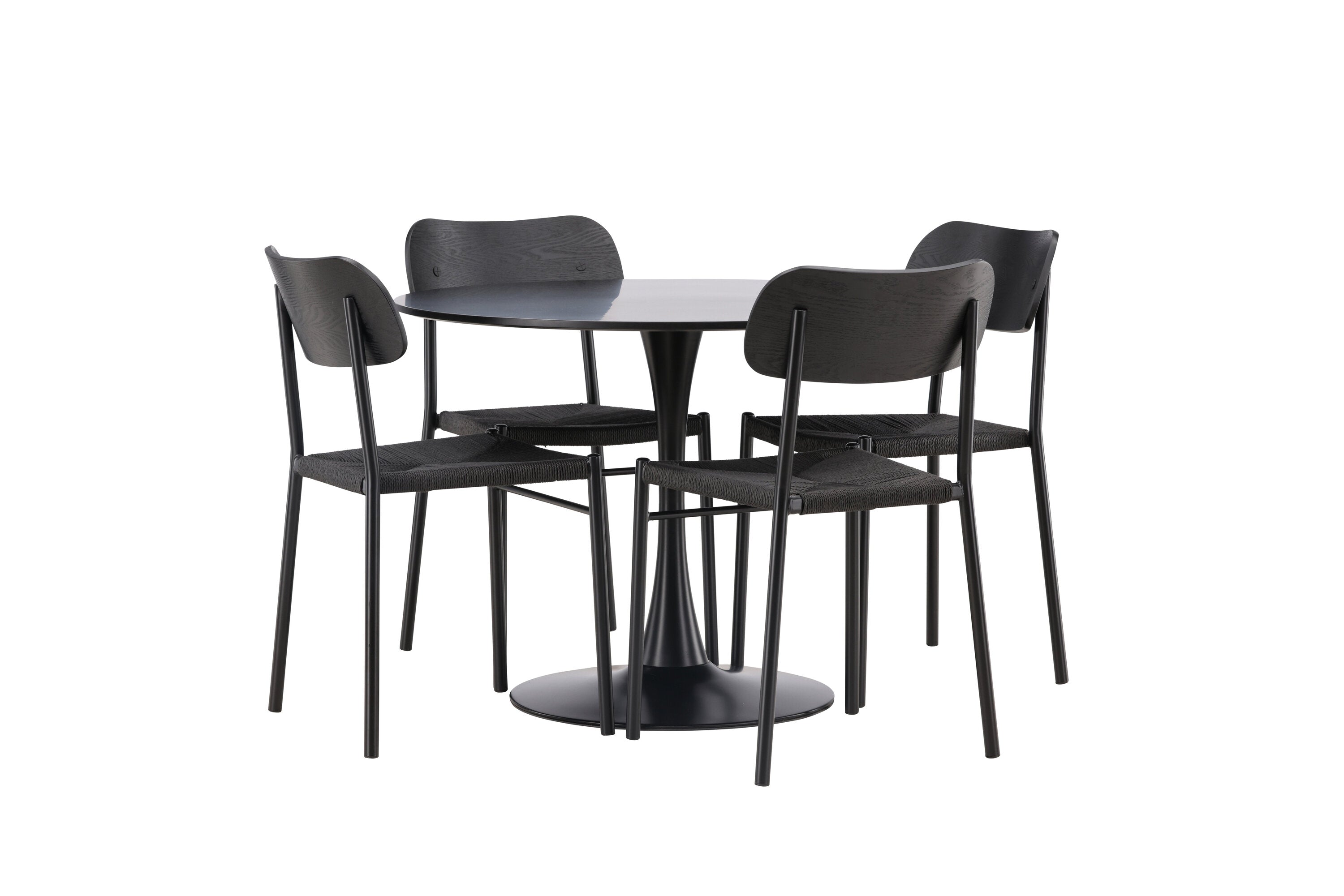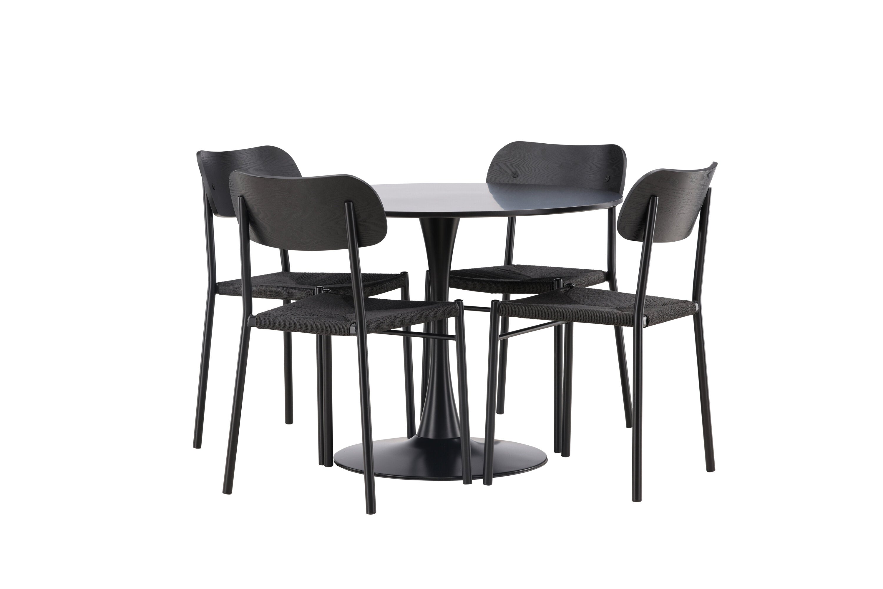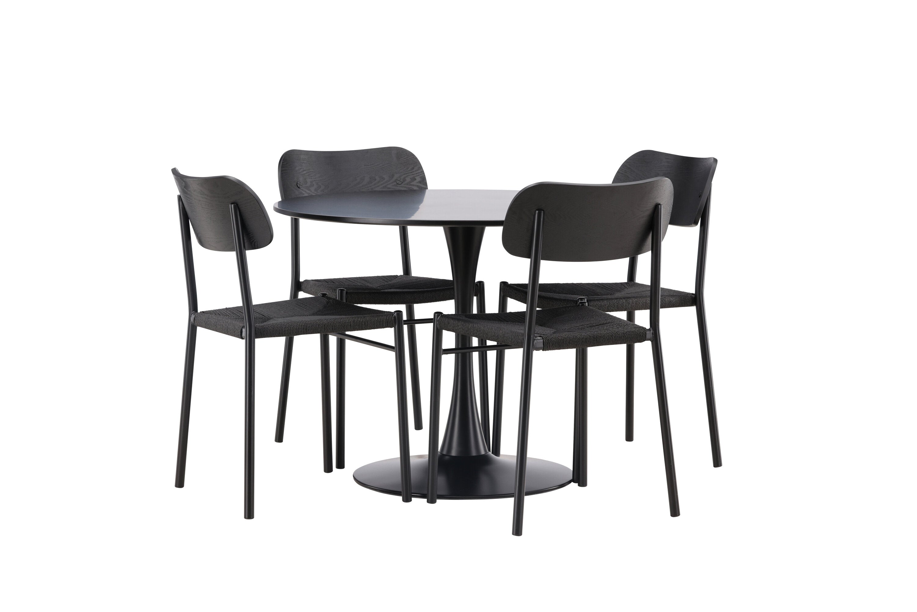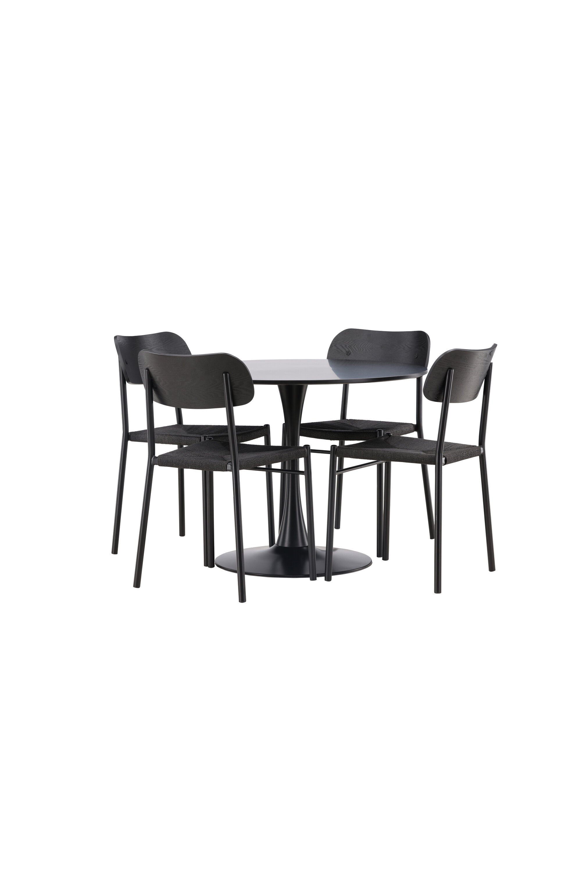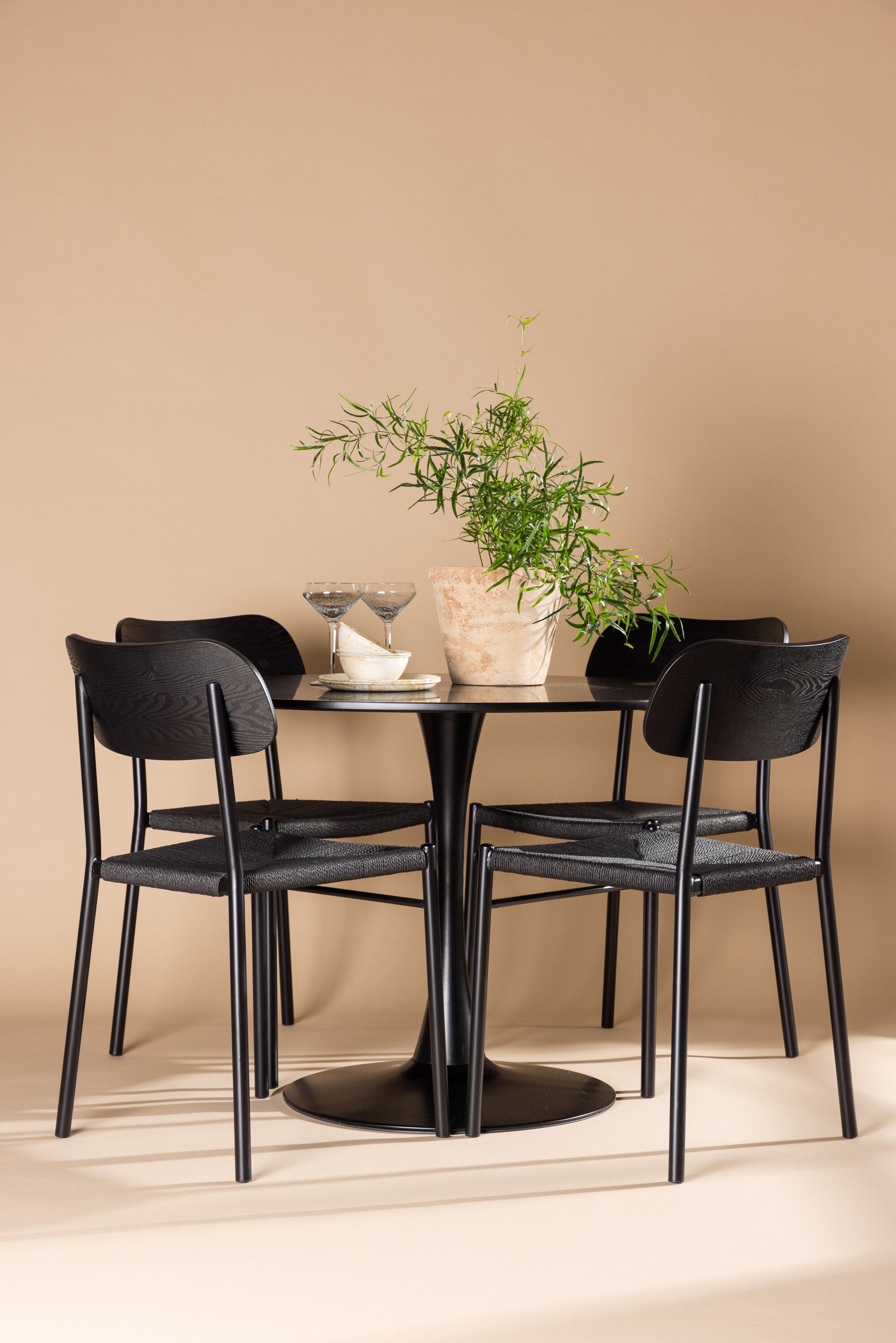 Perfektní jídelní skupina s příjemným pocitem a přitažlivými detaily! Jídelní stůl Glade má stylový skandinávský design se štíhlou trumpetovou nohou z černé oceli a černou desku stolu z MDF. Zde spolu s odpovídajícími černými jídelními židlemi ze série Polly. Židle má opěradlo z černé MDF s dýhou a sedák z módní černé tkaniny z přírodních vláken. Rám a nohy jsou z kovu s černou práškovou barvou. Hodí se stejně dobře do kuchyně jako do obývacího pokoje! Rozměry stolu: 100 cm.