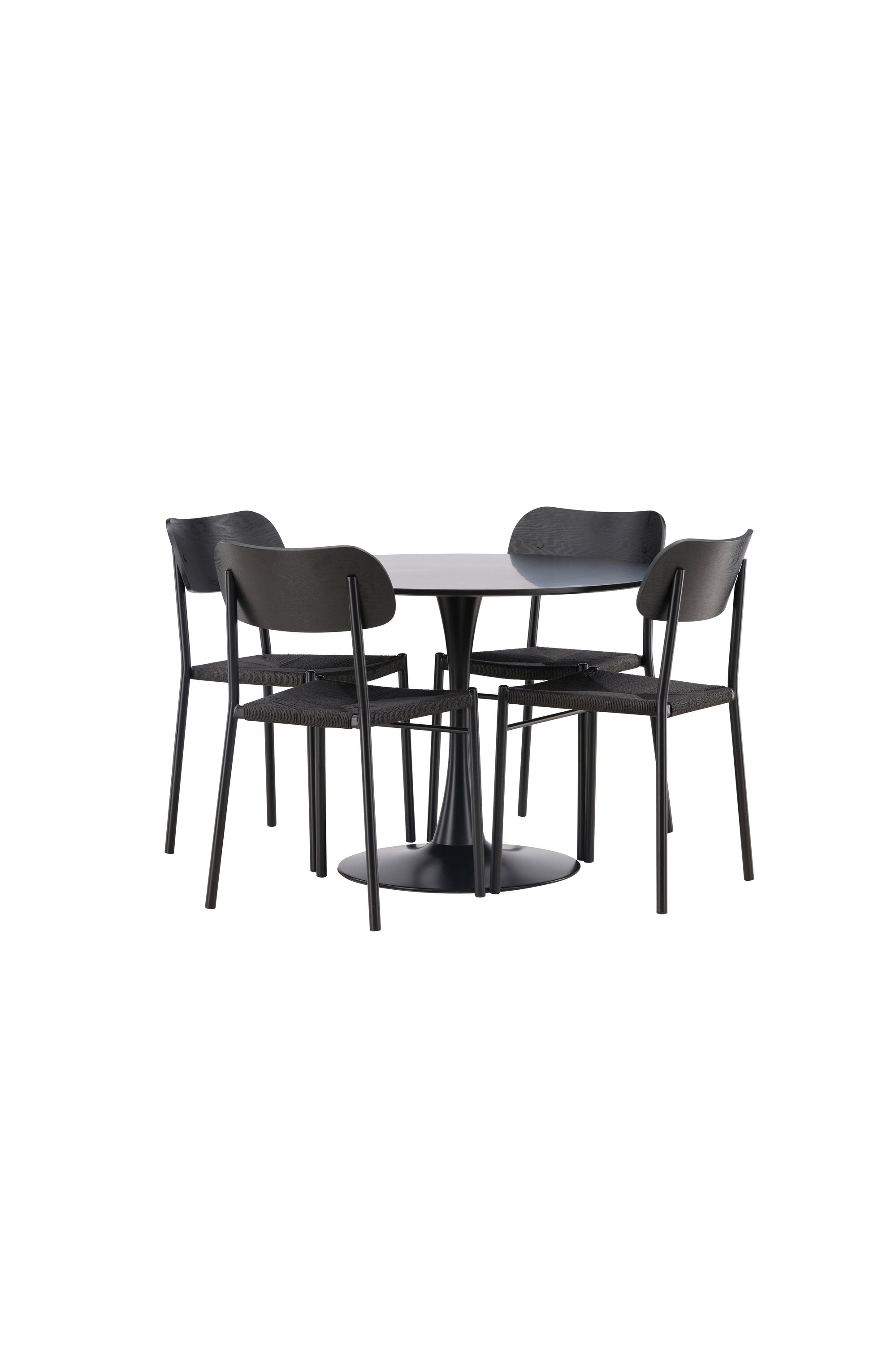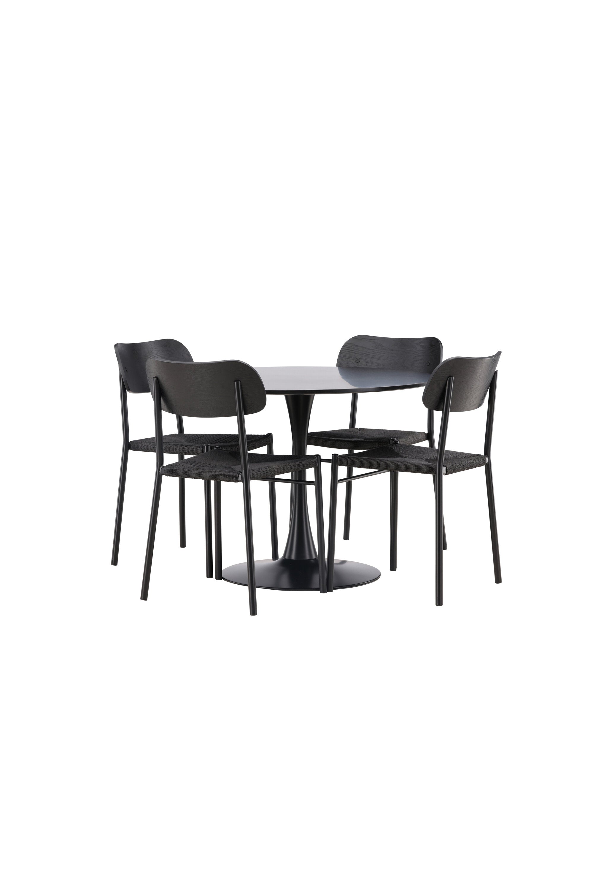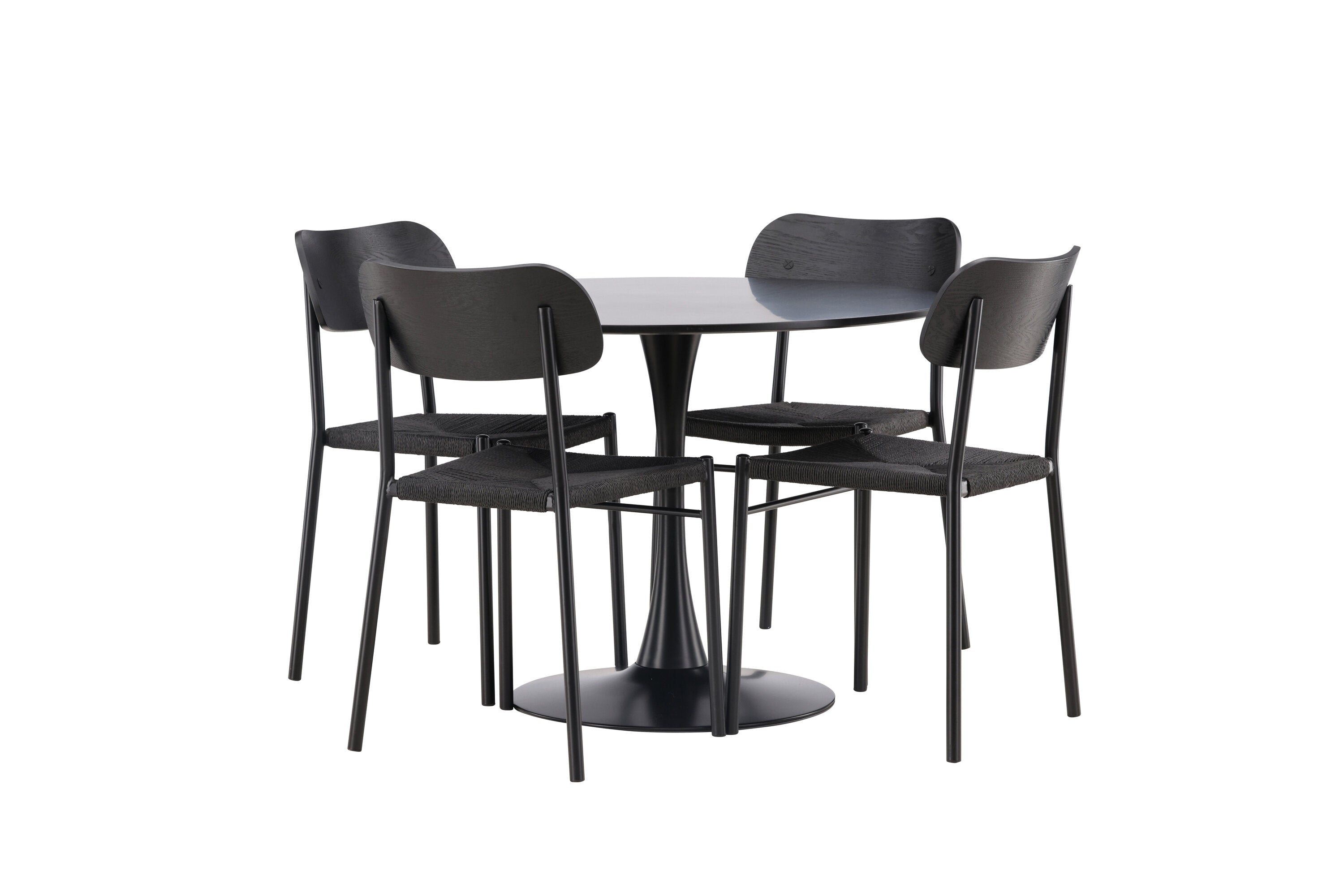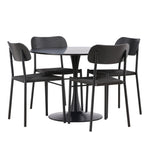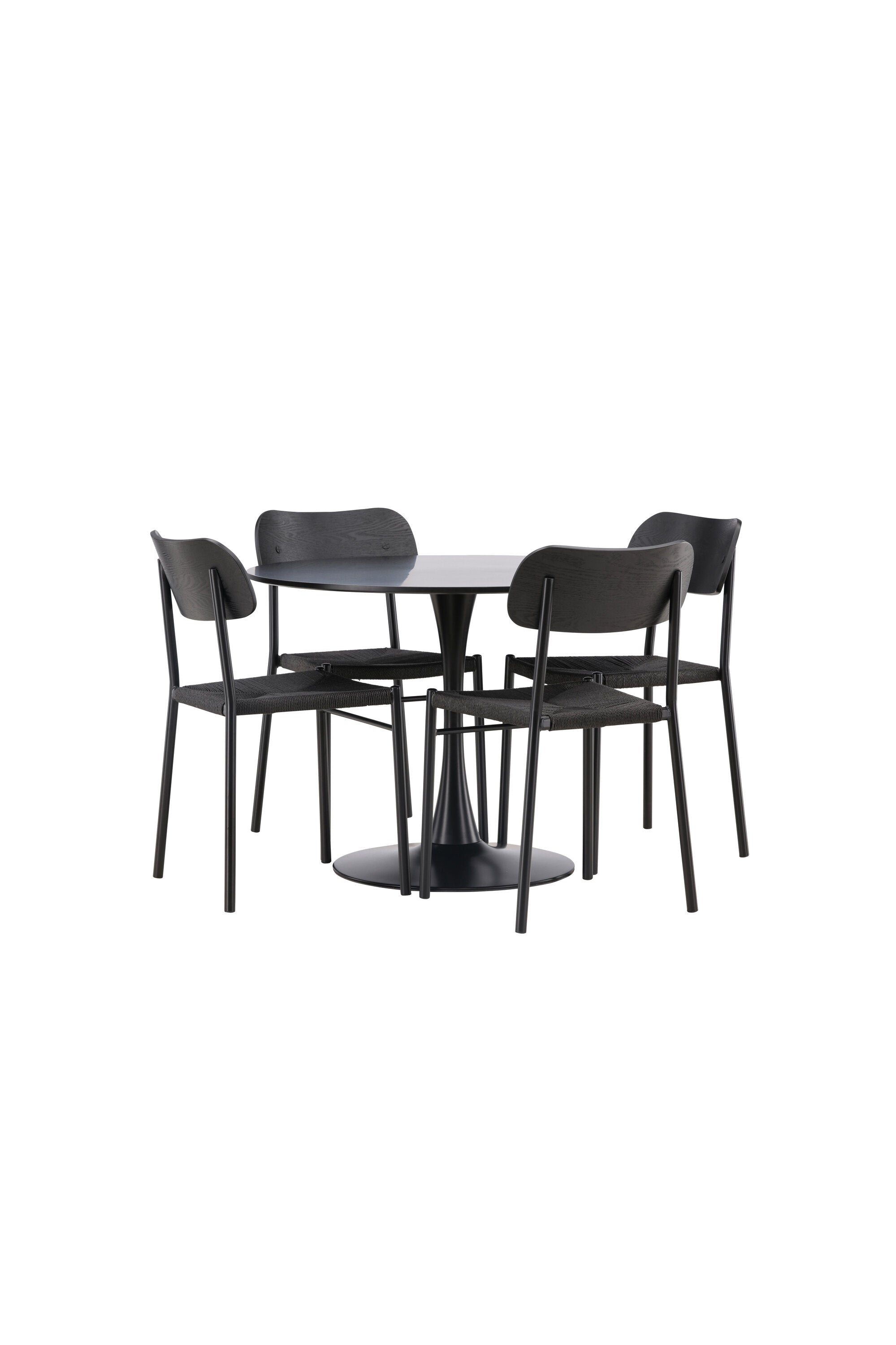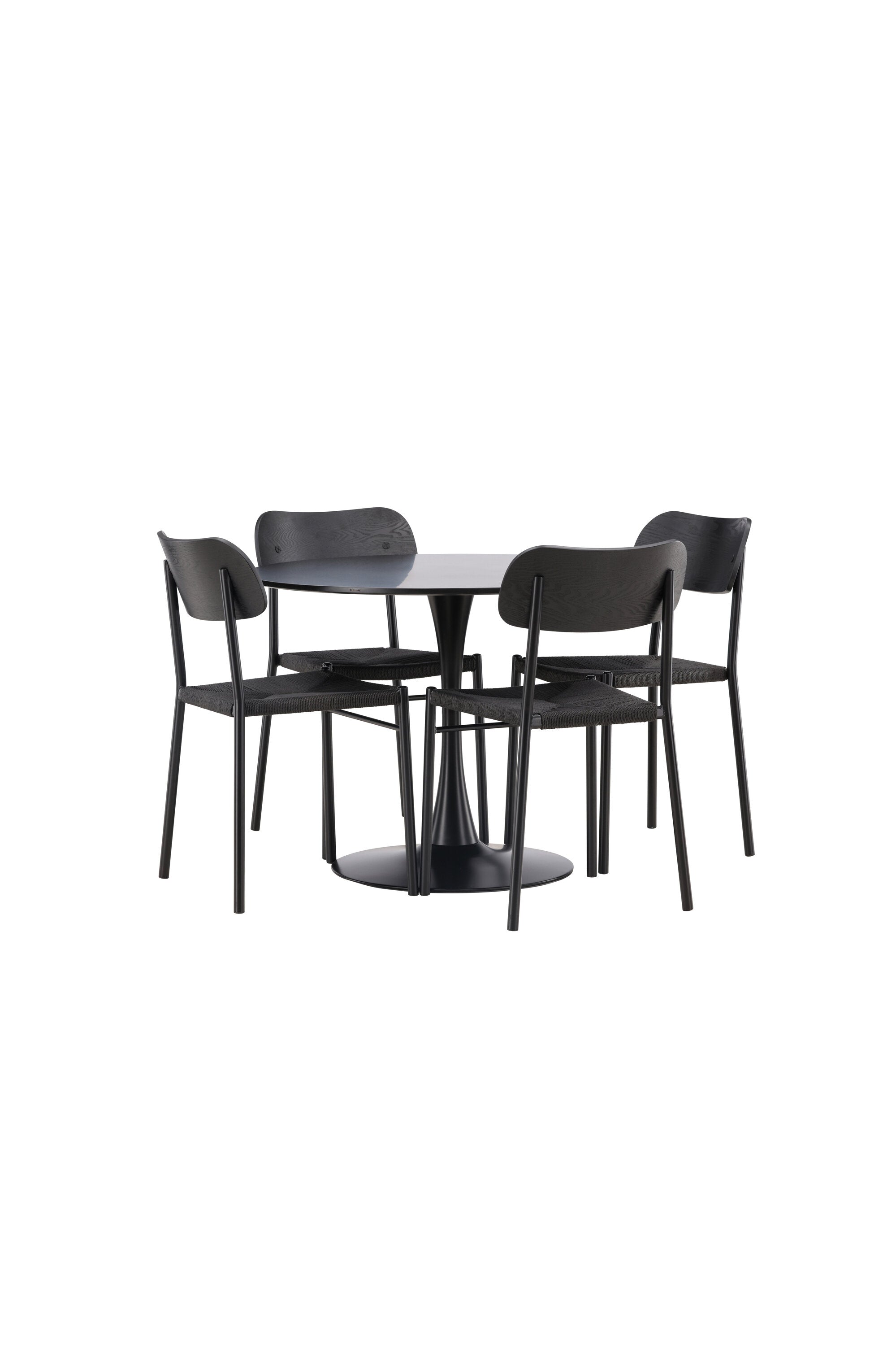 Perfektní jídelní skupina s příjemným pocitem a přitažlivými detaily! Jídelní stůl Glade má stylový skandinávský design se štíhlou trumpetovou nohou z černé oceli a černou desku stolu z MDF. Zde spolu s odpovídajícími černými jídelními židlemi ze série Polly. Židle má opěradlo z černé MDF s dýhou a sedák z módní černé tkaniny z přírodních vláken. Rám a nohy jsou z kovu s černou práškovou barvou. Hodí se stejně dobře do kuchyně jako do obývacího pokoje! Rozměry stolu: 100 cm.