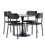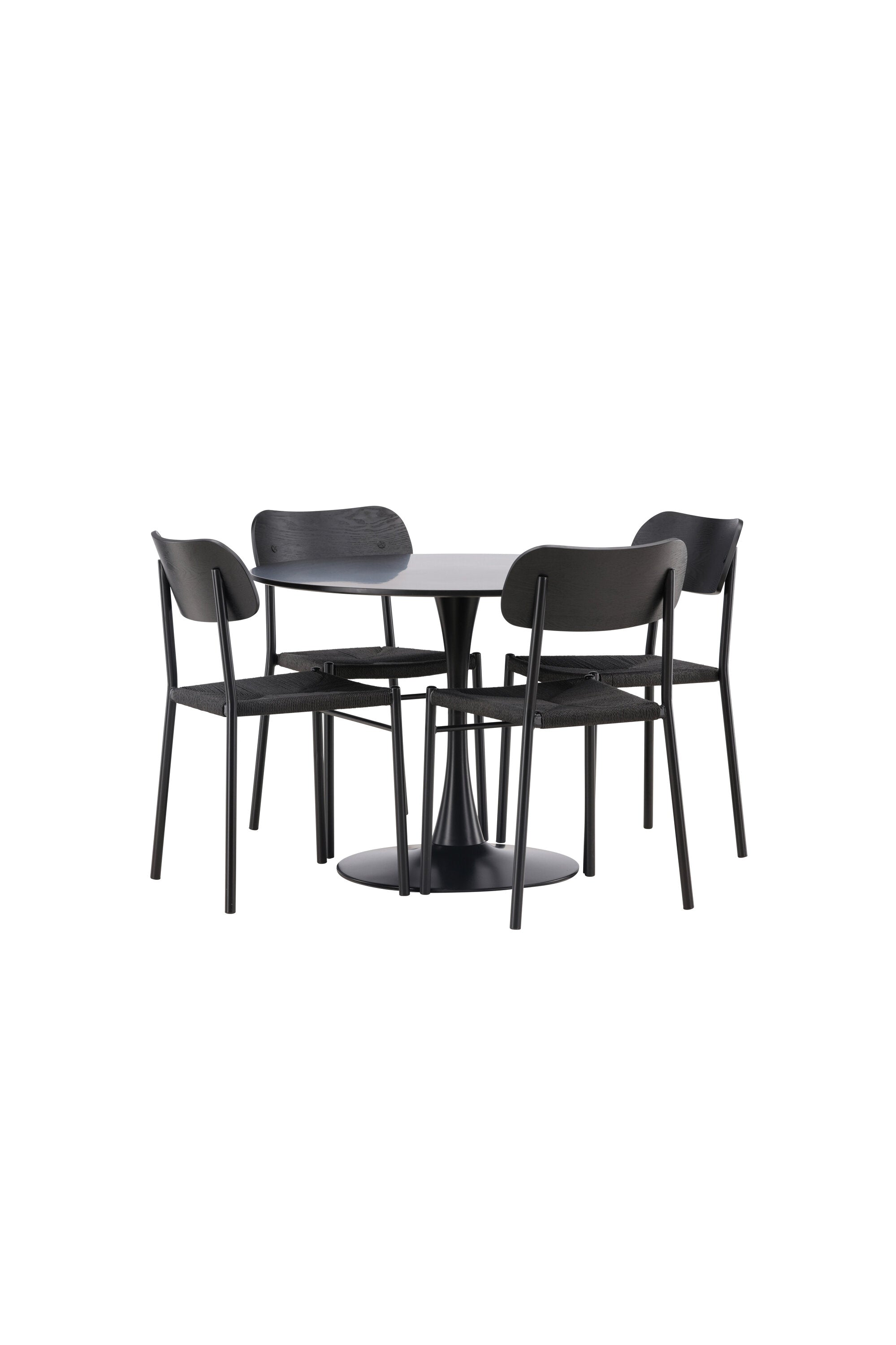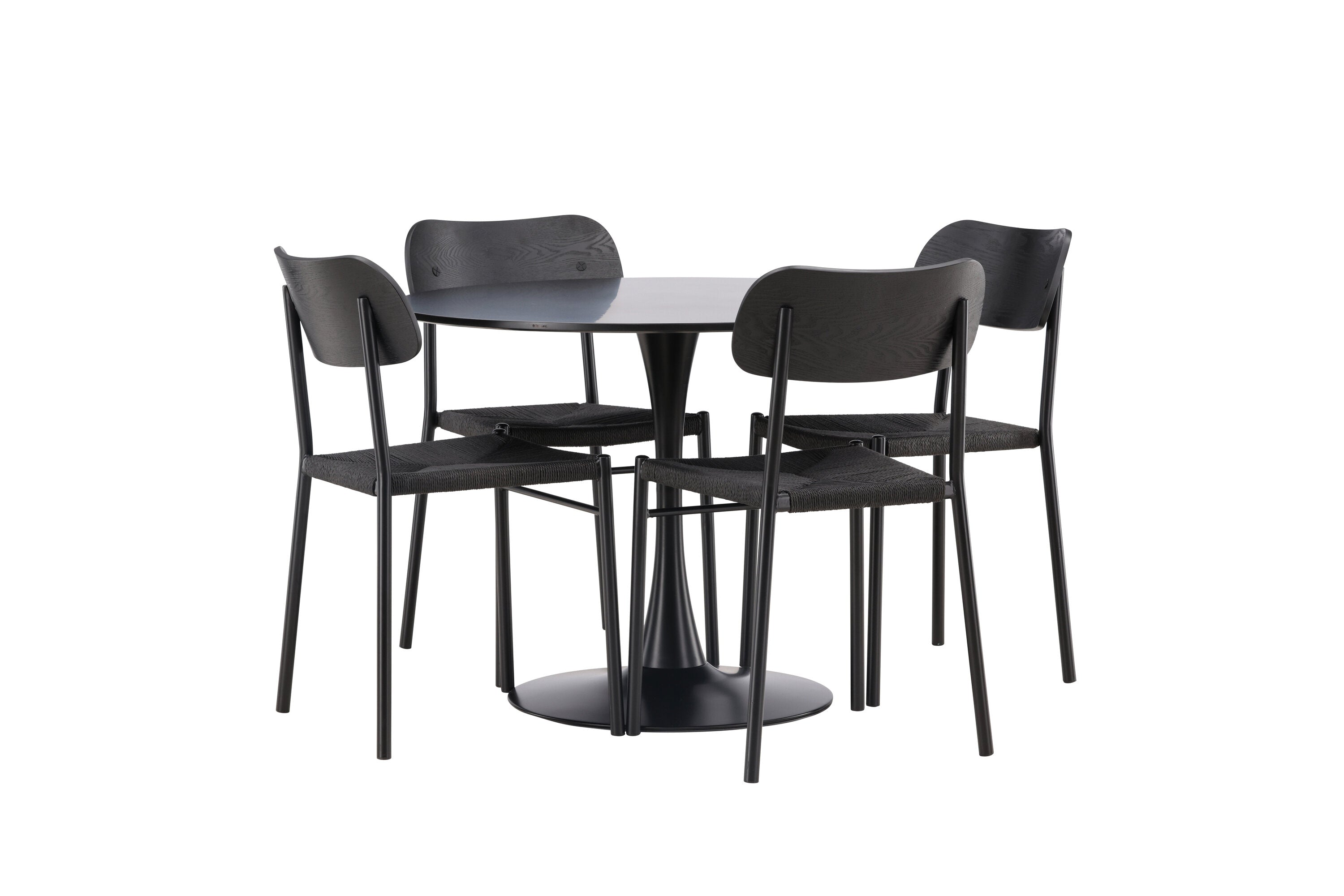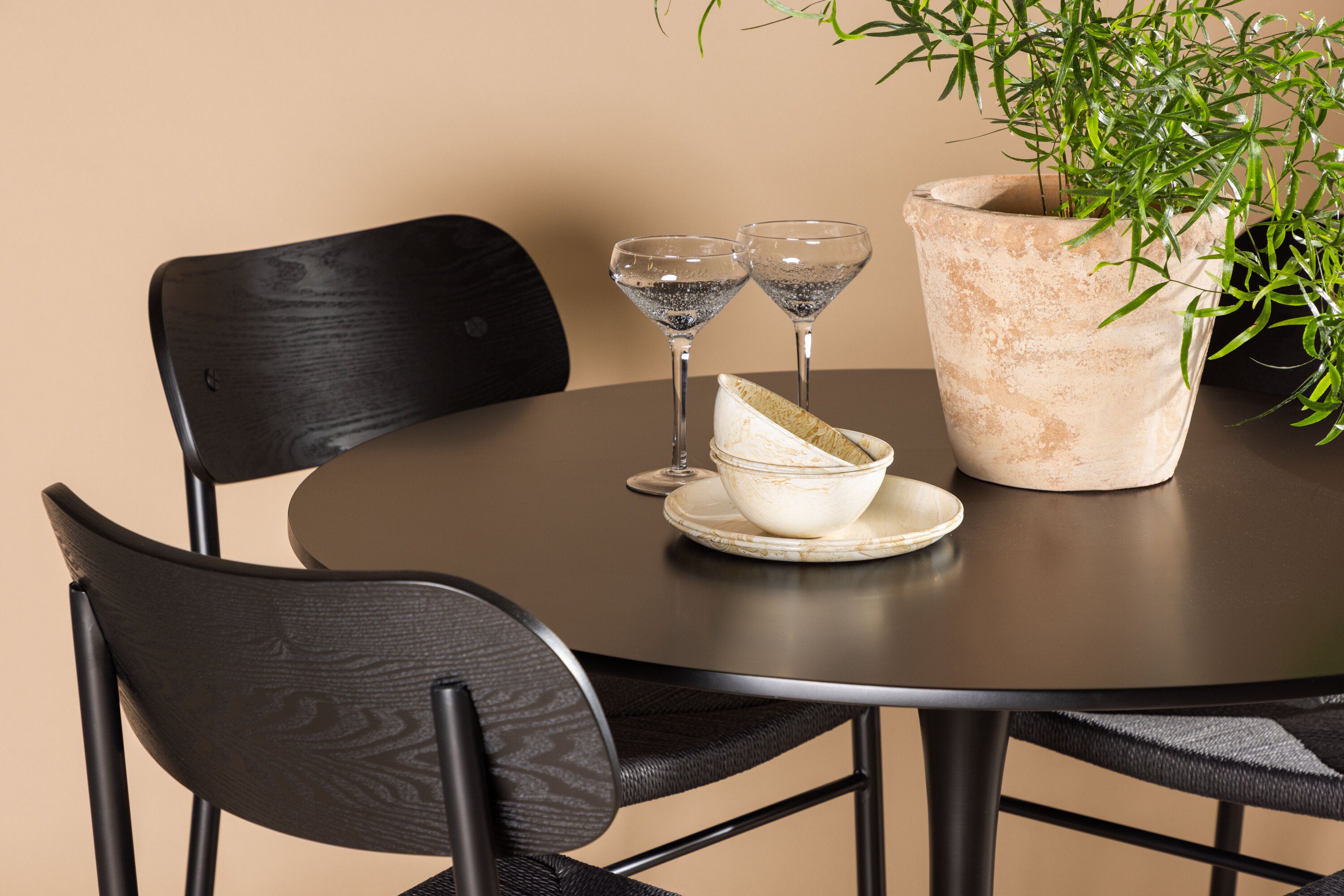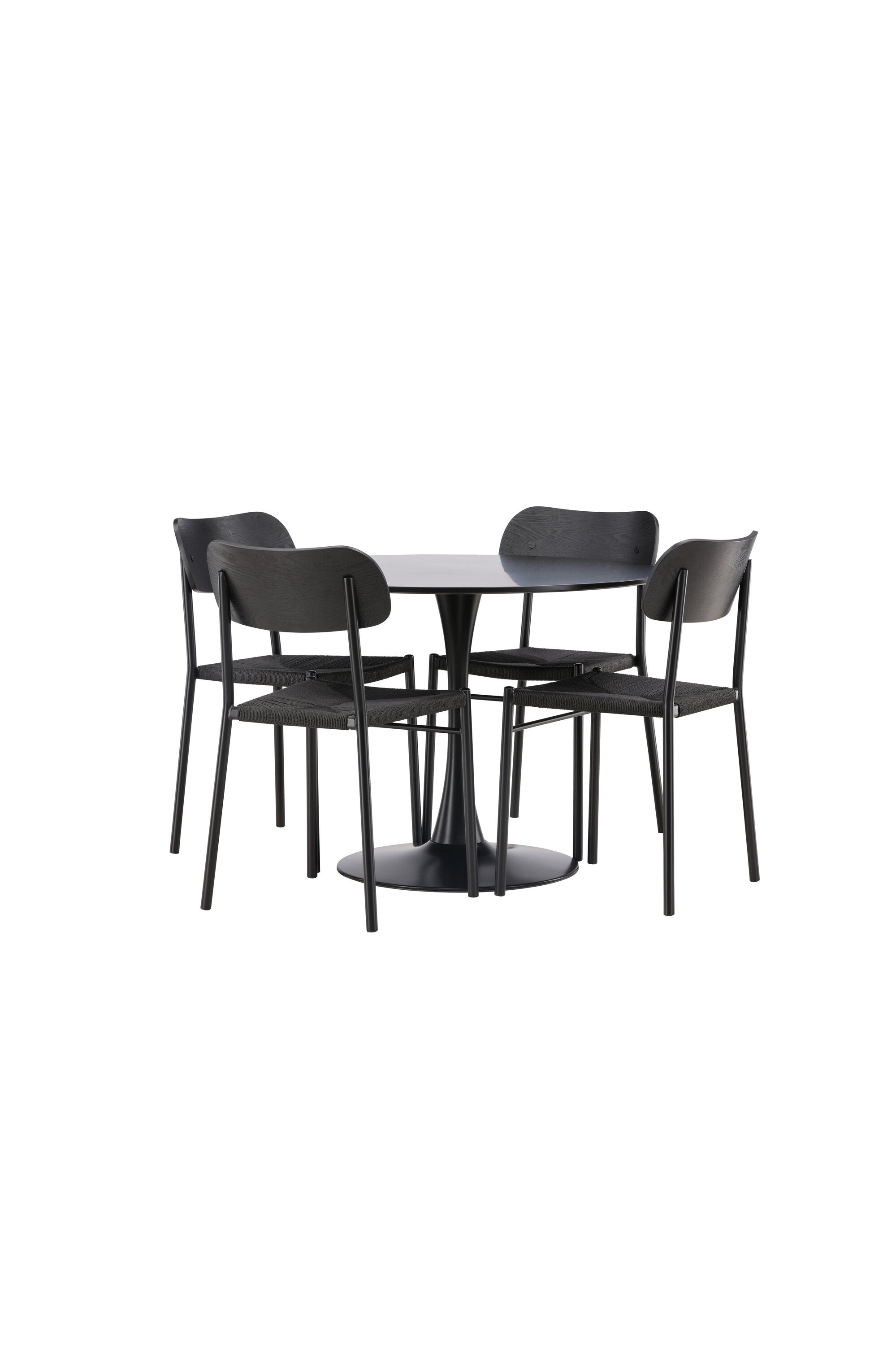 Perfektní jídelní skupina s příjemným pocitem a přitažlivými detaily! Jídelní stůl Glade má stylový skandinávský design se štíhlou trumpetovou nohou z černé oceli a černou desku stolu z MDF. Zde spolu s odpovídajícími černými jídelními židlemi ze série Polly. Židle má opěradlo z černé MDF s dýhou a sedák z módní černé tkaniny z přírodních vláken. Rám a nohy jsou z kovu s černou práškovou barvou. Hodí se stejně dobře do kuchyně jako do obývacího pokoje! Rozměry stolu: 100 cm.