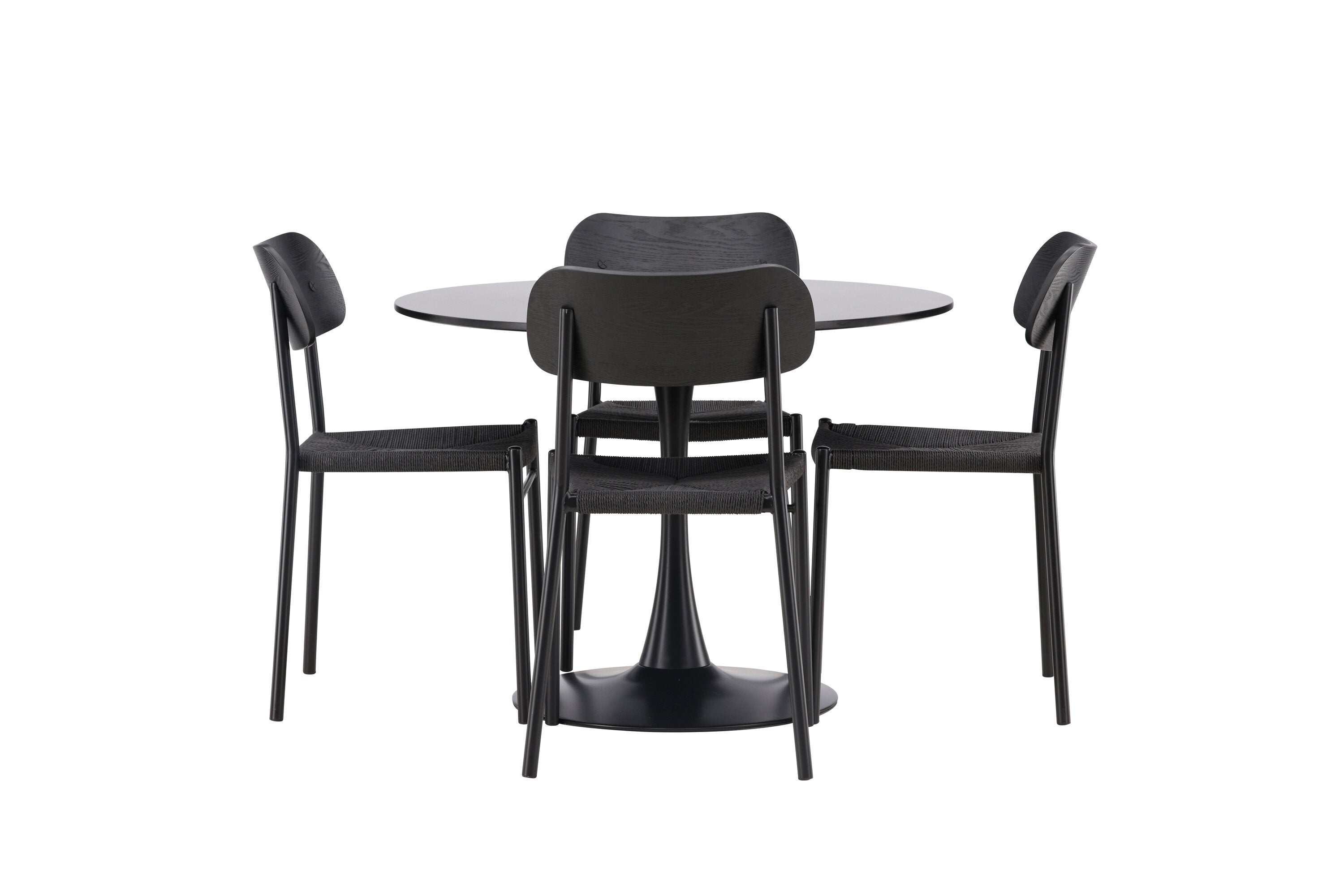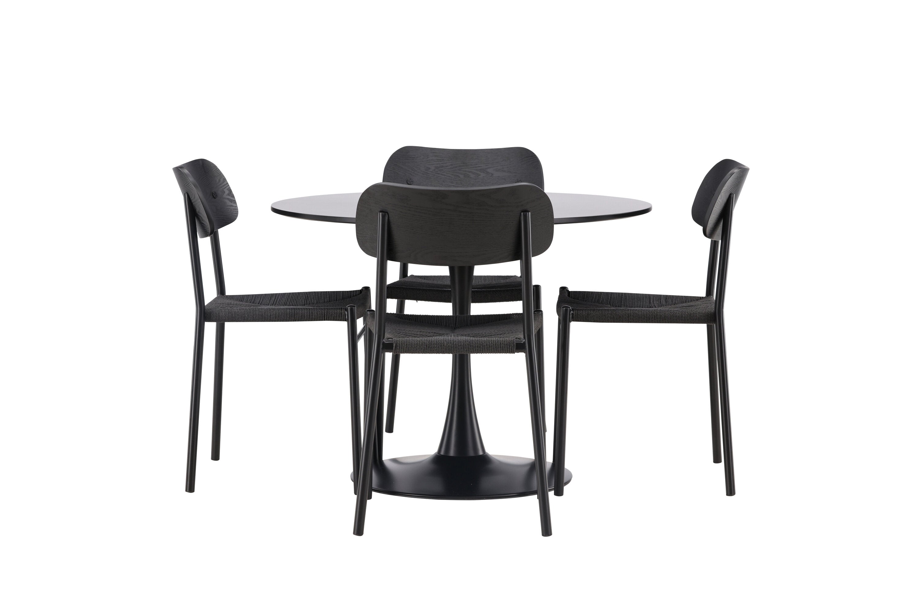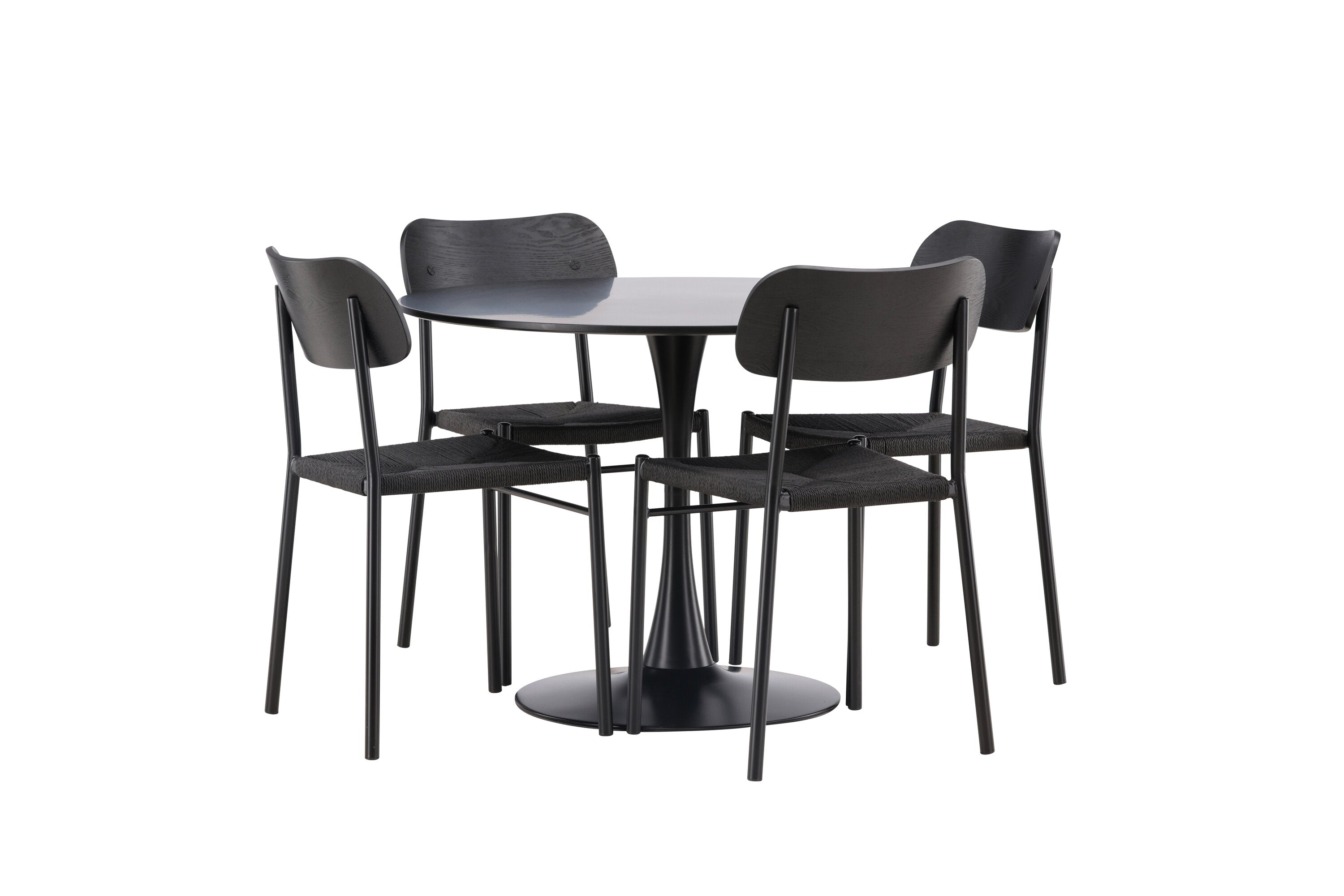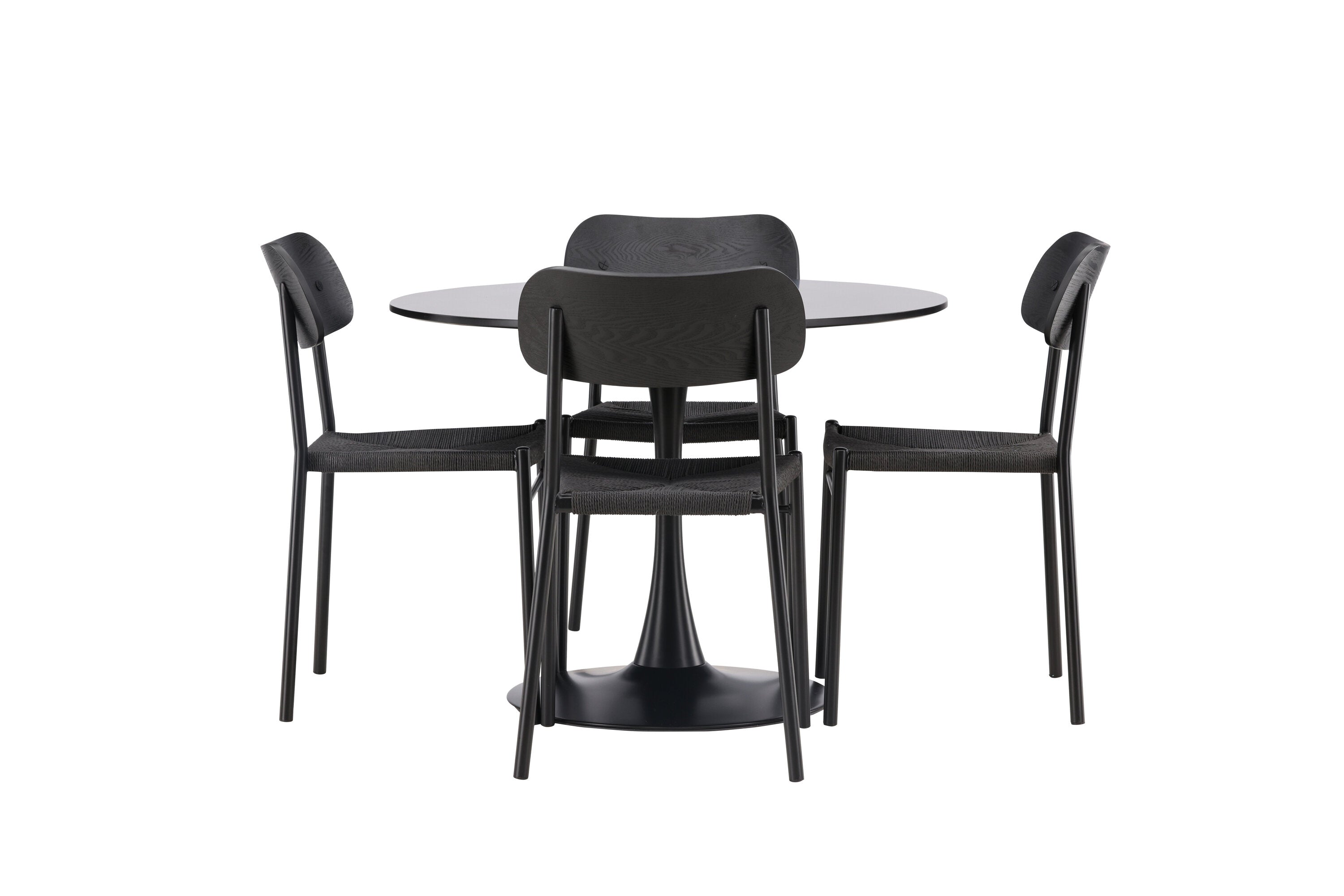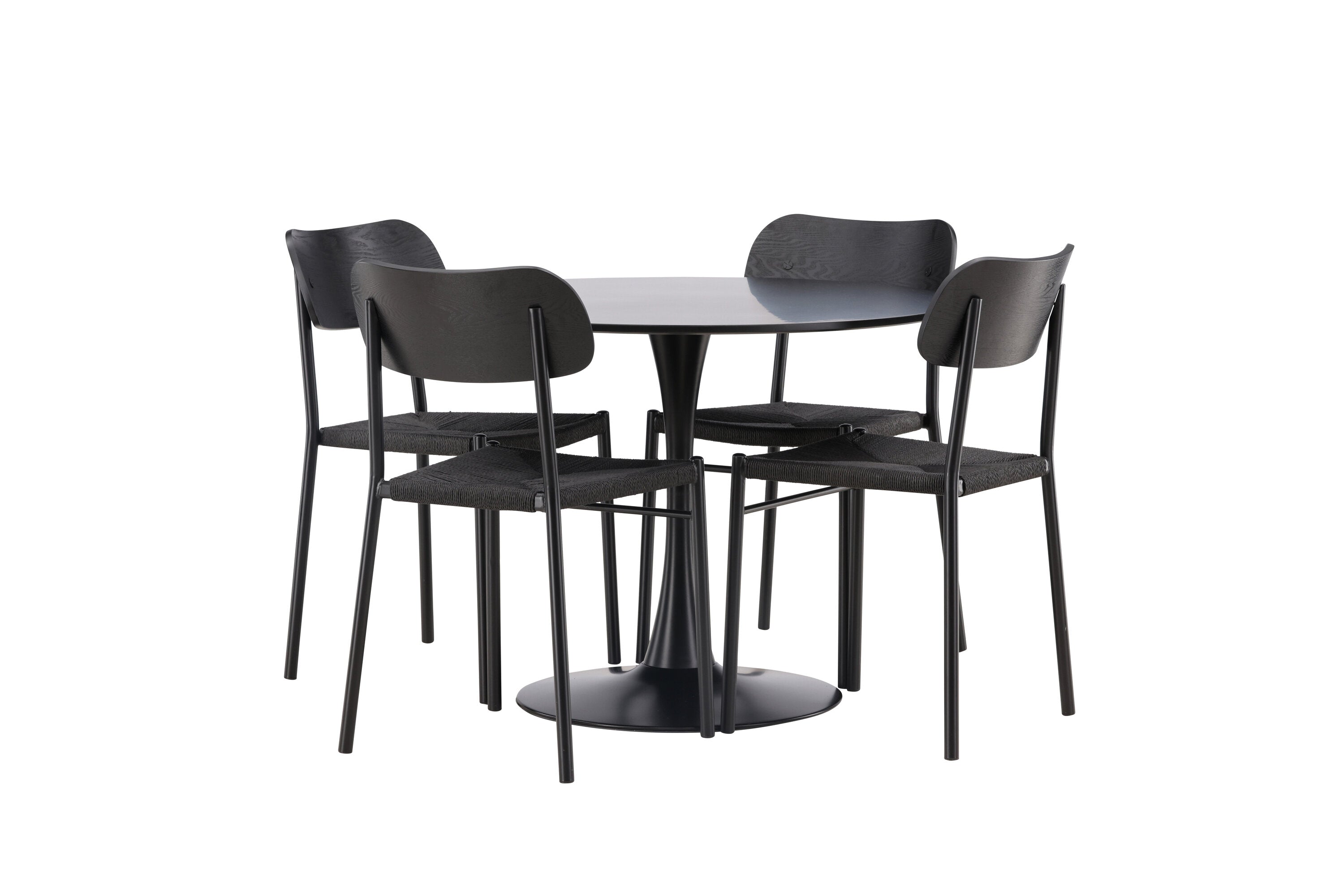 Perfektní jídelní skupina s příjemným pocitem a přitažlivými detaily! Jídelní stůl Glade má stylový skandinávský design se štíhlou trumpetovou nohou z černé oceli a černou desku stolu z MDF. Zde spolu s odpovídajícími černými jídelními židlemi ze série Polly. Židle má opěradlo z černé MDF s dýhou a sedák z módní černé tkaniny z přírodních vláken. Rám a nohy jsou z kovu s černou práškovou barvou. Hodí se stejně dobře do kuchyně jako do obývacího pokoje! Rozměry stolu: 100 cm.