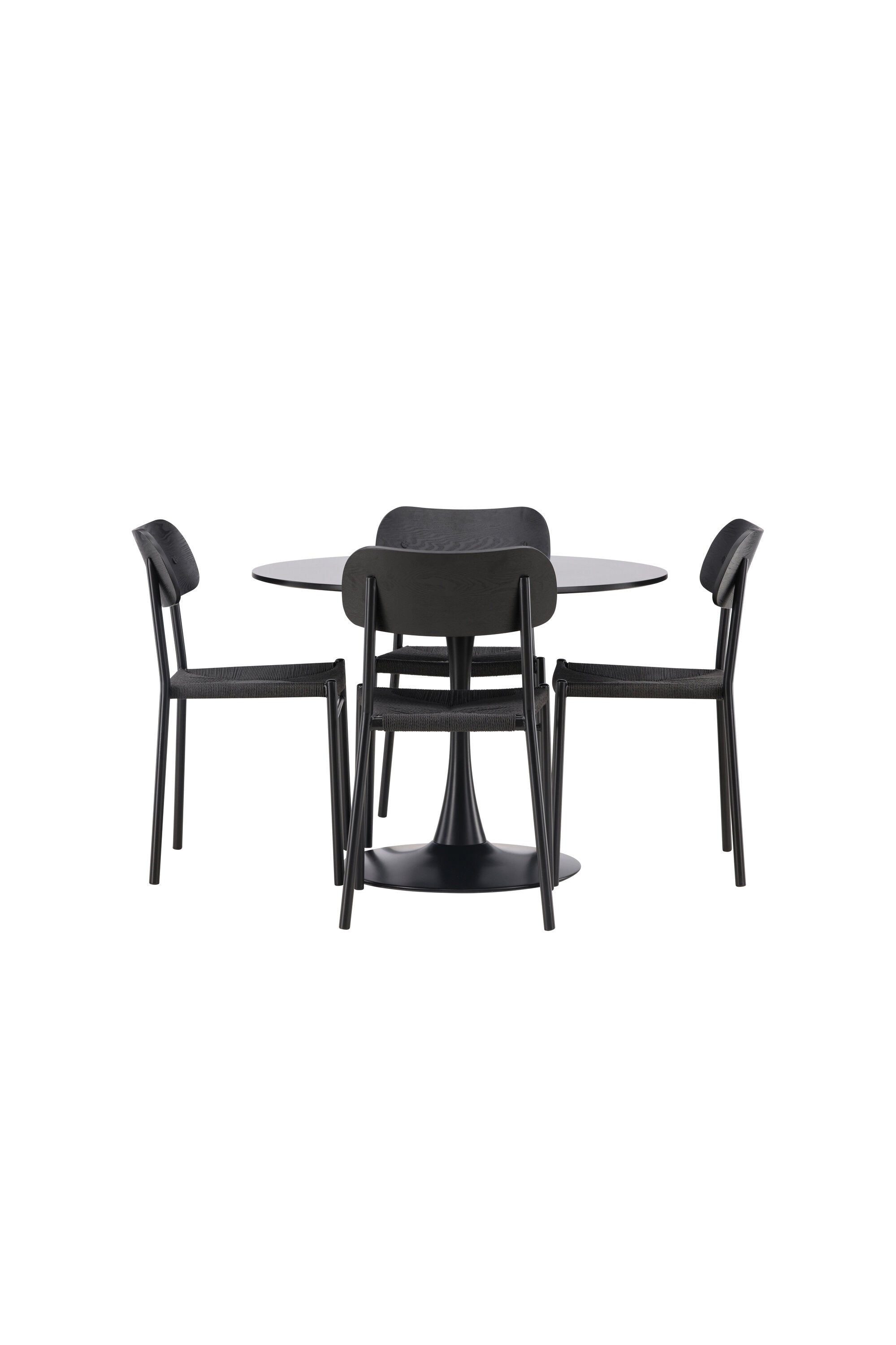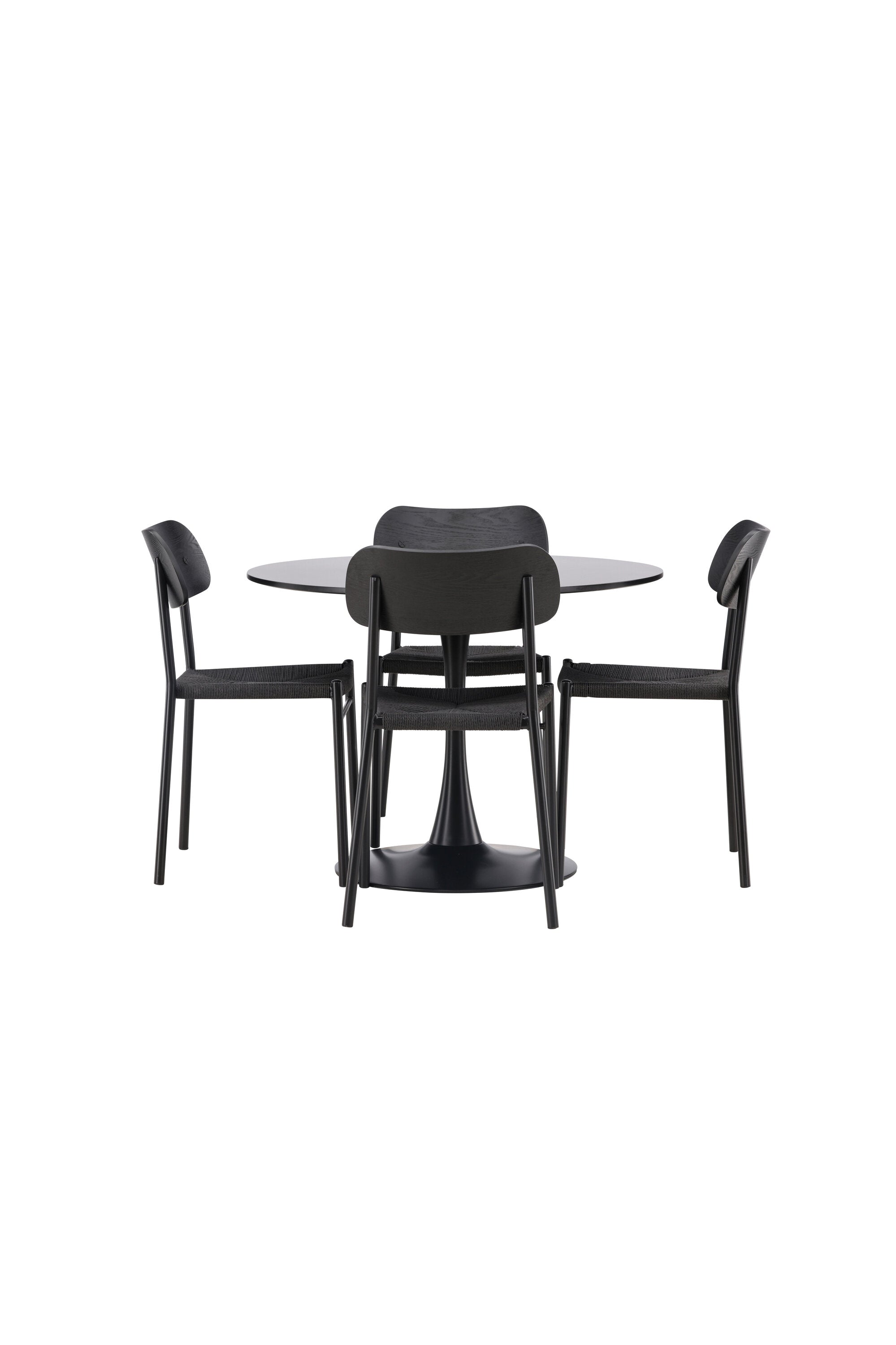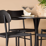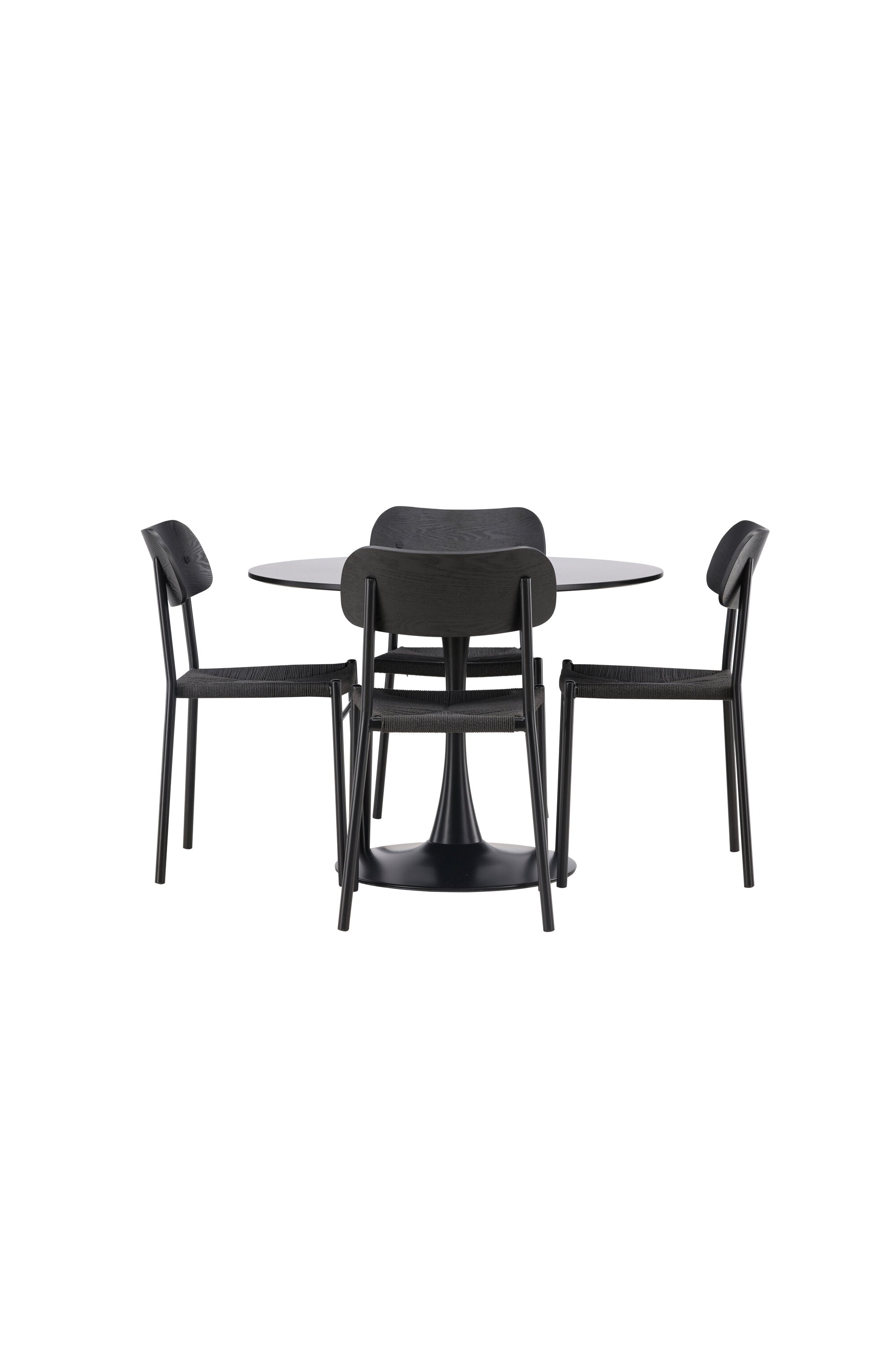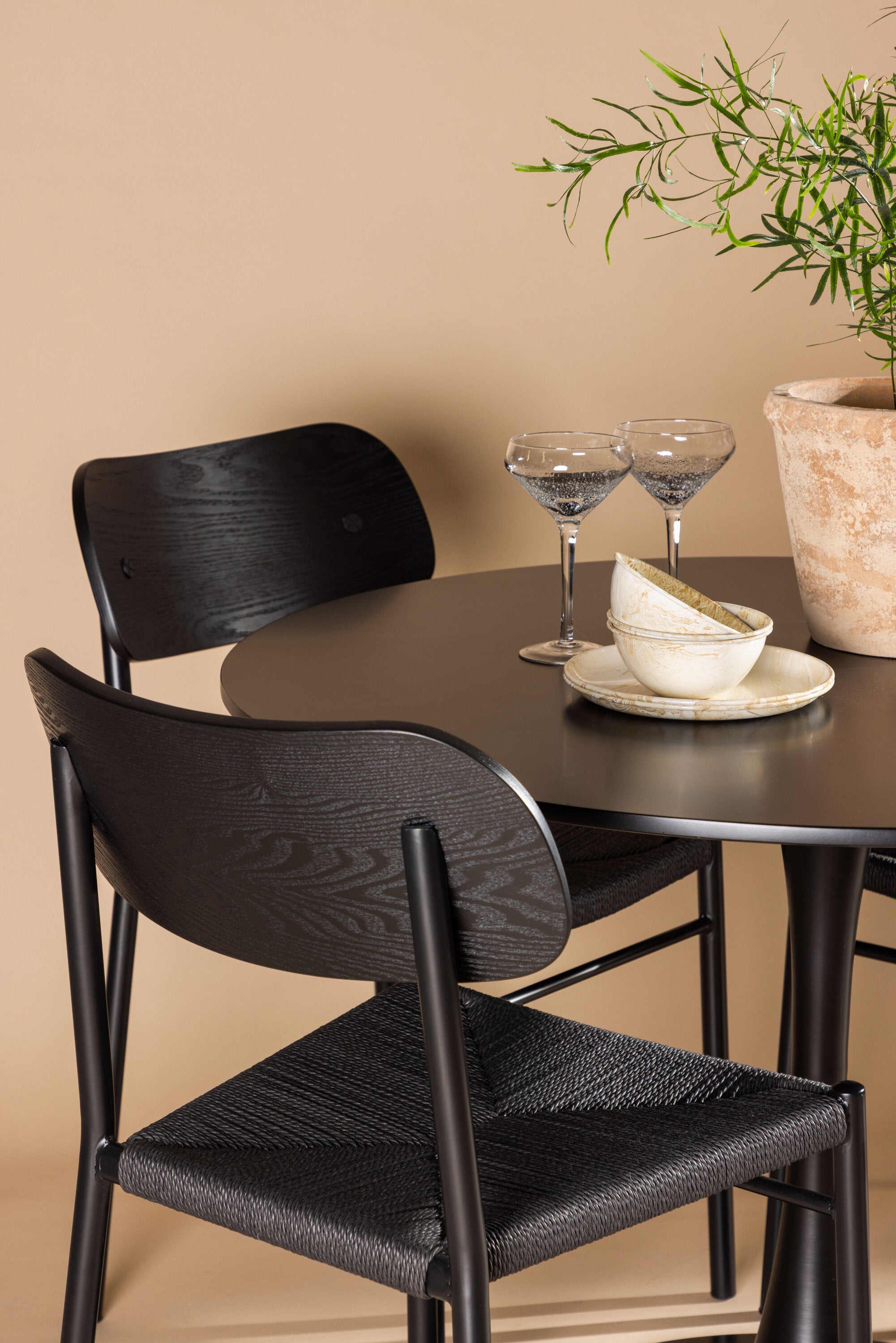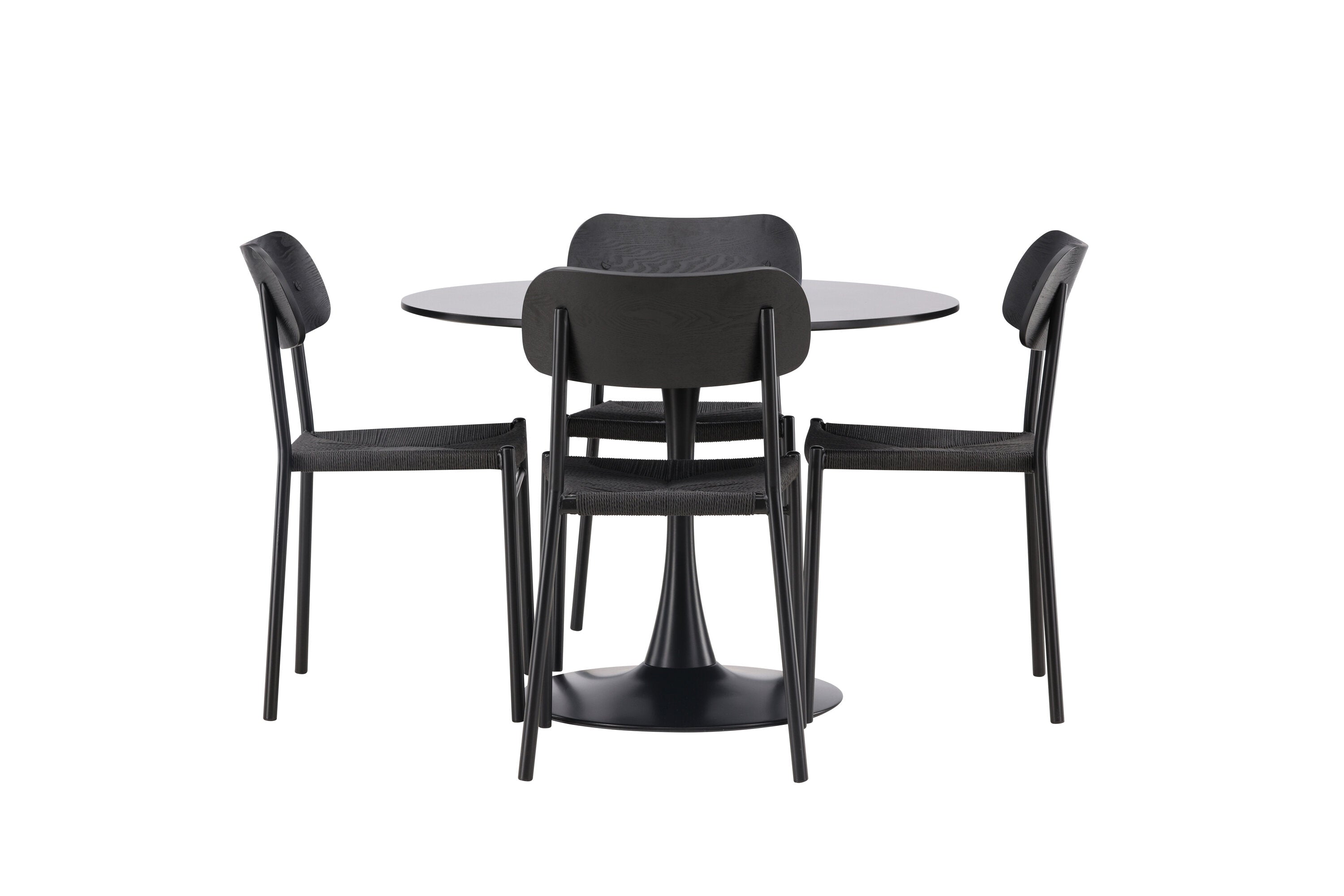 Perfektní jídelní skupina s příjemným pocitem a přitažlivými detaily! Jídelní stůl Glade má stylový skandinávský design se štíhlou trumpetovou nohou z černé oceli a černou desku stolu z MDF. Zde spolu s odpovídajícími černými jídelními židlemi ze série Polly. Židle má opěradlo z černé MDF s dýhou a sedák z módní černé tkaniny z přírodních vláken. Rám a nohy jsou z kovu s černou práškovou barvou. Hodí se stejně dobře do kuchyně jako do obývacího pokoje! Rozměry stolu: 100 cm.