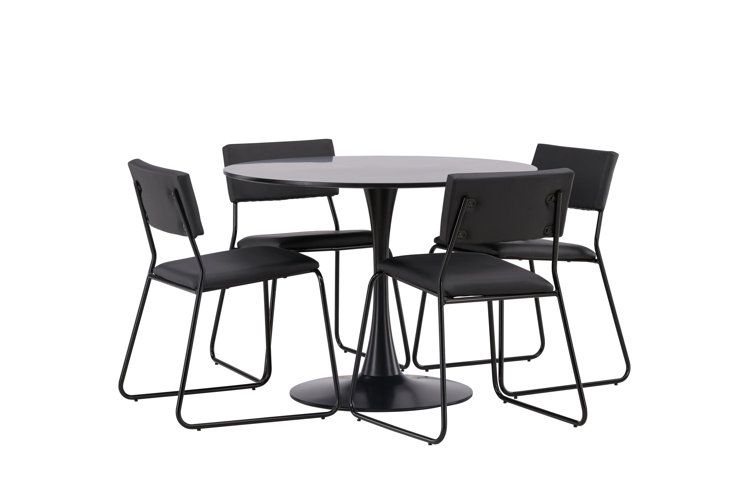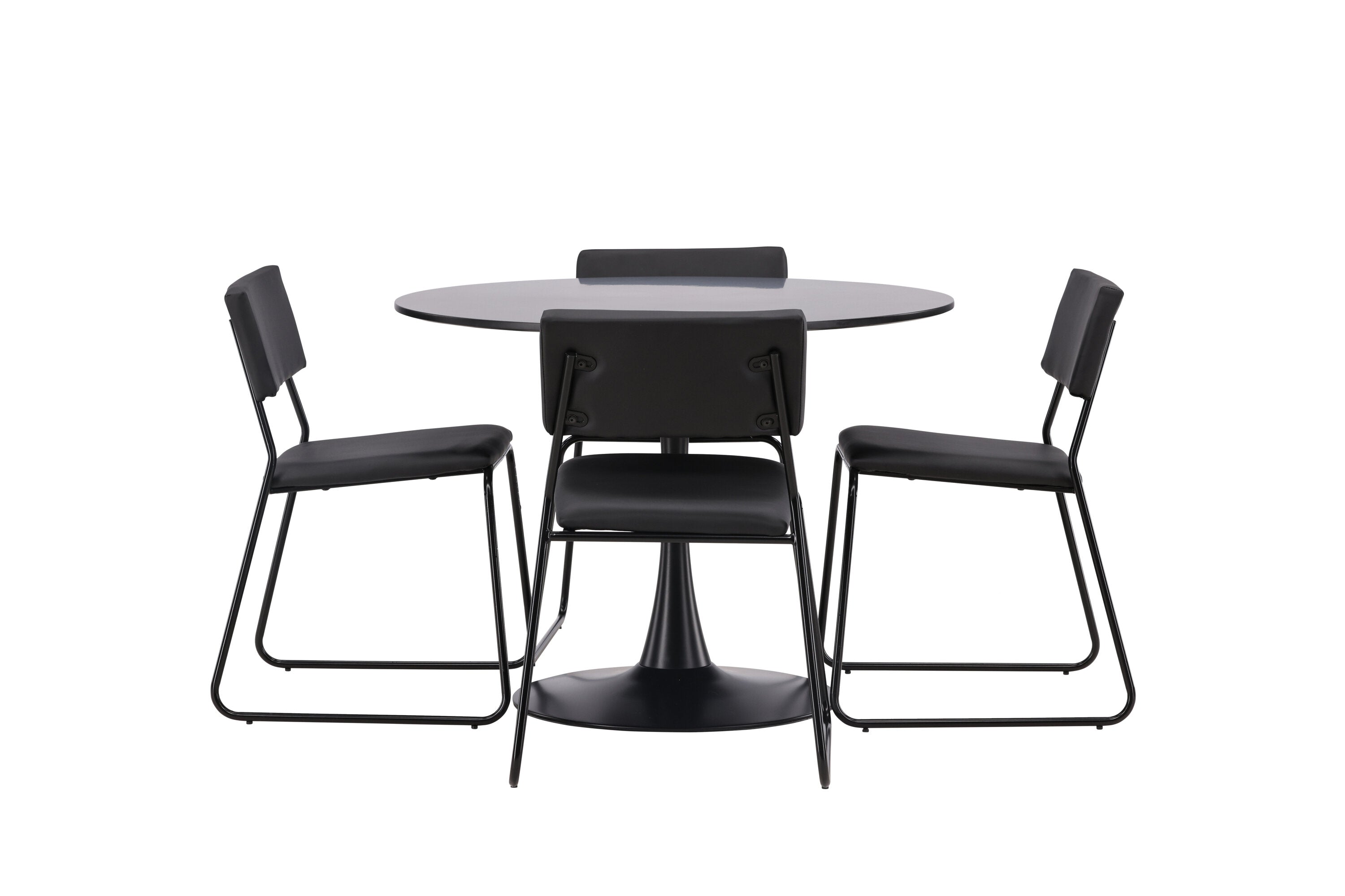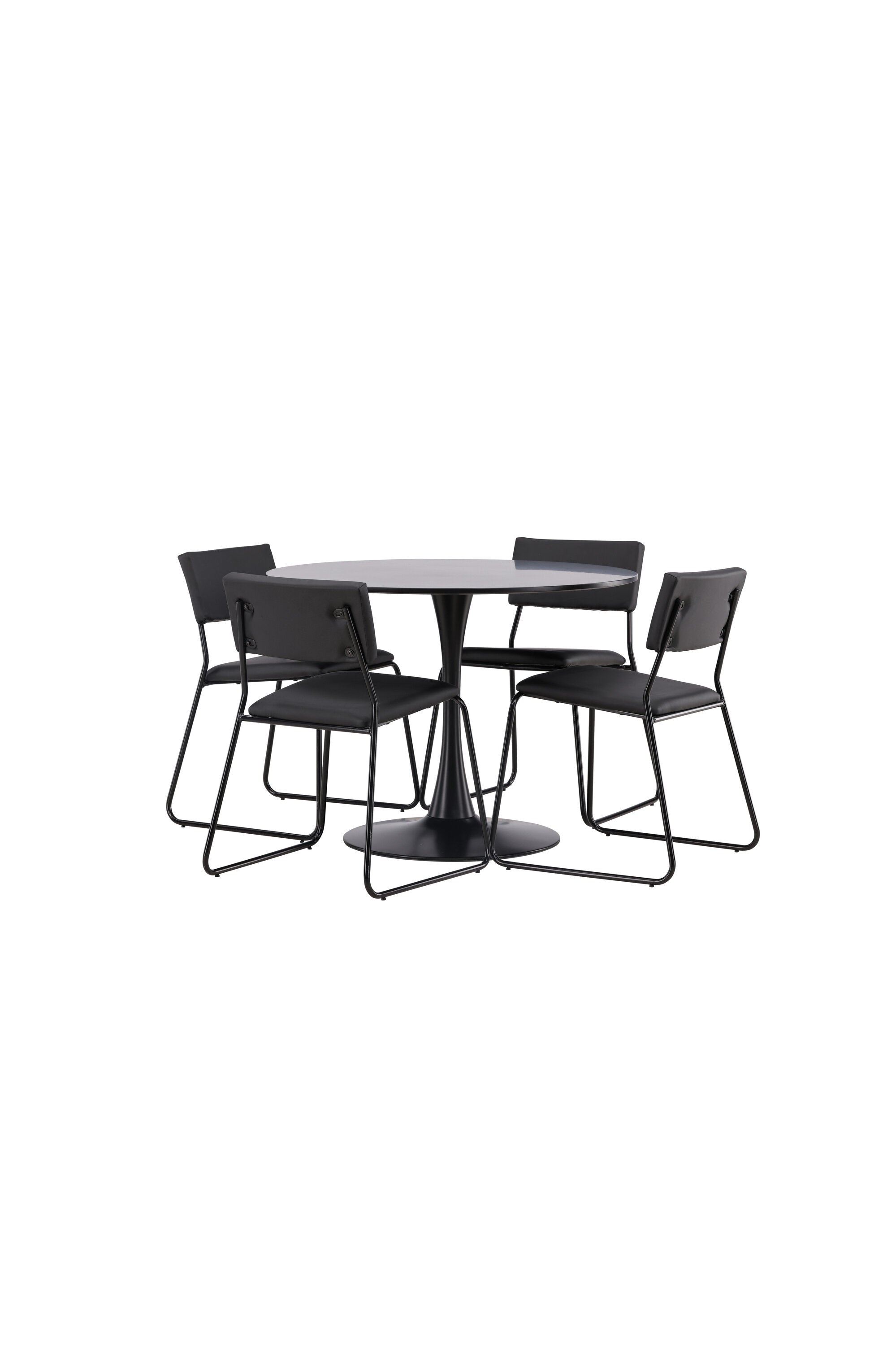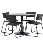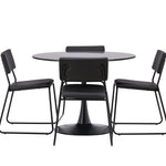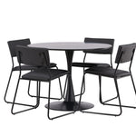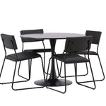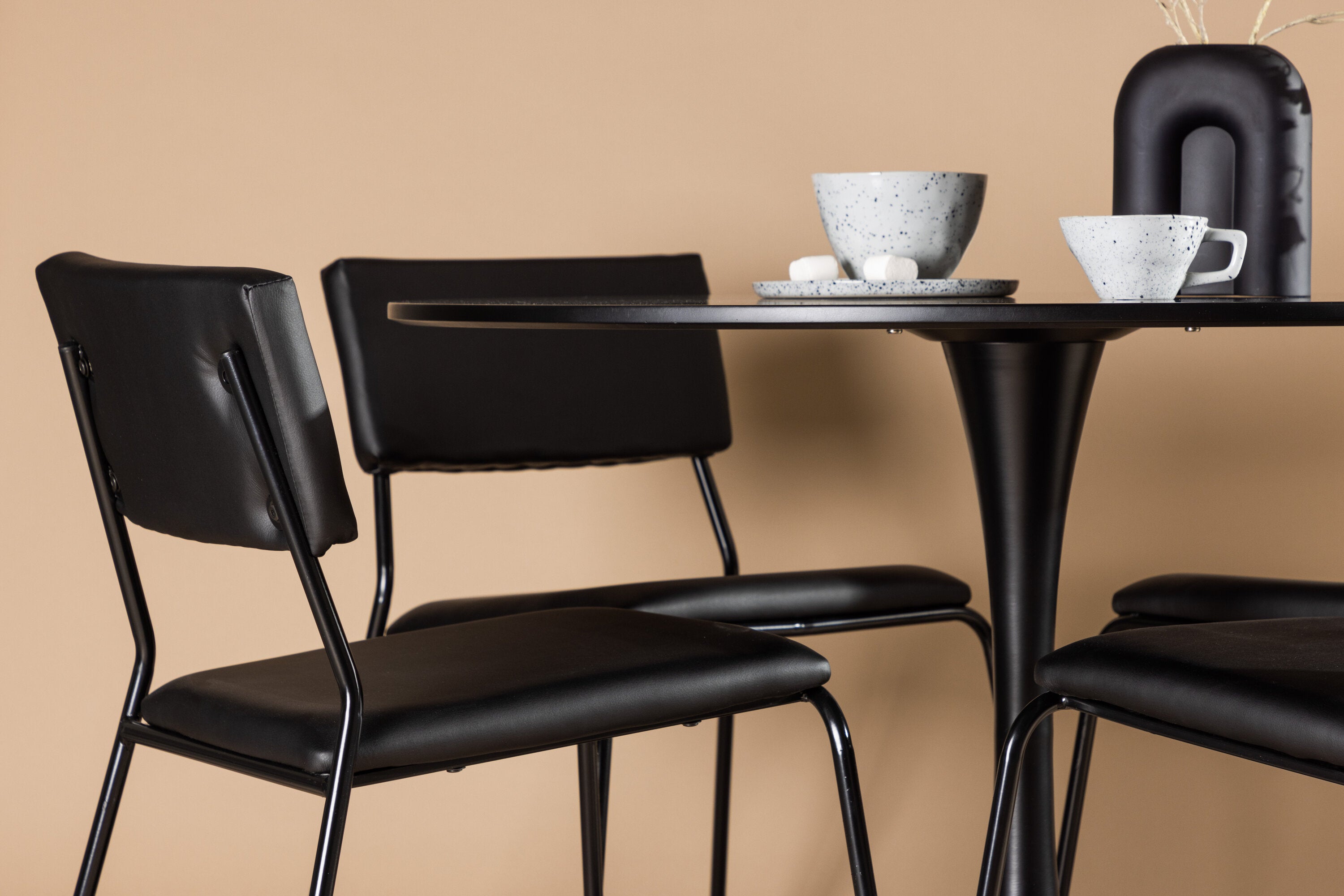 Minimalistický a trendový – jídelní sestava se všemi správnými funkcemi! Jídelní stůl Glade má stylový skandinávský design se štíhlou trumpetovou nohou z černé oceli a černou desku stolu z MDF. Zde společně s našimi černými jídelními židlemi ze série Kenth. Minimalistický, moderní design vytváří vzdušný pocit. Židle má opěradlo a sedák z černé polyuretanové kůže a polyesteru a ozdobné úzké nohy ze železa. Ozdobte srdce domova nadčasově a stylově! Rozměry stolu: 100 cm.