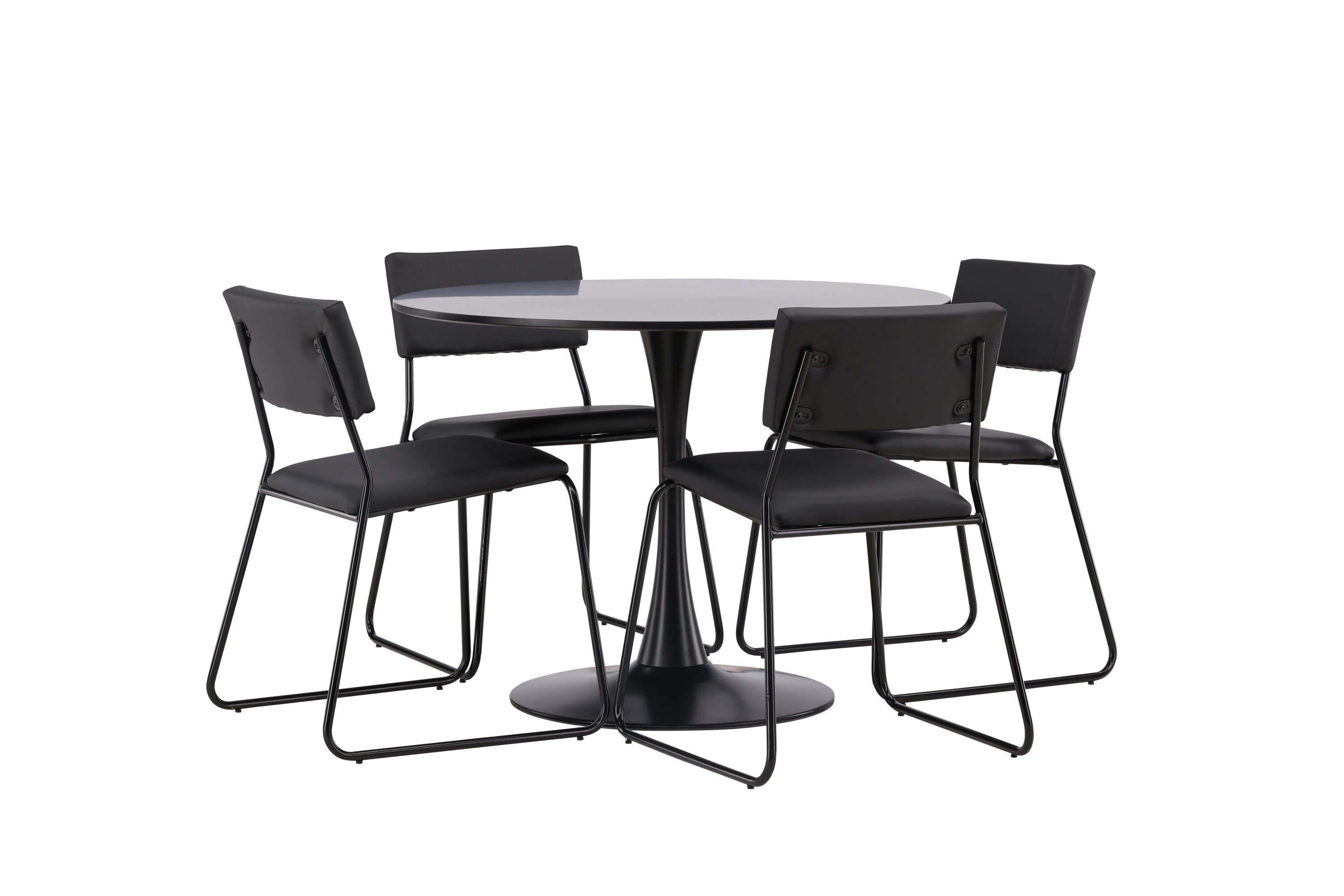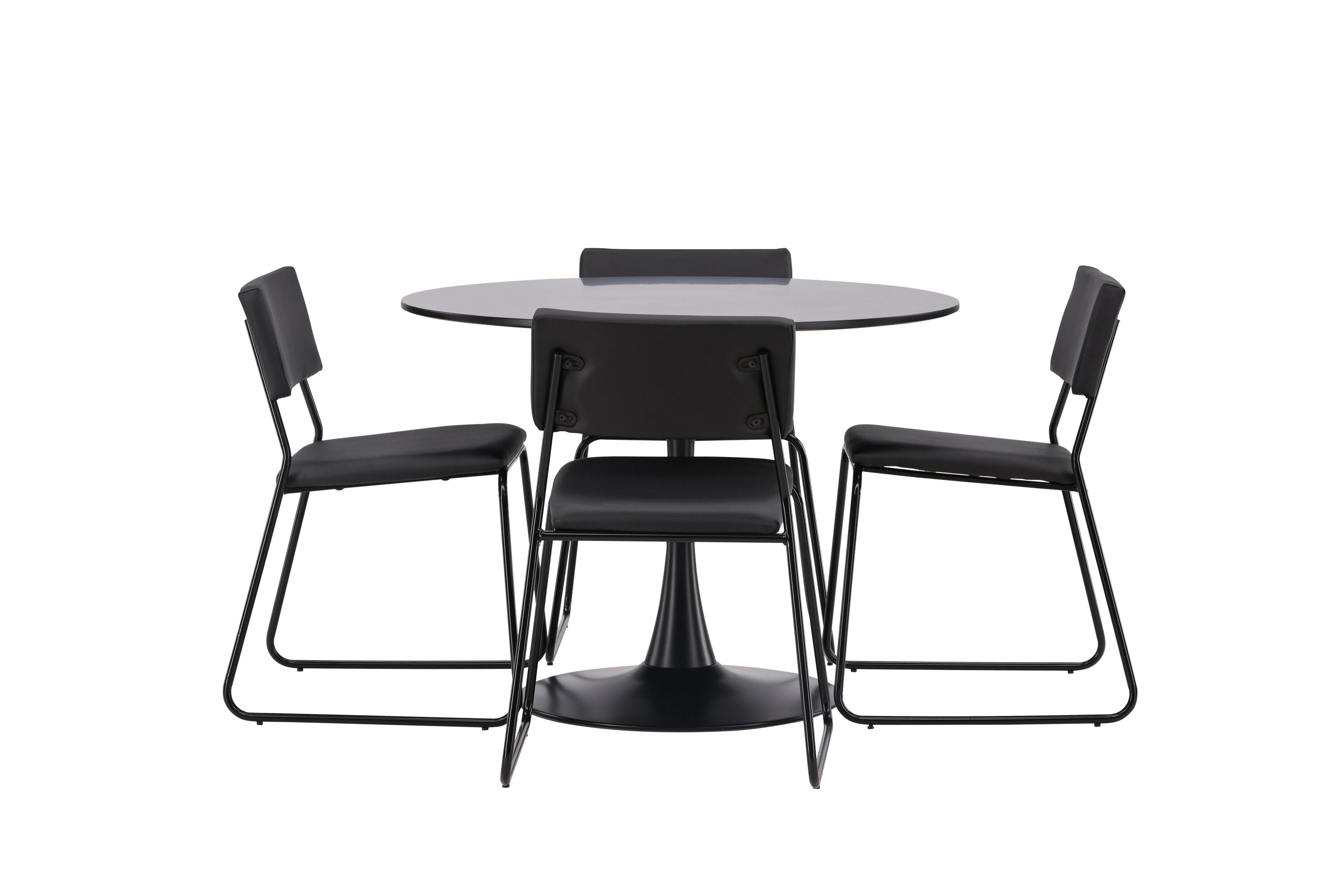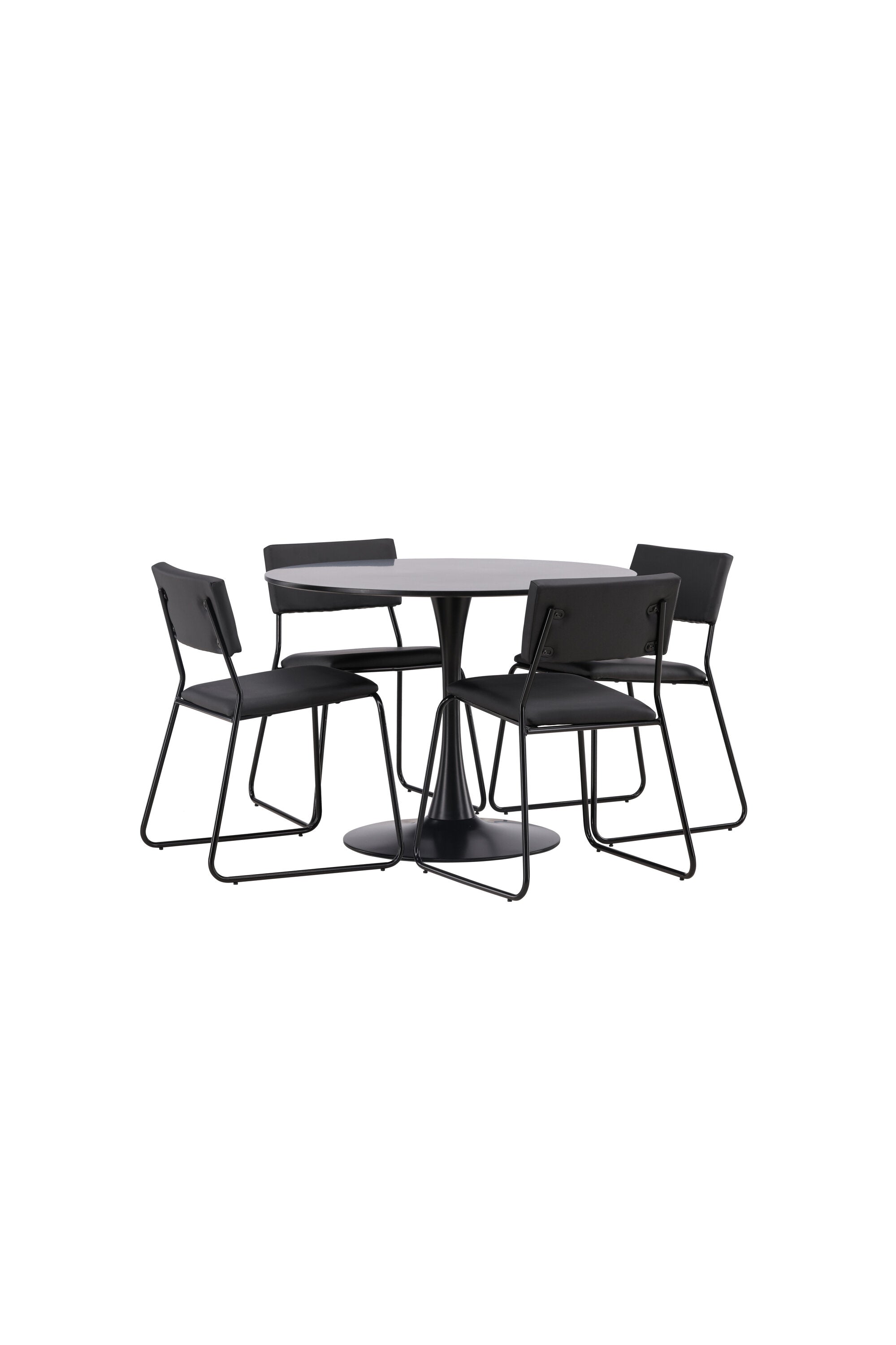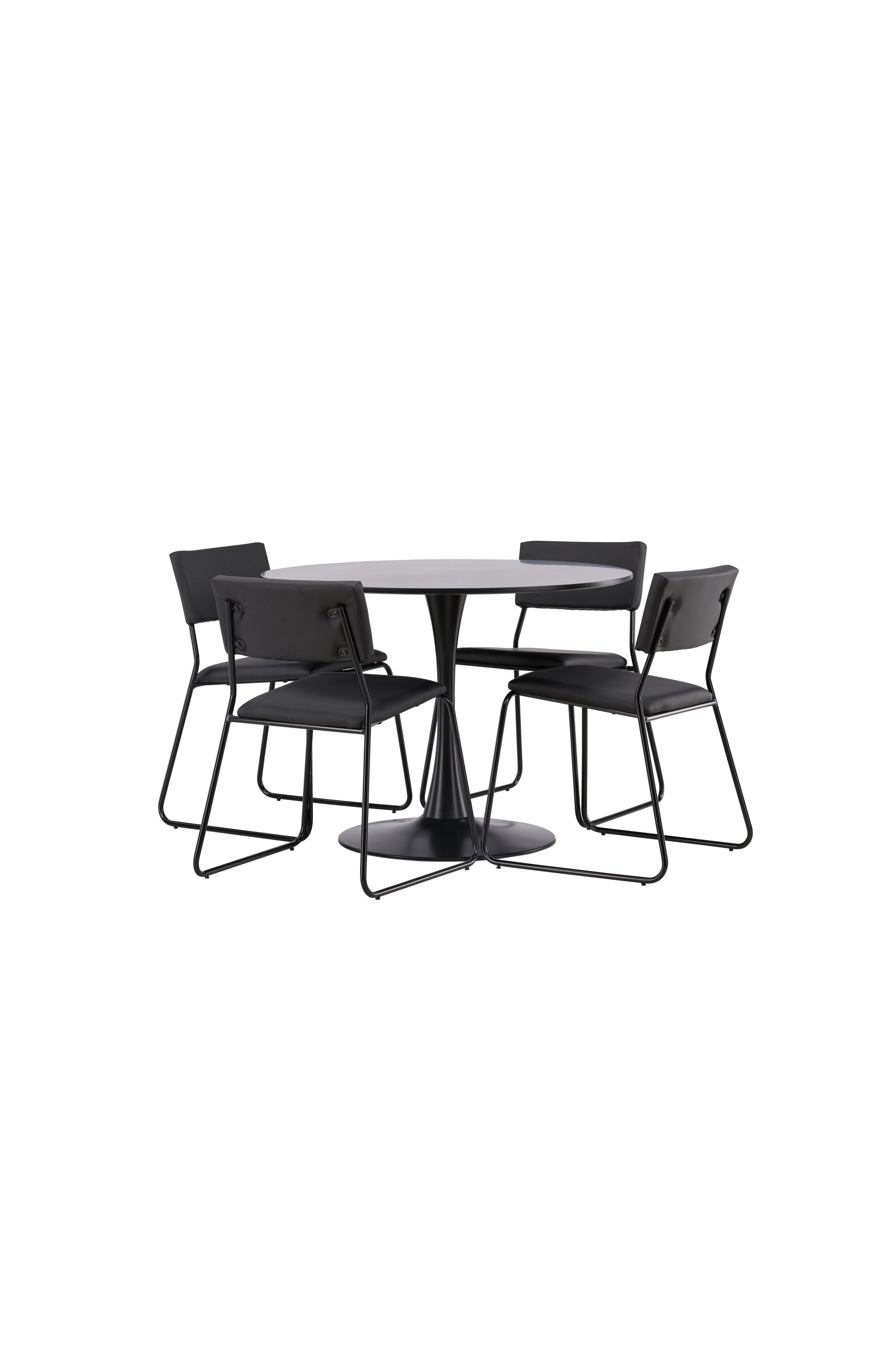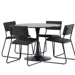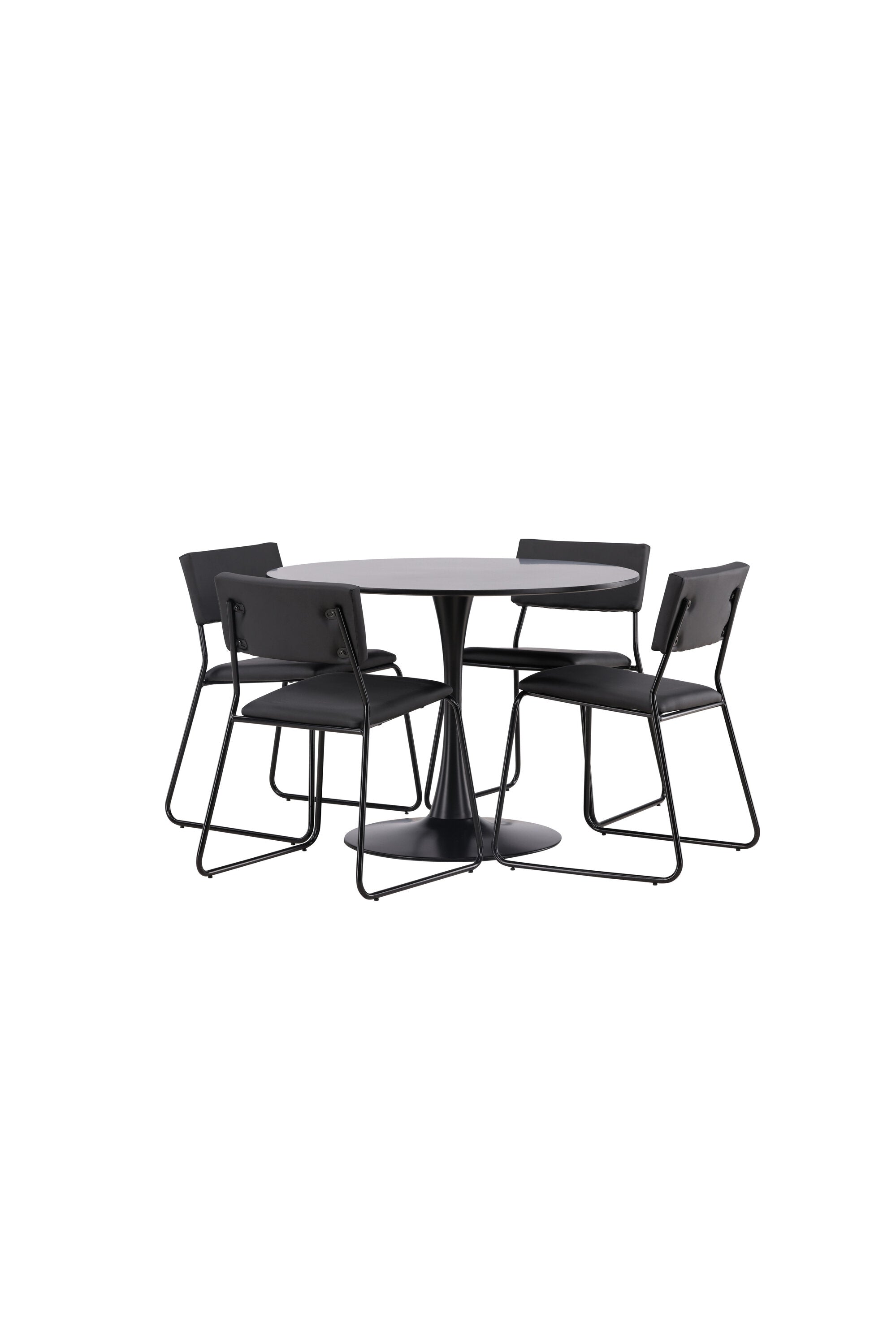 Minimalistický a trendový – jídelní sestava se všemi správnými funkcemi! Jídelní stůl Glade má stylový skandinávský design se štíhlou trumpetovou nohou z černé oceli a černou desku stolu z MDF. Zde společně s našimi černými jídelními židlemi ze série Kenth. Minimalistický, moderní design vytváří vzdušný pocit. Židle má opěradlo a sedák z černé polyuretanové kůže a polyesteru a ozdobné úzké nohy ze železa. Ozdobte srdce domova nadčasově a stylově! Rozměry stolu: 100 cm.