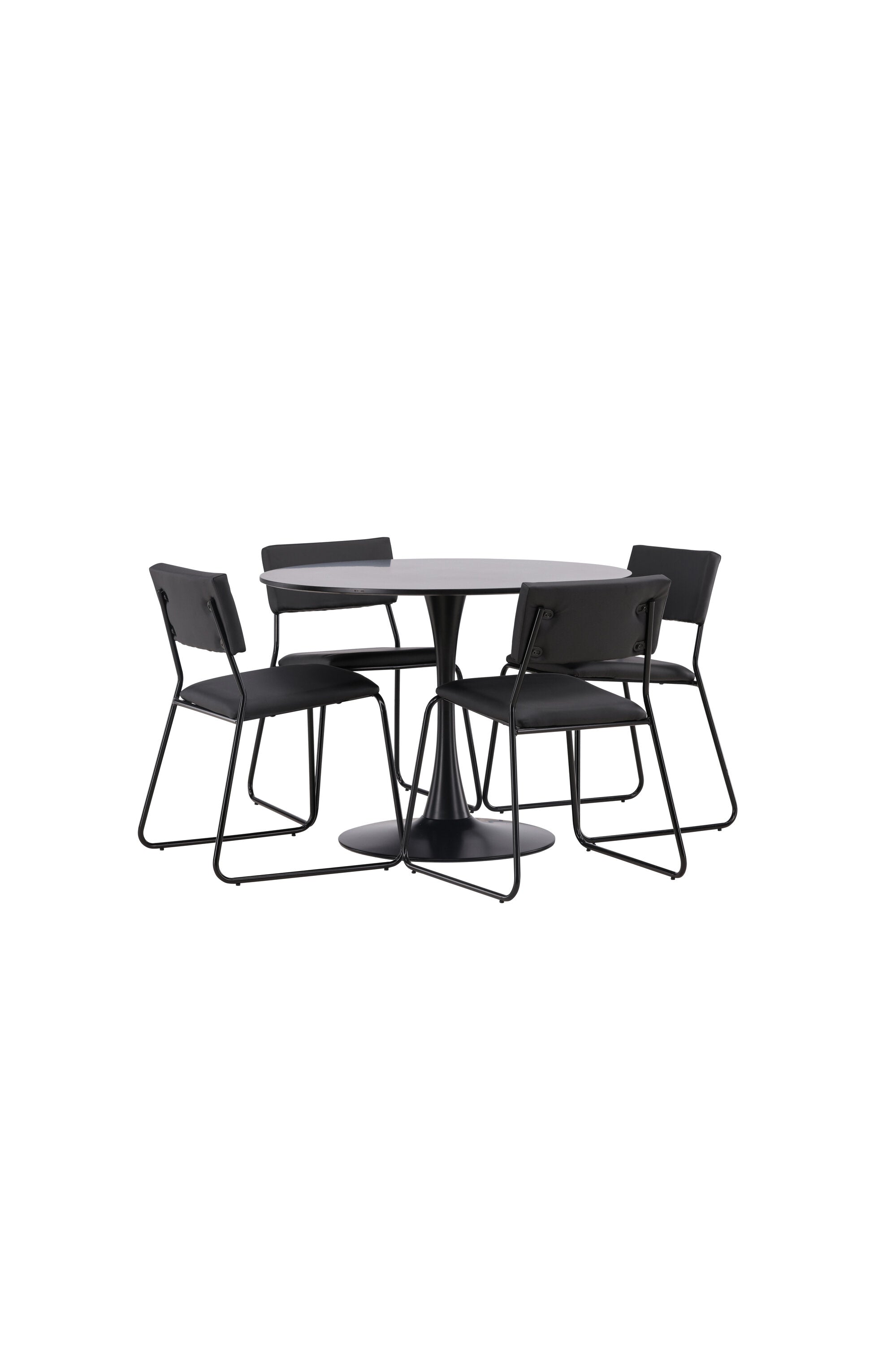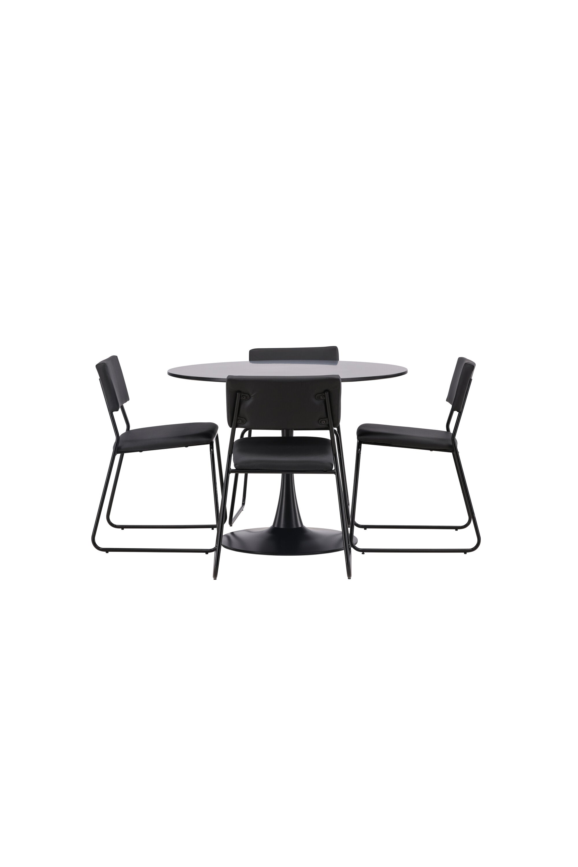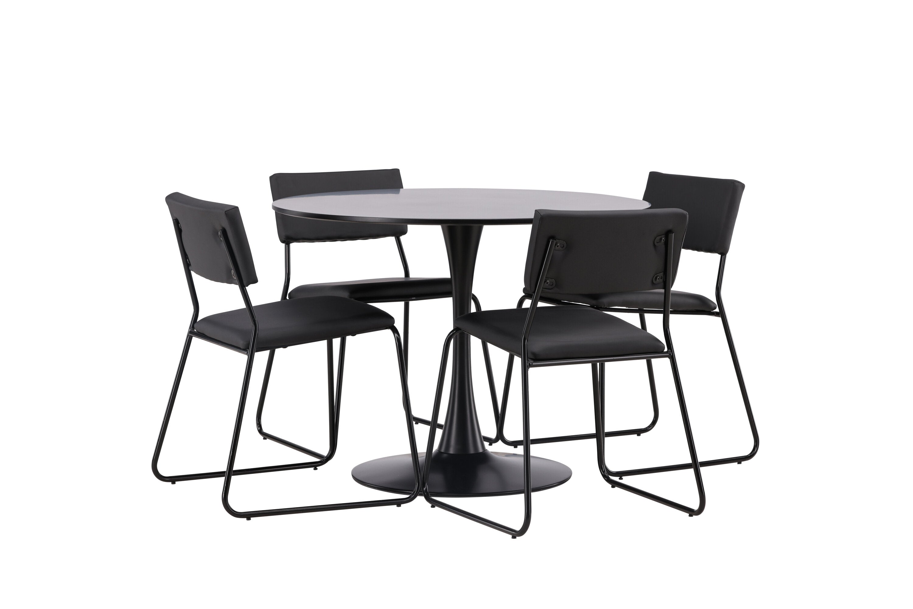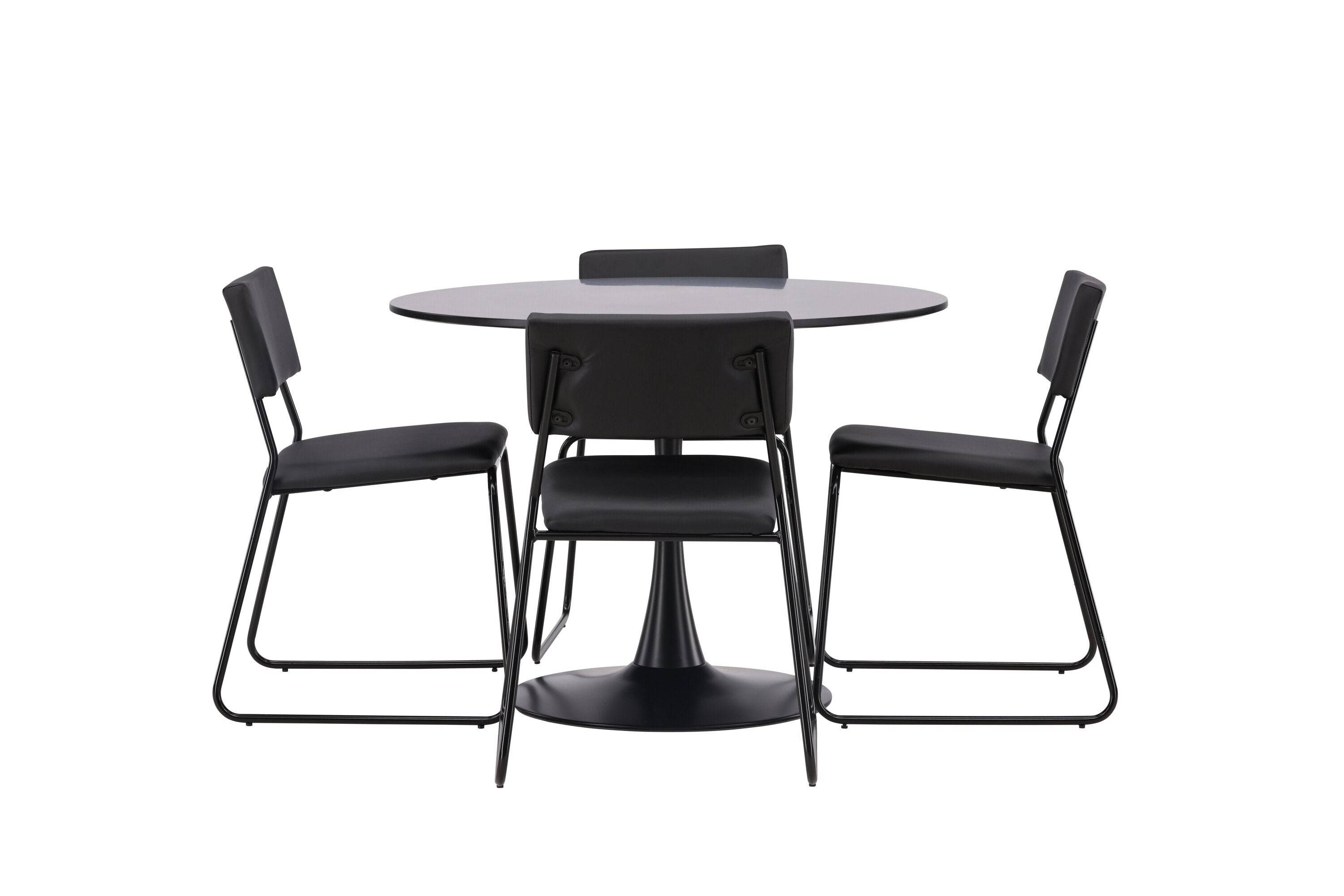 Minimalistický a trendový – jídelní sestava se všemi správnými funkcemi! Jídelní stůl Glade má stylový skandinávský design se štíhlou trumpetovou nohou z černé oceli a černou desku stolu z MDF. Zde společně s našimi černými jídelními židlemi ze série Kenth. Minimalistický, moderní design vytváří vzdušný pocit. Židle má opěradlo a sedák z černé polyuretanové kůže a polyesteru a ozdobné úzké nohy ze železa. Ozdobte srdce domova nadčasově a stylově! Rozměry stolu: 100 cm.