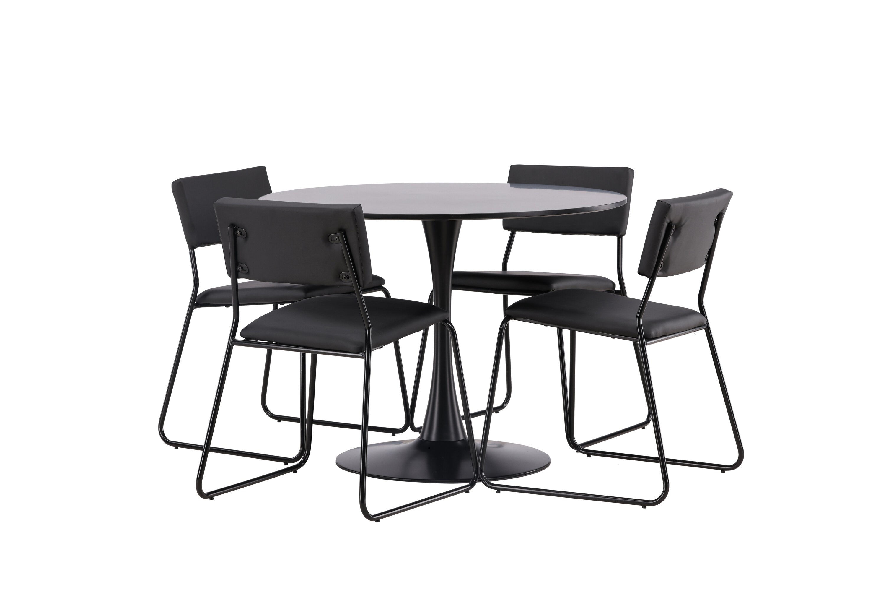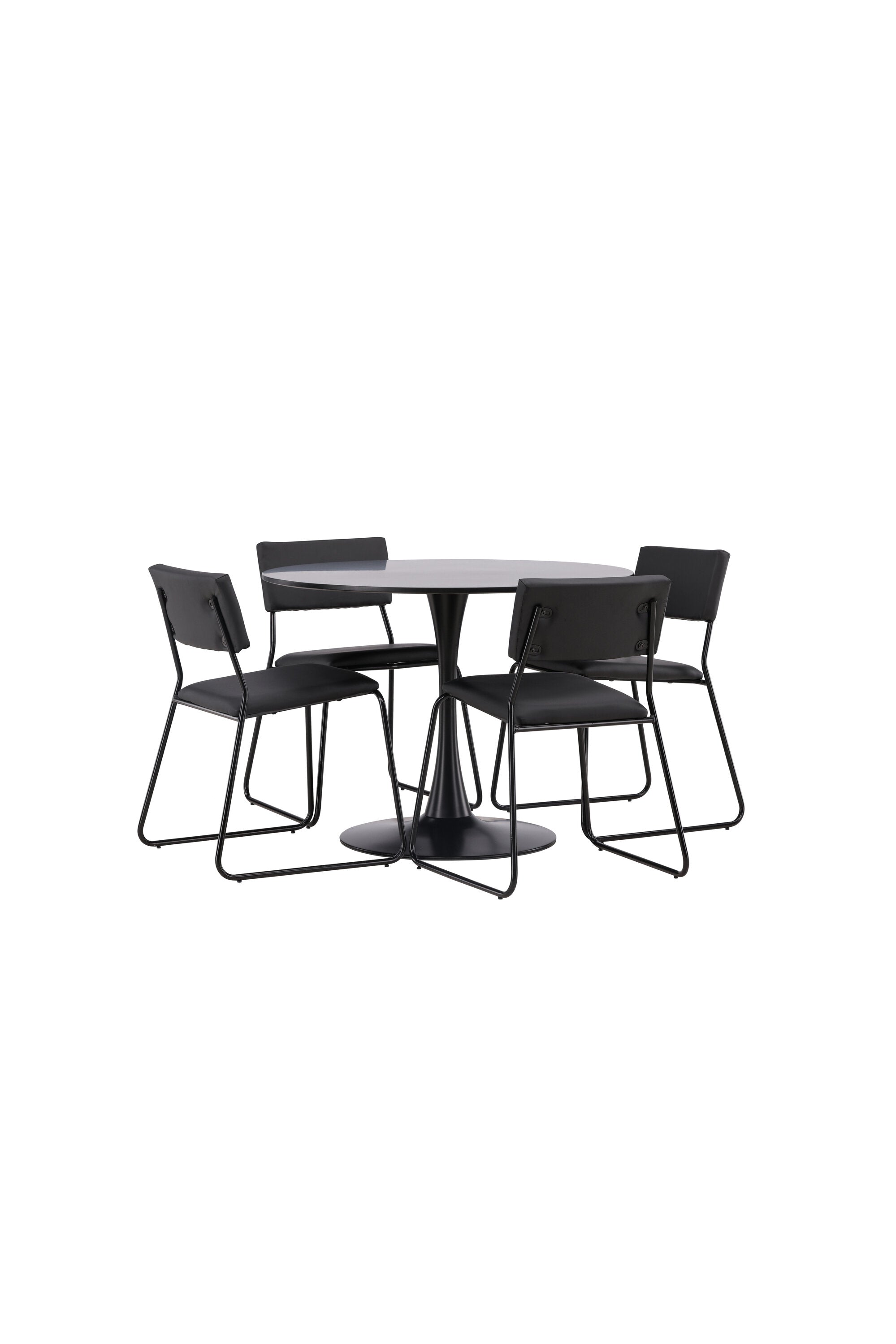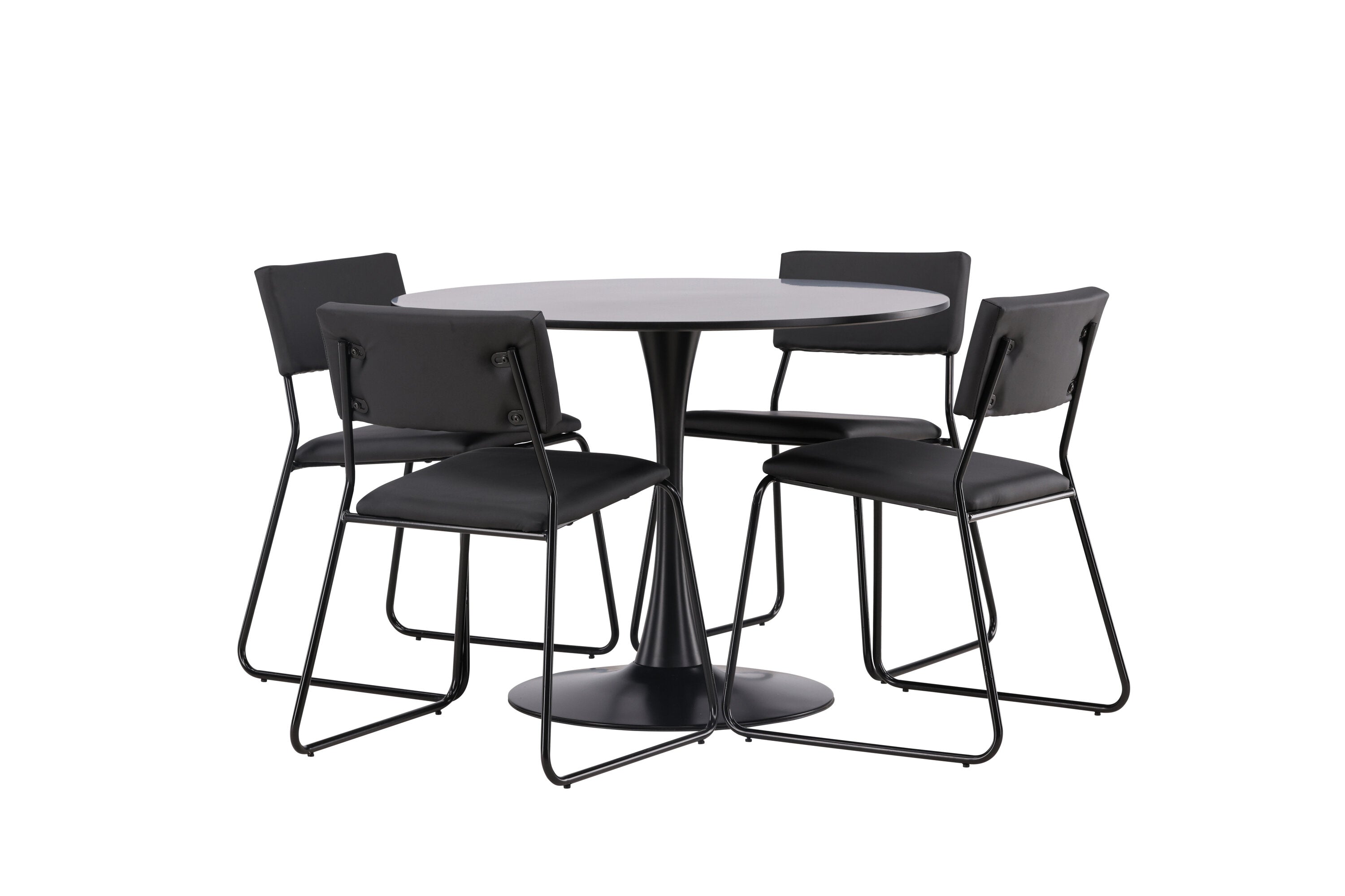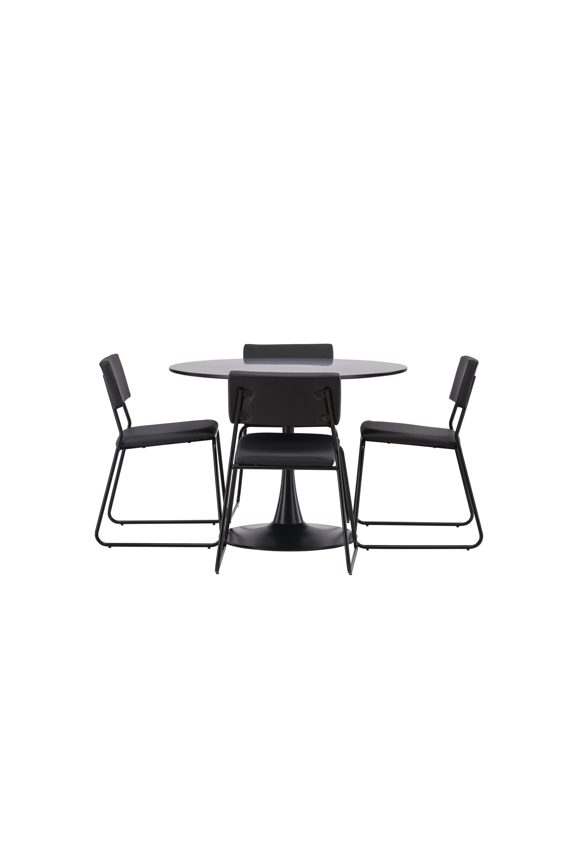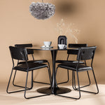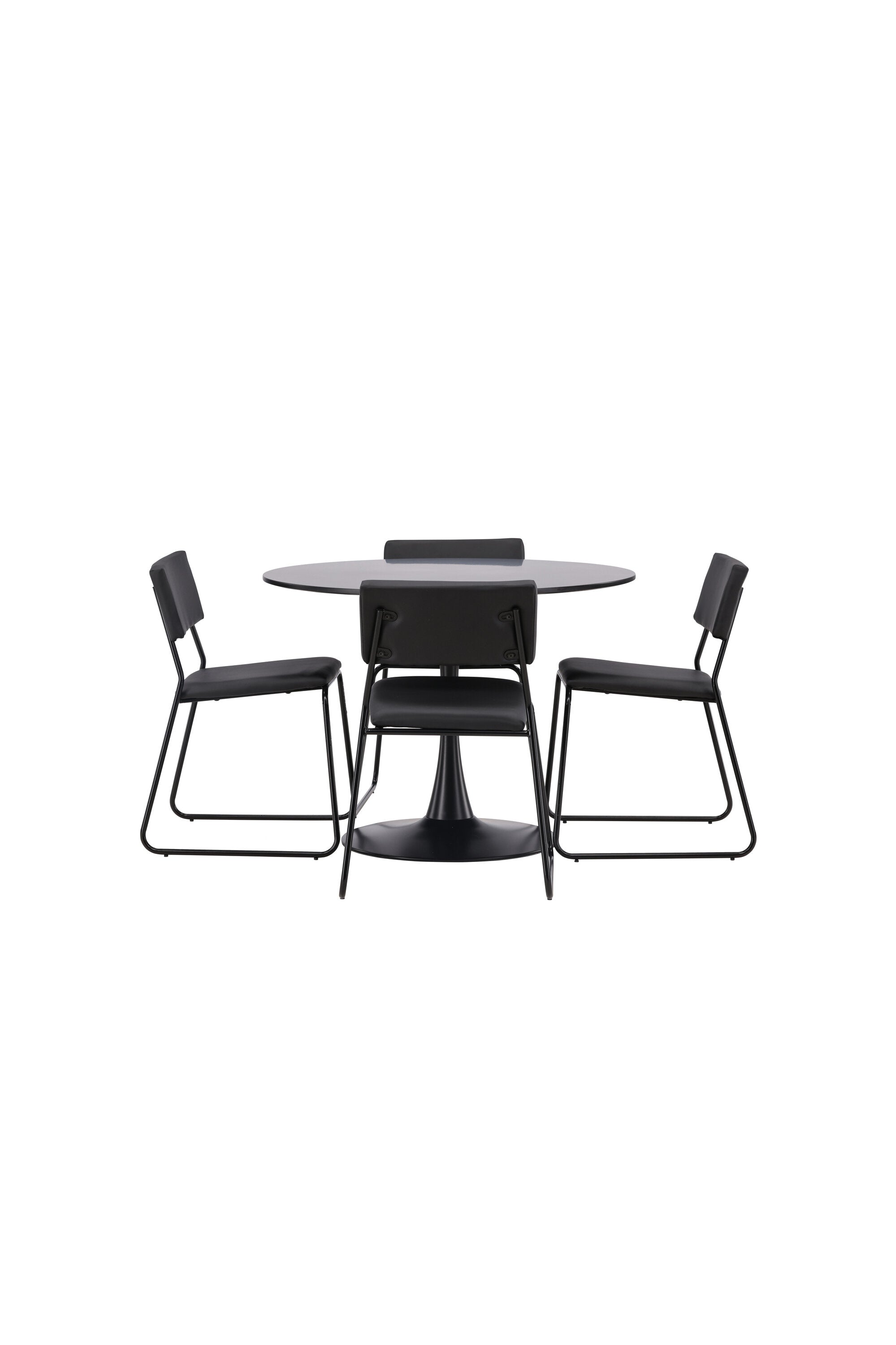 Minimalistický a trendový – jídelní sestava se všemi správnými funkcemi! Jídelní stůl Glade má stylový skandinávský design se štíhlou trumpetovou nohou z černé oceli a černou desku stolu z MDF. Zde společně s našimi černými jídelními židlemi ze série Kenth. Minimalistický, moderní design vytváří vzdušný pocit. Židle má opěradlo a sedák z černé polyuretanové kůže a polyesteru a ozdobné úzké nohy ze železa. Ozdobte srdce domova nadčasově a stylově! Rozměry stolu: 100 cm.
