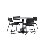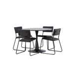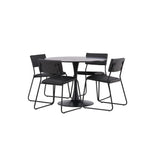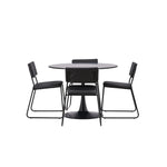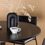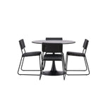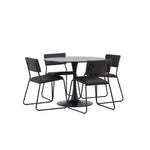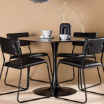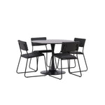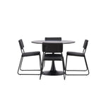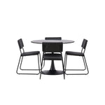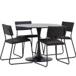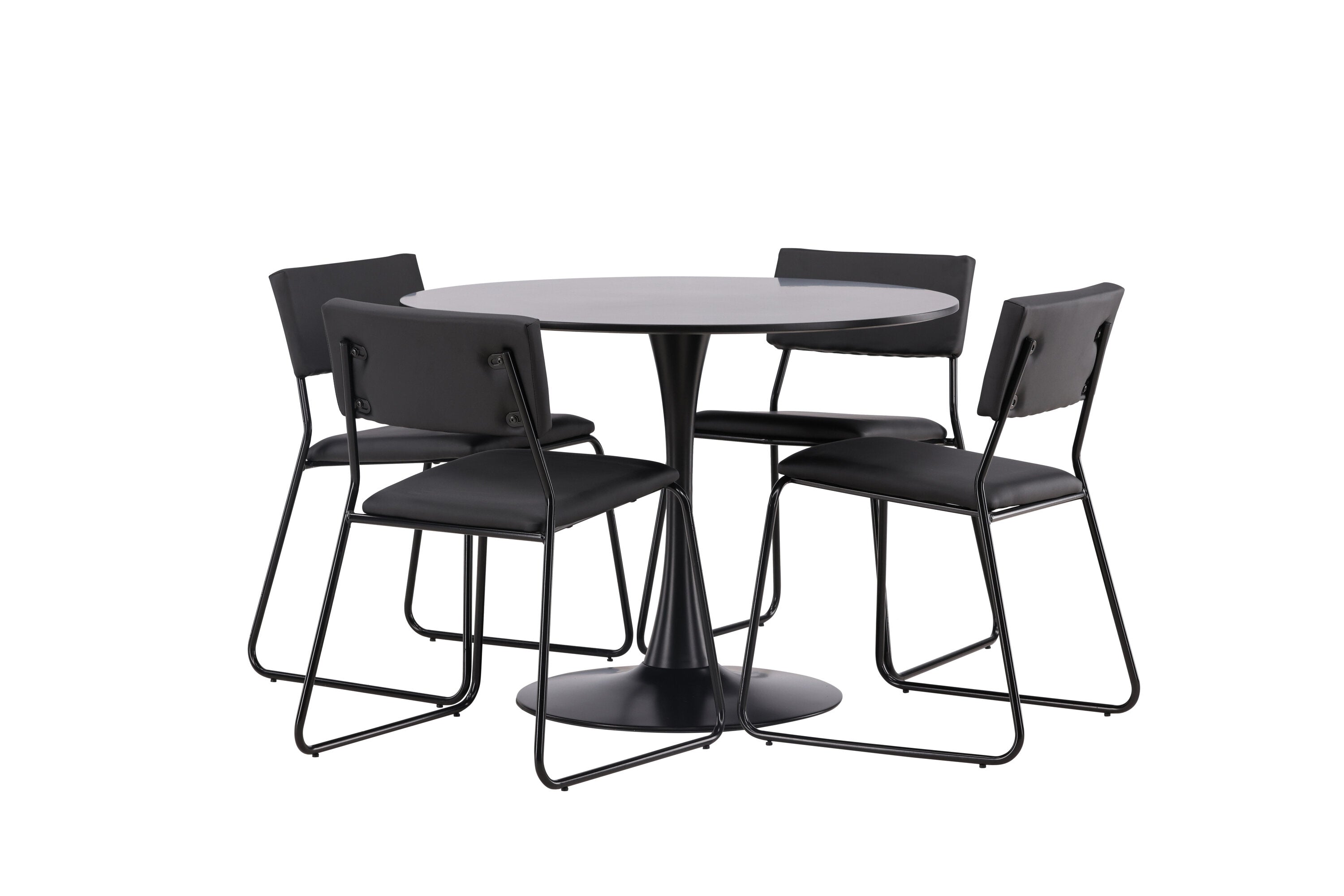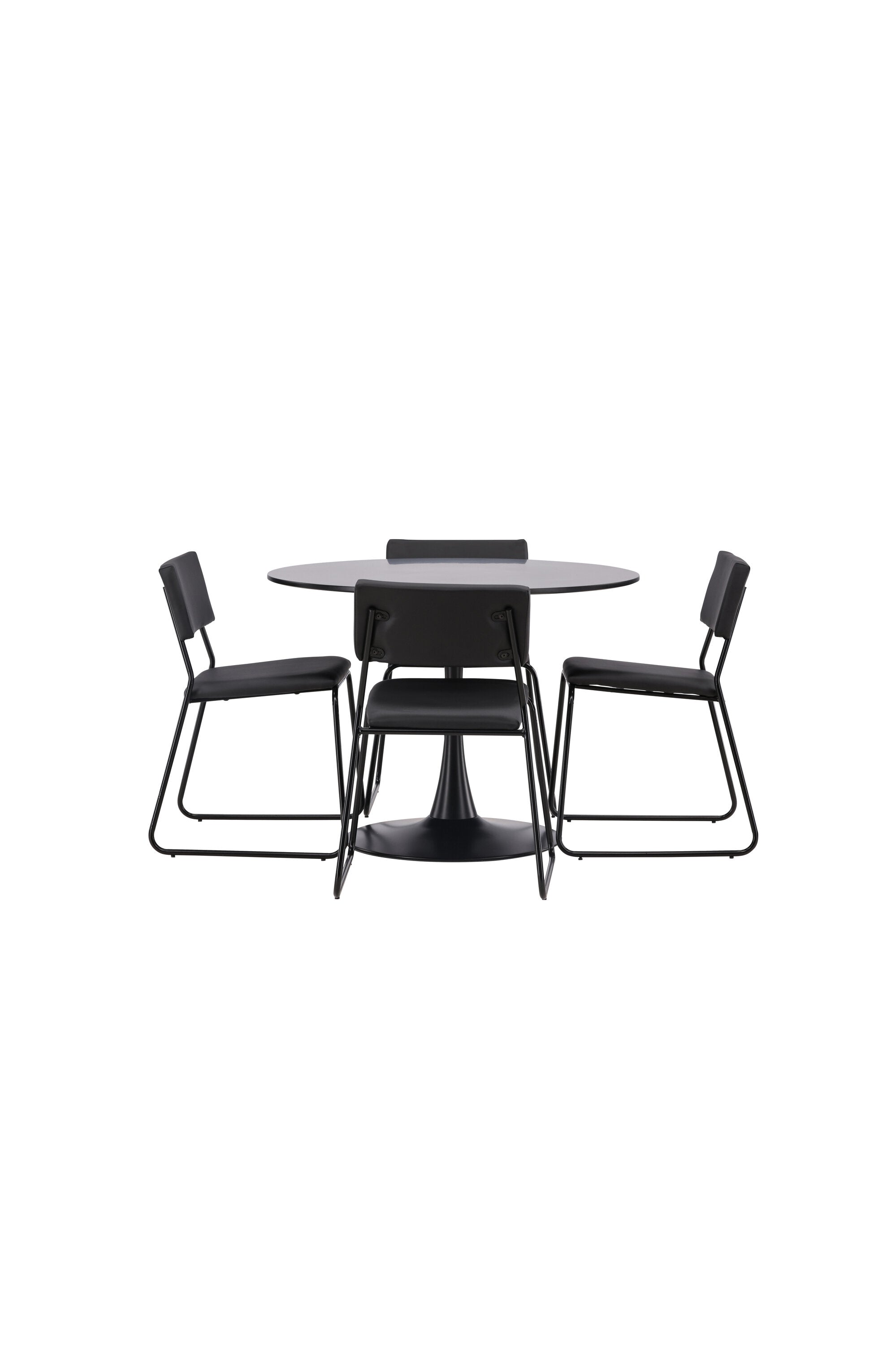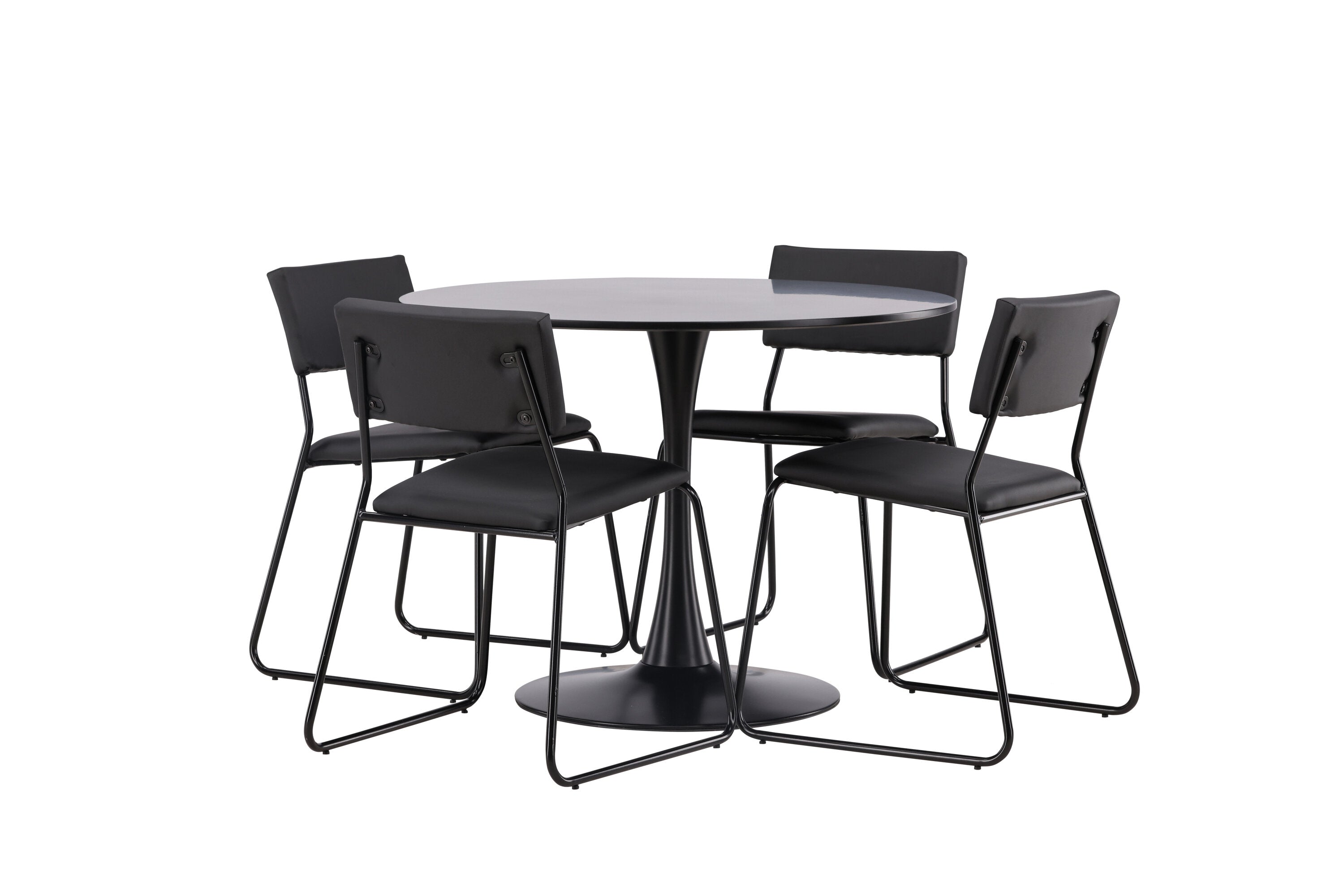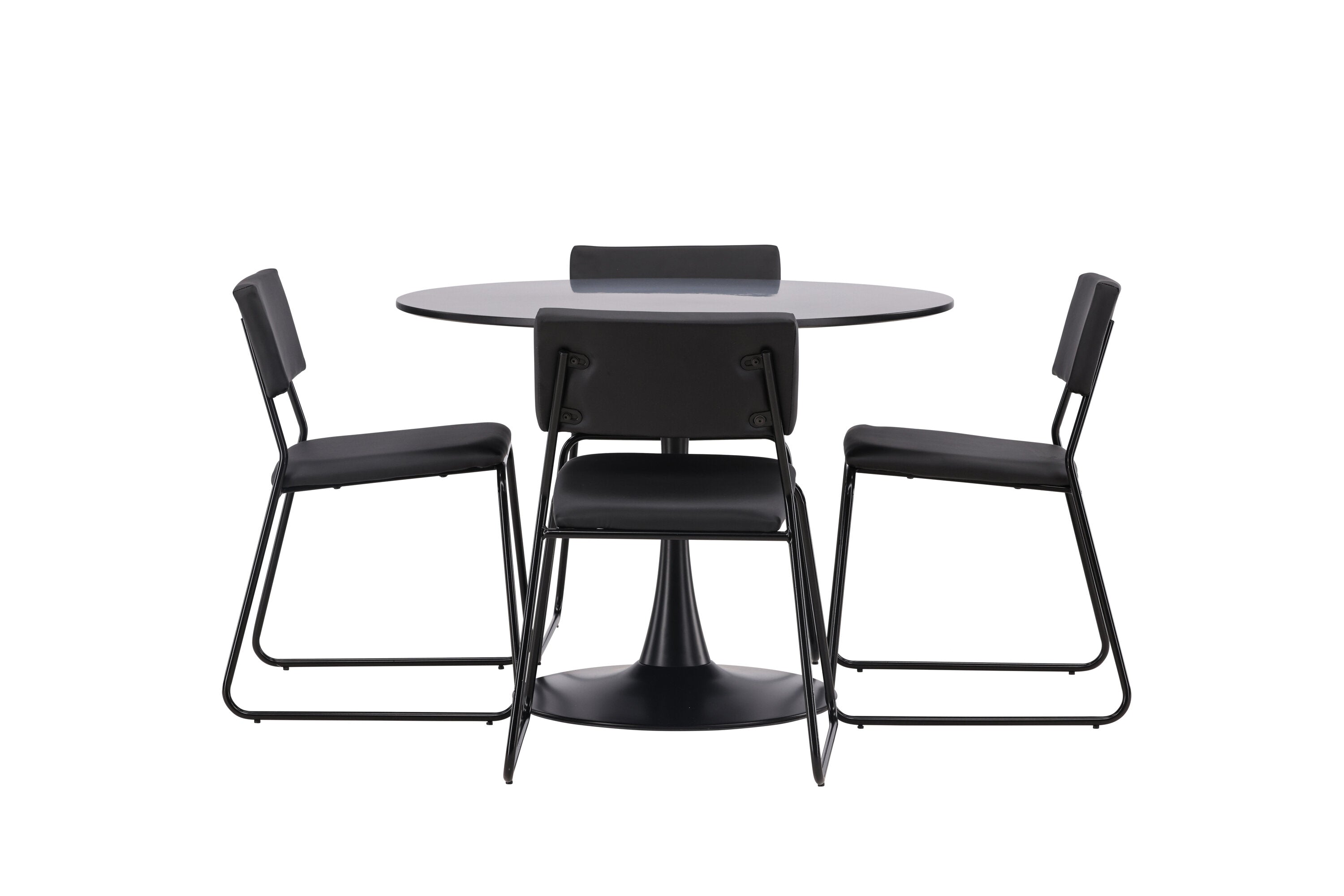 Minimalistický a trendový – jídelní sestava se všemi správnými funkcemi! Jídelní stůl Glade má stylový skandinávský design se štíhlou trumpetovou nohou z černé oceli a černou desku stolu z MDF. Zde společně s našimi černými jídelními židlemi ze série Kenth. Minimalistický, moderní design vytváří vzdušný pocit. Židle má opěradlo a sedák z černé polyuretanové kůže a polyesteru a ozdobné úzké nohy ze železa. Ozdobte srdce domova nadčasově a stylově! Rozměry stolu: 100 cm.