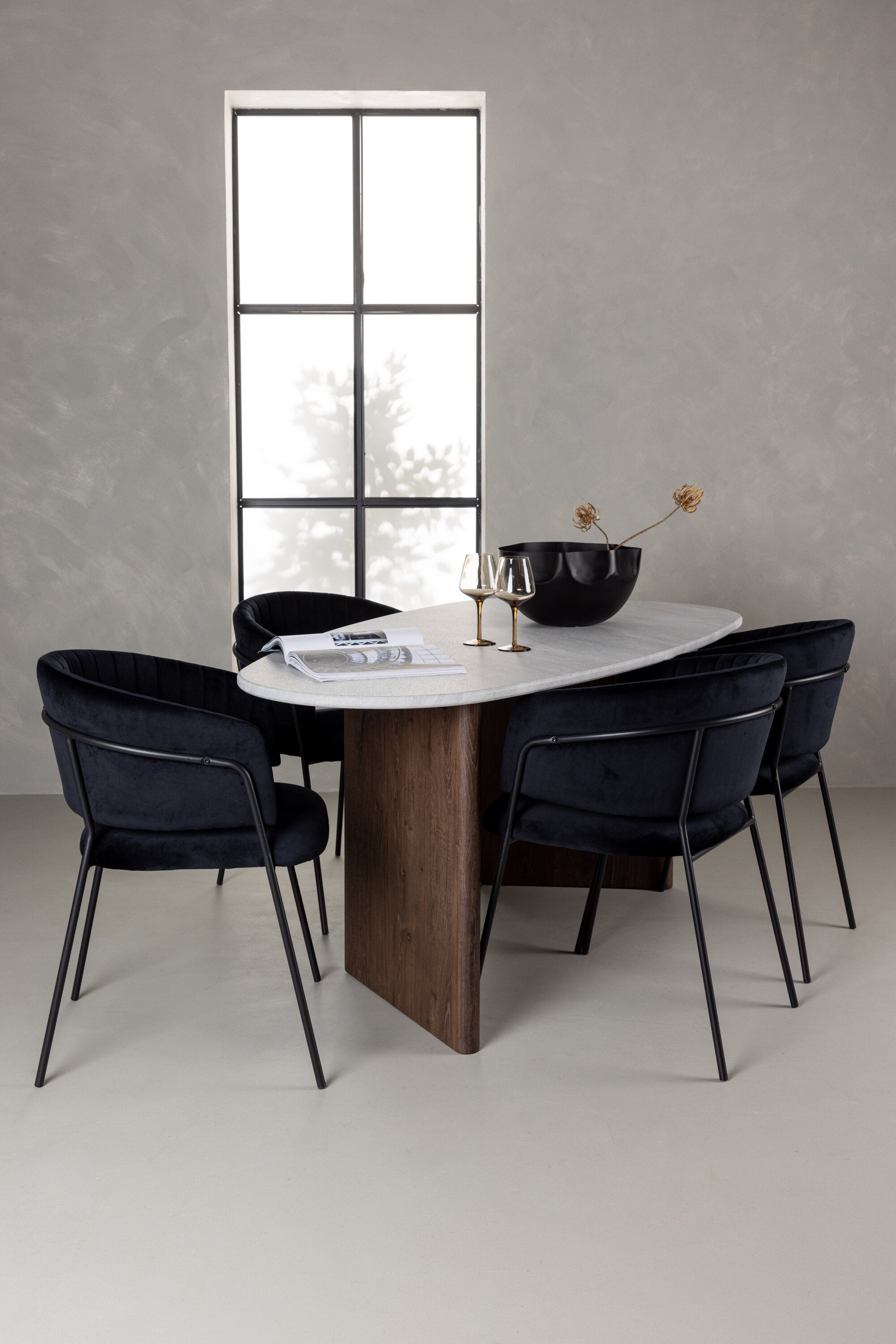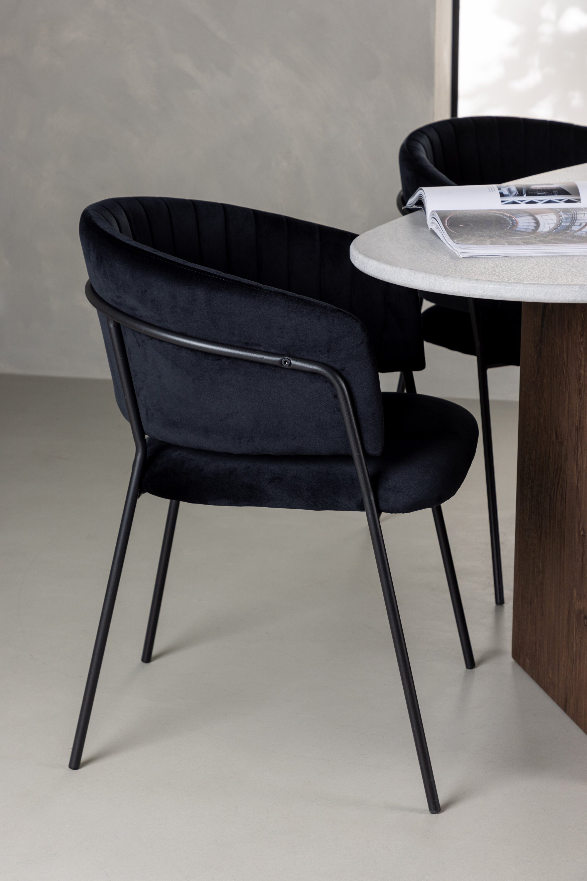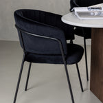 Pro doplnění jídelní sestavy jsme ji spárovali s černými židlemi ze série Selma. Opěradlo je jemně zaoblené pro optimální pohodlí a sedák je čalouněn luxusním sametem s ozdobnými švy, které dodávají extra nádech elegance. Nohy židle jsou tenké a vyrobené z černé oceli a poskytují moderní a stylový kontrast k měkkému sametovému čalounění. Už to nebude pohodlnější než tohle! Dodejte svému domovu dotek luxusu a elegance s touto jídelní skupinou a pozvěte přátele a rodinu na útulná jídla v budoucnu!