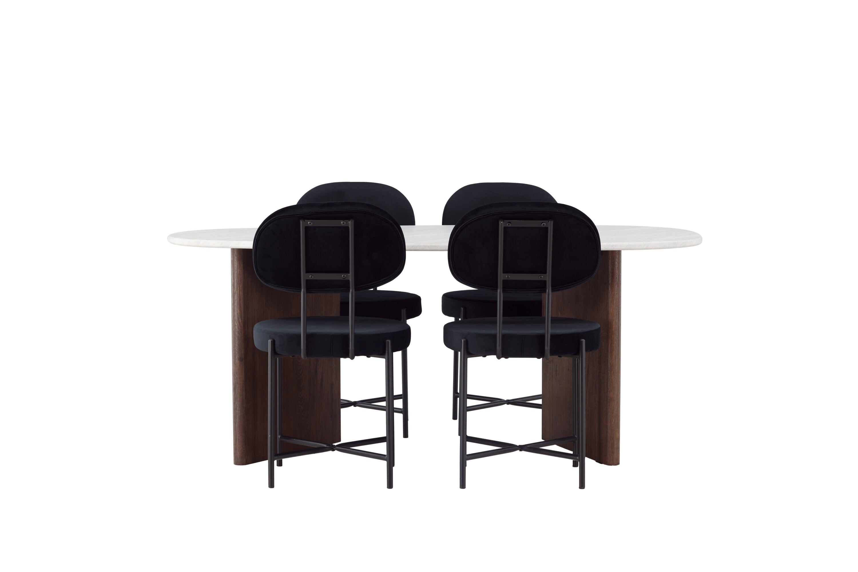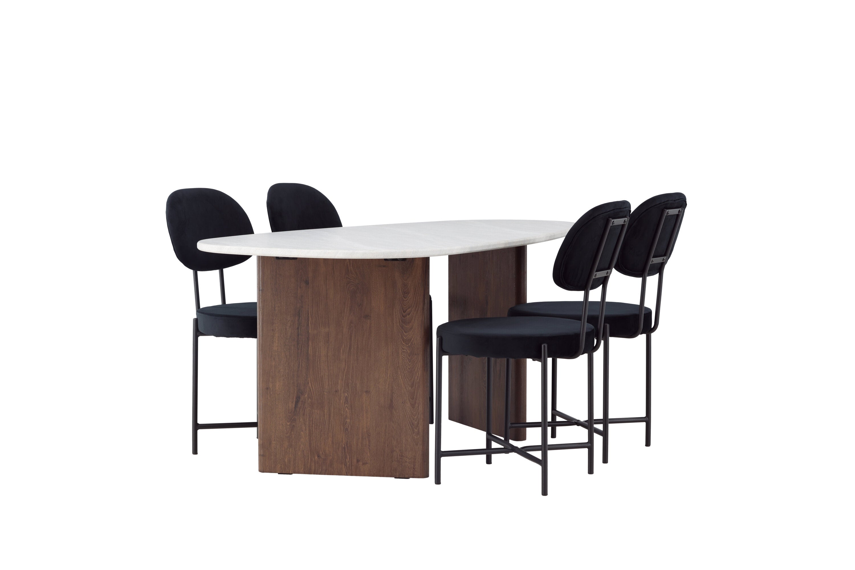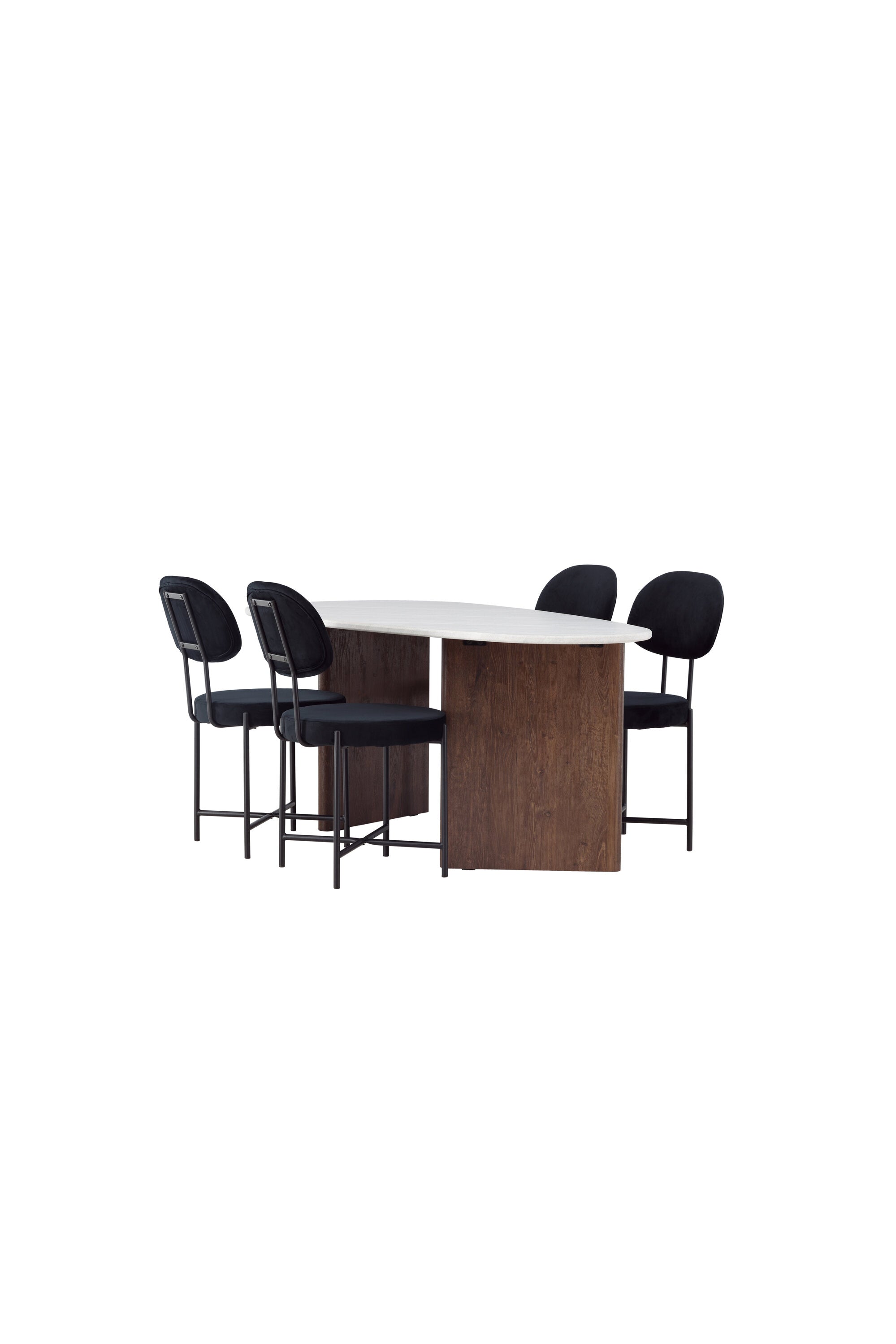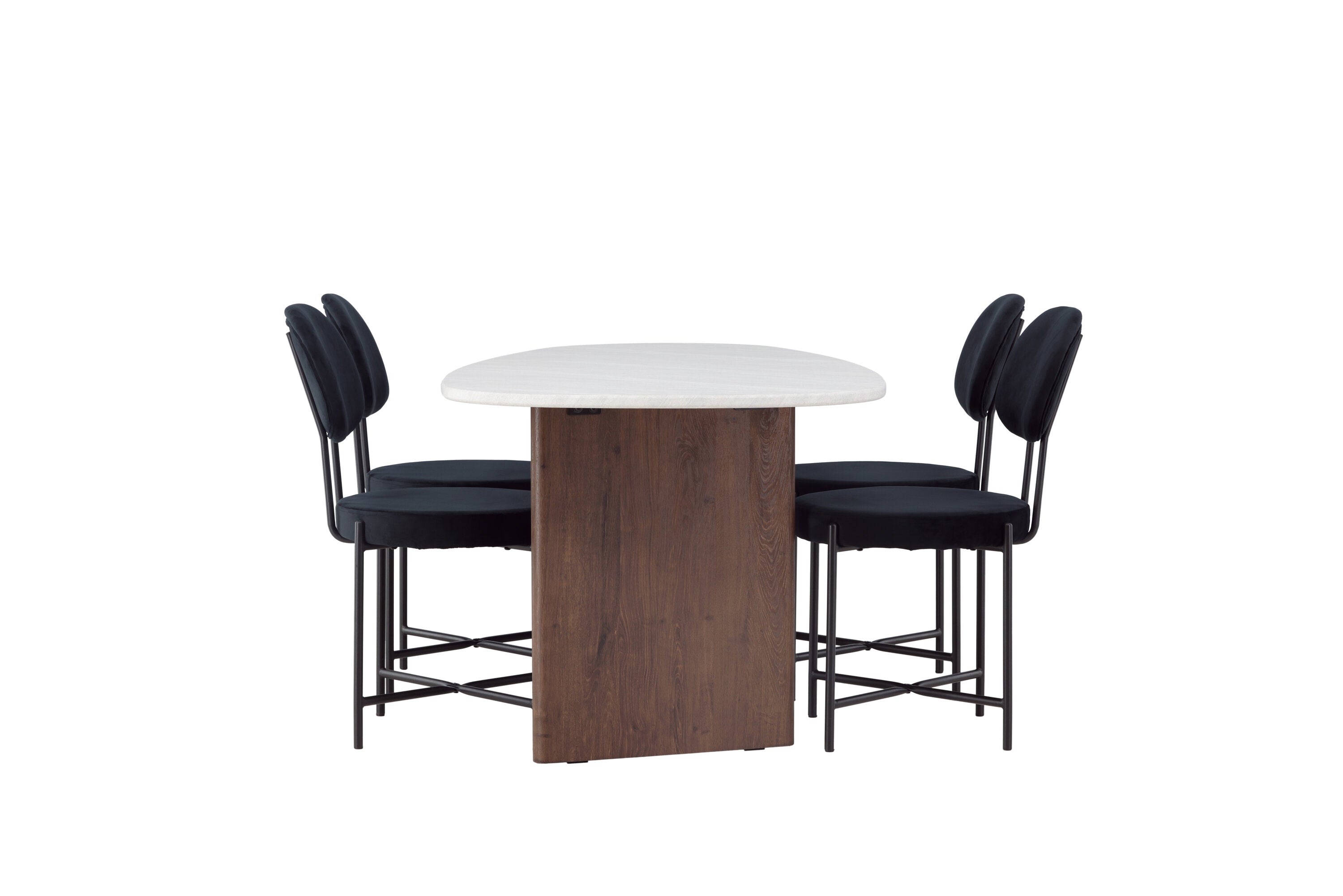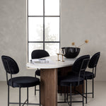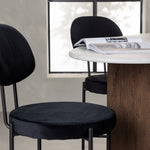 Zde v kombinaci s jídelními židlemi ze série Stella. Tato sametově čalouněná jídelní židle nabízí trendy, skandinávský design s kulatým sedákem a opěradlem z luxusního černého sametu. Černé ocelové nohy židle poskytují moderní a stylový výraz. Vychutnejte si jídlo s rodinou a přáteli u tohoto fantastického stolu a pociťte, jak vás obklopuje skandinávský dotek. Personalizovaná jídelní skupina, která se v budoucnu stane vaším oblíbeným místem doma!