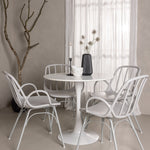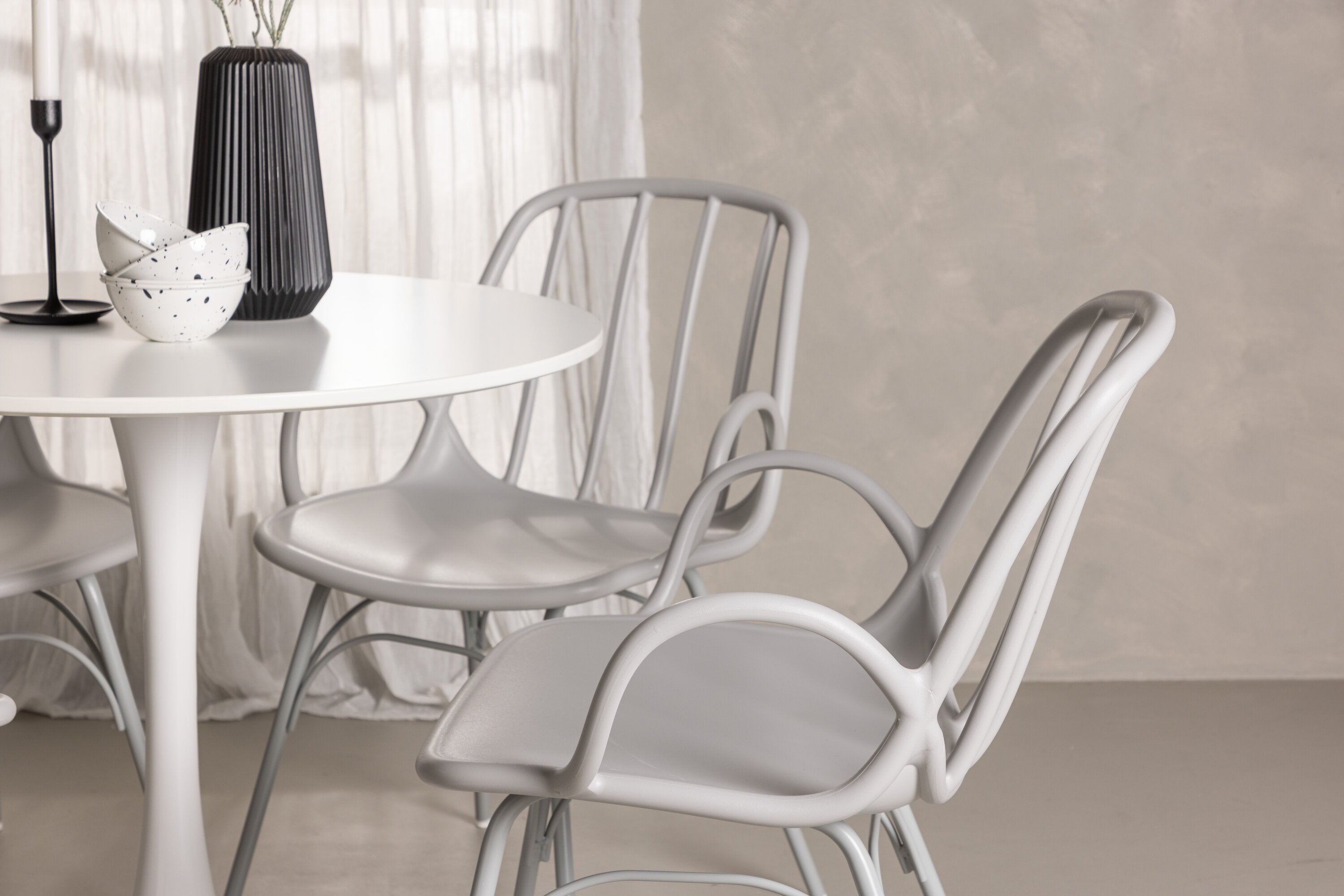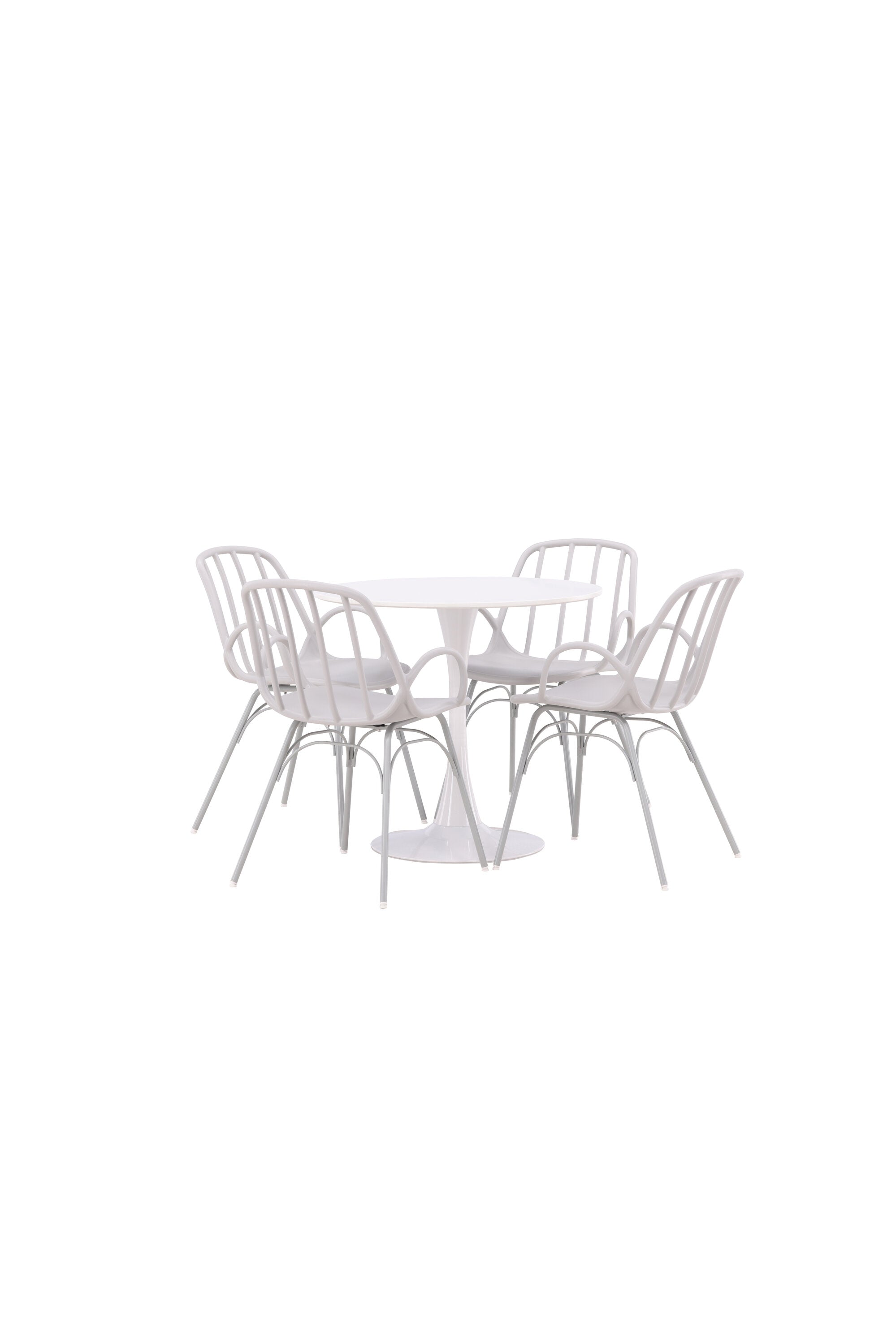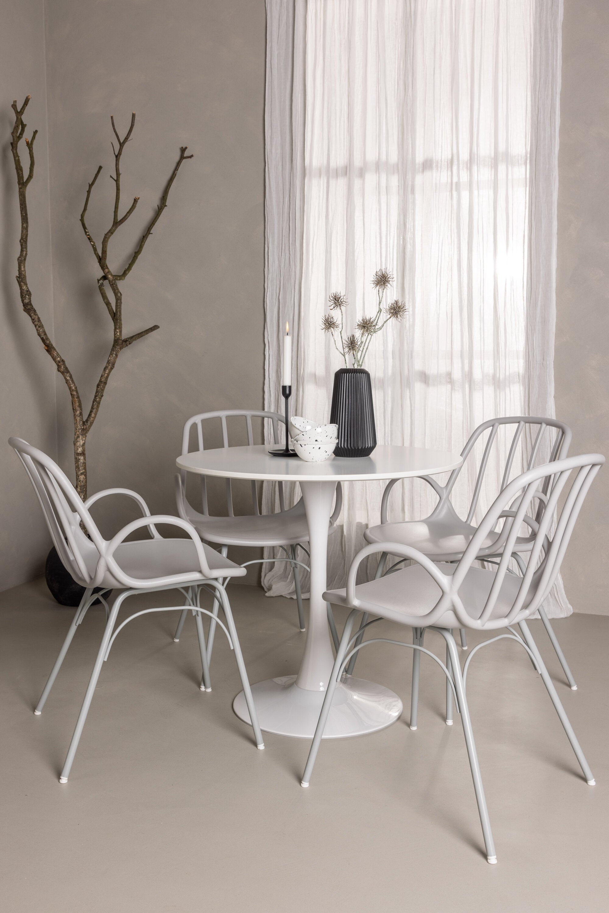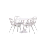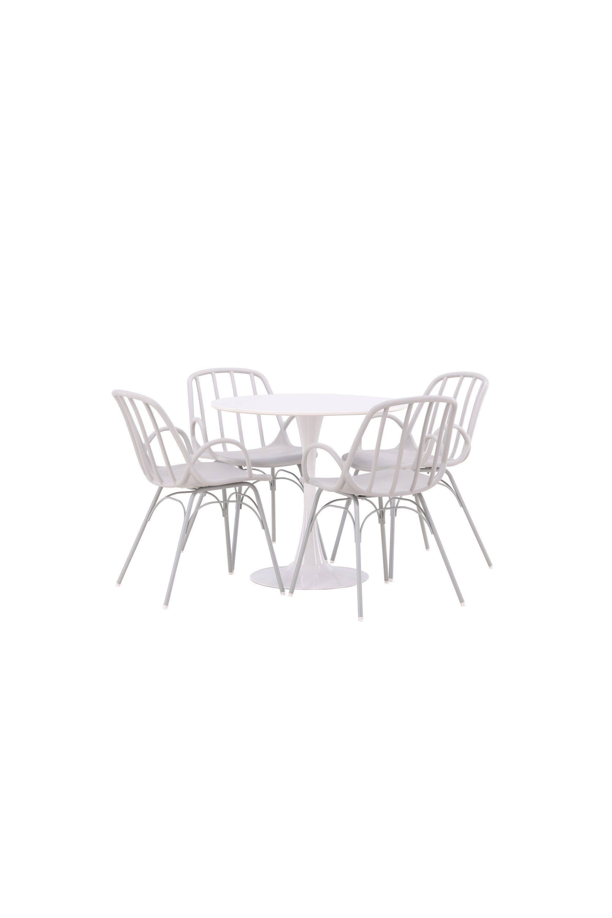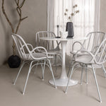 Stůl Hamden má výšku 75 cm a průměr 80 ​​cm, díky čemuž je kompaktní a všestranný. Bílá stolní deska poskytuje jasný a svěží pocit, zatímco šedé židle Dyrön dodávají jemný kontrast a přispívají k nadčasové estetice.