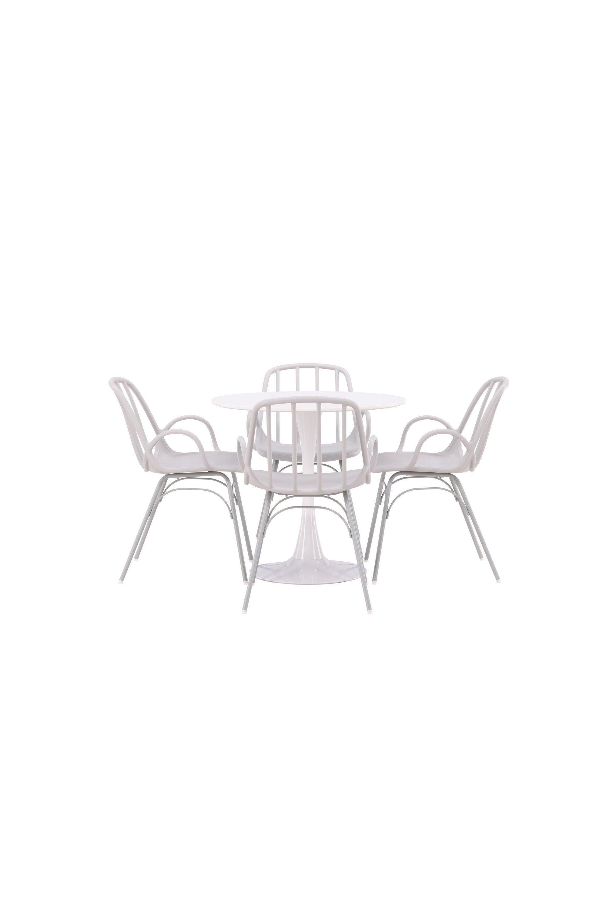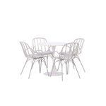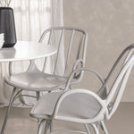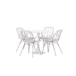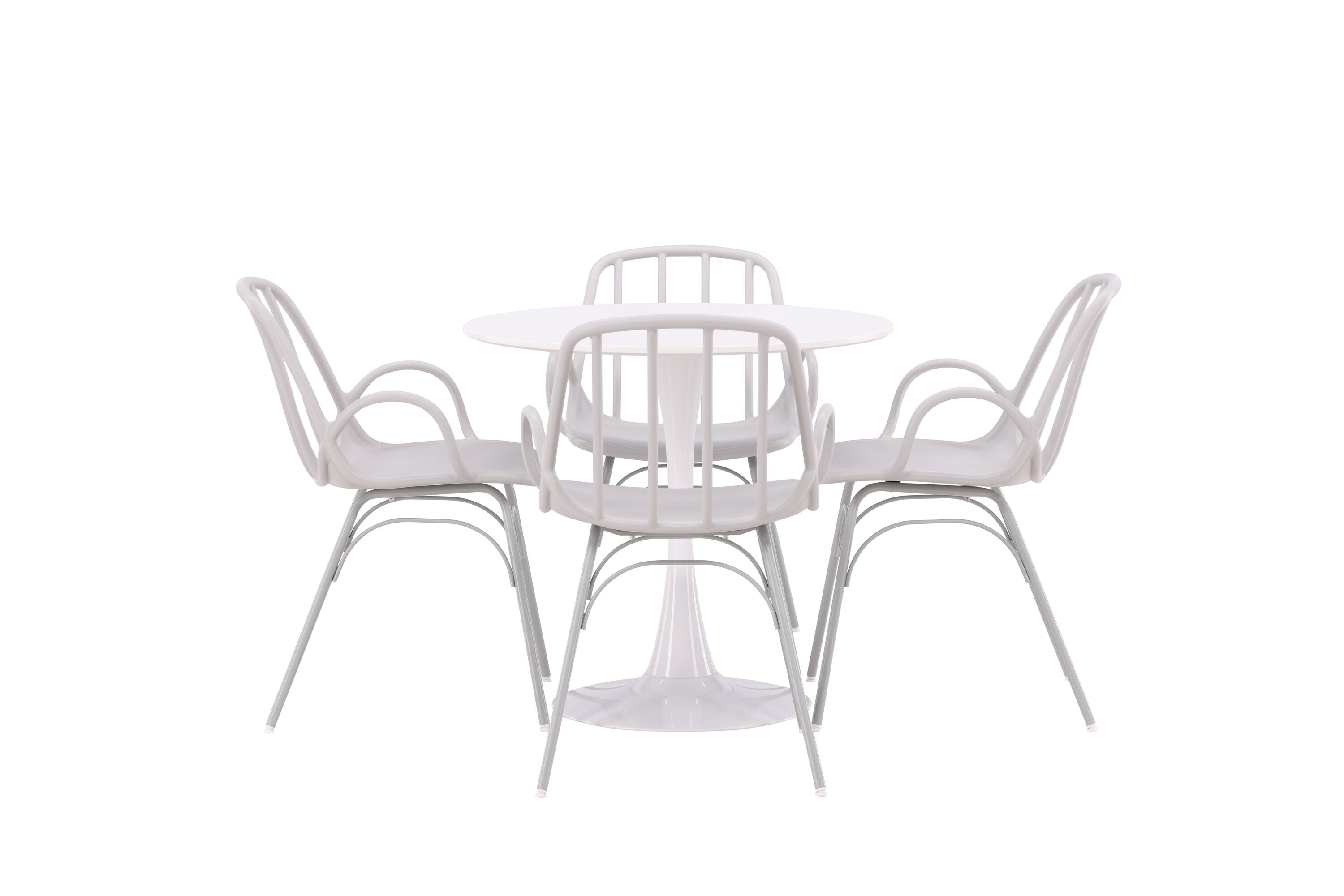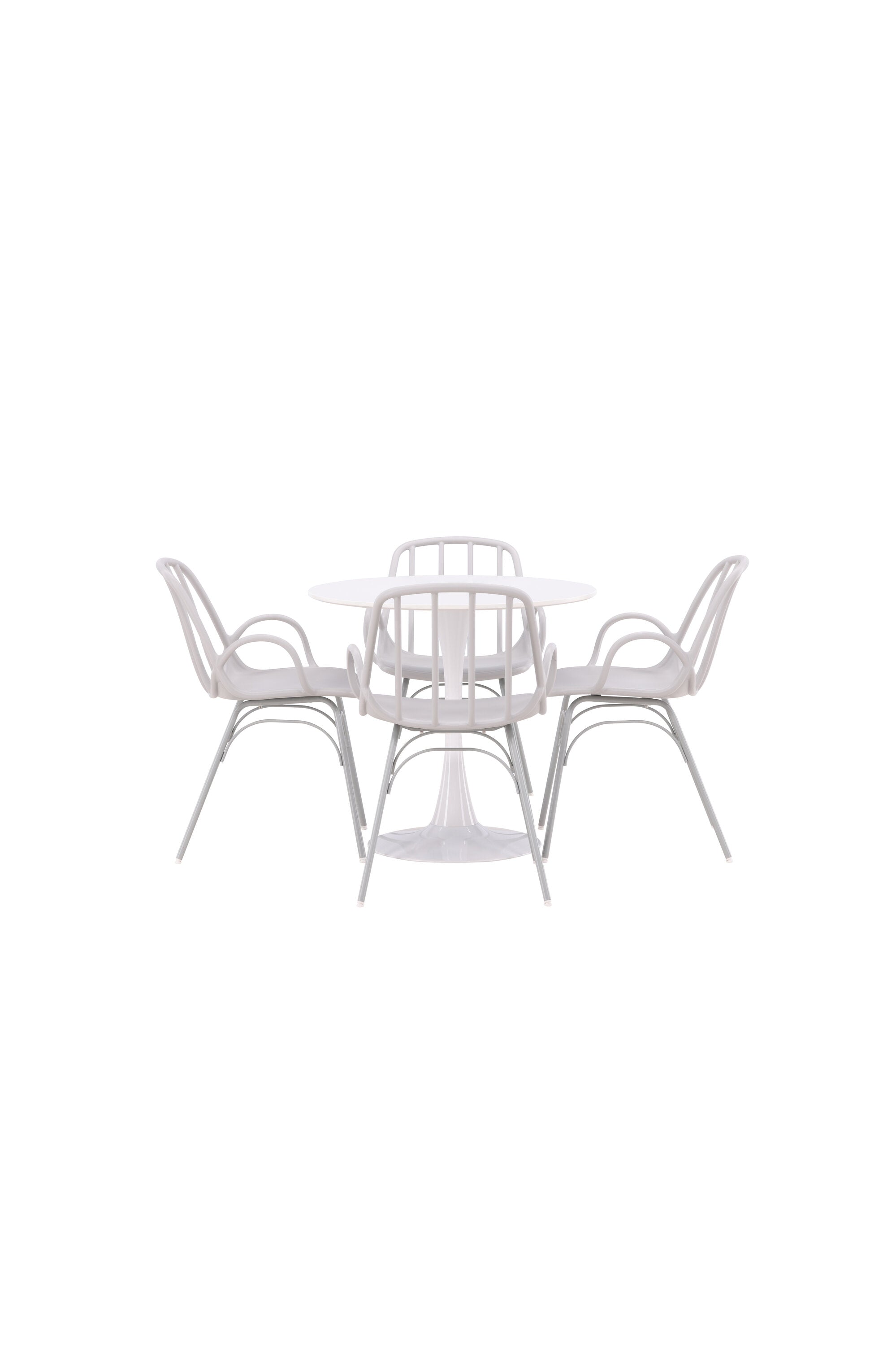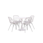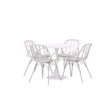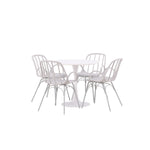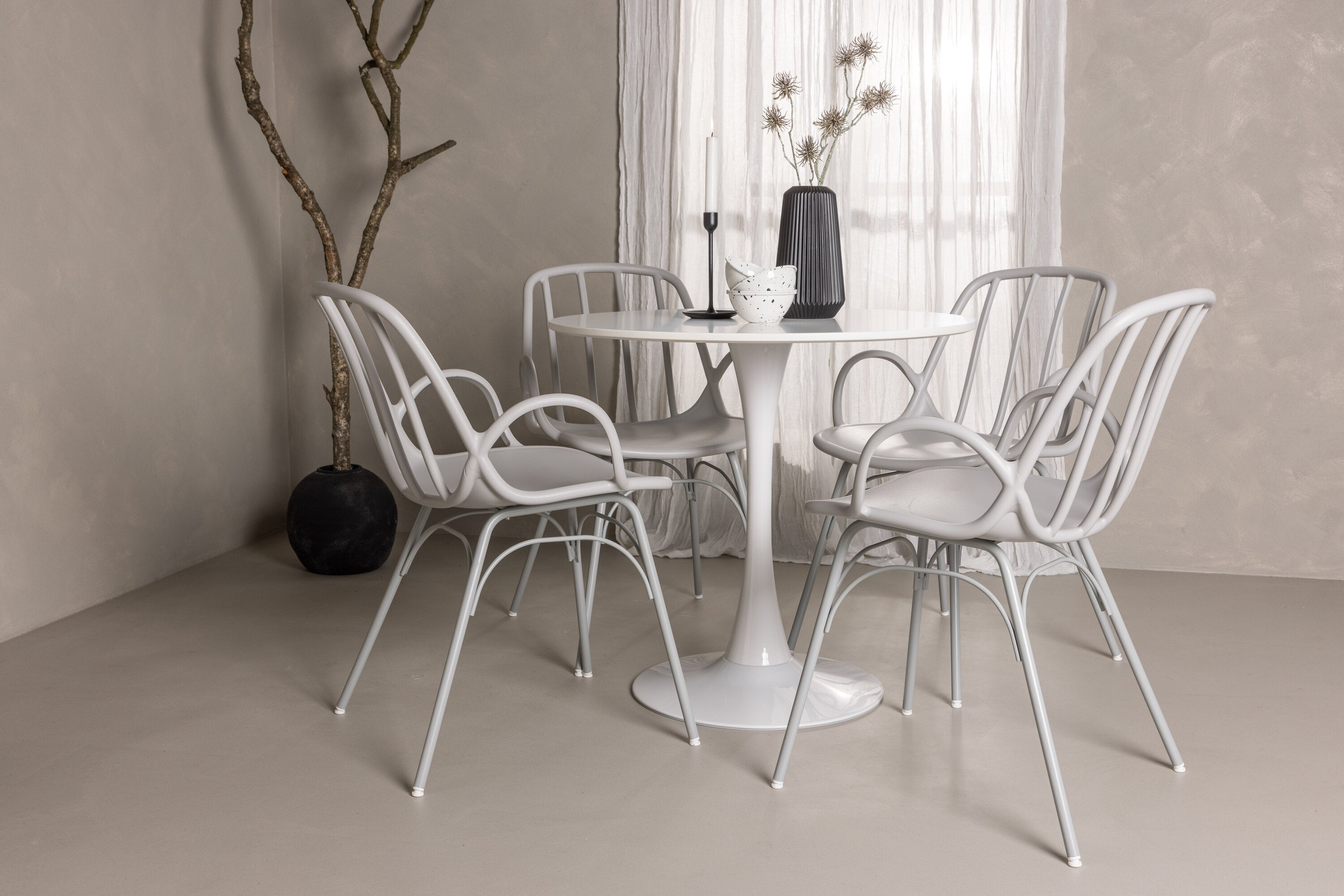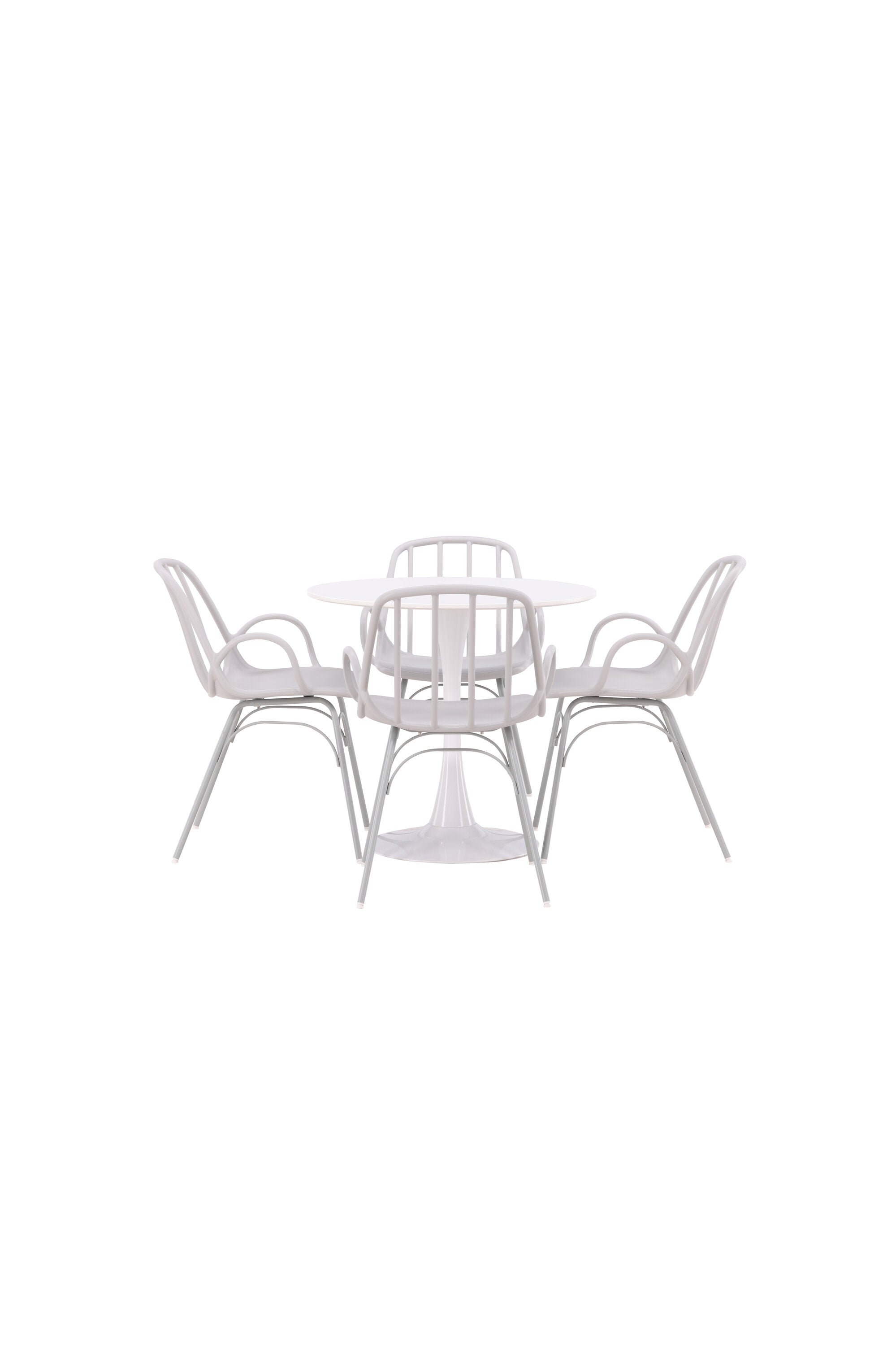 Stůl Hamden má výšku 75 cm a průměr 80 ​​cm, díky čemuž je kompaktní a všestranný. Bílá stolní deska poskytuje jasný a svěží pocit, zatímco šedé židle Dyrön dodávají jemný kontrast a přispívají k nadčasové estetice.