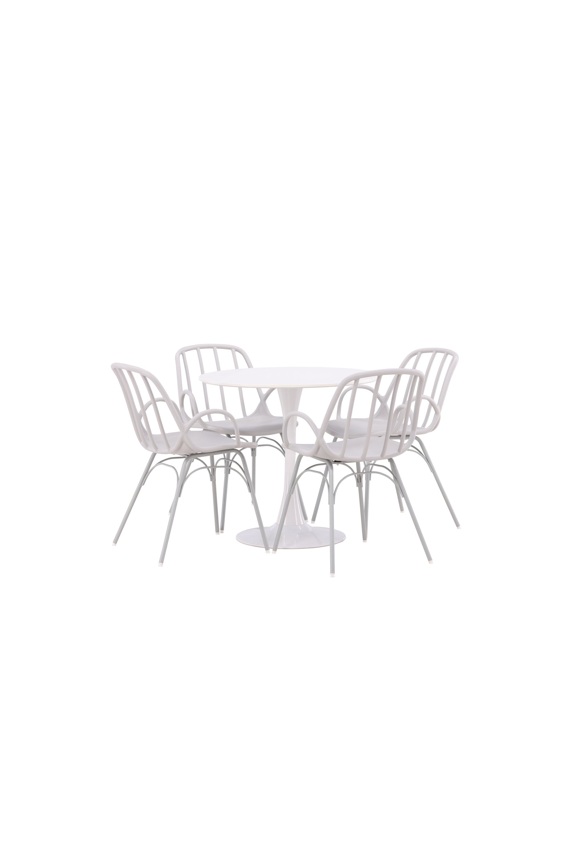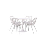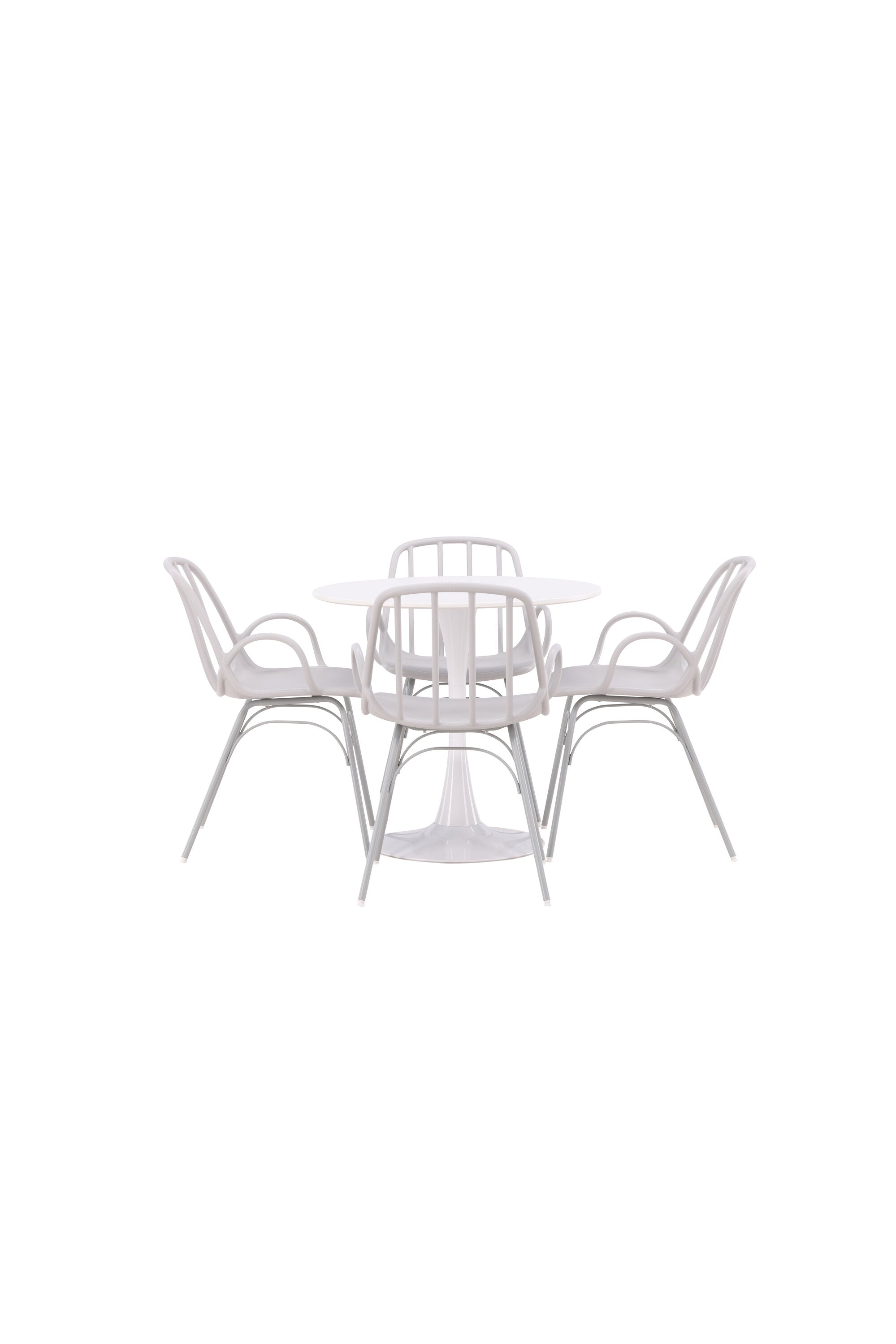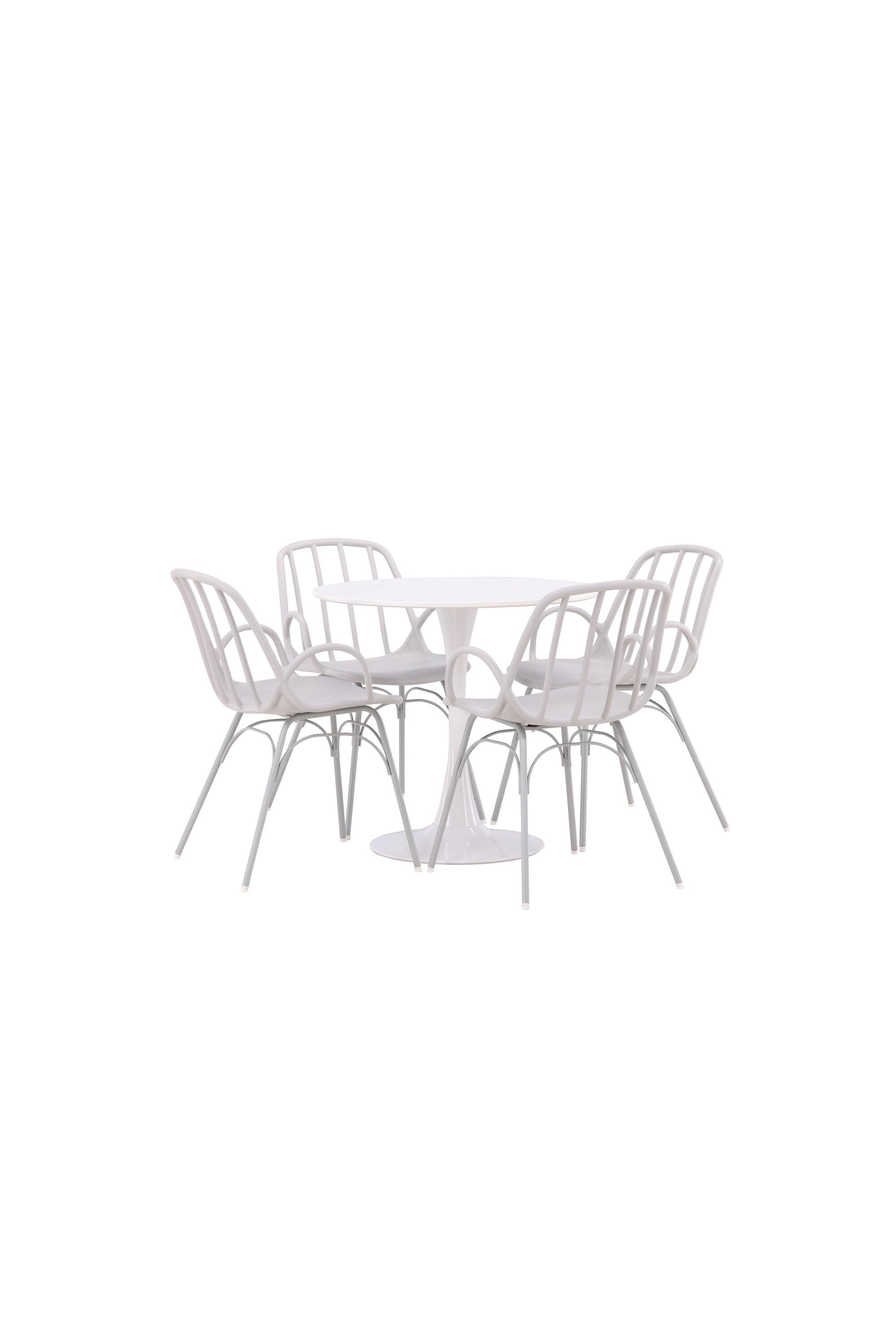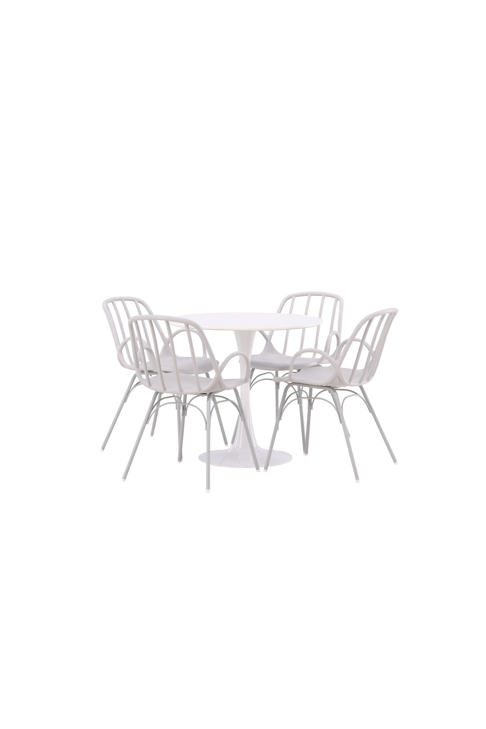Stůl Hamden má výšku 75 cm a průměr 80 ​​cm, díky čemuž je kompaktní a všestranný. Bílá stolní deska poskytuje jasný a svěží pocit, zatímco šedé židle Dyrön dodávají jemný kontrast a přispívají k nadčasové estetice.